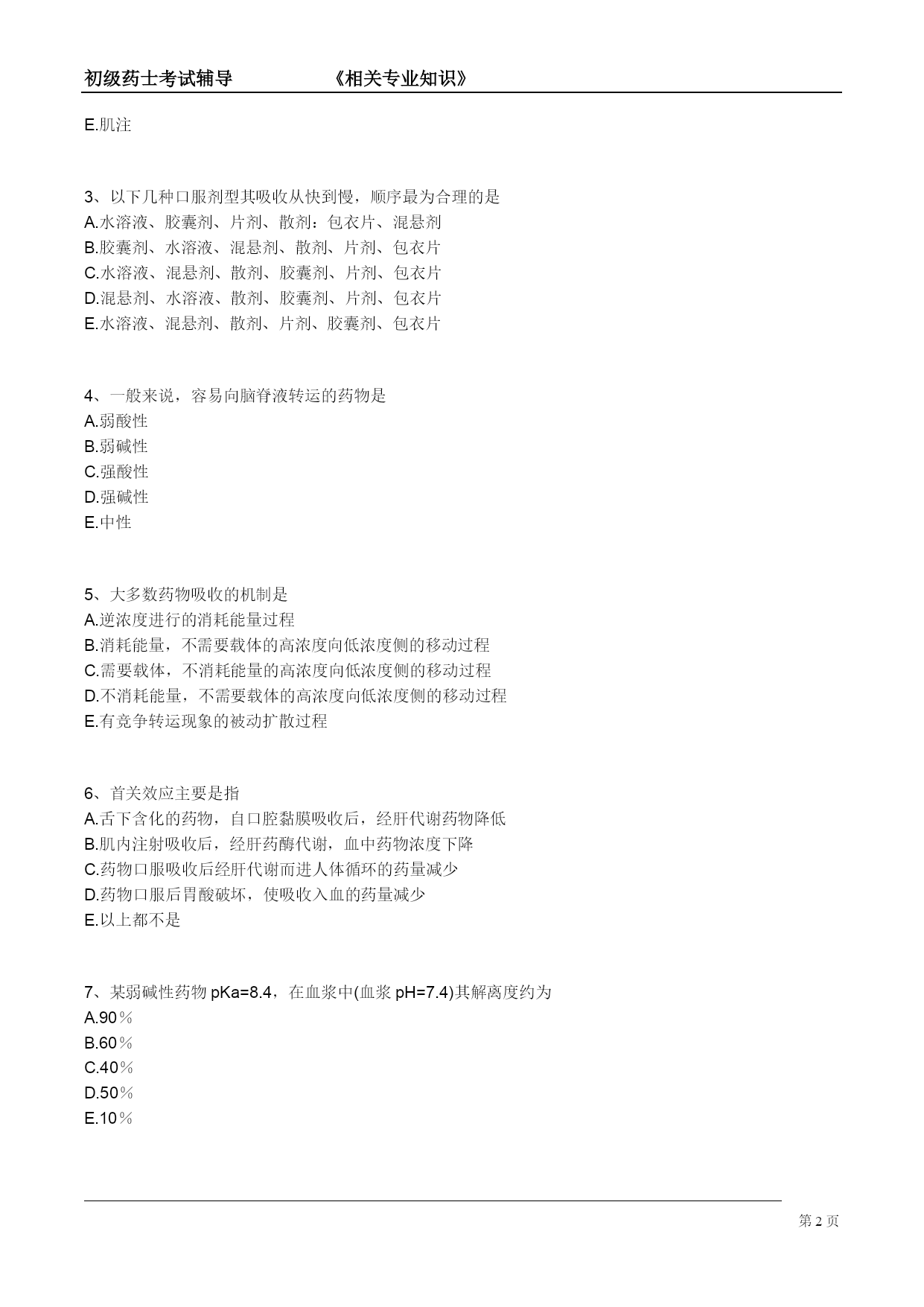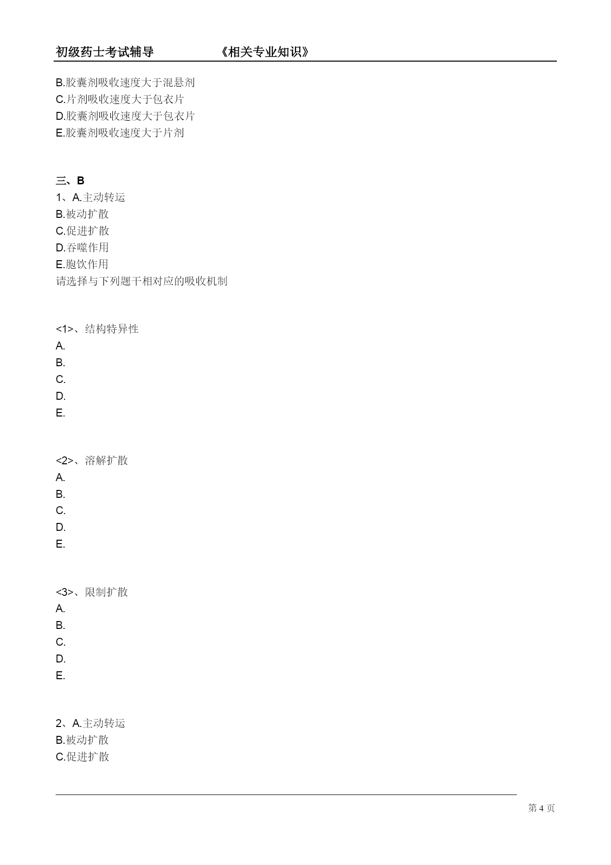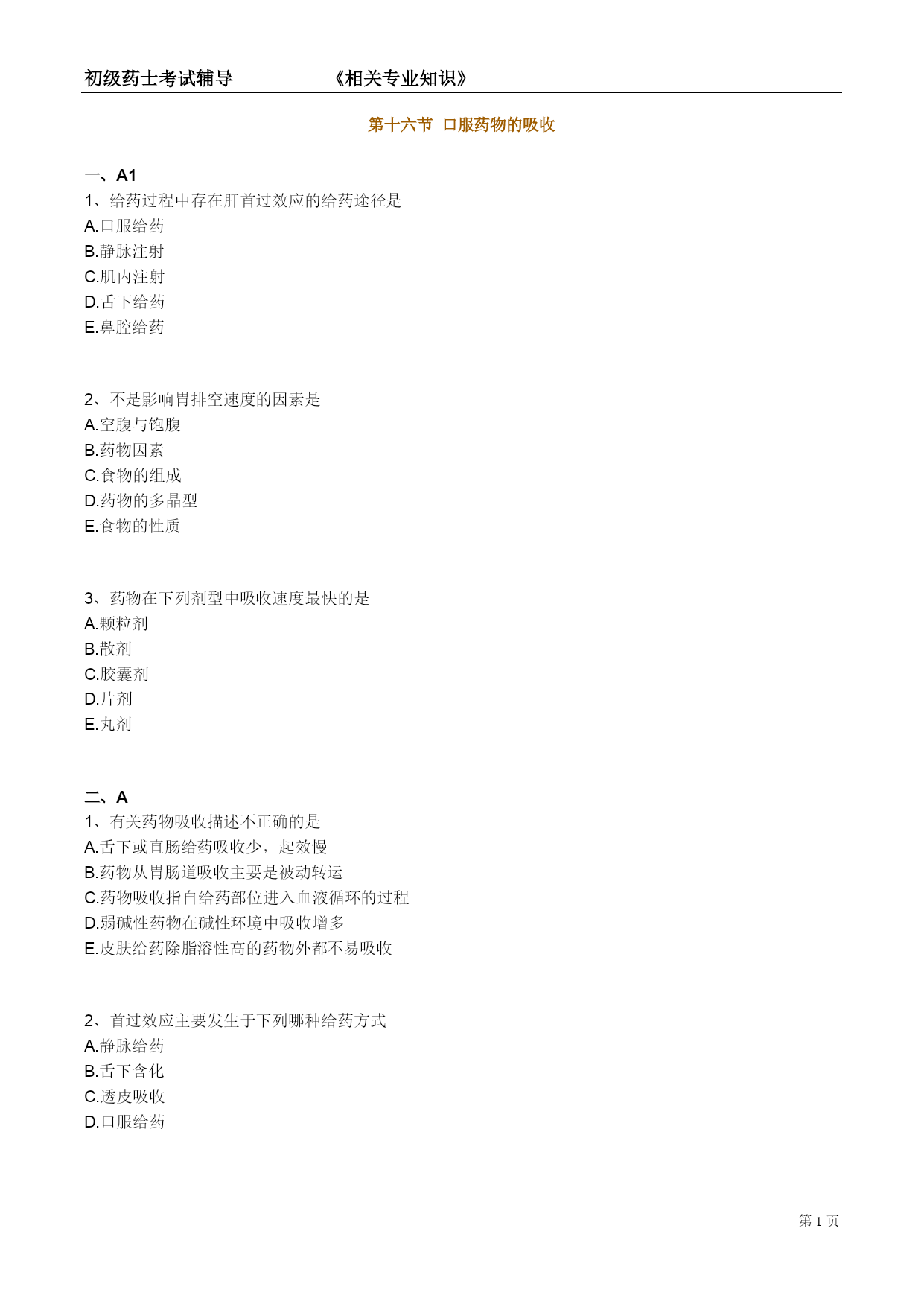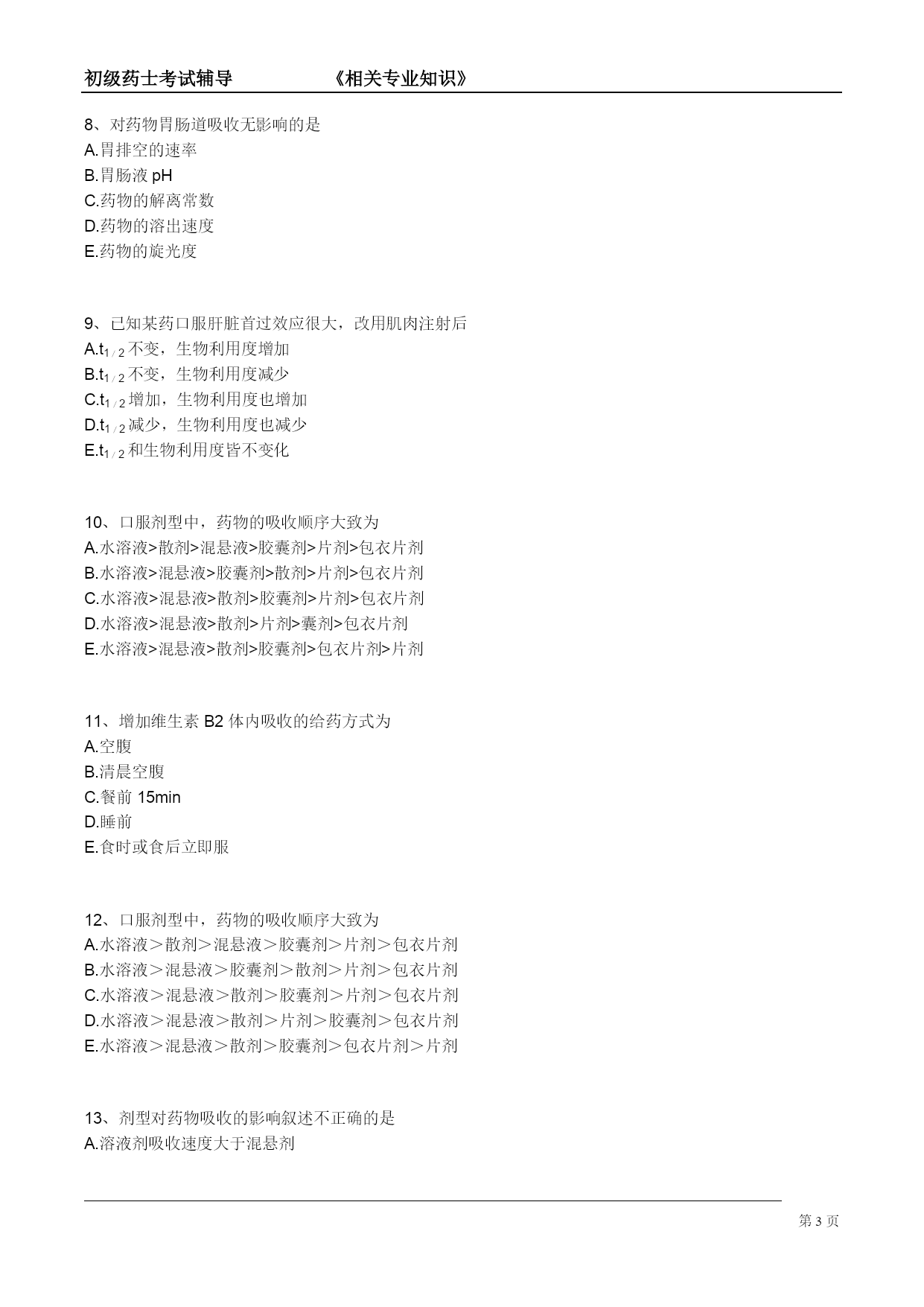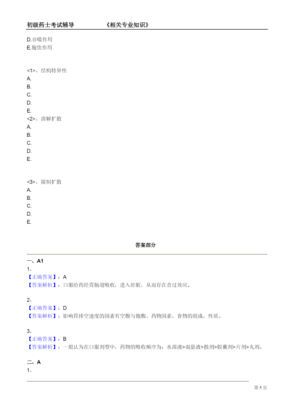初级药士考试辅导《相关专业知识》 第页 第十六节口服药物的吸收 一、A11、给药过程中存在肝首过效应的给药途径是A.口服给药B.静脉注射C.肌内注射D.舌下给药E.鼻腔给药 2、不是影响胃排空速度的因素是A.空腹与饱腹B.药物因素C.食物的组成D.药物的多晶型E.食物的性质 3、药物在下列剂型中吸收速度最快的是A.颗粒剂B.散剂C.胶囊剂D.片剂E.丸剂 二、A1、有关药物吸收描述不正确的是A.舌下或直肠给药吸收少,起效慢B.药物从胃肠道吸收主要是被动转运C.药物吸收指自给药部位进入血液循环的过程D.弱碱性药物在碱性环境中吸收增多E.皮肤给药除脂溶性高的药物外都不易吸收 2、首过效应主要发生于下列哪种给药方式A.静脉给药B.舌下含化C.透皮吸收D.口服给药E.肌注 3、以下几种口服剂型其吸收从快到慢,顺序最为合理的是A.水溶液、胶囊剂、片剂、散剂:包衣片、混悬剂B.胶囊剂、水溶液、混悬剂、散剂、片剂、包衣片C.水溶液、混悬剂、散剂、胶囊剂、片剂、包衣片D.混悬剂、水溶液、散剂、胶囊剂、片剂、包衣片E.水溶液、混悬剂、散剂、片剂、胶囊剂、包衣片 4、一般来说,容易向脑脊液转运的药物是A.弱酸性B.弱碱性C.强酸性D.强碱性E.中性 5、大多数药物吸收的机制是A.逆浓度进行的消耗能量过程B.消耗能量,不需要载体的高浓度向低浓度侧的移动过程C.需要载体,不消耗能量的高浓度向低浓度侧的移动过程D.不消耗能量,不需要载体的高浓度向低浓度侧的移动过程E.有竞争转运现象的被动扩散过程 6、首关效应主要是指A.舌下含化的药物,自口腔黏膜吸收后,经肝代谢药物降低B.肌内注射吸收后,经肝药酶代谢,血中药物浓度下降C.药物口服吸收后经肝代谢而进人体循环的药量减少D.药物口服后胃酸破坏,使吸收入血的药量减少E.以上都不是 7、某弱碱性药物pKa=8.4,在血浆中(血浆pH=7.4)其解离度约为A.90%B.60%C.40%D.50%E.10% 8、对药物胃肠道吸收无影响的是A.胃排空的速率B.胃肠液pHC.药物的解离常数D.药物的溶出速度E.药物的旋光度 9、已知某药口服肝脏首过效应很大,改用肌肉注射后A.t1/2不变,生物利用度增加B.t1/2不变,生物利用度减少C.t1/2增加,生物利用度也增加D.t1/2减少,生物利用度也减少E.t1/2和生物利用度皆不变化 10、口服剂型中,药物的吸收顺序大致为A.水溶液>散剂>混悬液>胶囊剂>片剂>包衣片剂B.水溶液>混悬液>胶囊剂>散剂>片剂>包衣片剂C.水溶液>混悬液>散剂>胶囊剂>片剂>包衣片剂D.水溶液>混悬液>散剂>片剂>囊剂>包衣片剂E.水溶液>混悬液>散剂>胶囊剂>包衣片剂>片剂 11、增加维生素B2体内吸收的给药方式为A.空腹B.清晨空腹C.餐前15minD.睡前E.食时或食后立即服 12、口服剂型中,药物的吸收顺序大致为A.水溶液>散剂>混悬液>胶囊剂>片剂>包衣片剂B.水溶液>混悬液>胶囊剂>散剂>片剂>包衣片剂C.水溶液>混悬液>散剂>胶囊剂>片剂>包衣片剂D.水溶液>混悬液>散剂>片剂>胶囊剂>包衣片剂E.水溶液>混悬液>散剂>胶囊剂>包衣片剂>片剂 13、剂型对药物吸收的影响叙述不正确的是A.溶液剂吸收速度大于混悬剂B.胶囊剂吸收速度大于混悬剂C.片剂吸收速度大于包衣片D.胶囊剂吸收速度大于包衣片E.胶囊剂吸收速度大于片剂 三、B1、A.主动转运B.被动扩散C.促进扩散D.吞噬作用E.胞饮作用请选择与下列题干相对应的吸收机制 <1>、结构特异性A.B.C.D.E. <2>、溶解扩散A.B.C.D.E. <3>、限制扩散A.B.C.D.E. 2、A.主动转运B.被动扩散C.促进扩散D.吞噬作用E.胞饮作用 <1>、结构特异性A.B.C.D.E. <2>、溶解扩散A.B.C.D.E. <3>、限制扩散A.B.C.D.E. 答案部分 一、A11、【正确答案】:A【答案解析】:口服给药经胃肠道吸收,进入肝脏,从而存在首过效应。 2、【正确答案】:D【答案解析】:影响胃排空速度的因素有空腹与饱腹、药物因素、食物的组成、性质。 3、【正确答案】:B【答案解析】:一般认为在口服剂型中,药物的吸收顺序为:水溶液>混悬液>散剂>胶囊剂>片剂>丸剂。 二、A1、【正确答案】:A【答案解析】:舌下给药起效迅速。 2、【正确答案】:D【答案解析】:经胃肠道吸收的药物,要到达体循环,首先经门静脉进入肝脏,在首次通过肝脏过程中有一部分药物会被肝组织代谢或与肝组织结合,使进人体循环的原形药物量减少的现象称为“首过效应”。 3、【正确答案】:C【答案解析】:一般认为在口服剂型中,药物的吸收顺序为:水溶液>混悬液>散剂>胶囊剂>片剂>包衣片剂。 4、【正确答案】:B【答案解析】:在血浆pH7.