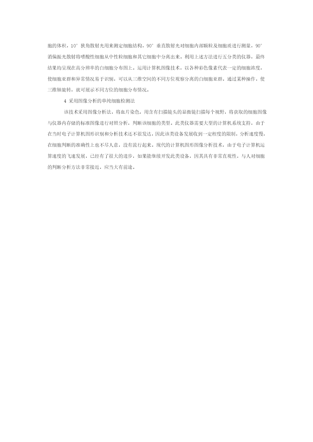HYPERLINK"http://www.sxkkj.com/372.html"现代血细胞分析仪的五分类技术HYPERLINK"http://www.sxkkj.com"血细胞分析仪是医院临床检验应用非常广泛的仪器之,随着科学技术日新月异的发展,血细胞分析的技术也从几年的三分类转向现在的五分类,从二维空间进而转向三维空间,同时现代血细胞分析仪的五分类技术许采用了先进的技术,如鞘流技术、激光技术等下面就五分类血细胞分析仪器的检测方法及其应用加以说明。1采用阻抗、激光散射和荧光染色技术检测法直流电阻抗法(DC)用于测量细胞体积小。激光散射产生的前向散射光、侧向散射光和侧向荧光可用于探测白细胞体积大小、细胞内含物的情况(细胞核以及颗粒情况),侧向荧光则可以反映细胞内脱氧核糖核酸(DNA)和核糖核酸(RNA)的含量,特有的嗜酸性粒细胞检测溶血剂Str-matolyzer-EO可将除了嗜酸细胞以外的所有细胞溶解或萎缩,含有完整嗜酸细胞的液体通过小孔可以按照电阻法计技术进行计数。在嗜碱细胞通道中,使用特殊溶血剂Strmatolyzer-BA可将除了嗜碱细胞以外的所有细胞溶解或萎缩,含有完整嗜碱细胞的液体通过小孔可以按照电阻法计数技术进行计数。幼稚细胞检查通道(IMI)可以根据幼稚细胞膜比成熟细胞膜表面含有脂质较少的现象,在细胞稀释悬液中加入硫化氨基酸,由于占位不同,结合在幼稚细胞表面的氨基酸较多,对溶血剂有抵抗作用,当加入溶血剂后成熟细胞易被溶解,而幼稚细胞不易被破坏,可通过电阻法检测出来。综合各测量方法,得到白细胞五分类的图形和数据。技术主要应用在Sysmex研制和开发的SE-9000、SE-9500、XE-2100、XT-1800等系列血液分析仪中。2电阻抗和射频电导联合检测法这种方法是分别采用四个检测系统来检测不同类型的细胞:(1)淋巴细胞、单核细胞和中性粒细胞检测系统:在细胞悬浮液中加入溶血剂使红细胞溶解,而使白细胞保持完整,细胞浆及核形态近似于生理状态,当这些细胞通过检测系统时,对白细胞进行电阻抗法(测量细胞体积)和射频电导法(检测细胞核和颗粒密度)的联合检测,结果将细胞分成淋巴细胞、单核细胞和中性粒细胞三个群体。(2)嗜酸性细胞和嗜碱性细胞两种检测系统:在细胞悬浮液中加入特殊的溶血剂,除嗜酸性细胞和嗜碱性细胞外,其他细胞均被溶解或萎缩,再对保持完整的嗜酸性细胞或嗜碱性细胞进行计数。(3)幼稚细胞检测系统:在细胞悬浮液中加入硫化氨基酸,由于占位不同,结合在幼稚细胞的氨基酸比成熟细胞多,且对溶血剂有抵抗作用,当加入溶血剂时,成熟细胞被溶解,只保留着可能存在的幼稚细胞用来计数。目前日本东亚公司的NE1500、SYSNEX公司的SE9000血细胞分析仪就是采用这种方法进行五分类的。3多角度激光偏振光散射检测法采用这种技术的仪器使用鞘流液将标本血稀释,稀释后白细胞的内部结构近似于自然状态,只有嗜碱性细胞由于其吸湿的特性而使细胞结构有轻微改变。红细胞内的血红蛋白在高渗透压的作用下,从细胞中分离出来。而鞘流的水份则进入红细胞内,使细胞膜结构仍然完整,它与鞘流的折光系数相同,不影响白细胞的检测。仪器同时从四个角度来检测通过激光束的细胞所产生的散射光,0°前角散射光用来测定细胞的体积,10°狭角散射光用来测定细胞结构,90°垂直散射光对细胞内部颗粒及细胞质进行测量,90°消偏振光散射将嗜酸性细胞从中性粒细胞和其它细胞中分离出来。利用上述方法进行五分类的仪器,最终结果均呈现在高分辨率的白细胞分布图上。运用计算机图像技术,以各种彩色像素代表一定的细胞浓度,使细胞亚群和异常情况易于识别,可以从三维空间的不同方位观察分离的白细胞亚群。通过某种操作,使三维轴旋转,就可展示不同方位的细胞分布情况。4采用图像分析的单纯细胞检测法该技术采用图像分析法,将血片染色,用含有扫描镜头的显微镜扫描每个视野,将获取的细胞图像与仪器内存储的标准图像进行对照分析,判断该细胞的类型。此类仪器需要大型的计算机系统支持,由于在当时电子计算机图形识别和分析技术还不很发达,因此该类设备发展收到一定程度的限制,分析速度慢,在细胞判断的准确性上也不尽人意,没有流行起来。现代的计算机图形图像分析技术,由于电子计算机运算速度的飞速发展,已经有了很大的进步,如果能继续开发此类设备,因其具有非常直观性,与人对细胞的判断分析方法非常接近,应当大有前途。