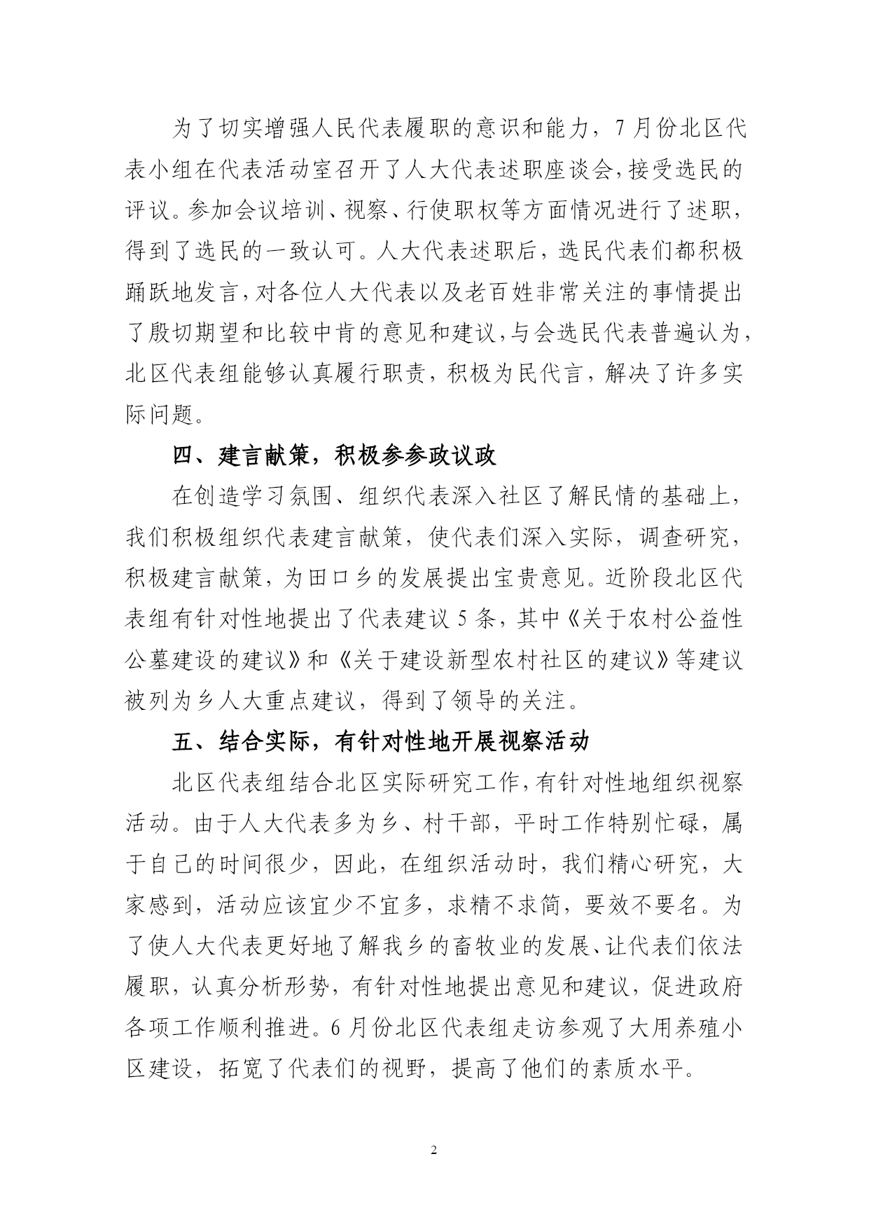 田口乡北区代表组阶段工作总结田口乡人民代表大会北区代表组在乡人大的正确领导下,认真贯彻落实科学发展观,组织人大代表开展各项活动,充分调动了代表的履职积极性,创造性地开展工作,通过全体代表的共同努力,较好地完成了乡人大主席团安排部署的各项工作任务。现就近阶段的工作开展情况总结如下:加强学习,不断提高代表素质代表素质不仅直接影响到代表尽职水平的发挥,也关系到对选民和社会所承担义务的履行。为此,北区代表组积极组织代表参加乡人大的各项学习和培训活动,以此来提高代表素质。4月份乡人大北区代表组全体成员在北区活动室进行了关于代表选举法以及人民代表权利与义务等相关培训。这些培训学习针对性和实效性很强,强化了代表们的依法履职意识和能力。深入选区,开展“五带头”、“三联系”、“一满意”听取民情民意为了响应县、乡人大提出的五带头”、“三联系”、“一满意”主题活动,北区代表组积极走访选民和群众,创新形式开展了一系列的宣讲活动。进行了广泛思想发动,使活动迅速在本辖区开展起来。提高了人民代表的履职水平,更重要的是听取了选民的心声,充分发挥了人民代表传递信息、建议和意见的义务和职责。三、认真总结,积极组织人民代表述职活动为了切实增强人民代表履职的意识和能力,7月份北区代表小组在代表活动室召开了人大代表述职座谈会,接受选民的评议。参加会议培训、视察、行使职权等方面情况进行了述职,得到了选民的一致认可。人大代表述职后,选民代表们都积极踊跃地发言,对各位人大代表以及老百姓非常关注的事情提出了殷切期望和比较中肯的意见和建议,与会选民代表普遍认为,北区代表组能够认真履行职责,积极为民代言,解决了许多实际问题。四、建言献策,积极参参政议政在创造学习氛围、组织代表深入社区了解民情的基础上,我们积极组织代表建言献策,使代表们深入实际,调查研究,积极建言献策,为田口乡的发展提出宝贵意见。近阶段北区代表组有针对性地提出了代表建议5条,其中《关于农村公益性公墓建设的建议》和《关于建设新型农村社区的建议》等建议被列为乡人大重点建议,得到了领导的关注。五、结合实际,有针对性地开展视察活动北区代表组结合北区实际研究工作,有针对性地组织视察活动。由于人大代表多为乡、村干部,平时工作特别忙碌,属于自己的时间很少,因此,在组织活动时,我们精心研究,大家感到,活动应该宜少不宜多,求精不求简,要效不要名。为了使人大代表更好地了解我乡的畜牧业的发展、让代表们依法履职,认真分析形势,有针对性地提出意见和建议,促进政府各项工作顺利推进。6月份北区代表组走访参观了大用养殖小区建设,拓宽了代表们的视野,提高了他们的素质水平。