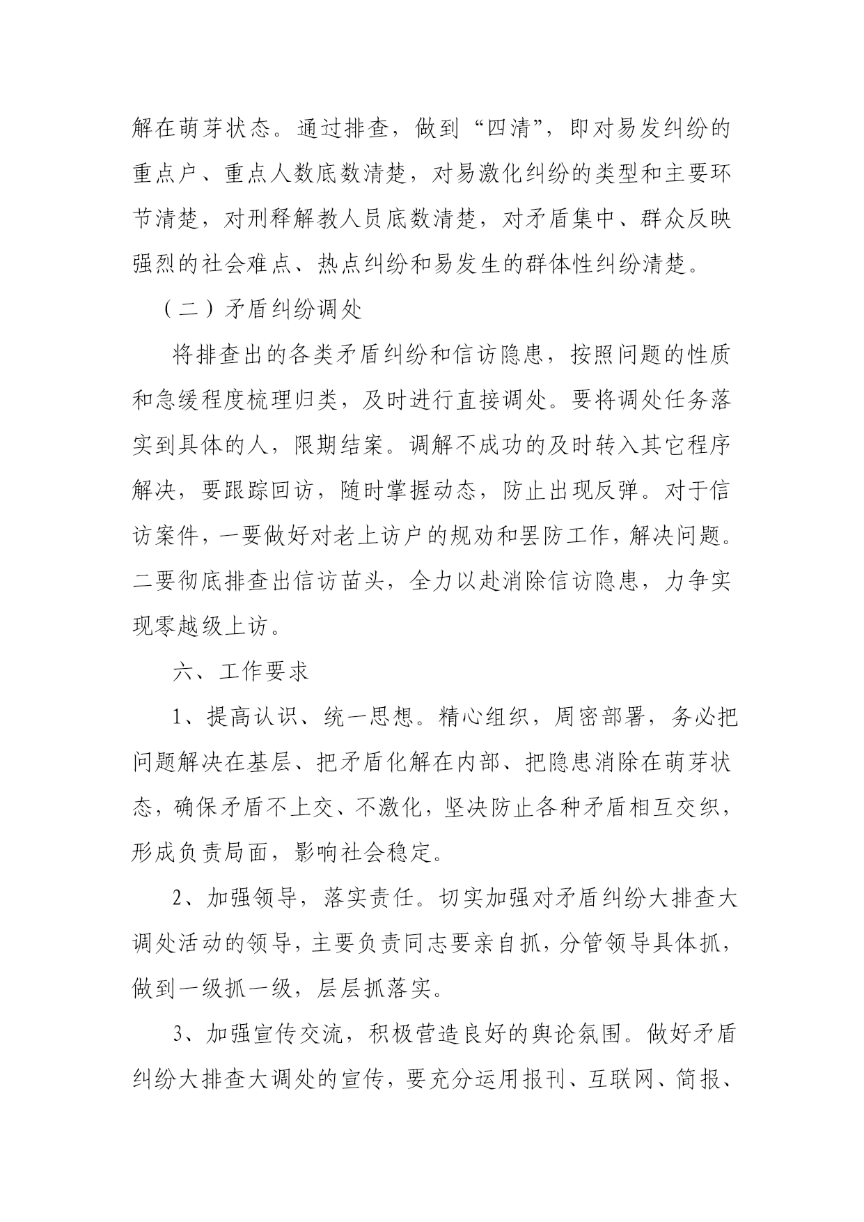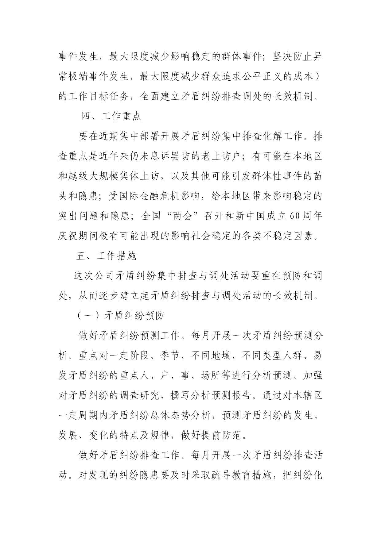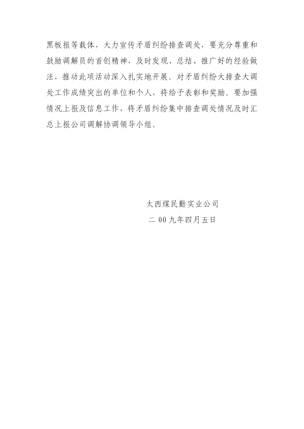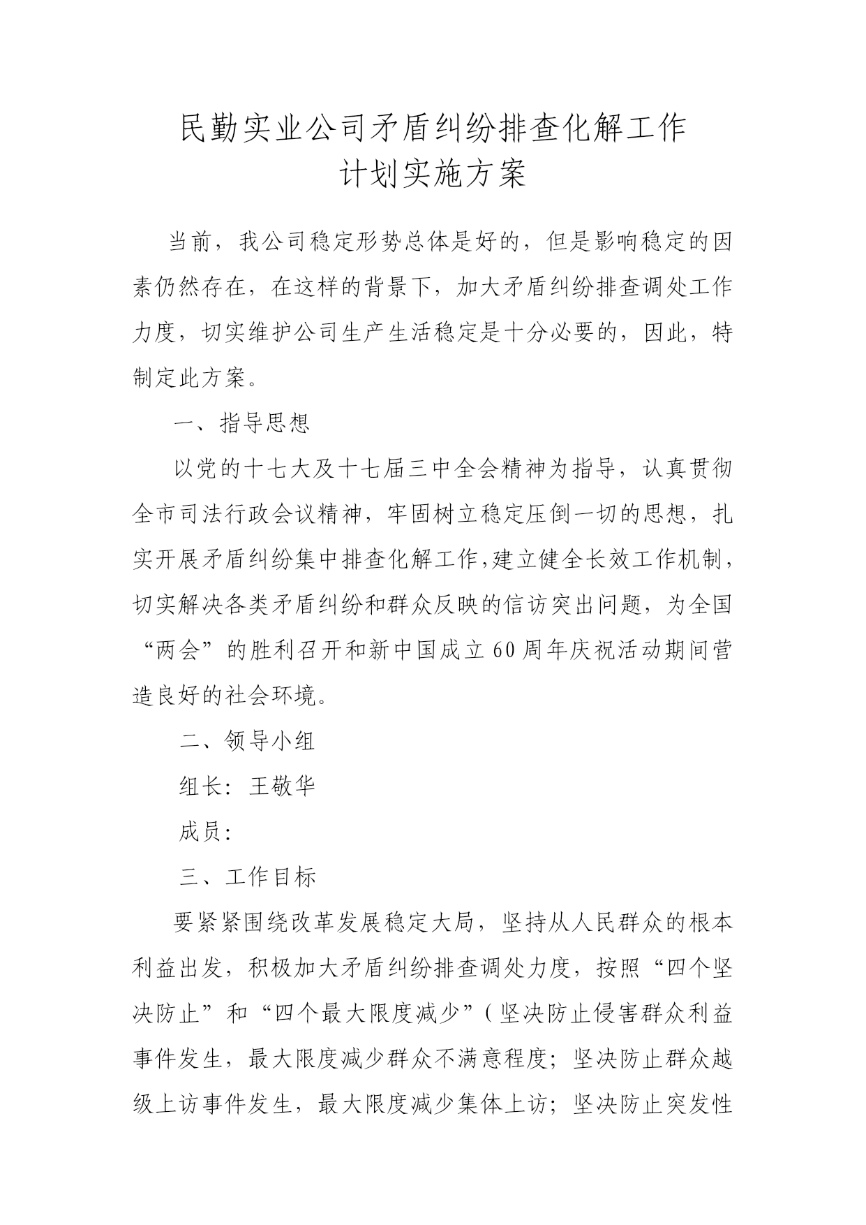 民勤实业公司矛盾纠纷排查化解工作计划实施方案当前,我公司稳定形势总体是好的,但是影响稳定的因素仍然存在,在这样的背景下,加大矛盾纠纷排查调处工作力度,切实维护公司生产生活稳定是十分必要的,因此,特制定此方案。一、指导思想以党的十七大及十七届三中全会精神为指导,认真贯彻全市司法行政会议精神,牢固树立稳定压倒一切的思想,扎实开展矛盾纠纷集中排查化解工作,建立健全长效工作机制,切实解决各类矛盾纠纷和群众反映的信访突出问题,为全国“两会”的胜利召开和新中国成立60周年庆祝活动期间营造良好的社会环境。二、领导小组组长:王敬华成员:三、工作目标要紧紧围绕改革发展稳定大局,坚持从人民群众的根本利益出发,积极加大矛盾纠纷排查调处力度,按照“四个坚决防止”和“四个最大限度减少”(坚决防止侵害群众利益事件发生,最大限度减少群众不满意程度;坚决防止群众越级上访事件发生,最大限度减少集体上访;坚决防止突发性事件发生,最大限度减少影响稳定的群体事件;坚决防止异常极端事件发生,最大限度减少群众追求公平正义的成本)的工作目标任务,全面建立矛盾纠纷排查调处的长效机制。四、工作重点要在近期集中部署开展矛盾纠纷集中排查化解工作。排查重点是近年来仍未息诉罢访的老上访户;有可能在本地区和越级大规模集体上访,以及其他可能引发群体性事件的苗头和隐患;受国际金融危机影响,给本地区带来影响稳定的突出问题和隐患;全国“两会”召开和新中国成立60周年庆祝期间极有可能出现的影响社会稳定的各类不稳定因素。五、工作措施这次公司矛盾纠纷集中排查与调处活动要重在预防和调处,从而逐步建立起矛盾纠纷排查与调处活动的长效机制。(一)矛盾纠纷预防做好矛盾纠纷预测工作。每月开展一次矛盾纠纷预测分析。重点对一定阶段、季节、不同地域、不同类型人群、易发矛盾纠纷的重点人、户、事、场所等进行分析预测。加强对矛盾纠纷的调查研究,撰写分析预测报告。通过对本辖区一定周期内矛盾纠纷总体态势分析,预测矛盾纠纷的发生、发展、变化的特点及规律,做好提前防范。做好矛盾纠纷排查工作。每月开展一次矛盾纠纷排查活动。对发现的纠纷隐患要及时采取疏导教育措施,把纠纷化解在萌芽状态。通过排查,做到“四清”,即对易发纠纷的重点户、重点人数底数清楚,对易激化纠纷的类型和主要环节清楚,对刑释解教人员底数清楚,对矛盾集中、群众反映强烈的社会难点、热点纠纷和易发生的群体性纠纷清楚。(二)矛盾纠纷调处将排查出的各类矛盾纠纷和信访隐患,按照问题的性质和急缓程度梳理归类,及时进行直接调处。要将调处任务落实到具体的人,限期结案。调解不成功的及时转入其它程序解决,要跟踪回访,随时掌握动态,防止出现反弹。对于信访案件,一要做好对老上访户的规劝和罢防工作,解决问题。二要彻底排查出信访苗头,全力以赴消除信访隐患,力争实现零越级上访。六、工作要求1、提高认识、统一思想。精心组织,周密部署,务必把问题解决在基层、把矛盾化解在内部、把隐患消除在萌芽状态,确保矛盾不上交、不激化,坚决防止各种矛盾相互交织,形成负责局面,影响社会稳定。2、加强领导,落实责任。切实加强对矛盾纠纷大排查大调处活动的领导,主要负责同志要亲自抓,分管领导具体抓,做到一级抓一级,层层抓落实。3、加强宣传交流,积极营造良好的舆论氛围。做好矛盾纠纷大排查大调处的宣传,要充分运用报刊、互联网、简报、黑板报等载体,大力宣传矛盾纠纷排查调处,要充分尊重和鼓励调解员的首创精神,及时发现、总结、推广好的经验做法,推动此项活动深入扎实地开展。对矛盾纠纷大排查大调处工作成绩突出的单位和个人,将给予表彰和奖励。要加强情况上报及信息工作,将矛盾纠纷集中排查调处情况及时汇总上报公司调解协调领导小组。太西煤民勤实业公司二00九年四月五日