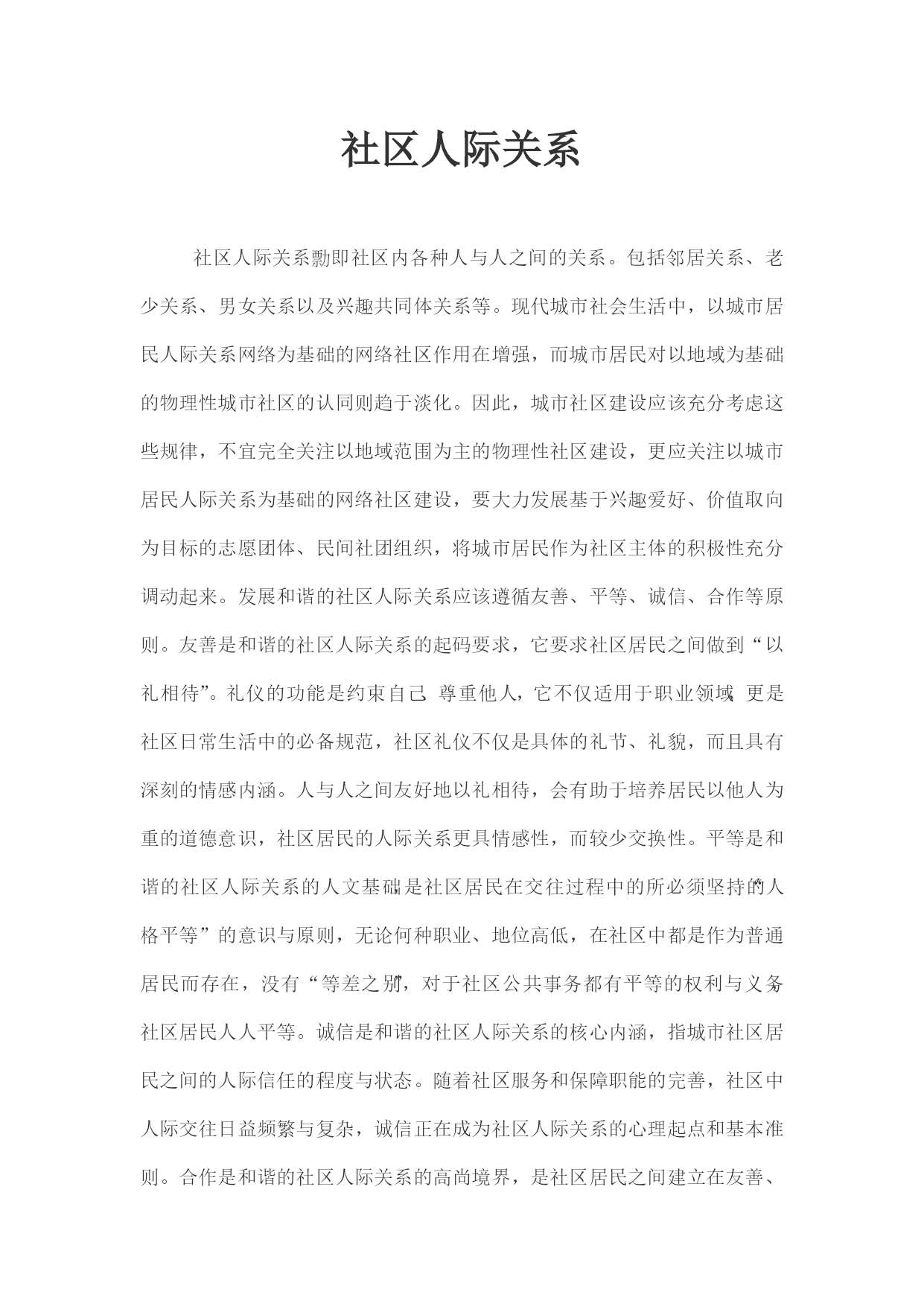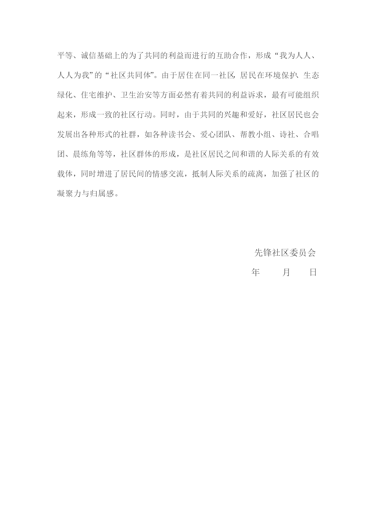 社区人际关系社区人际关系即社区内各种人与人之间的关系。包括邻居关系、老少关系、男女关系以及兴趣共同体关系等。现代城市社会生活中,以城市居民人际关系网络为基础的网络社区作用在增强,而城市居民对以地域为基础的物理性城市社区的认同则趋于淡化。因此,城市社区建设应该充分考虑这些规律,不宜完全关注以地域范围为主的物理性社区建设,更应关注以城市居民人际关系为基础的网络社区建设,要大力发展基于兴趣爱好、价值取向为目标的志愿团体、民间社团组织,将城市居民作为社区主体的积极性充分调动起来。发展和谐的社区人际关系应该遵循友善、平等、诚信、合作等原则。友善是和谐的社区人际关系的起码要求,它要求社区居民之间做到“以礼相待”。礼仪的功能是约束自己、尊重他人,它不仅适用于职业领域,更是社区日常生活中的必备规范,社区礼仪不仅是具体的礼节、礼貌,而且具有深刻的情感内涵。人与人之间友好地以礼相待,会有助于培养居民以他人为重的道德意识,社区居民的人际关系更具情感性,而较少交换性。平等是和谐的社区人际关系的人文基础,是社区居民在交往过程中的所必须坚持的“人格平等”的意识与原则,无论何种职业、地位高低,在社区中都是作为普通居民而存在,没有“等差之别”,对于社区公共事务都有平等的权利与义务,社区居民人人平等。诚信是和谐的社区人际关系的核心内涵,指城市社区居民之间的人际信任的程度与状态。随着社区服务和保障职能的完善,社区中人际交往日益频繁与复杂,诚信正在成为社区人际关系的心理起点和基本准则。合作是和谐的社区人际关系的高尚境界,是社区居民之间建立在友善、平等、诚信基础上的为了共同的利益而进行的互助合作,形成“我为人人、人人为我”的“社区共同体”。由于居住在同一社区,居民在环境保护、生态绿化、住宅维护、卫生治安等方面必然有着共同的利益诉求,最有可能组织起来,形成一致的社区行动。同时,由于共同的兴趣和爱好,社区居民也会发展出各种形式的社群,如各种读书会、爱心团队、帮教小组、诗社、合唱团、晨练角等等,社区群体的形成,是社区居民之间和谐的人际关系的有效载体,同时增进了居民间的情感交流,抵制人际关系的疏离,加强了社区的凝聚力与归属感。先锋社区委员会年月日