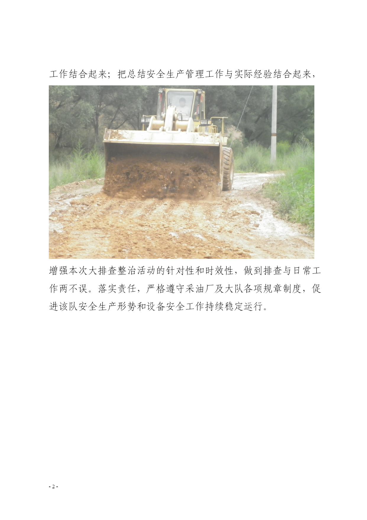 PAGE-2-PAGE-2-消除安全隐患优化生产环境——采油三大队消除安全隐患促进生产平稳运行采油三大队为了进一步做好安全生产工作,强化职工安全意识,确保生产安全平稳运行,于2012年7月,决定开展“安全隐患大排查整治活动”。对各班组房前屋后、油区道路、抽油机、车辆进行了安全隐患排查。通过这次房前屋后安全隐患大排查整治活动,发现部分车辆、抽油机、道路或大或小存在着安全隐患,针对检查出的问题,大队采取了相应措施,对存在的问题进行现场整改和限期整改,并奖罚分明,以便使职工认识到安全隐患大排查的重要性和必要性。为了此次检查,大队统筹安排,把大排查与日常设备维护和保养工作结合起来;把总结安全生产管理工作与实际经验结合起来,增强本次大排查整治活动的针对性和时效性,做到排查与日常工作两不误。落实责任,严格遵守采油厂及大队各项规章制度,促进该队安全生产形势和设备安全工作持续稳定运行。