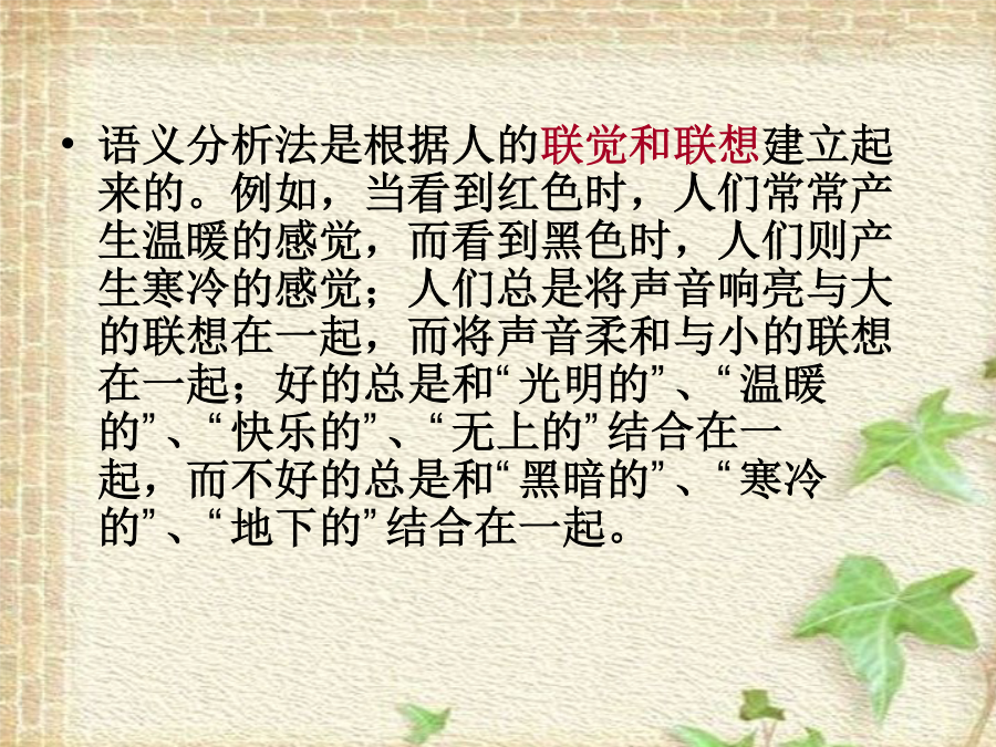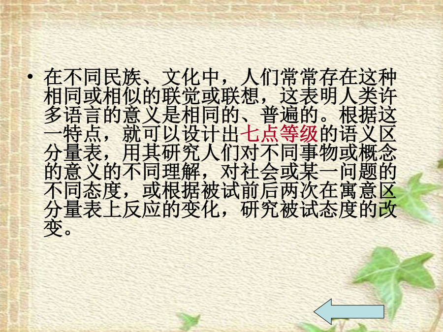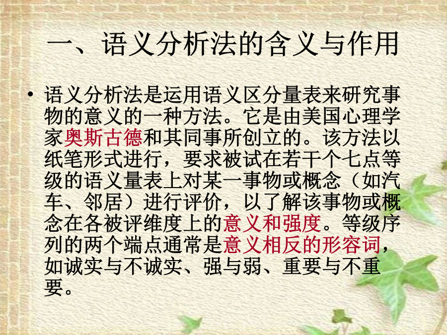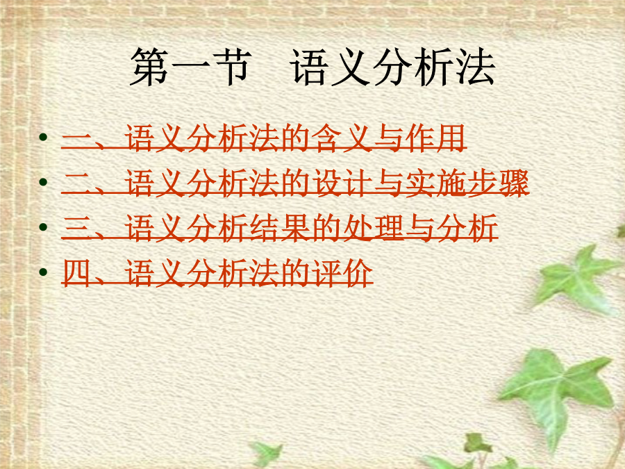 第十三章其他研究方法第一节语义分析法一、语义分析法的含义与作用语义分析法是根据人的联觉和联想建立起来的。例如,当看到红色时,人们常常产生温暖的感觉,而看到黑色时,人们则产生寒冷的感觉;人们总是将声音响亮与大的联想在一起,而将声音柔和与小的联想在一起;好的总是和“光明的”、“温暖的”、“快乐的”、“无上的”结合在一起,而不好的总是和“黑暗的”、“寒冷的”、“地下的”结合在一起。在不同民族、文化中,人们常常存在这种相同或相似的联觉或联想,这表明人类许多语言的意义是相同的、普遍的。根据这一特点,就可以设计出七点等级的语义区分量表,用其研究人们对不同事物或概念的意义的不同理解,对社会或某一问题的不同态度,或根据被试前后两次在寓意区分量表上反应的变化,研究被试态度的改变。二、语义分析法的设计与实施步骤3、选择具体评价的子项目及数量。确定了三个或其中一个或两个评价维度以后,就需要决定在每个维度上选择什么具体的子项目(如在性质维度上可选好与坏、善与恶、喜欢与憎恶等)及数量。前者通常视被评价的特定事物或概念而定,后者通常为三个或三个以上为宜。4、具体编制语义区分量表。编制时需将意义相反的形容词(如诚实与不诚实、强与弱)列于等级徐六的两边,注意不要在各具体评价的子项目上将性质方向相同的形容词都放在同一边,以防产生心理反应效应,影响研究结果。5、实施语义区分量表。可以集体施测,也可以个别施测,集体施测时还需防止被试间的相互影响。下面是一个语义区分量表的一部分:(被评人)(性质)好———————坏(力量)小———————大(活动)慢———————快(力量)强———————弱(性质)不友好———————友好(活动)活跃———————不活跃.1、通过分析比较两个或两个以上个体或团体在某一具体评价子项目或某一维度上的得分差异,了解他们之间的相似、接近程度和对事物、问题、社会的不同看法和态度。2、通过分析比较同一组被试在不同时间在某一具体评价子项目或某一维度上得分差异,了解他们对事物、问题或社会的看法与态度的改变情况。3、通过分析比较同一被试(或团体)在某以具体评价子项目或某一维度上对两个概念的不同评价结果,探讨这两个概念所含意义的接近程度,即语义距离。优点:第一,实施方便,趣味性强,易于被试了解与合作,可适用于较大年龄范围的被试。第二,语义区分量表客观统一,结果计分方式确定,易于计算机处理。第三,可在较短时间内收集较多的资料,向众多被试了解有关信息,节省人力、时间和经费。第四,可灵活应用于各类研究,根据研究的具体目的、内容、对象确定被评价的概念、事物和评价的维度与子项目。第五,可较客观的研究人们对事物意义的不同理解、对事物的主观态度极其改变,并特别使用于鉴别概念、个体间的相同点与不同点,进行跨文化比较研究。局限性:第一,语义区分量表的设计有一定的难度。数目多时不易选择项目与维度,很难选择两端意义互相对立的形容词。第二,只适用于研究较简单的、表面的问题,而很难对复杂问题进行深入的探讨和研究。第二节Q分类技术百度百科对于Q分类法的解释二、Q技术的设计与实施举例三、Q分类技术的类型四、Q技术的评价第三节内容分析法1、含义(一)确定研究目的三、内容分析结果的处理与分析四、内容分析的评价局限性:受材料限制比大,已有材料的真实性、倾向性和是有易于收集到等都影响着研究结果。结果以描述为主,他能解释材料的内容与结构,并由此了解有关被试的心理特征,但却难以说明为什么,解释能力较差。内容分析工作比较费时费力、枯燥乏味,要求研究者特别耐心、仔细,并进行长时间的阅读、评判、记录与计算。对评判者的素质有较高要求。由于分析维度固定,对许多新事物、新情况、突发事件等难以灵活处理。第四节口语报告法把录音结果及时转译成书面材料第五节社会测量法社会测量法的基本原理认为所有团体里都存在着相互作用的非正式组织,他们以积极或消极的人际情感联系为基础。团体内各个成员之间的选择实际上反映着他们之间心理上的关系,即肯定选择意味着接纳与赞赏,否定选择则是心理上排斥与拒绝的表示。一个人在积极标准上被其他团体成员选择次数越多,就说明他被其他成员接纳的程度越高,反之,一个人在消极标准上被其他成员选择的多,就说明他被其他成员排斥的程度越高。社会测量法的基本形式1、提名法2、猜人测验3、社会距离量表4、关系分析方法提名法猜人测验社会距离量表关系分析方法社会测量法的设计与测量二、施测社会测量法可进行个别施测或团体施测。首先要详细说明指导语,指出研究的目的,但不要说明某些对结果准确性有影响的真正的目的,以防产生主试效应。其次还要确定被试选择的范围、选择答案的数量、如何标记不同答案等,以便被试的选择符合要求;然后,说明答案不公开,让被试放心答。最后再正式施测。社会测量结果的整理与分析二、矩阵法即把参加测试的人员及其选择