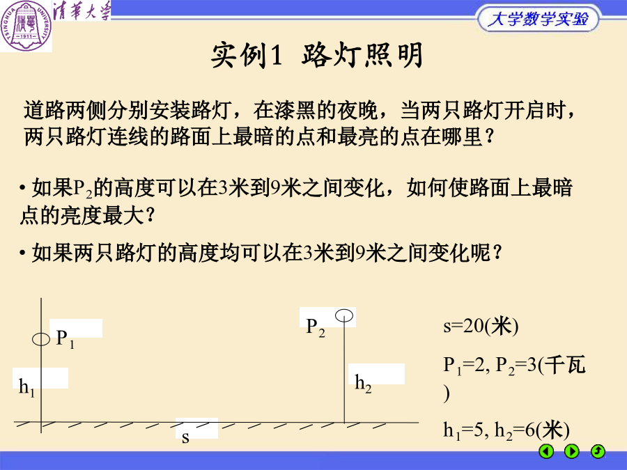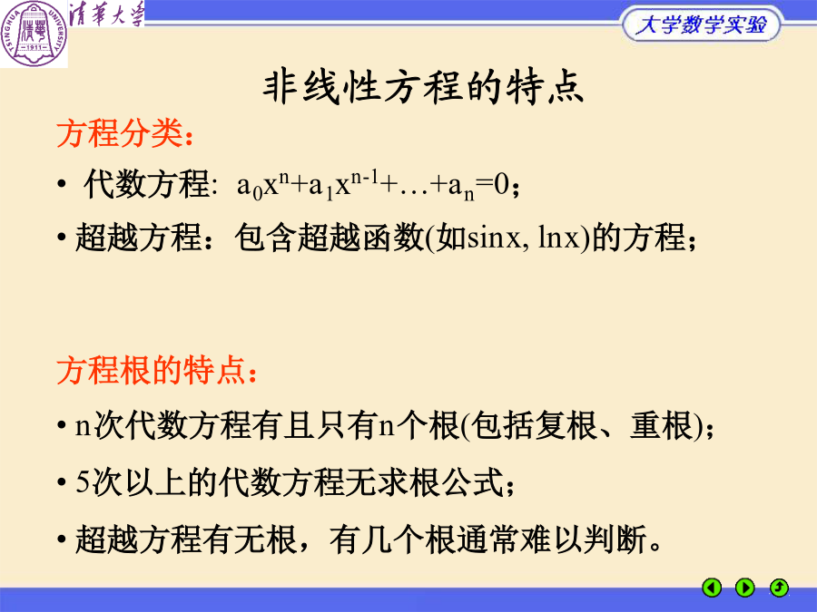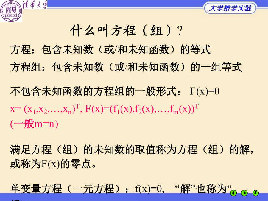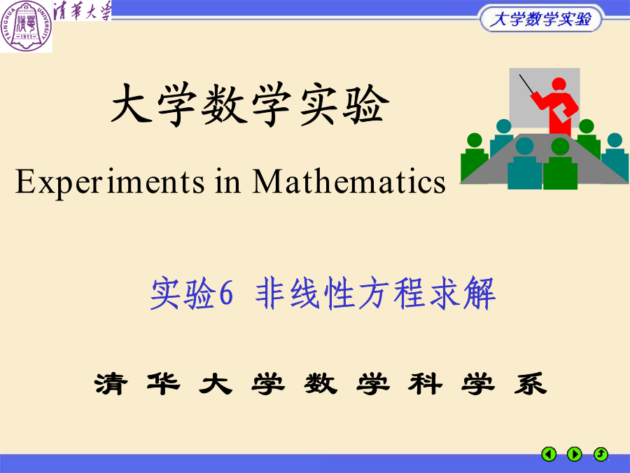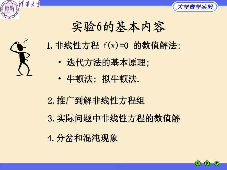 大学数学实验什么叫方程(组)?非线性方程的特点实验6的基本内容实例1路灯照明实例1路灯照明实例1路灯照明实例2均相共沸混合物的组分实例2均相共沸混合物的组分实例2均相共沸混合物的组分根的隔离:二分法二分法的原理例1非线性方程的迭代法(例)迭代法的几何解释迭代法的收敛性迭代法的收敛速度(收敛阶)结论:(x)的构造决定收敛速度牛顿切线法牛顿 割线法解非线性方程组的牛顿法解方程f(x)=0解方程f(x)=0的牛顿割线法MATLAB优化工具箱解非线性方程fsolve:多变量方程组F(x)=0求解牛顿法function[y,z]=newton(fv,df,x0,n,tol) x(1)=x0;b=1;k=1; whileor(k==1,abs(b)>tol*abs(x(k))) x(k+1)=x(k)-feval(fv,x(k))/feval(df,x(k)); b=x(k+1)-x(k); k=k+1; if(k>n) error('Error:Reachedmaximumiterationtimes');break; end end y=x(k-1); ifnargout>1 z=k-1; endkxk 0(1.000000,1.000000) 1(1.750000,1.250000) 2(1.589286,1.225000) 3(1.581160,1.224645) 4(1.581139,1.224745) 5(1.581139,1.224745)实例1路灯照明实例1路灯照明实例1路灯照明实例1路灯照明实例1路灯照明实例2均相共沸混合物的组分实例2均相共沸混合物的组分实例2均相共沸混合物的组分分岔与混沌现象分岔与混沌现象分岔与混沌现象分岔与混沌现象分岔与混沌现象分岔与混沌现象分岔与混沌现象布置实验