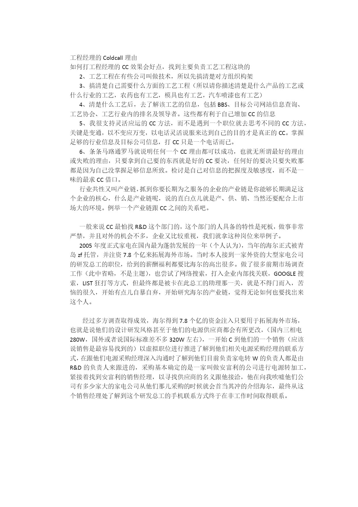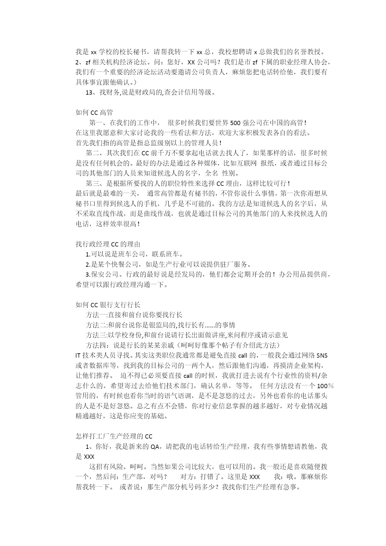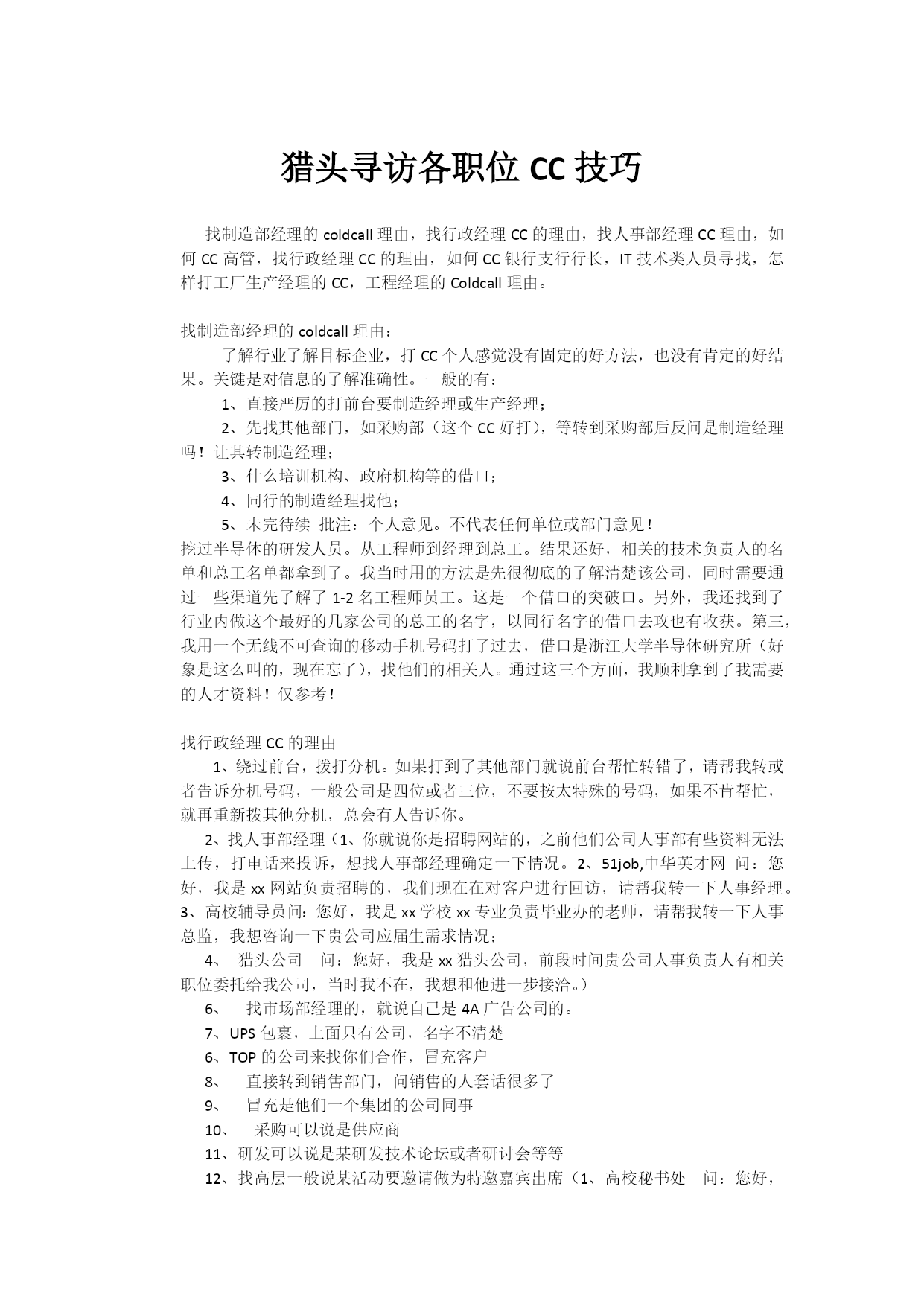 猎头寻访各职位CC技巧找制造部经理的coldcall理由,找行政经理CC的理由,找人事部经理CC理由,如何CC高管,找行政经理CC的理由,如何CC银行支行行长,IT技术类人员寻找,怎样打工厂生产经理的CC,工程经理的Coldcall理由。找制造部经理的coldcall理由:了解行业了解目标企业,打CC个人感觉没有固定的好方法,也没有肯定的好结果。关键是对信息的了解准确性。一般的有:1、直接严厉的打前台要制造经理或生产经理;2、先找其他部门,如采购部(这个CC好打),等转到采购部后反问是制造经理吗!让其转制造经理;3、什么培训机构、政府机构等的借口;4、同行的制造经理找他;5、未完待续批注:个人意见。不代表任何单位或部门意见!挖过半导体的研发人员。从工程师到经理到总工。结果还好,相关的技术负责人的名单和总工名单都拿到了。我当时用的方法是先很彻底的了解清楚该公司,同时需要通过一些渠道先了解了1-2名工程师员工。这是一个借口的突破口。另外,我还找到了行业内做这个最好的几家公司的总工的名字,以同行名字的借口去攻也有收获。第三,我用一个无线不可查询的移动手机号码打了过去,借口是浙江大学半导体研究所(好象是这么叫的,现在忘了),找他们的相关人。通过这三个方面,我顺利拿到了我需要的人才资料!仅参考!找行政经理CC的理由1、绕过前台,拨打分机。如果打到了其他部门就说前台帮忙转错了,请帮我转或者告诉分机号码,一般公司是四位或者三位,不要按太特殊的号码,如果不肯帮忙,就再重新拨其他分机,总会有人告诉你。2、找人事部经理(1、你就说你是招聘网站的,之前他们公司人事部有些资料无法上传,打电话来投诉,想找人事部经理确定一下情况。2、51job,中华英才网问:您好,我是xx网站负责招聘的,我们现在在对客户进行回访,请帮我转一下人事经理。3、高校辅导员问:您好,我是xx学校xx专业负责毕业办的老师,请帮我转一下人事总监,我想咨询一下贵公司应届生需求情况;4、猎头公司问:您好,我是xx猎头公司,前段时间贵公司人事负责人有相关职位委托给我公司,当时我不在,我想和他进一步接洽。)6、找市场部经理的,就说自己是4A广告公司的。7、UPS包裹,上面只有公司,名字不清楚6、TOP的公司来找你们合作,冒充客户8、直接转到销售部门,问销售的人套话很多了9、冒充是他们一个集团的公司同事10、采购可以说是供应商11、研发可以说是某研发技术论坛或者研讨会等等12、找高层一般说某活动要邀请做为特邀嘉宾出席(1、高校秘书处问:您好,我是xx学校的校长秘书,请帮我转一下xx总,我校想聘请x总做我们的名誉教授。2、zf相关机构经济论坛。问:您好,XX公司吗?我们是市zf下属的职业经理人协会,我们有一个重要的经济论坛活动要邀请公司负责人,麻烦您把电话转给他,我们要有具体事宜跟他确认。)13、找财务,说是财政局的,查会计信用等级。如何CC高管第一、在我们的工作中,很多时候我们要世界500强公司在中国的高管!在这里我愿意和大家讨论我的一些看法和方法,欢迎大家积极发表各自的看法。首先我们指的高管是指总监级别以上的管理人员!第二、其次我们在CC前千万不要拿起电话就去找人了,如果那样的话,很多时候是没有任何机会的。最好的办法是通过各种媒体,比如互联网报纸,或者通过目标公司的其他部门的人员来知道候选人的名字,全名性别。第三、是根据所要找的人的职位特性来选择CC理由,这样比较可行!最后就是最难的一关,通常高管都是有秘书的,不管你说什么事情,第一次你甭想从秘书口里得到候选人的手机,几乎是不可能的。我的方法是知道候选人的名字后,从不采取直线作战,而是曲线作战,也就是通过目标公司的其他部门的人来找候选人的电话,这样效率很高!找行政经理CC的理由1.可以说是班车公司,联系班车。2.是某个快餐公司,如是生产行业可以说提供驻厂服务。3.保安公司。行政的最好说是经发局的,他们都会定期开会的!办公用品提供商,希望可以跟行政经理沟通一下。如何CC银行支行行长方法一:直接和前台说你要找行长方法二:和前台说你是银监局的,找行长有......的事情方法三:以学校身份,和前台说请行长出面做讲座,来问程序或请示意见方法四:说是行长的某某亲戚(呵呵好像那个帖子有介绍此方法)IT技术类人员寻找。其实这类职位我通常都是避免直接call的,一般我会通过网络SNS或者数据库等,找到我的目标公司的一两个人,然后跟他们沟通,再摸清企业架构,让他们推荐。迫不得已必须要直接call的时候,我就打进去说有个行业性的资料/杂志什么的,希望寄过去给他们技术部门,确认名单,等等。任何方法没有一个100%管用的,有时候也看你当时的语气语调,是不是忽悠的过去,另外也看你的电话那头的人是不是好忽悠。总之有点不会错,你对行业信息掌握的越多越好,对专业情况越精通越