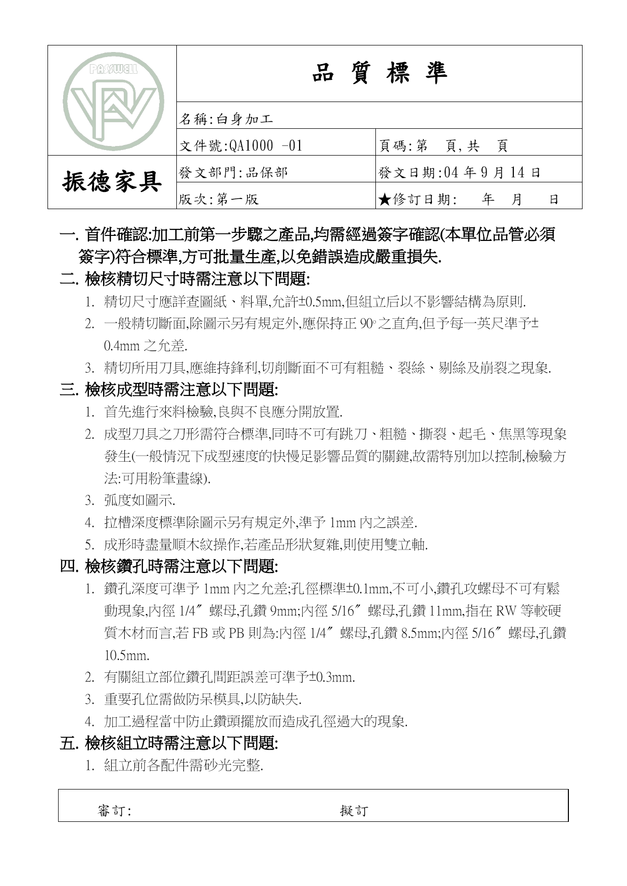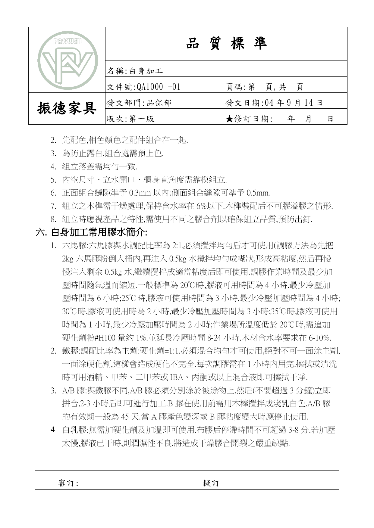 品質標準名稱:白身加工文件號:QA1000-01頁碼:第頁,共頁振德家具發文部門:品保部發文日期:04年9月14日版次:第一版★修訂日期:年月日審訂:擬訂首件確認:加工前第一步驟之產品,均需經過簽字確認(本單位品管必須簽字)符合標準,方可批量生產,以免錯誤造成嚴重損失.檢核精切尺寸時需注意以下問題:精切尺寸應詳查圖紙、料單,允許±0.5mm,但組立后以不影響結構為原則.一般精切斷面,除圖示另有規定外,應保持正90o之直角,但予每一英尺準予±0.4mm之允差.精切所用刀具,應維持鋒利,切削斷面不可有粗糙、裂絲、剔絲及崩裂之現象.檢核成型時需注意以下問題:首先進行來料檢驗,良與不良應分開放置.成型刀具之刀形需符合標準,同時不可有跳刀、粗糙、撕裂、起毛、焦黑等現象發生(一般情況下成型速度的快慢足影響品質的關鍵,故需特別加以控制,檢驗方法:可用粉筆畫線).弧度如圖示.拉槽深度標準除圖示另有規定外,準予1mm內之誤差.成形時盡量順木紋操作,若產品形狀复雜,則使用雙立軸.檢核鑽孔時需注意以下問題:鑽孔深度可準予1mm內之允差;孔徑標準±0.1mm,不可小,鑽孔攻螺母不可有鬆動現象,內徑1/4〞螺母,孔鑽9mm;內徑5/16〞螺母,孔鑽11mm,指在RW等較硬質木材而言,若FB或PB則為:內徑1/4〞螺母,孔鑽8.5mm;內徑5/16〞螺母,孔鑽10.5mm.有關組立部位鑽孔間距誤差可準予±0.3mm.重要孔位需做防呆模具,以防缺失.加工過程當中防止鑽頭擺放而造成孔徑過大的現象.檢核組立時需注意以下問題:組立前各配件需砂光完整.先配色,相色顏色之配件組合在一起.為防止露白,組合處需預上色.組立落差需均勻一致.內空尺寸、立水開口、櫃身直角度需靠模組立.正面組合縫隙準予0.3mm以內;側面組合縫隙可準予0.5mm.組立之木榫需干燥處理,保持含水率在6%以下.木榫裝配后不可膠溢膠之情形.組立時應視產品之特性,需使用不同之膠合劑以確保組立品質,預防出釘.白身加工常用膠水簡介:六馬膠:六馬膠與水調配比率為2:1,必須攪拌均勻后才可使用(調膠方法為先把2kg六馬膠粉倒入桶內,再注入0.5kg水攪拌均勻成糊狀,形成高粘度,然后再慢慢注入剩余0.5kg水,繼續攪拌成適當粘度后即可使用.調膠作業時間及最少加壓時間隨氣溫而縮短.一般標準為20℃時,膠液可用時間為4小時.最少冷壓加壓時間為6小時;25℃時,膠液可使用時間為3小時,最少冷壓加壓時間為4小時;30℃時,膠液可使用時為2小時,最少冷壓加壓時間為3小時;35℃時,膠液可使用時間為1小時,最少冷壓加壓時間為2小時;作業場所溫度低於20℃時,需追加硬化劑粉#H100量約1%.並延長冷壓時間8-24小時.木材含水率要求在6-10%.鐵膠:調配比率為主劑:硬化劑=1:1.必須混合均勻才可使用,絕對不可一面涂主劑,一面涂硬化劑,這樣會造成硬化不完全.每次調膠需在1小時內用完.擦拭或清洗時可用酒精、甲苯、二甲苯或IBA、丙酮或以上混合液即可擦拭干凈.A/B膠:與鐵膠不同,A/B膠必須分別涂於被涂物上,然后(不要超過3分鐘)立即拼合,2-3小時后即可進行加工.B膠在使用前需用木棒攪拌成淺乳白色.A/B膠的有效期一般為45天.當A膠產色變深或B膠粘度變大時應停止使用.白乳膠:無需加硬化劑及加溫即可使用.布膠后停滯時間不可超過3-8分.若加壓太慢,膠液已干時,則潤濕性不良,將造成干燥膠合開裂之嚴重缺點.