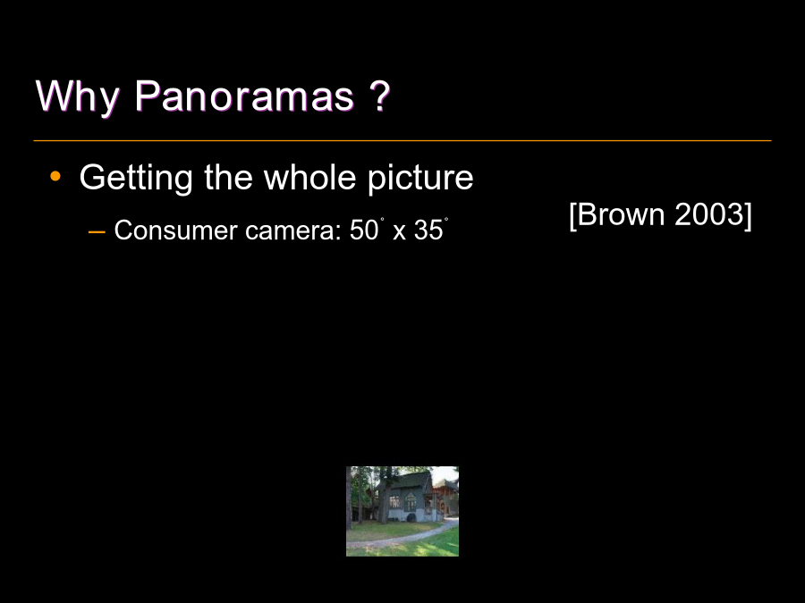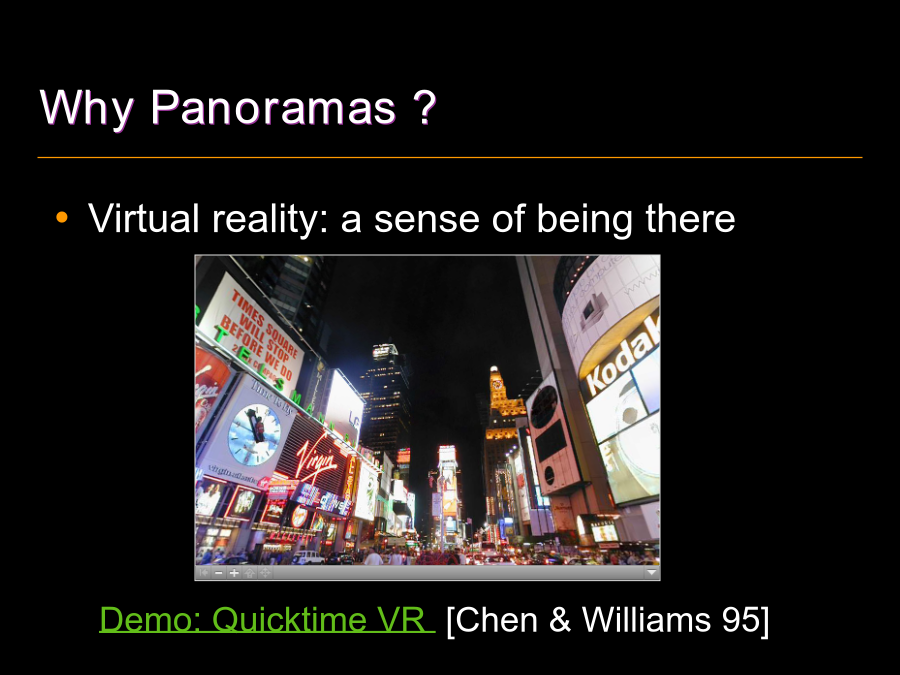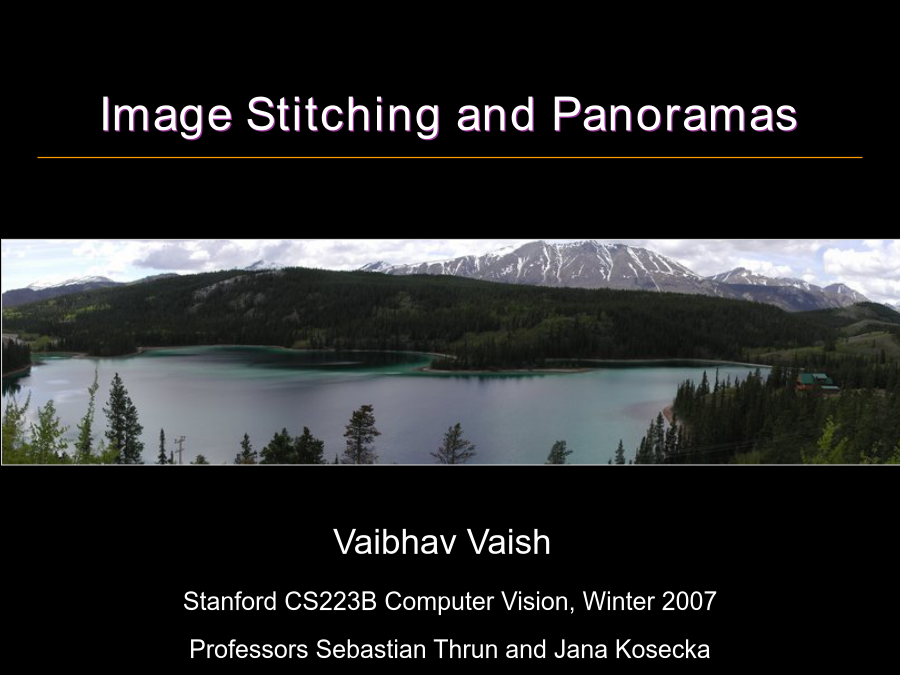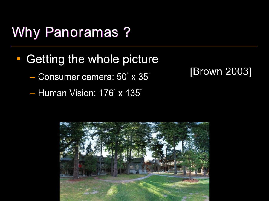 ImageStitchingandPanoramasWhyPanoramas?WhyPanoramas?WhyPanoramas?WhyPanoramas?WhyPanoramas?TheFirstPanoramas……andPanoramicCamerasHowtheyworkHowtheywork(usingComputerVision)Today’sAgendaIncreasingtheFieldofViewExampleProjectionontoCommonImagePlaneProjectionontoCommonImagePlaneCameraCenterAligningImagesCameraCenter(0,0,0)CameraCenter(0,0,0)CameraCenter(0,0,0)Sebastian’sCountingGameSebastian’sCountingGameFindingthehomographiesFindingthehomographiesFindingthehomographiesFindingthehomographiesHomographiesbyFeatureMatchingHomographiesbyFeatureMatchingSebastian’sCountingGameSebastian’sCountingGameMatchingSIFTFeaturesRejectOutliersusingRANSACStitchingImagesviaHomographiesWhydowegetseams?Multi-bandBlendingPanoramicStitchingAlgorithmDowehavetoprojectontoaplane?CylindricalProjectionGeneralCameraMotionToday’sAgendaAutostitchAutostitch:ExampleAutostitchMoreSoftwareSummaryLimitationsToday’sAgendaVideoPanoramasPanoramicVideoTexturesPanoramicVideoTexturesMulti-perspectivePanoramasMulti-perspectivePanoramasMulti-perspectivePanoramasDrivingdirectionsofthefuture?LoftierGoal:computingphotographsMulti-perspectivePanoramas