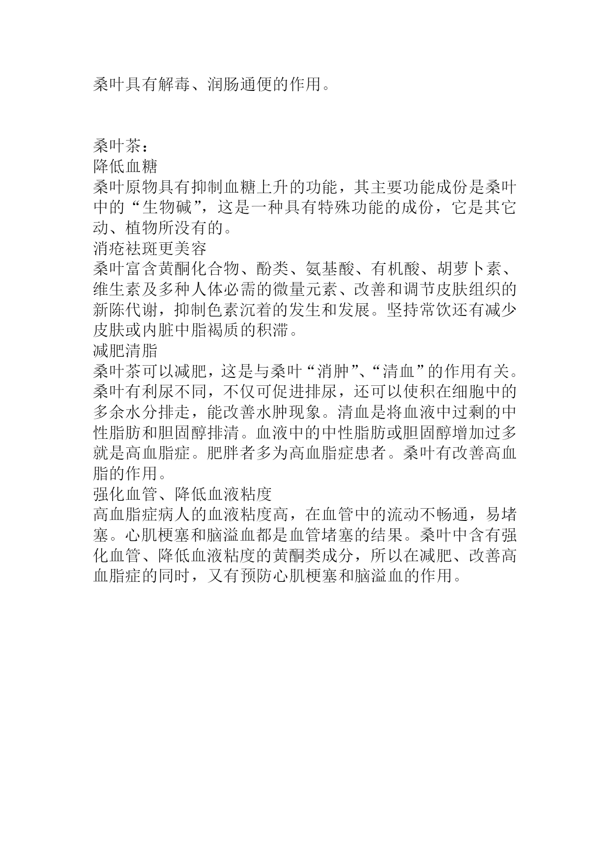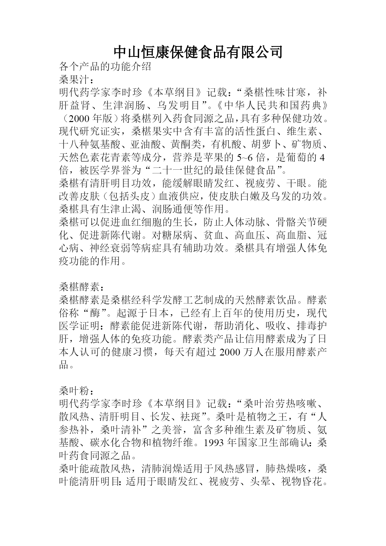 中山恒康保健食品有限公司各个产品的功能介绍桑果汁:明代药学家李时珍《本草纲目》记载:“桑椹性味甘寒,补肝益肾、生津润肠、乌发明目”。《中华人民共和国药典》(2000年版)将桑椹列入药食同源之品,具有多种保健功效。现代研究证实,桑椹果实中含有丰富的活性蛋白、维生素、十八种氨基酸、亚油酸、黄酮类,有机酸、胡萝卜、矿物质、天然色素花青素等成分,营养是苹果的5~6倍,是葡萄的4倍,被医学界誉为“二十一世纪的最佳保健食品”。桑椹有清肝明目功效,能缓解眼睛发红、视疲劳、干眼。能改善皮肤(包括头皮)血液供应,使皮肤白嫩及乌发的功效。桑椹具有生津止渴、润肠通便等作用。桑椹可以促进血红细胞的生长,防止人体动脉、骨骼关节硬化、促进新陈代谢。对糖尿病、贫血、高血压、高血脂、冠心病、神经衰弱等病症具有辅助功效。桑椹具有增强人体免疫功能的作用。桑椹酵素:桑椹酵素是桑椹经科学发酵工艺制成的天然酵素饮品。酵素俗称“酶”。起源于日本,已经有上百年的使用历史,现代医学证明:酵素能促进新陈代谢,帮助消化、吸收、排毒护肝,增强人体的免疫功能。酵素类产品让信用酵素成为了日本人认可的健康习惯,每天有超过2000万人在服用酵素产品。桑叶粉:明代药学家李时珍《本草纲目》记载:“桑叶治劳热咳嗽、散风热、清肝明目、长发、袪斑”。桑叶是植物之王,有“人参热补,桑叶清补”之美誉,富含多种维生素及矿物质、氨基酸、碳水化合物和植物纤维。1993年国家卫生部确认:桑叶药食同源之品。桑叶能疏散风热,清肺润燥适用于风热感冒,肺热燥咳,桑叶能清肝明目:适用于眼睛发红、视疲劳、头晕、视物昏花。桑叶具有解毒、润肠通便的作用。桑叶茶:降低血糖桑叶原物具有抑制血糖上升的功能,其主要功能成份是桑叶中的“生物碱”,这是一种具有特殊功能的成份,它是其它动、植物所没有的。消疮袪斑更美容桑叶富含黄酮化合物、酚类、氨基酸、有机酸、胡萝卜素、维生素及多种人体必需的微量元素、改善和调节皮肤组织的新陈代谢,抑制色素沉着的发生和发展。坚持常饮还有减少皮肤或内脏中脂褐质的积滞。减肥清脂桑叶茶可以减肥,这是与桑叶“消肿”、“清血”的作用有关。桑叶有利尿不同,不仅可促进排尿,还可以使积在细胞中的多余水分排走,能改善水肿现象。清血是将血液中过剩的中性脂肪和胆固醇排清。血液中的中性脂肪或胆固醇增加过多就是高血脂症。肥胖者多为高血脂症患者。桑叶有改善高血脂的作用。强化血管、降低血液粘度高血脂症病人的血液粘度高,在血管中的流动不畅通,易堵塞。心肌梗塞和脑溢血都是血管堵塞的结果。桑叶中含有强化血管、降低血液粘度的黄酮类成分,所以在减肥、改善高血脂症的同时,又有预防心肌梗塞和脑溢血的作用。