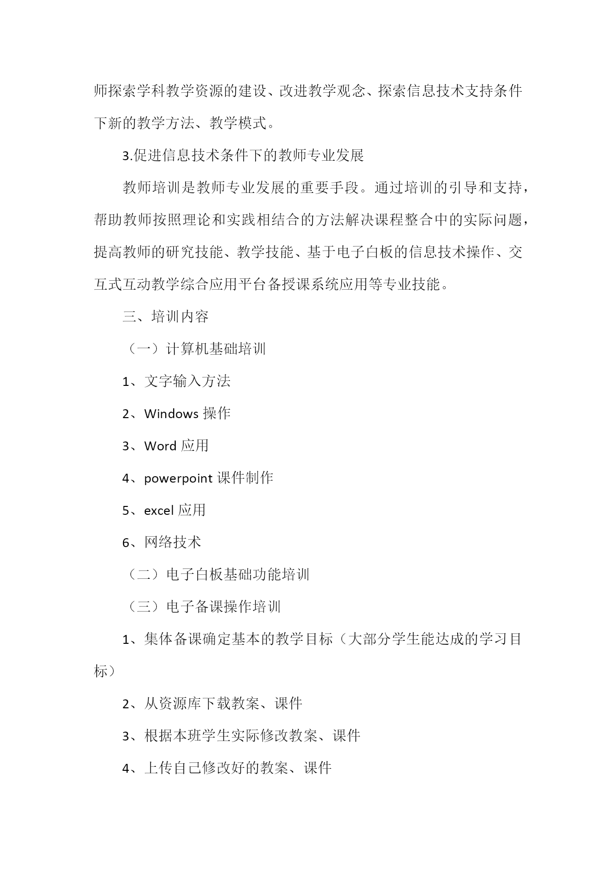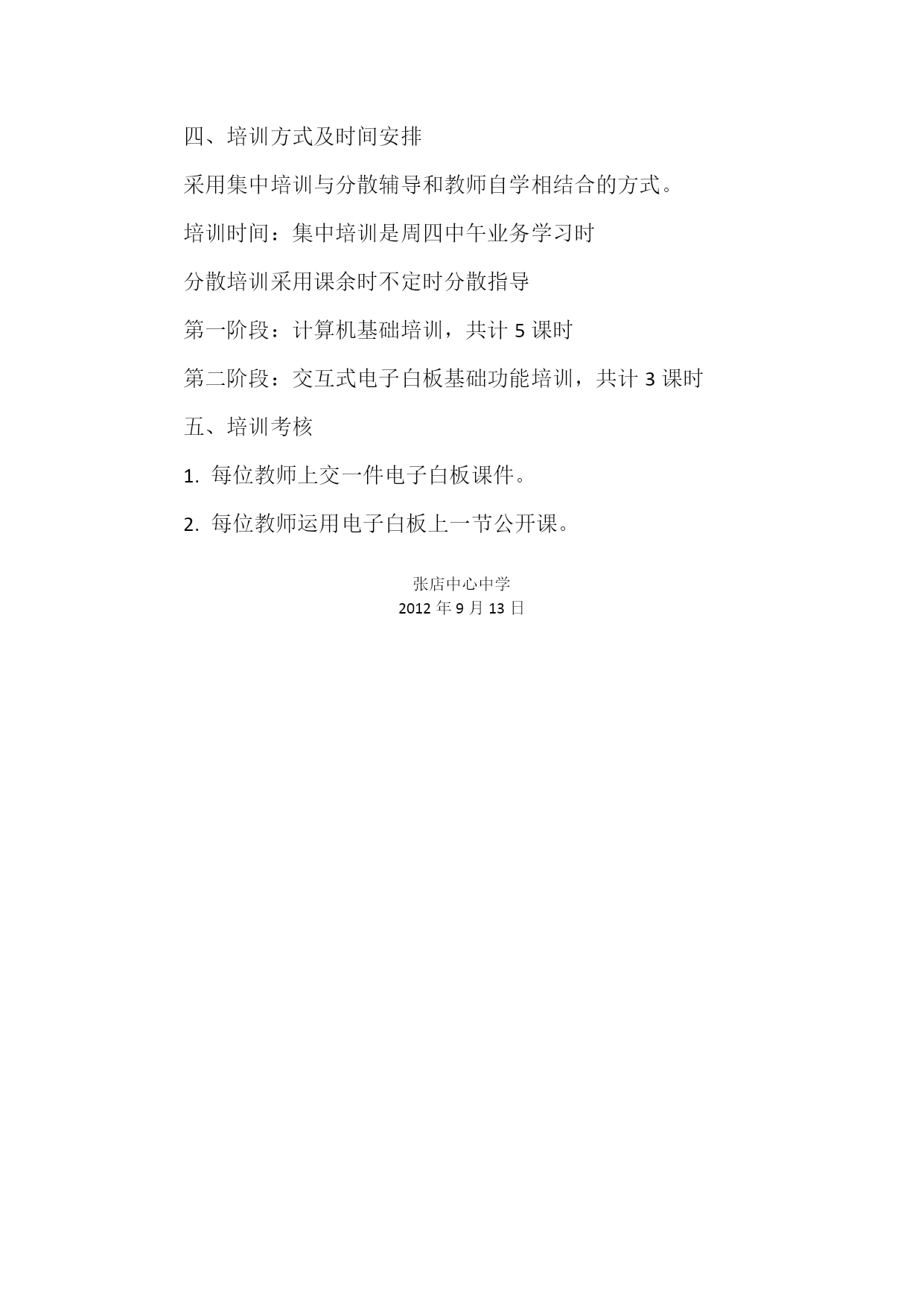 班班通校本学科教师培训方案根据《关于安徽省“十二五”中小学教师培训工作的实施意见》精神,安徽省教育厅《关于开展义务教育薄弱学校标准化建设“班班通”教学应用培训的通知》(省电教〔2012〕47号)及《关于开展义务教育薄弱学校标准化建设“班班通”教学应用培训的通知》(教电函〔2012〕95号)等文件精神要求,为了认真组织教师参加班班通使用培训、考核,为了达到较为理想的效果,指导好我们的培训工作,我们特制定此培训方案。一,建立培训领导小组,指导培训工作组长:鲁舜校长副组长:刘子标副校长业务主任:郑小伟办公室主任三亚市凤凰中学“班班通”培训方案二、培训目标1.对互动教学理念的认同“班班通”的使用重在落实到日常课堂教学中,教师能够在日常的教学工作中有效应用,把“班班通”作为支持教学的工具、助手和伙伴,提高教学效果和效率,完成教育教学目标,实现“班班通”和日常课堂教学的有机融合,而互动教学理念的认同,是“班班通”应用的基石。2.提高教师基于互动技术的教学技能教师在培训的过程中,逐步掌握“班班通”的操作技能,引领教师探索学科教学资源的建设、改进教学观念、探索信息技术支持条件下新的教学方法、教学模式。3.促进信息技术条件下的教师专业发展教师培训是教师专业发展的重要手段。通过培训的引导和支持,帮助教师按照理论和实践相结合的方法解决课程整合中的实际问题,提高教师的研究技能、教学技能、基于电子白板的信息技术操作、交互式互动教学综合应用平台备授课系统应用等专业技能。三、培训内容(一)计算机基础培训1、文字输入方法2、Windows操作3、Word应用4、powerpoint课件制作5、excel应用6、网络技术(二)电子白板基础功能培训(三)电子备课操作培训1、集体备课确定基本的教学目标(大部分学生能达成的学习目标)2、从资源库下载教案、课件3、根据本班学生实际修改教案、课件4、上传自己修改好的教案、课件四、培训方式及时间安排采用集中培训与分散辅导和教师自学相结合的方式。培训时间:集中培训是周四中午业务学习时分散培训采用课余时不定时分散指导第一阶段:计算机基础培训,共计5课时第二阶段:交互式电子白板基础功能培训,共计3课时五、培训考核1.每位教师上交一件电子白板课件。2.每位教师运用电子白板上一节公开课。张店中心中学2012年9月13日