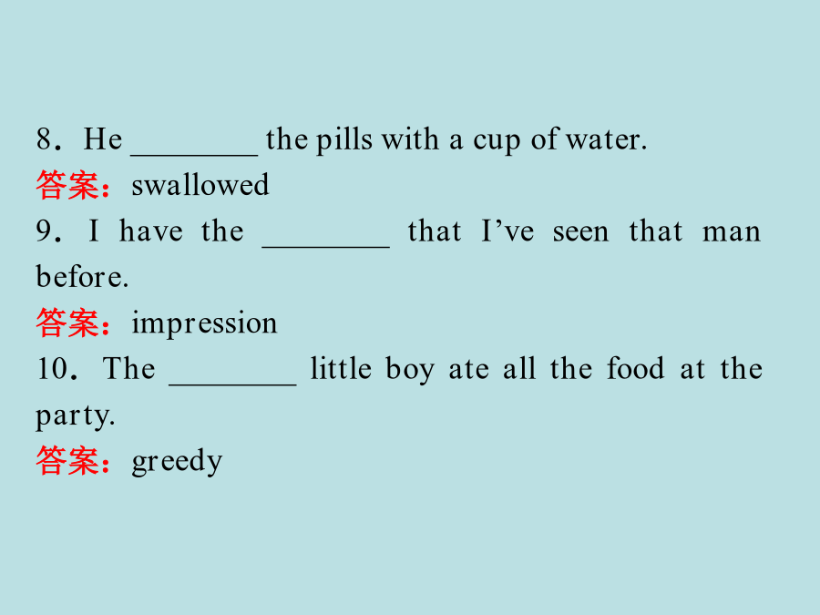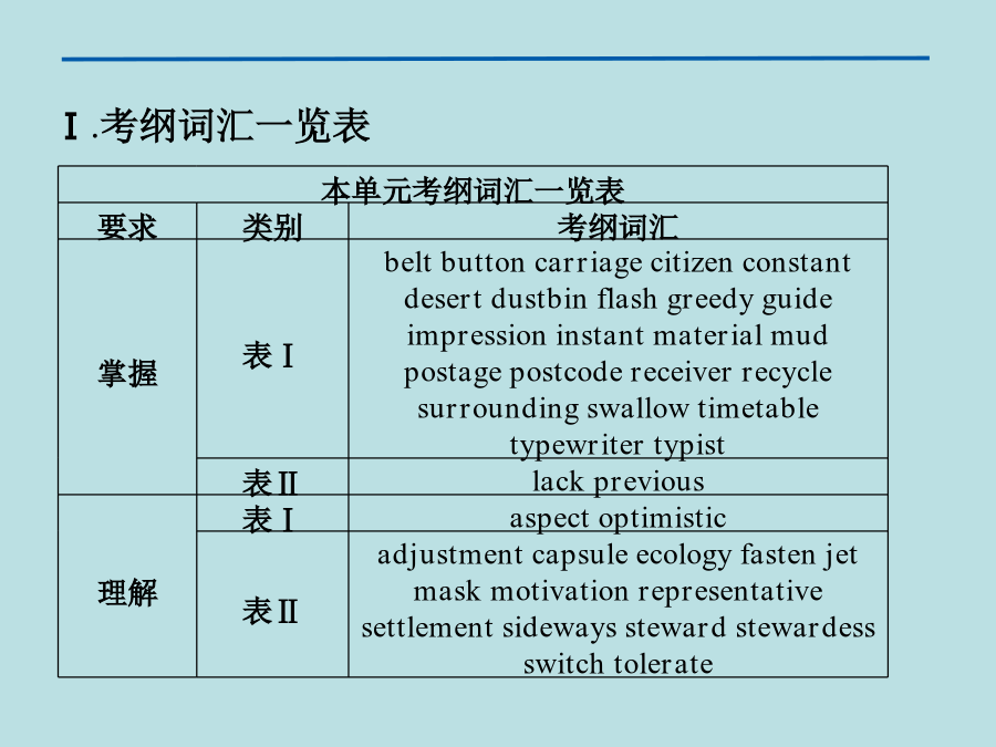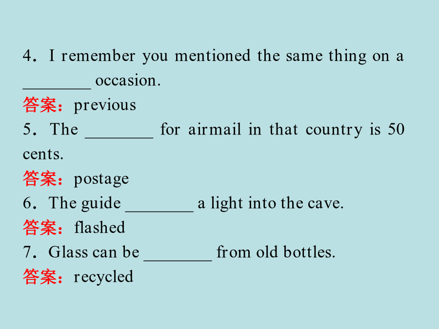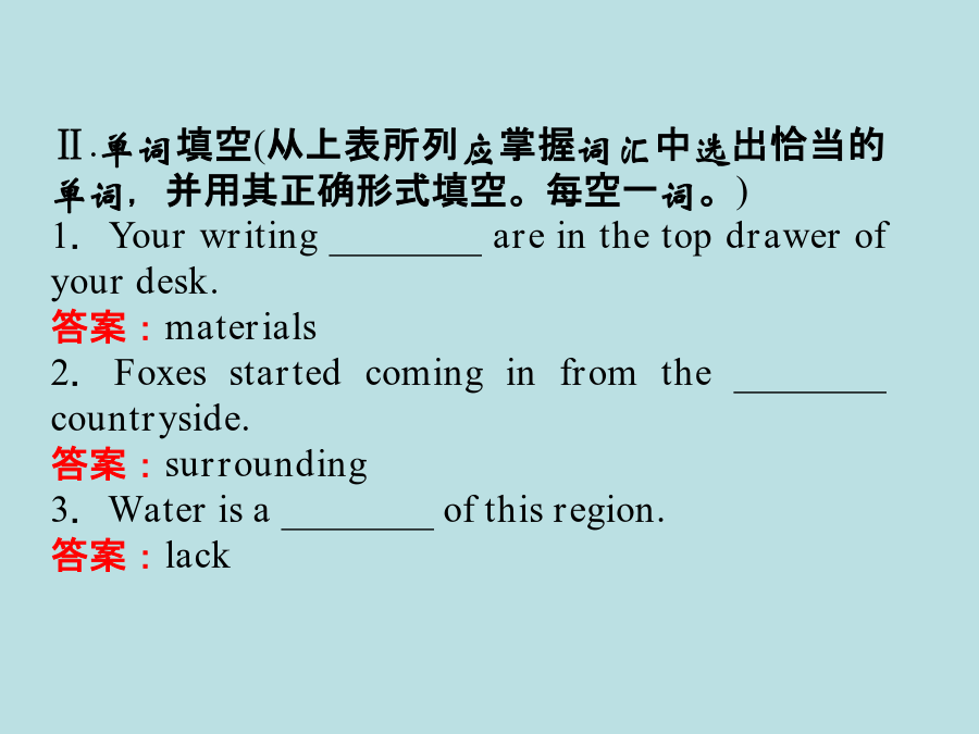 SectionⅤ本单元考纲词汇专练Ⅰ.考纲词汇一览表Ⅱ.单词填空(从上表所列应掌握词汇中选出恰当的单词,并用其正确形式填空。每空一词。)1.Yourwriting________areinthetopdrawerofyourdesk.答案:materials2.Foxesstartedcominginfromthe________countryside.答案:surrounding3.Waterisa________ofthisregion.答案:lack4.Irememberyoumentionedthesamethingona________occasion.答案:previous5.The________forairmailinthatcountryis50cents.答案:postage6.Theguide________alightintothecave.答案:flashed7.Glasscanbe________fromoldbottles.答案:recycled8.He________thepillswithacupofwater.答案:swallowed9.Ihavethe________thatI’veseenthatmanbefore.答案:impression10.The________littleboyateallthefoodattheparty.答案:greedyⅢ.完成句子(根据所给汉语提示,在空格中填入适当的词语完成句子。词数不限。)1.新教师给学生留下了一个好印象。Thenewteacher__________________________onthestudents.答案:madeagoodimpression2.丹麦纸张的回收率达到85%。Denmark____________________________itspaper.答案:recyclesnearly85%of3.她抑制自己的不快,强颜欢笑。__________________________andsmiled.答案:Sheswallowedherdispleasure4.她好像什么也不缺。Shedoesn’t______________________________.答案:seemtolackanything5.这一工作无需相关的经验。________________________forthisjob.答案:NopreviousexperienceisnecessaryⅣ.连词成段(根据下面的题目要求写出一个语段)假如你是福建某中学高二学生李华,拟参加某英文报社组织的编故事大赛。请根据如下要求将参赛作品以附件形式发电子邮件到storymaking@126.com.1.所编故事中需含有guide,desert,button,carriage,mud,swallow,greedy这7个词;2.文长不少于90词,且仅能用7个句子表达,其中一个是表语从句,另一个句子含有过去分词作状语的用法;3.注意短文的连贯性、趣味性与可读性。词语串串练I①tookupajobinacompany②previously.However,for③lackofexperience,Icouldn’t④toleratethepressure;asaresult,Ilostthejob.Iwas⑤uncertainwhatIcoulddonext.Atthattimeabadideacameintomymindtome⑥constantlythatIwanttodie.IrealizedIhad⑦slidintoahardtimewhenIcouldn’tmakean⑧adjustmentbymyself.Oneday,astoryontheInternetmadeastrong⑨impressiononmewhenIwasatfirstsightofit,whichwasaboutadisabledgirl.Shesaid,“AlthoughIamdisabled,Iamstillgratefultoeverything,astheygivemethepreciouslife.IbelieveIcanalwaysfindthe⑩settlementtoeverythinghoweverdifficultthetroubleis.SoIam⑪optimistic.”Thosewordsrefreshedmeinan⑫instant.It⑬guidedmetoanewlife.我先前在一家公司从事一份工作。然而由于缺乏经验,我无法忍受压力,结果我失业了。我不确定我下一步能做什么。在那时,一个想去死的糟糕念头不断地出现在我脑海里。我意识到我已经不知不觉地陷入到