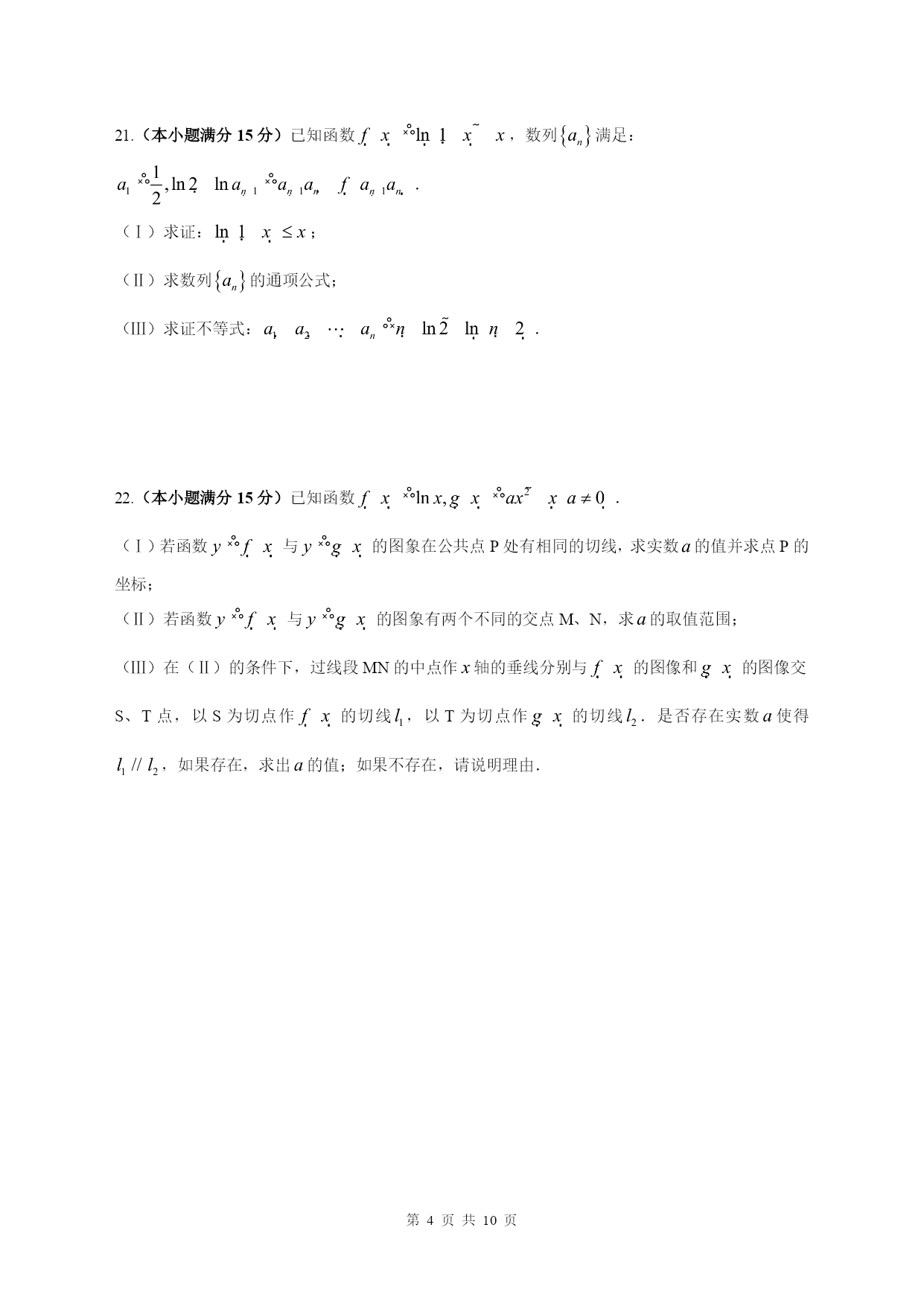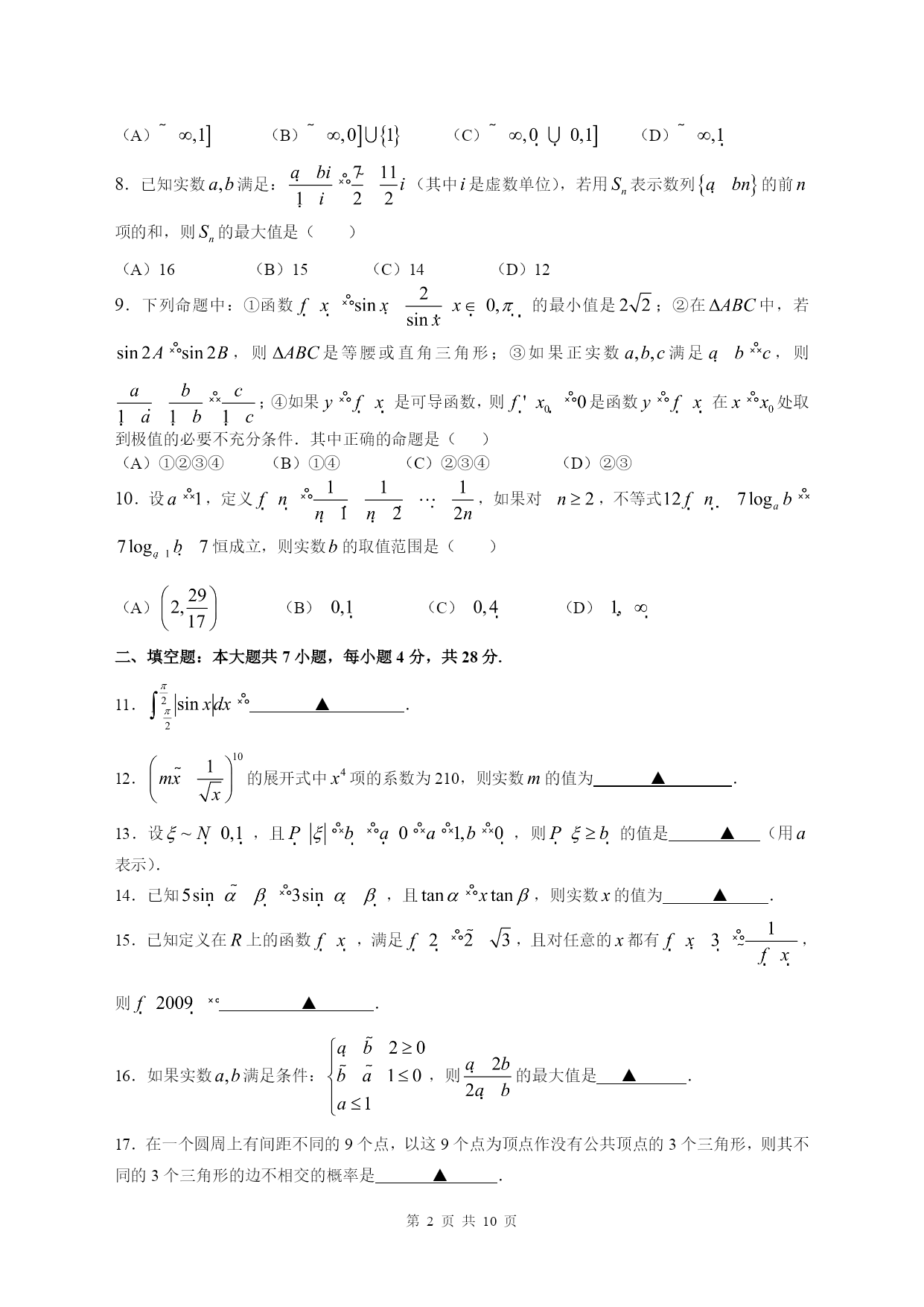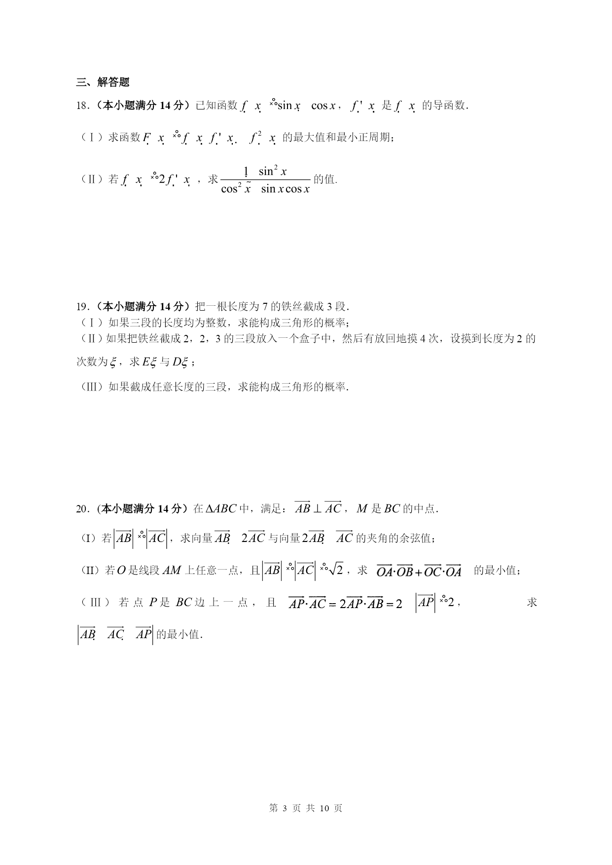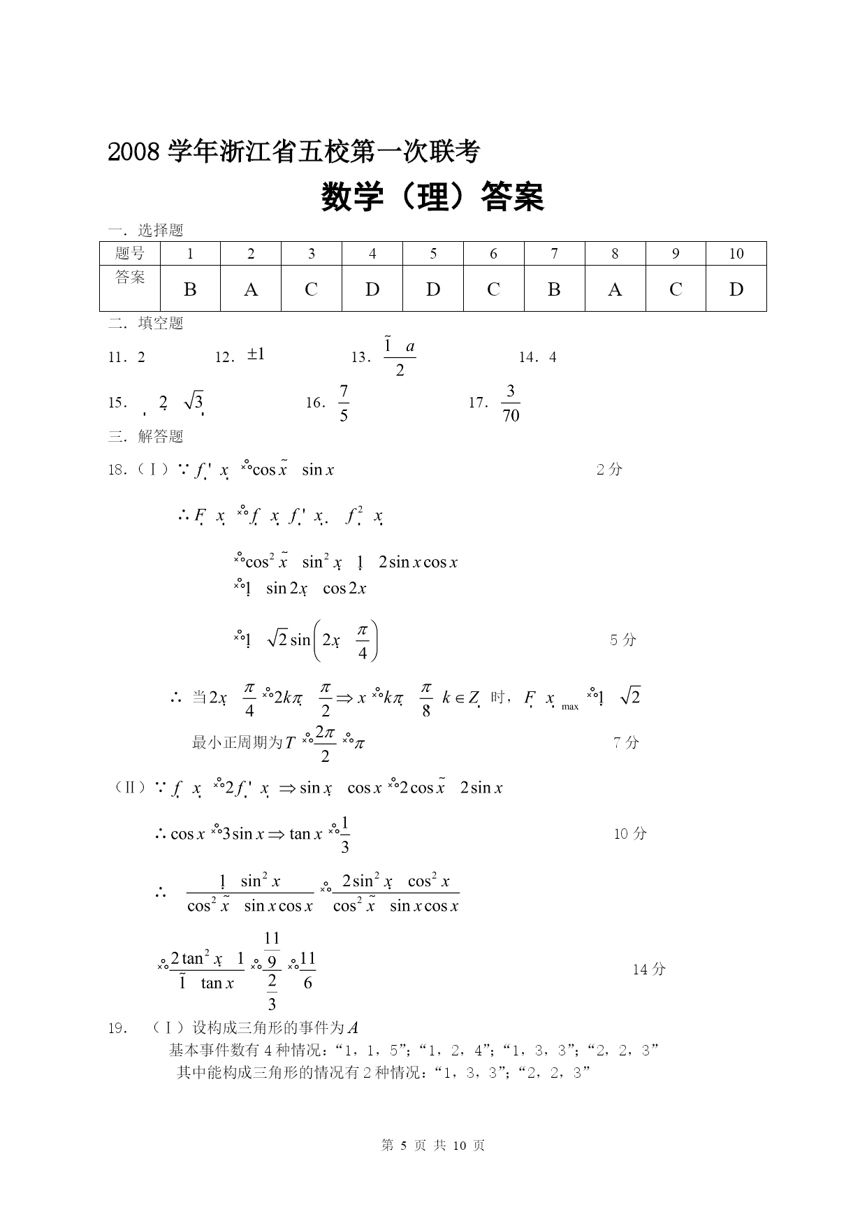 第页共NUMPAGES10页浙江省五校2008年高三第一次联考第Ⅰ卷(选择题共50分)一、选择题:本大题共10小题,每小题5分,共50分.在每小题给出的四个选项中,只有一项是符合题目要求的.1.下列关系中不是相关关系的是()(A)产品投入的广告费与产品的销售量(B)数轴上的点与实数(C)人的身高与体重的大小(D)一天中的时间与气温的高低2.设,则的大小关系是()(A)(B)(C)(D)3.已知满足:,,则BC的长()(A)2(B)1(C)1或2(D)无解4.下面框图表示的程序所输出的结果是()(A)3(B)12(C)60(D)3605.定义运算:,则的值是()(A)(B)(C)(D)6.在中,,如果不等式恒成立,则实数的取值范围是()(A)(B)(C)(D)7.函数有且仅有一个正实数的零点,则实数的取值范围是()(A)(B)(C)(D)8.已知实数满足:(其中是虚数单位),若用表示数列的前项的和,则的最大值是()(A)16(B)15(C)14(D)129.下列命题中:①函数的最小值是;②在中,若,则是等腰或直角三角形;③如果正实数满足,则;④如果是可导函数,则是函数在处取到极值的必要不充分条件.其中正确的命题是()(A)①②③④(B)①④(C)②③④(D)②③10.设,定义,如果对,不等式恒成立,则实数的取值范围是()(A)(B)(C)(D)二、填空题:本大题共7小题,每小题4分,共28分.11.▲.12.的展开式中项的系数为210,则实数的值为▲.13.设,且,则的值是▲(用表示).14.已知,且,则实数的值为▲.15.已知定义在上的函数,满足,且对任意的都有,则▲.16.如果实数满足条件:,则的最大值是▲.17.在一个圆周上有间距不同的9个点,以这9个点为顶点作没有公共顶点的3个三角形,则其不同的3个三角形的边不相交的概率是▲.三、解答题18.(本小题满分14分)已知函数,是的导函数.(Ⅰ)求函数的最大值和最小正周期;(Ⅱ)若,求的值.19.(本小题满分14分)把一根长度为7的铁丝截成3段.(Ⅰ)如果三段的长度均为整数,求能构成三角形的概率;(Ⅱ)如果把铁丝截成2,2,3的三段放入一个盒子中,然后有放回地摸4次,设摸到长度为2的次数为,求与;(Ⅲ)如果截成任意长度的三段,求能构成三角形的概率.20.(本小题满分14分)在中,满足:,是的中点.(I)若,求向量与向量的夹角的余弦值;(II)若是线段上任意一点,且,求的最小值;(Ⅲ)若点是边上一点,且,求的最小值.21.(本小题满分15分)已知函数,数列满足:.(Ⅰ)求证:;(Ⅱ)求数列的通项公式;(Ⅲ)求证不等式:.22.(本小题满分15分)已知函数.(Ⅰ)若函数与的图象在公共点P处有相同的切线,求实数的值并求点P的坐标;(Ⅱ)若函数与的图象有两个不同的交点M、N,求的取值范围;(Ⅲ)在(Ⅱ)的条件下,过线段MN的中点作轴的垂线分别与的图像和的图像交S、T点,以S为切点作的切线,以T为切点作的切线.是否存在实数使得,如果存在,求出的值;如果不存在,请说明理由.2008学年浙江省五校第一次联考数学(理)答案一.选择题题号12345678910答案BACDDCBACD二.填空题11.212.13.14.415.16.17.三.解答题18.(Ⅰ)∵2分∴5分∴当时,最小正周期为7分(Ⅱ)∵∴10分∴14分19.(Ⅰ)设构成三角形的事件为基本事件数有4种情况:“1,1,5”;“1,2,4”;“1,3,3”;“2,2,3”其中能构成三角形的情况有2种情况:“1,3,3”;“2,2,3”则所求的概率是4分(Ⅱ)根据题意知随机变量∴8分(Ⅲ)设把铁丝分成任意的三段,其中一段为,第二段为,则第三段为则10分如果要构成三角形,则必须满足:12分则所求的概率为14分20.(Ⅰ)设向量与向量的夹角为∴令∴4分(Ⅱ)∵,∴设,则,而∴当且仅当时,的最小值是.9分(Ⅲ)设∵,,∴,∴当且仅当时,.14分21.(Ⅰ)当时,,即是单调递增函数;当时,,即是单调递减函数;所以,即是极大值点,也是最大值点,当时取到等号.5分(Ⅱ)由得方法1即数列是等差数列,首项为,公差为∴10分方法2利用函数不动点方法3利用观察、归纳、猜想、数学归纳法证明(Ⅲ)又∵时,有令,则∴∴15分用数学归纳法证,酌情给分22.(Ⅰ)设函数与的图象的公共点,则有①又在点P有共同的切线∴代入①得设所以函数最多只有1个零点,观察得是零点,∴,此时5分(Ⅱ)方法1由令当时,,则单调递增当时,,则单调递减,且所以在处取到最大值,所以要使与有两个不同的交点,则有10分方法2根据(Ⅰ)知当时,两曲线切于点,此时变化的的对称轴是,而是固定不动的,如果继续让对称轴向右移动即,两曲线有两个不同的交点,当时,开口向下,只有一个交点,