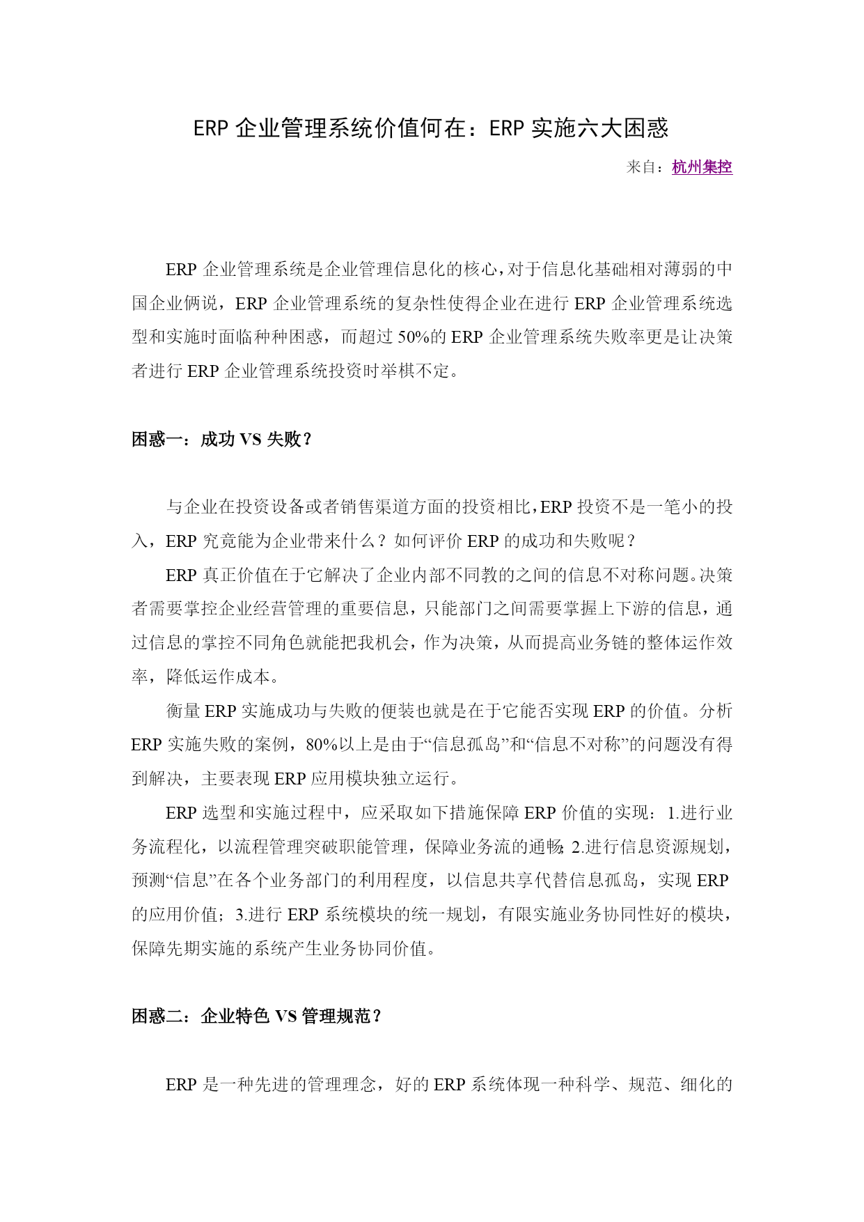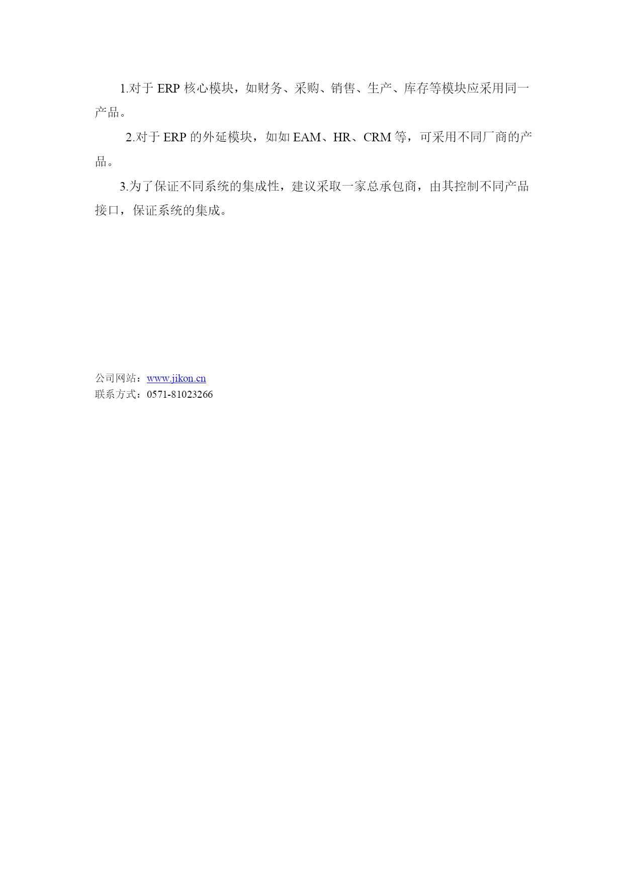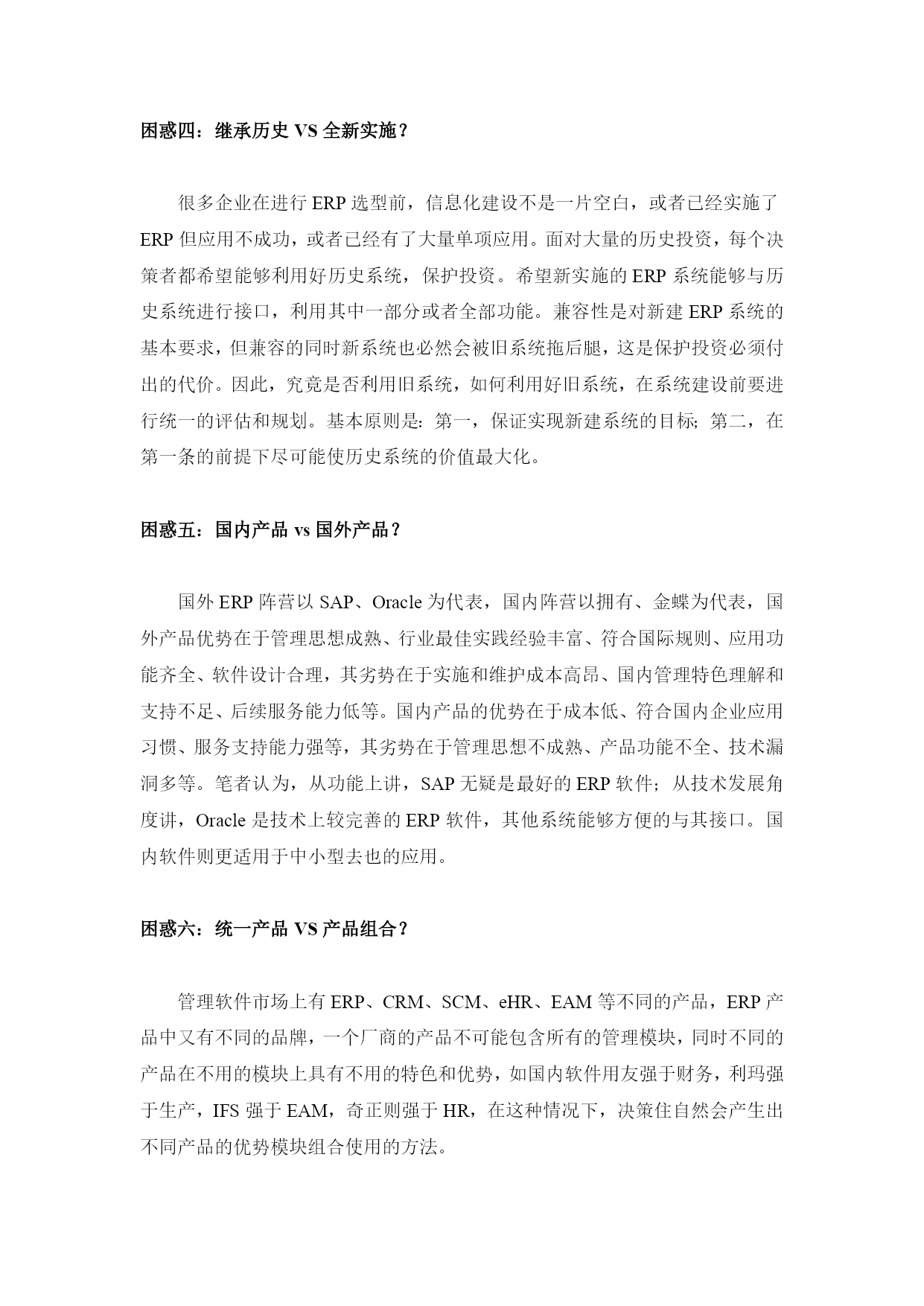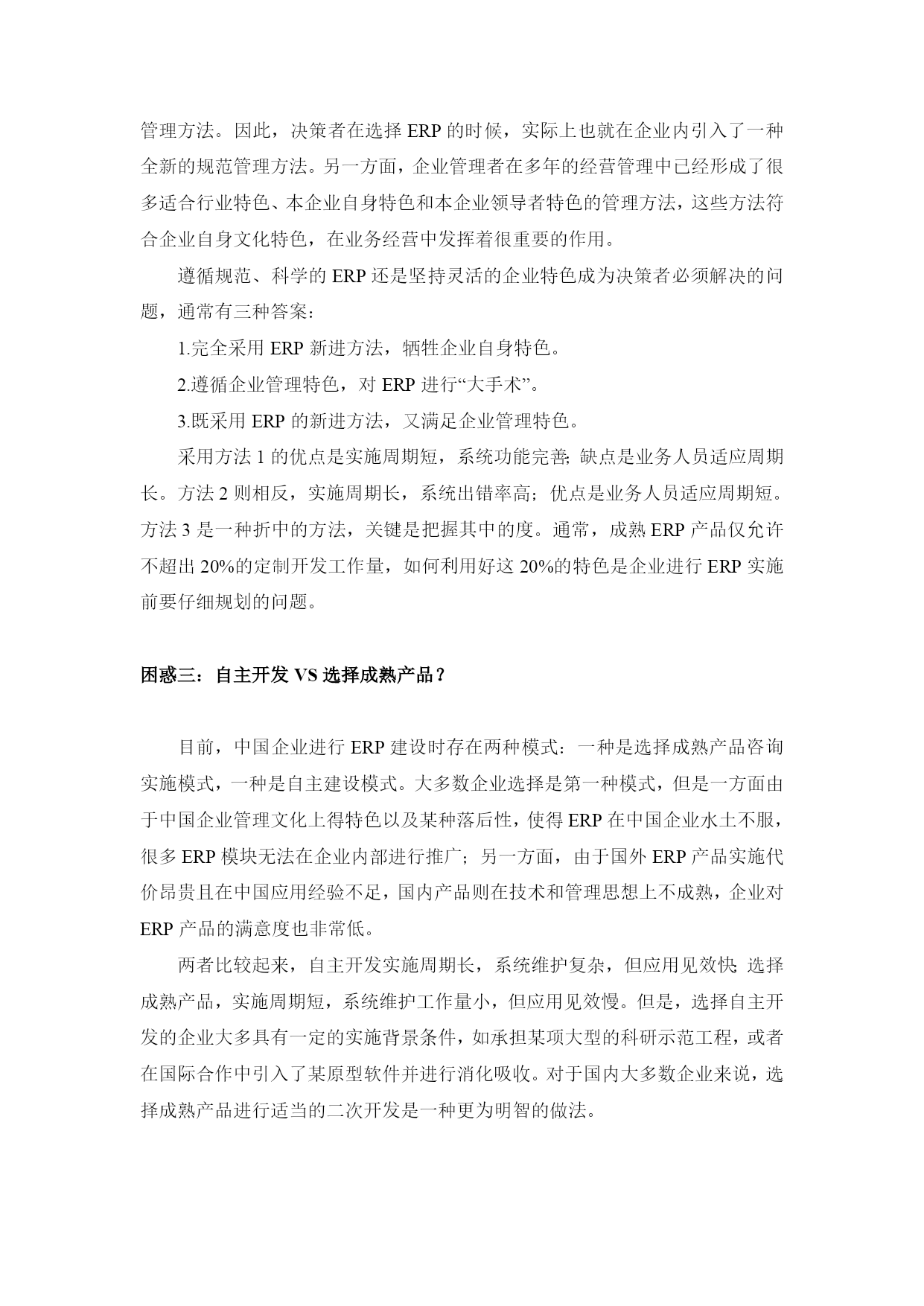 ERP企业管理系统价值何在:ERP实施六大困惑来自:HYPERLINK"http://www.jikon.cn"杭州集控ERP企业管理系统是企业管理信息化的核心,对于信息化基础相对薄弱的中国企业俩说,ERP企业管理系统的复杂性使得企业在进行ERP企业管理系统选型和实施时面临种种困惑,而超过50%的ERP企业管理系统失败率更是让决策者进行ERP企业管理系统投资时举棋不定。困惑一:成功VS失败?与企业在投资设备或者销售渠道方面的投资相比,ERP投资不是一笔小的投入,ERP究竟能为企业带来什么?如何评价ERP的成功和失败呢?ERP真正价值在于它解决了企业内部不同教的之间的信息不对称问题。决策者需要掌控企业经营管理的重要信息,只能部门之间需要掌握上下游的信息,通过信息的掌控不同角色就能把我机会,作为决策,从而提高业务链的整体运作效率,降低运作成本。衡量ERP实施成功与失败的便装也就是在于它能否实现ERP的价值。分析ERP实施失败的案例,80%以上是由于“信息孤岛”和“信息不对称”的问题没有得到解决,主要表现ERP应用模块独立运行。ERP选型和实施过程中,应采取如下措施保障ERP价值的实现:1.进行业务流程化,以流程管理突破职能管理,保障业务流的通畅;2.进行信息资源规划,预测“信息”在各个业务部门的利用程度,以信息共享代替信息孤岛,实现ERP的应用价值;3.进行ERP系统模块的统一规划,有限实施业务协同性好的模块,保障先期实施的系统产生业务协同价值。困惑二:企业特色VS管理规范?ERP是一种先进的管理理念,好的ERP系统体现一种科学、规范、细化的管理方法。因此,决策者在选择ERP的时候,实际上也就在企业内引入了一种全新的规范管理方法。另一方面,企业管理者在多年的经营管理中已经形成了很多适合行业特色、本企业自身特色和本企业领导者特色的管理方法,这些方法符合企业自身文化特色,在业务经营中发挥着很重要的作用。遵循规范、科学的ERP还是坚持灵活的企业特色成为决策者必须解决的问题,通常有三种答案:1.完全采用ERP新进方法,牺牲企业自身特色。2.遵循企业管理特色,对ERP进行“大手术”。3.既采用ERP的新进方法,又满足企业管理特色。采用方法1的优点是实施周期短,系统功能完善;缺点是业务人员适应周期长。方法2则相反,实施周期长,系统出错率高;优点是业务人员适应周期短。方法3是一种折中的方法,关键是把握其中的度。通常,成熟ERP产品仅允许不超出20%的定制开发工作量,如何利用好这20%的特色是企业进行ERP实施前要仔细规划的问题。困惑三:自主开发VS选择成熟产品?目前,中国企业进行ERP建设时存在两种模式:一种是选择成熟产品咨询实施模式,一种是自主建设模式。大多数企业选择是第一种模式,但是一方面由于中国企业管理文化上得特色以及某种落后性,使得ERP在中国企业水土不服,很多ERP模块无法在企业内部进行推广;另一方面,由于国外ERP产品实施代价昂贵且在中国应用经验不足,国内产品则在技术和管理思想上不成熟,企业对ERP产品的满意度也非常低。两者比较起来,自主开发实施周期长,系统维护复杂,但应用见效快;选择成熟产品,实施周期短,系统维护工作量小,但应用见效慢。但是,选择自主开发的企业大多具有一定的实施背景条件,如承担某项大型的科研示范工程,或者在国际合作中引入了某原型软件并进行消化吸收。对于国内大多数企业来说,选择成熟产品进行适当的二次开发是一种更为明智的做法。困惑四:继承历史VS全新实施?很多企业在进行ERP选型前,信息化建设不是一片空白,或者已经实施了ERP但应用不成功,或者已经有了大量单项应用。面对大量的历史投资,每个决策者都希望能够利用好历史系统,保护投资。希望新实施的ERP系统能够与历史系统进行接口,利用其中一部分或者全部功能。兼容性是对新建ERP系统的基本要求,但兼容的同时新系统也必然会被旧系统拖后腿,这是保护投资必须付出的代价。因此,究竟是否利用旧系统,如何利用好旧系统,在系统建设前要进行统一的评估和规划。基本原则是:第一,保证实现新建系统的目标;第二,在第一条的前提下尽可能使历史系统的价值最大化。困惑五:国内产品vs国外产品?国外ERP阵营以SAP、Oracle为代表,国内阵营以拥有、金蝶为代表,国外产品优势在于管理思想成熟、行业最佳实践经验丰富、符合国际规则、应用功能齐全、软件设计合理,其劣势在于实施和维护成本高昂、国内管理特色理解和支持不足、后续服务能力低等。国内产品的优势在于成本低、符合国内企业应用习惯、服务支持能力强等,其劣势在于管理思想不成熟、产品功能不全、技术漏洞多等。笔者认为,从功能上讲,SAP无疑是最好的ERP软件;从技术发展角度讲,Oracle是技术上较完善的ERP软件,其他系统能够方便的与其接口。国内软件则更适用