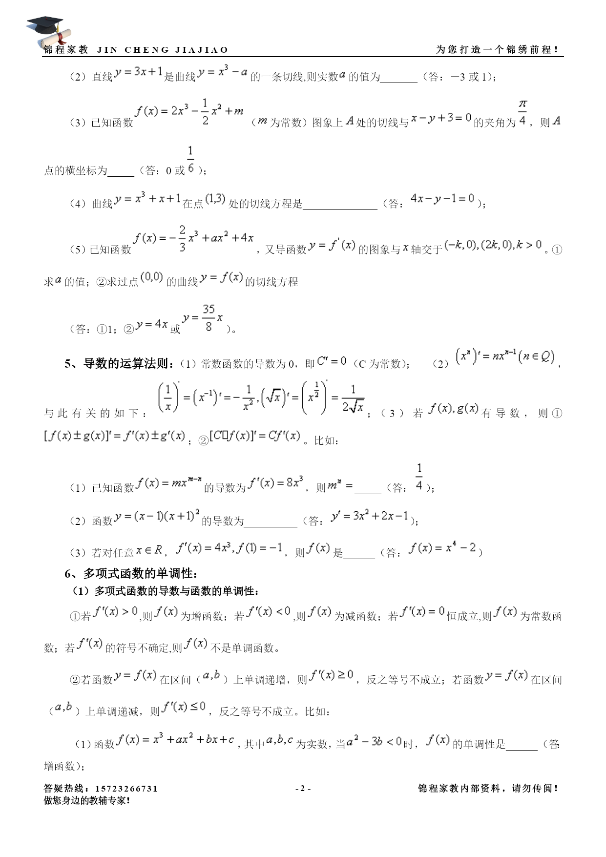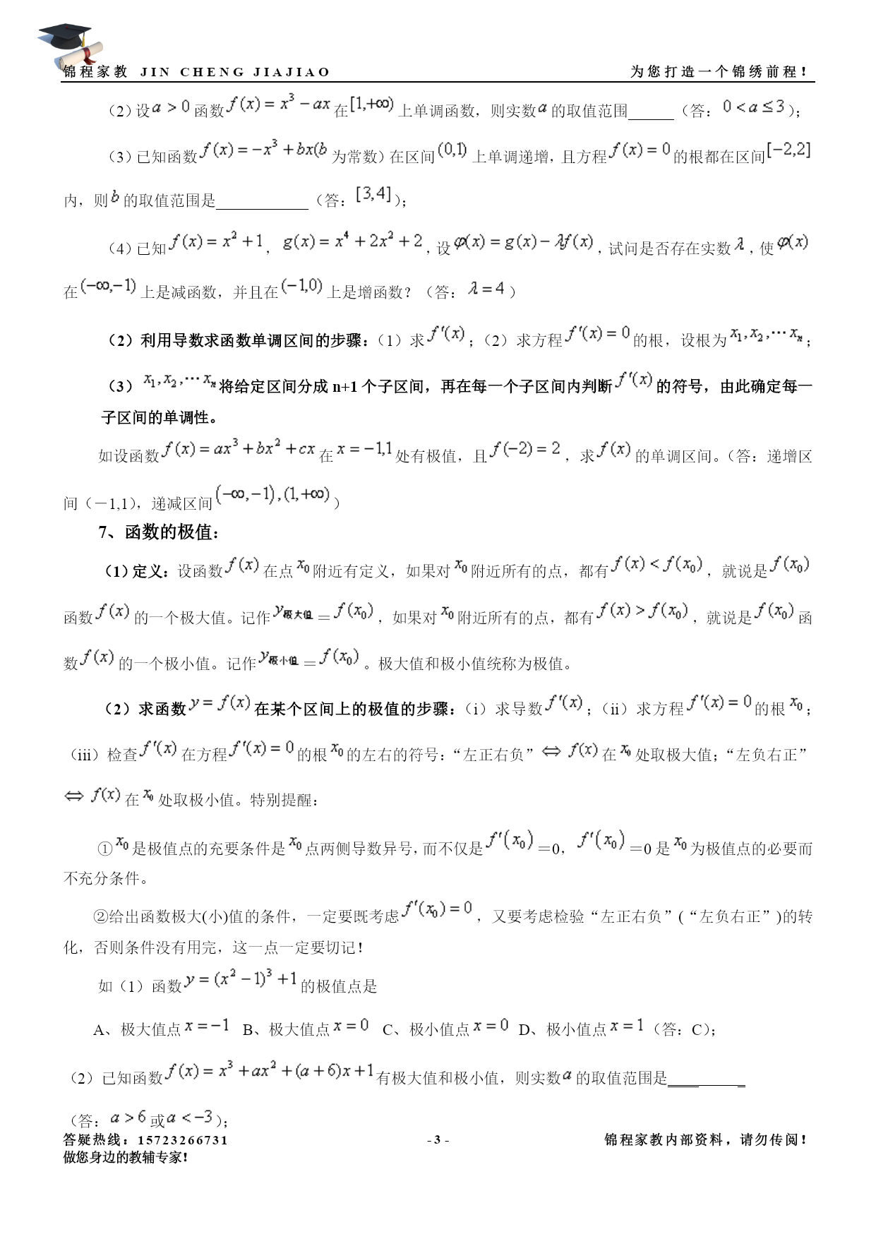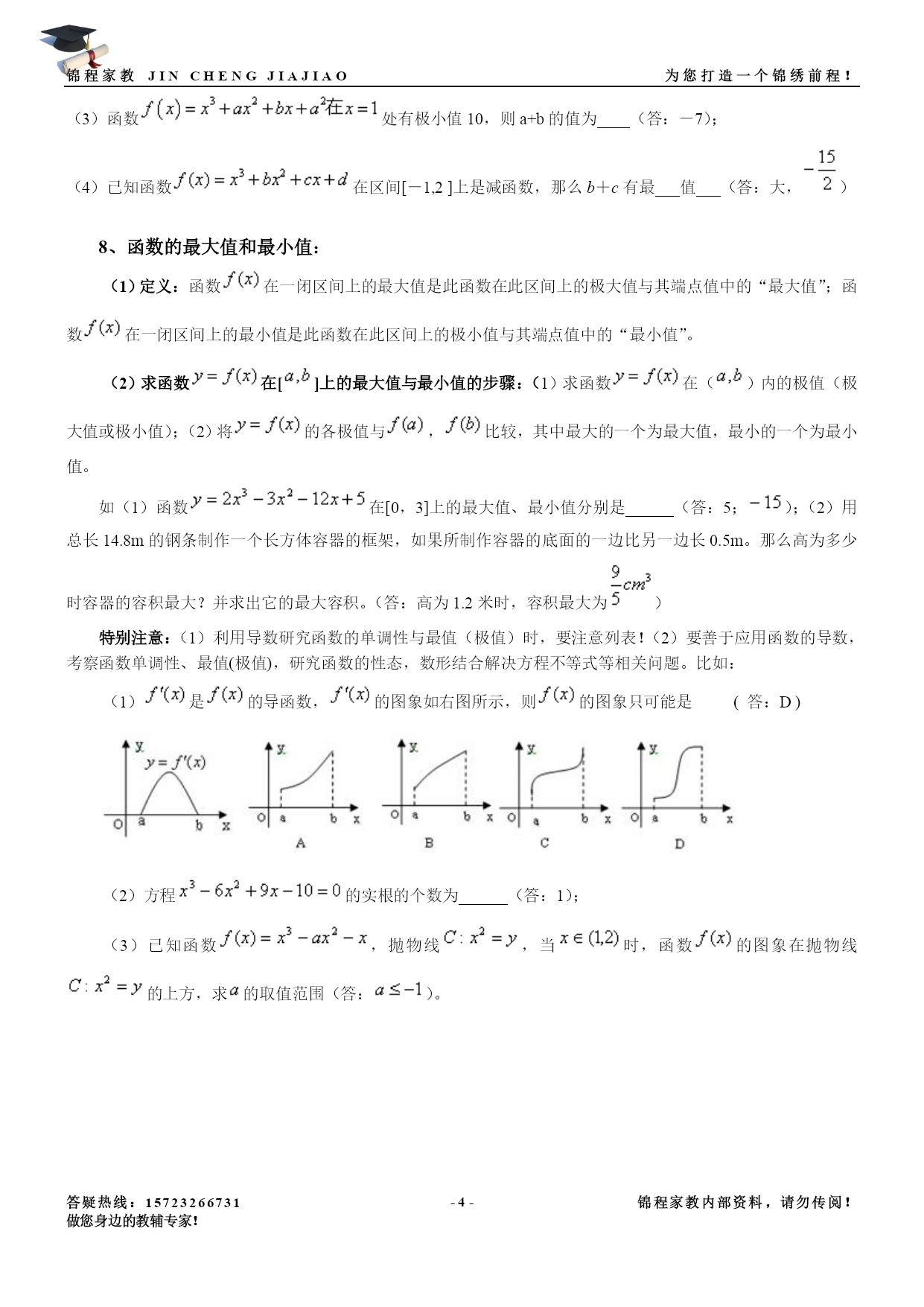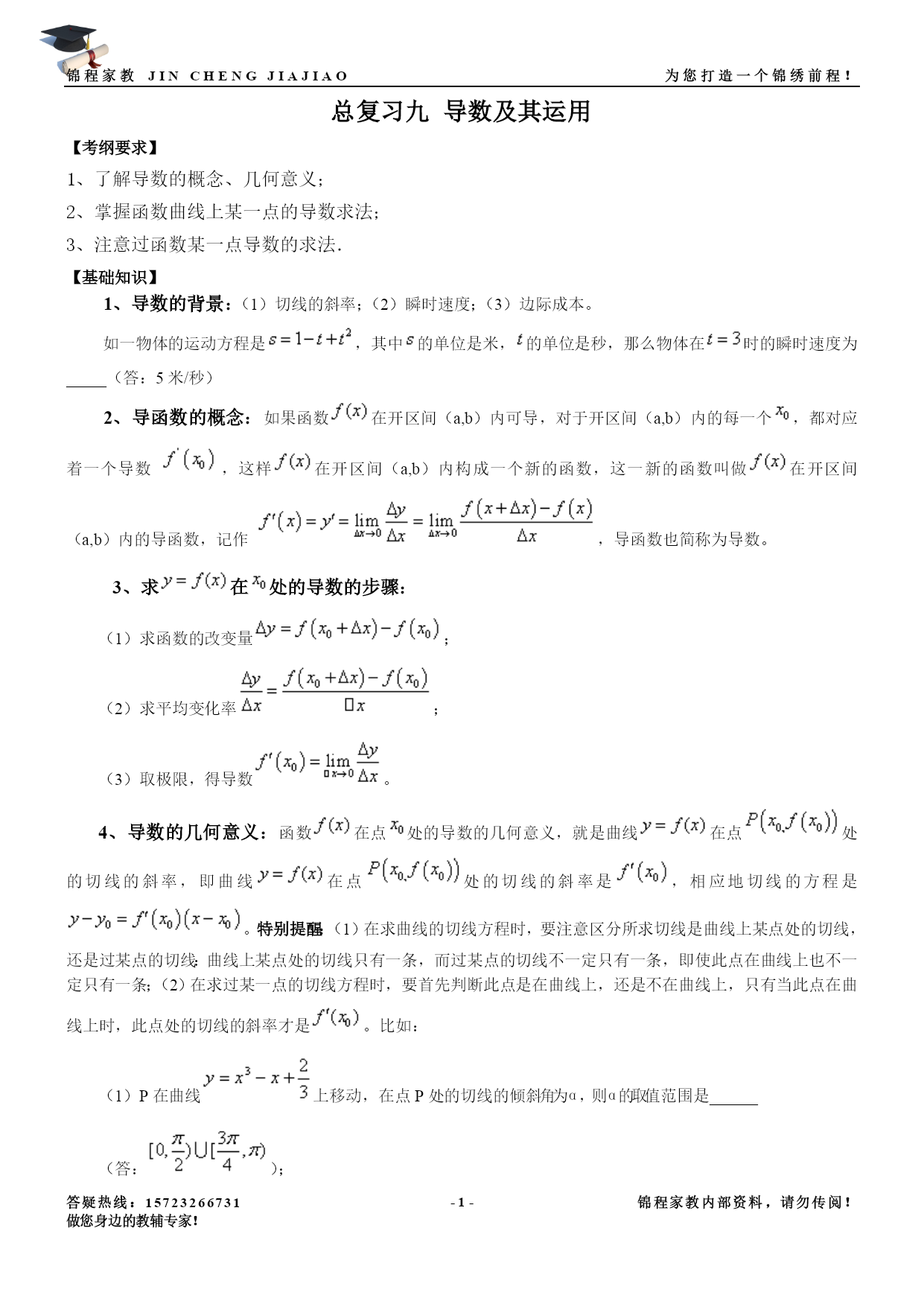 锦程家教JINCHENGJIAJIAO为您打造一个锦绣前程!PAGE-4-答疑热线:15723266731锦程家教内部资料,请勿传阅!做您身边的教辅专家!总复习九导数及其运用【考纲要求】1、了解导数的概念、几何意义;2、掌握函数曲线上某一点的导数求法;3、注意过函数某一点导数的求法.【基础知识】1、导数的背景:(1)切线的斜率;(2)瞬时速度;(3)边际成本。如一物体的运动方程是,其中的单位是米,的单位是秒,那么物体在时的瞬时速度为_____(答:5米/秒)2、导函数的概念:如果函数在开区间(a,b)内可导,对于开区间(a,b)内的每一个,都对应着一个导数,这样在开区间(a,b)内构成一个新的函数,这一新的函数叫做在开区间(a,b)内的导函数,记作,导函数也简称为导数。3、求在处的导数的步骤:(1)求函数的改变量;(2)求平均变化率;(3)取极限,得导数。4、导数的几何意义:函数在点处的导数的几何意义,就是曲线在点处的切线的斜率,即曲线在点处的切线的斜率是,相应地切线的方程是。特别提醒:(1)在求曲线的切线方程时,要注意区分所求切线是曲线上某点处的切线,还是过某点的切线:曲线上某点处的切线只有一条,而过某点的切线不一定只有一条,即使此点在曲线上也不一定只有一条;(2)在求过某一点的切线方程时,要首先判断此点是在曲线上,还是不在曲线上,只有当此点在曲线上时,此点处的切线的斜率才是。比如:(1)P在曲线上移动,在点P处的切线的倾斜角为α,则α的取值范围是______(答:);(2)直线是曲线的一条切线,则实数的值为_______(答:-3或1);(3)已知函数(为常数)图象上处的切线与的夹角为,则点的横坐标为_____(答:0或);(4)曲线在点处的切线方程是______________(答:);(5)已知函数,又导函数的图象与轴交于。①求的值;②求过点的曲线的切线方程(答:①1;②或)。5、导数的运算法则:(1)常数函数的导数为0,即(C为常数);(2),与此有关的如下:;(3)若有导数,则①;②。比如:(1)已知函数的导数为,则_____(答:);(2)函数的导数为__________(答:);(3)若对任意,,则是______(答:)6、多项式函数的单调性:(1)多项式函数的导数与函数的单调性:①若,则为增函数;若,则为减函数;若恒成立,则为常数函数;若的符号不确定,则不是单调函数。②若函数在区间()上单调递增,则,反之等号不成立;若函数在区间()上单调递减,则,反之等号不成立。比如:(1)函数,其中为实数,当时,的单调性是______(答:增函数);(2)设函数在上单调函数,则实数的取值范围______(答:);(3)已知函数为常数)在区间上单调递增,且方程的根都在区间内,则的取值范围是____________(答:);(4)已知,,设,试问是否存在实数,使在上是减函数,并且在上是增函数?(答:)(2)利用导数求函数单调区间的步骤:(1)求;(2)求方程的根,设根为;(3)将给定区间分成n+1个子区间,再在每一个子区间内判断的符号,由此确定每一子区间的单调性。如设函数在处有极值,且,求的单调区间。(答:递增区间(-1,1),递减区间)7、函数的极值:(1)定义:设函数在点附近有定义,如果对附近所有的点,都有,就说是函数的一个极大值。记作=,如果对附近所有的点,都有,就说是函数的一个极小值。记作=。极大值和极小值统称为极值。(2)求函数在某个区间上的极值的步骤:(i)求导数;(ii)求方程的根;(iii)检查在方程的根的左右的符号:“左正右负”在处取极大值;“左负右正”在处取极小值。特别提醒:①是极值点的充要条件是点两侧导数异号,而不仅是=0,=0是为极值点的必要而不充分条件。②给出函数极大(小)值的条件,一定要既考虑,又要考虑检验“左正右负”(“左负右正”)的转化,否则条件没有用完,这一点一定要切记!如(1)函数的极值点是极大值点B、极大值点C、极小值点D、极小值点(答:C);已知函数有极大值和极小值,则实数的取值范围是_____(答:或);函数处有极小值10,则a+b的值为____(答:-7);(4)已知函数在区间[-1,2]上是减函数,那么b+c有最___值___(答:大,)8、函数的最大值和最小值:(1)定义:函数在一闭区间上的最大值是此函数在此区间上的极大值与其端点值中的“最大值”;函数在一闭区间上的最小值是此函数在此区间上的极小值与其端点值中的“最小值”。(2)求函数在[]上的最大值与最小值的步骤:(1)求函数在()内的极值(极大值或极小值);(2)将的各极值与,比较,其中最大的一个为最大值,最小的一个为最小值。如(1)函数在[0,3]上的最大值、最小值分别是______(答:5;);(2)用总长14.