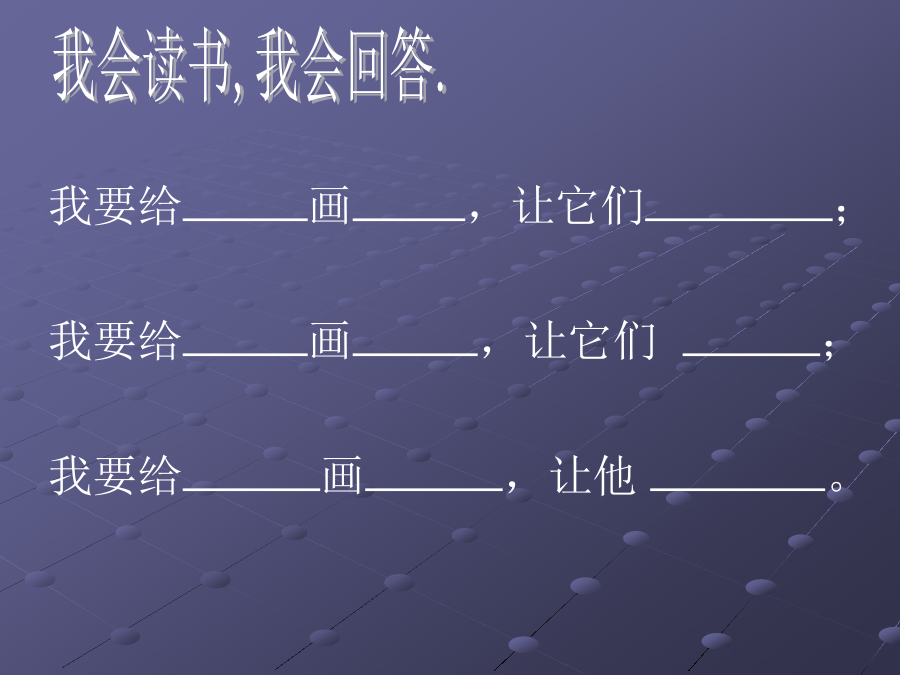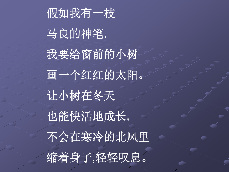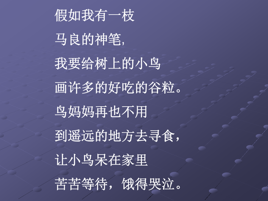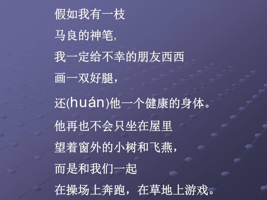 假我要给画,让它们; 我要给画,让它们; 我要给画,让他。假如我有一枝 马良的神笔, 我要给窗前的小树 画一个红红的太阳。 让小树在冬天 也能快活地成长, 不会在寒冷的北风里 缩着身子,轻轻叹息。假如我有一枝 马良的神笔, 我要给树上的小鸟 画许多的好吃的谷粒。 鸟妈妈再也不用 到遥远的地方去寻食, 让小鸟呆在家里 苦苦等待,饿得哭泣。假如我有一枝 马良的神笔, 我一定给不幸的朋友西西 画一双好腿, 还(huán)他一个健康的身体。 他再也不会只坐在屋里 望着窗外的小树和飞燕, 而是和我们一起 在操场上奔跑,在草地上游戏。双 目 失 明 的 孩 子假如我有一枝 马良的神笔, 我要给……