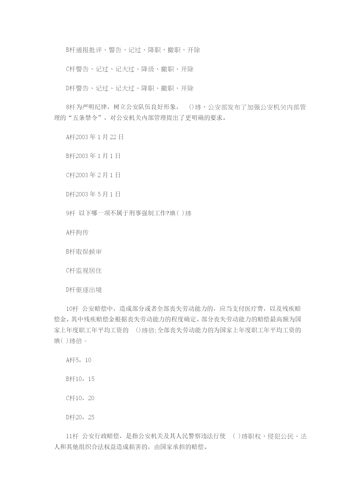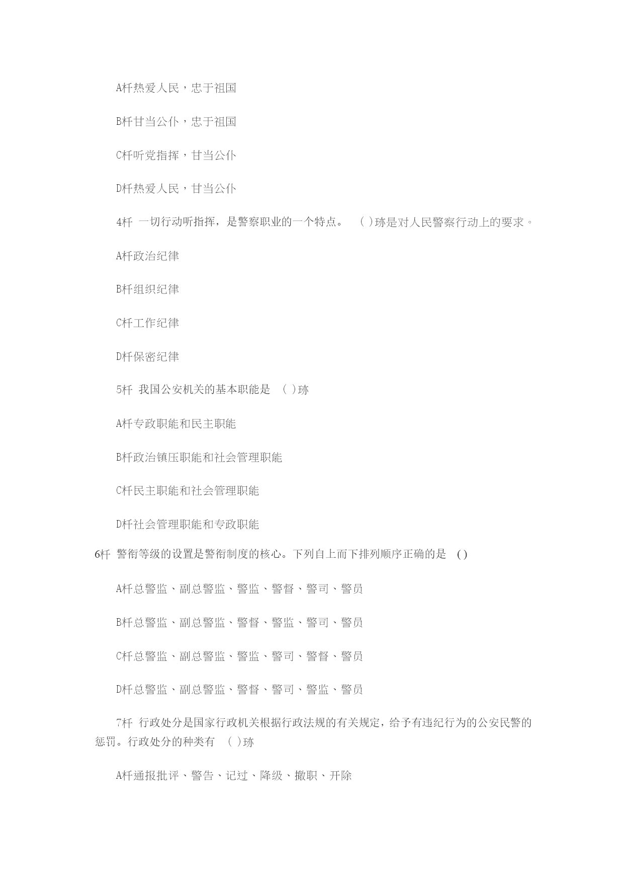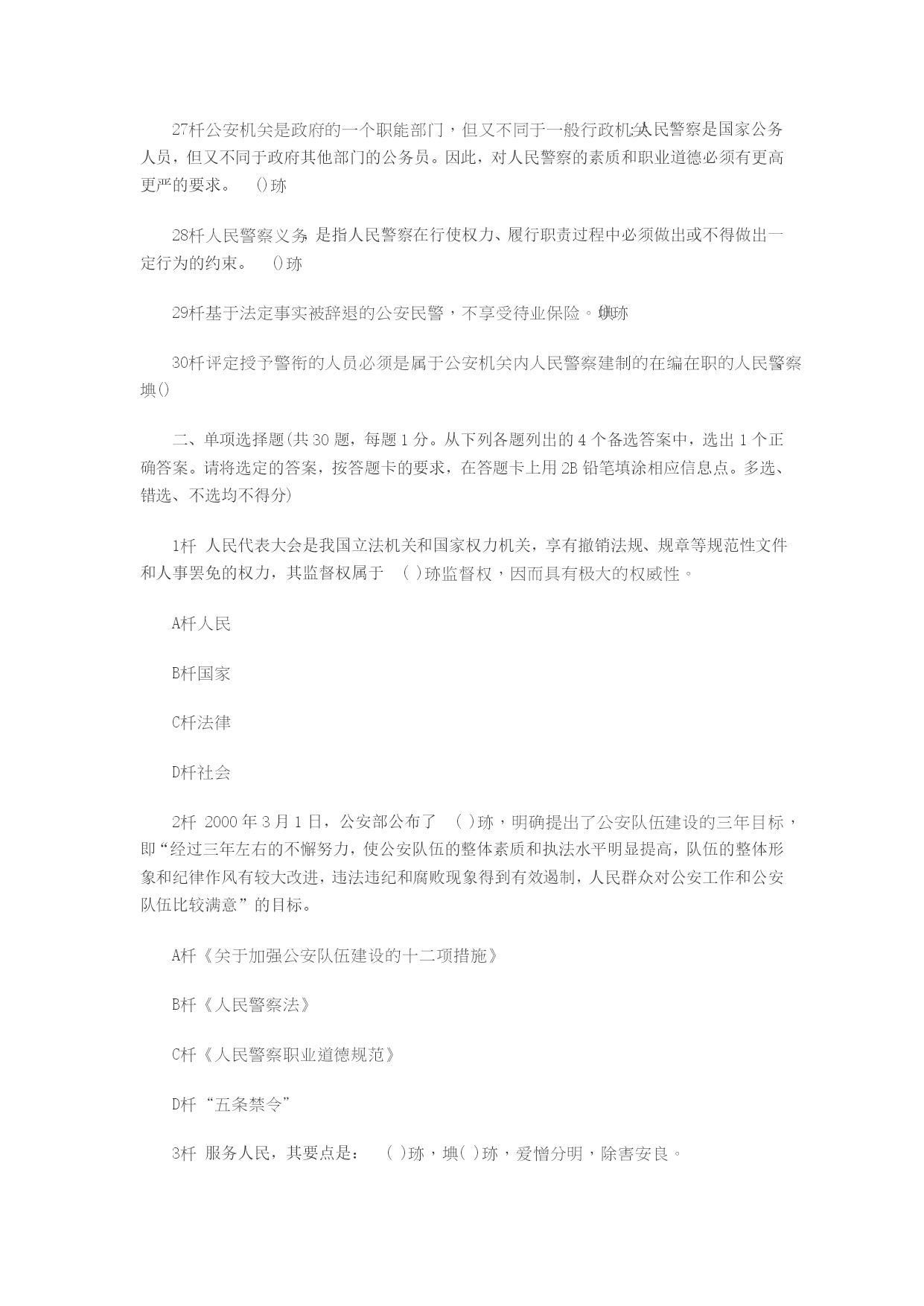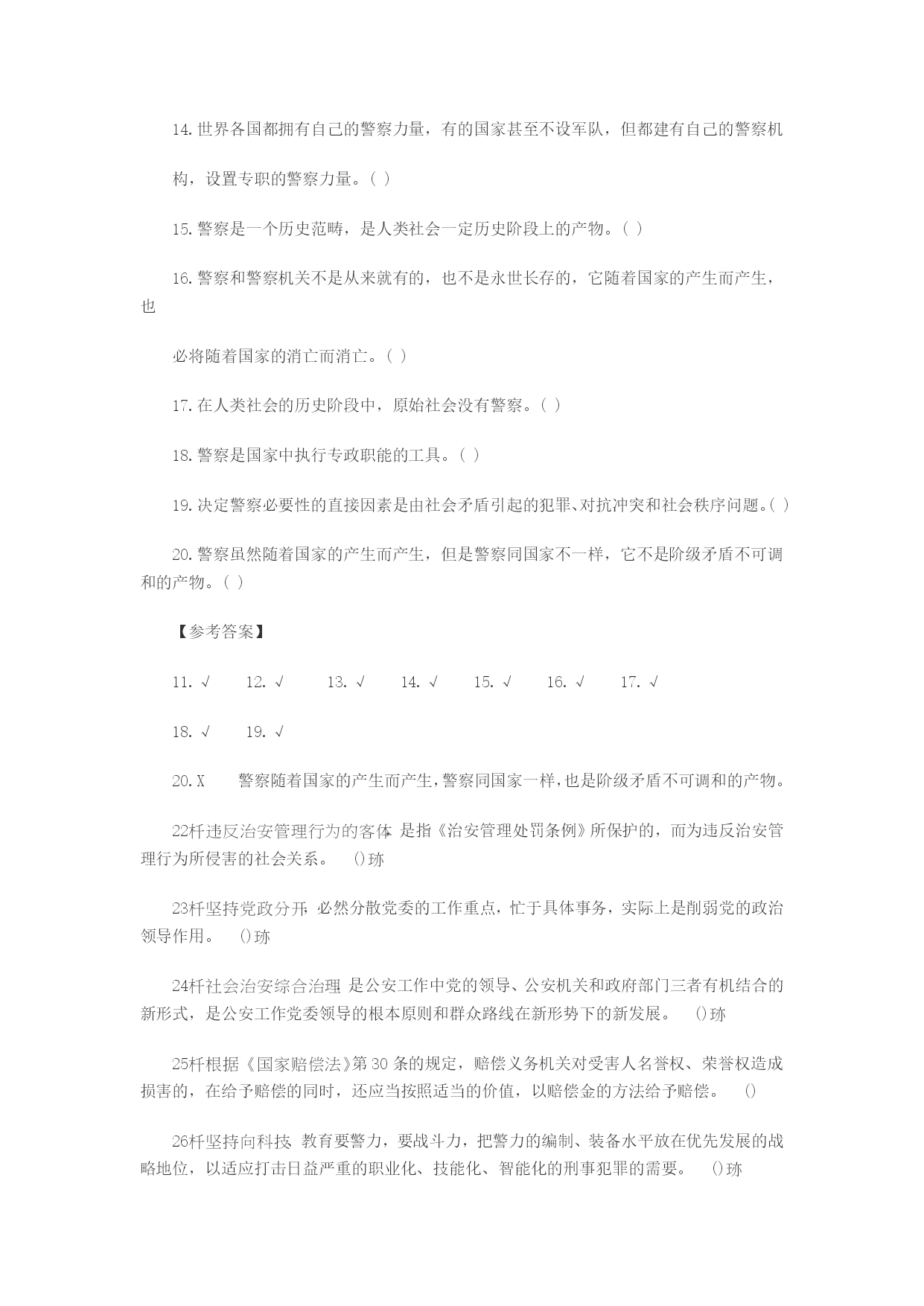 1.生产力的发展、私有制的产生,是警察产生的经济条件。()2.阶级矛盾和统治阶级内部矛盾的不可调和性,是警察产生的政治条件。()3.维护统治秩序与惩罚犯罪的客观需要,是警察产生的阶级条件。()4.国家机器的形成,是警察产生的政治条件。()5.在奴隶社会、封建社会中,没有专门的警察机关,也没有专职的警察队伍。()6,在奴隶社会和封建社会中执行警察职能的机构与官吏,称为古代警察。()7.在奴隶社会、封建社会中,警察的职能是由军队、审判机关和行政官吏分别掌管的。()8.古代警察的特点之一是军警不分,警政合一。()9.古代警察行使职权,在法律上是极不严格的,神权、皇帝或长官的意志起决定作用。()10.近代警察只是适应资本主义制度需要而建立起来的专门执行警察职能的机构。()【参考答案】1.√2.X阶级矛盾和统治阶级内部矛盾的不可调和性,是警察产生的阶级条件。3.X维护统治秩序与惩罚犯罪的客观需要,是警察产生的社会条件。4.√5.√6.√7.√8.√9.√10.X近代警察是适应资本主义制度需要而建立起来的专门执行警察职能的机构和官吏。11.警察在世界各国有不同的含义,在我国警察是具有武装性质的维护社会秩序、保卫国家安全的国家行政力量。()12.在我国,警察的任务是维护社会秩序,保卫国家安全。()13.警察的性质是具有武装性质的国家治安行政力量。()14.世界各国都拥有自己的警察力量,有的国家甚至不设军队,但都建有自己的警察机构,设置专职的警察力量。()15.警察是一个历史范畴,是人类社会一定历史阶段上的产物。()16.警察和警察机关不是从来就有的,也不是永世长存的,它随着国家的产生而产生,也必将随着国家的消亡而消亡。()17.在人类社会的历史阶段中,原始社会没有警察。()18.警察是国家中执行专政职能的工具。()19.决定警察必要性的直接因素是由社会矛盾引起的犯罪、对抗冲突和社会秩序问题。()20.警察虽然随着国家的产生而产生,但是警察同国家不一样,它不是阶级矛盾不可调和的产物。()【参考答案】11.√12.√13.√14.√15.√16.√17.√18.√19.√20.X警察随着国家的产生而产生,警察同国家一样,也是阶级矛盾不可调和的产物。22违反治安管理行为的客体,是指《治安管理处罚条例》所保护的,而为违反治安管理行为所侵害的社会关系。()23坚持党政分开,必然分散党委的工作重点,忙于具体事务,实际上是削弱党的政治领导作用。()24社会治安综合治理,是公安工作中党的领导、公安机关和政府部门三者有机结合的新形式,是公安工作党委领导的根本原则和群众路线在新形势下的新发展。()25根据《国家赔偿法》第30条的规定,赔偿义务机关对受害人名誉权、荣誉权造成损害的,在给予赔偿的同时,还应当按照适当的价值,以赔偿金的方法给予赔偿。()26坚持向科技、教育要警力,要战斗力,把警力的编制、装备水平放在优先发展的战略地位,以适应打击日益严重的职业化、技能化、智能化的刑事犯罪的需要。()27公安机关是政府的一个职能部门,但又不同于一般行政机关;人民警察是国家公务人员,但又不同于政府其他部门的公务员。因此,对人民警察的素质和职业道德必须有更高更严的要求。()28人民警察义务,是指人民警察在行使权力、履行职责过程中必须做出或不得做出一定行为的约束。()29基于法定事实被辞退的公安民警,不享受待业保险。()30评定授予警衔的人员必须是属于公安机关内人民警察建制的在编在职的人民警察。()二、单项选择题(共30题,每题1分。从下列各题列出的4个备选答案中,选出1个正确答案。请将选定的答案,按答题卡的要求,在答题卡上用2B铅笔填涂相应信息点。多选、错选、不选均不得分)1人民代表大会是我国立法机关和国家权力机关,享有撤销法规、规章等规范性文件和人事罢免的权力,其监督权属于()监督权,因而具有极大的权威性。A人民B国家C法律D社会22000年3月1日,公安部公布了(),明确提出了公安队伍建设的三年目标,即“经过三年左右的不懈努力,使公安队伍的整体素质和执法水平明显提高,队伍的整体形象和纪律作风有较大改进,违法违纪和腐败现象得到有效遏制,人民群众对公安工作和公安队伍比较满意”的目标。A《关于加强公安队伍建设的十二项措施》B《人民警察法》C《人民警察职业道德规范》D“五条禁令”3服务人民,其要点是:(),(),爱憎分明,除害安良。A热爱人民,忠于祖国B甘当公仆,忠于祖国C听党指挥,甘当公仆D热爱人民,甘当公仆4一切行动听指挥,是警察职业的一个特点。()是对人民警察行动上的要求。A政治纪律B组织纪律C工作纪律D保密纪律5我国公安机关的基本职能是()A专政职能和民