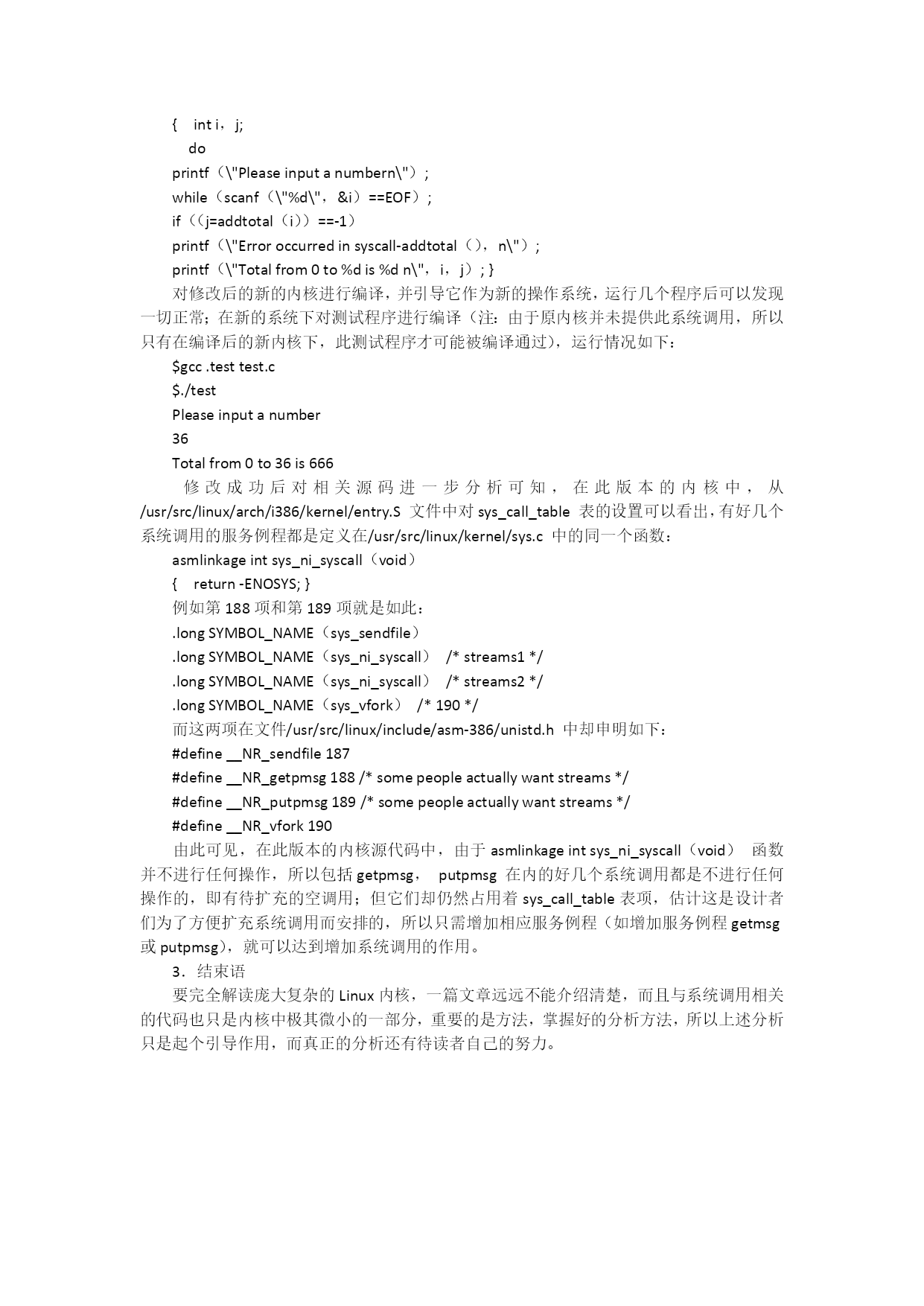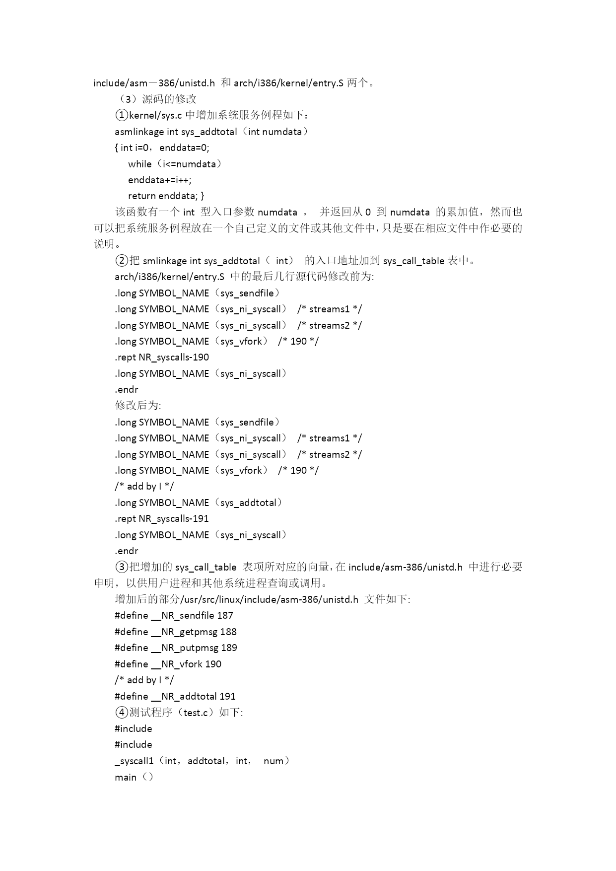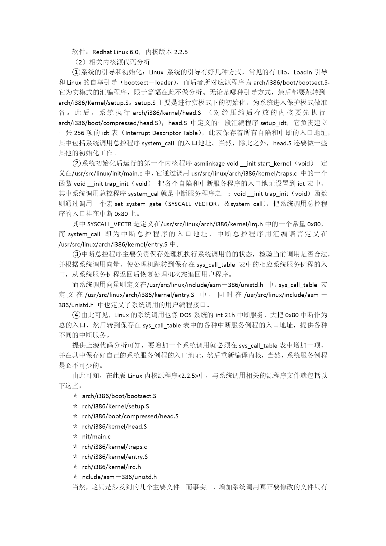很多Linux爱好者对内核很感兴趣却无从下手,本文旨在介绍一种解读Linux内核源码的入门方法,而不是讲解Linux复杂的内核机制。1.核心源程序的文件组织(1)Linux核心源程序通常都安装在/usr/src/Linux下,而且它有一个非常简单的编号约定:任何偶数的核心(中间数字)如:2.0.30都是一个稳定的发行的核心,而任何奇数的核心如:2.1.42都是一个开发中的核心。本文基于稳定的2.2.5源代码,第二部分的实现平台为RedhatLinux6.0。(2)核心源程序的文件按树形结构进行组织,在源程序树的最上层你会看到这样一些目录:arch:arch子目录包括了所有和体系结构相关的核心代码。它的每一个子目录都代表一种支持的体系结构,例如i386就是关于IntelCPU及与之相兼容体系结构的子目录。PC机一般都基于此目录;include:include子目录包括编译核心所需要的大部分头文件。与平台无关的头文件在include/linux子目录下,与IntelCPU相关的头文件在include/asm-i386子目录下,而include/scsi目录则是有关SCSI设备的头文件目录;init:这个目录包含核心的初始化代码(注:不是系统的引导代码),包含两个文件main.c和Version.c,这是研究核心如何工作的一个非常好的起点;Mm:这个目录包括所有独立于CPU体系结构的内存管理代码,如页式存储管理内存的分配和释放等,而和体系结构相关的内存管理代码则位于arch/*/mm/,例如arch/i386/mm/Fault.c;Kernel:主要的核心代码,此目录下的文件实现了大多数Linux系统的内核函数,其中最重要的文件当属sched.c,同样,和体系结构相关的代码在arch/*/kernel中;Drivers:放置系统所有的设备驱动程序;每种驱动程序又各占用一个子目录,如/block下为块设备驱动程序,比如ide(ide.c)。如果你希望查看所有可能包含文件系统的设备是如何初始化的,你可以看drivers/block/genhd.c中的device_setup()函数。它不仅初始化硬盘,也初始化网络,因为安装nfs文件系统的时候需要使用网络。其他目录如Lib:放置核心的库代码;Net:核心与网络相关的代码;Ipc:包含核心的进程间通信的代码;Fs:所有的文件系统代码和各种类型的文件操作代码,它的每一个子目录支持一个文件系统,例如fat和ext2、Scripts,此目录包含用于配置核心的脚本文件等。一般在每个目录下都有一个.depend文件和一个Makefile文件,这两个文件都是编译时使用的辅助文件,仔细阅读这两个文件对弄清各个文件之间的联系和依托关系很有帮助,而且在有的目录下还有Readme文件,它是对该目录下的文件的一些说明,同样有利于我们对内核源码的理解。2.解读实战:为你的内核增加一个系统调用虽然Linux的内核源码用树形结构组织得非常合理、科学,把与功能相关联的文件都放在同一个子目录下,这样使得程序更具可读性。然而,Linux的内核源码实在是太大而且非常复杂,即便采用了很合理的文件组织方法,在不同目录下的文件之间还是有很多的关联,分析核心的一部分代码通常要查看其他的几个相关的文件,而且可能这些文件还不在同一个子目录下。下面举一个具体的内核分析实例,希望能通过这个实例,使读者对Linux的内核组织有些具体的认识,读者从中也可以学到一些对内核的分析方法。以下即为分析实例:(1)操作平台硬件:CPUIntelPentiumII;软件:RedhatLinux6.0,内核版本2.2.5(2)相关内核源代码分析①系统的引导和初始化:Linux系统的引导有好几种方式,常见的有Lilo、Loadin引导和Linux的自举引导(bootsect-loader),而后者所对应源程序为arch/i386/boot/bootsect.S,它为实模式的汇编程序,限于篇幅在此不做分析。无论是哪种引导方式,最后都要跳转到arch/i386/Kernel/setup.S。setup.S主要是进行实模式下的初始化,为系统进入保护模式做准备。此后,系统执行arch/i386/kernel/head.S(对经压缩后存放的内核要先执行arch/i386/boot/compressed/head.S);head.S中定义的一段汇编程序setup_idt,它负责建立一张256项的idt表(InterruptDescriptorTable),此表保存着所有自陷和中断的入口地址,其中包括系统调用总控程序system_call的入口地址。当然,除此之外,head.S还要做一些其他的初始化工作。②系统初始化后运行的第一个内核程序asmlinkagevoid__in