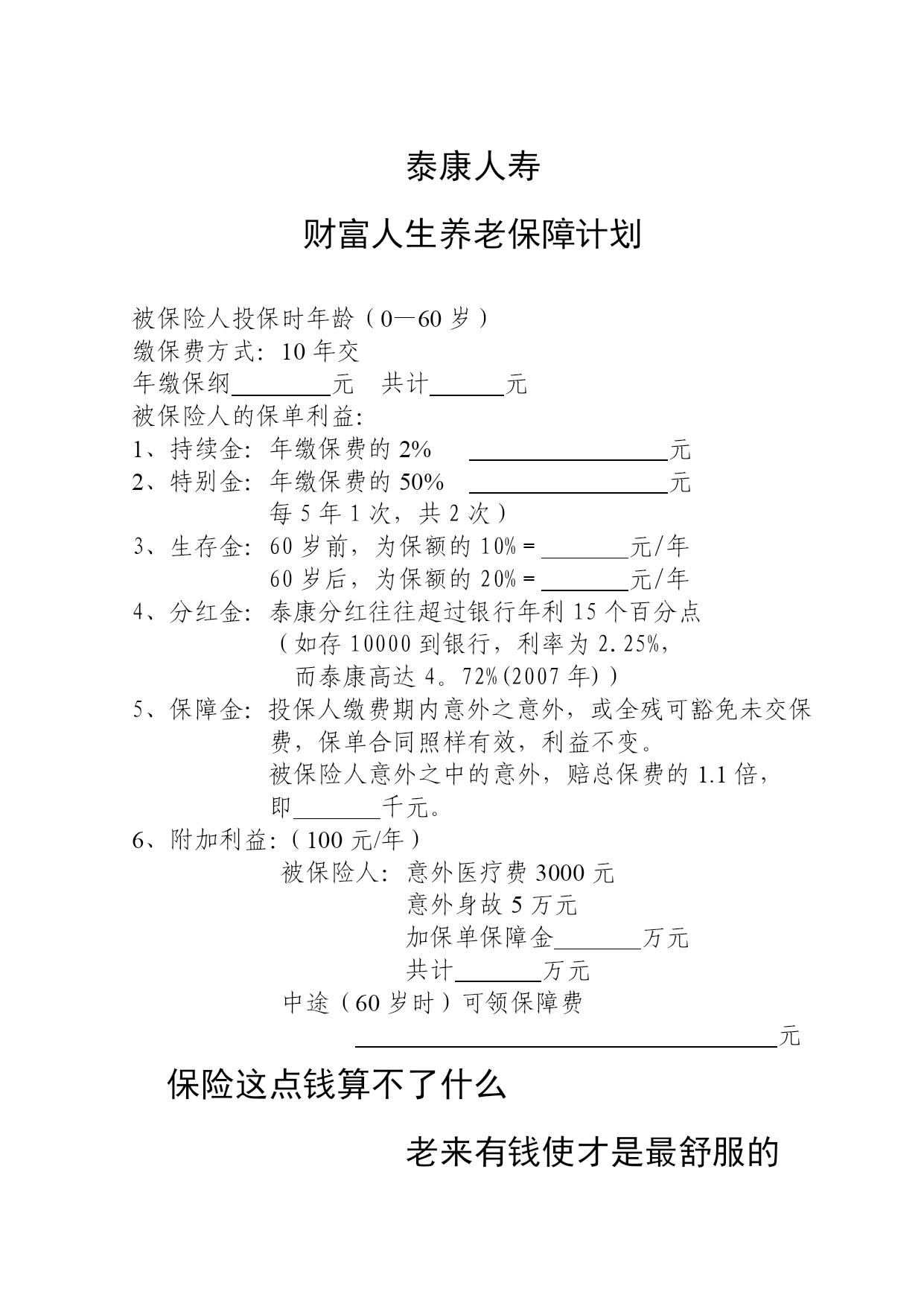 泰康人寿财富人生养老保障计划被保险人投保时年龄(0—60岁)缴保费方式:10年交年缴保纲5000元共计50000元被保险人的保单利益:1、持续金:年缴保费的2%5000×2%=100元2、特别金:年缴保费的50%5000×50%=2500元每5年1次,共2次)3、生存金:60岁前,为保额的10%=777.8元/年60岁后,为保额的20%=1555.6元/年4、分红金:泰康分红往往超过银行年利15个百分点(如存10000到银行,利率为2.25%,而泰康高达4。72%(2007年))5、保障金:投保人缴费期内意外之意外,或全残可豁免未交保费,保单合同照样有效,利益不变。被保险人意外之中的意外,赔总保费的1.1倍,即5万5千元。6、附加利益:(100元/年)被保险人:意外医疗费3000元意外身故5万元加保单保障金5.5万元共计10.5万元中途(60岁时)可领保障费100×10+777.8×60+2500×2=52668元保险这点钱算不了什么老来有钱使才是最舒服的泰康人寿财富人生养老保障计划被保险人投保时年龄(0—60岁)缴保费方式:10年交年缴保纲元共计元被保险人的保单利益:1、持续金:年缴保费的2%元2、特别金:年缴保费的50%元每5年1次,共2次)3、生存金:60岁前,为保额的10%=元/年60岁后,为保额的20%=元/年4、分红金:泰康分红往往超过银行年利15个百分点(如存10000到银行,利率为2.25%,而泰康高达4。72%(2007年))5、保障金:投保人缴费期内意外之意外,或全残可豁免未交保费,保单合同照样有效,利益不变。被保险人意外之中的意外,赔总保费的1.1倍,即千元。6、附加利益:(100元/年)被保险人:意外医疗费3000元意外身故5万元加保单保障金万元共计万元中途(60岁时)可领保障费元保险这点钱算不了什么老来有钱使才是最舒服的