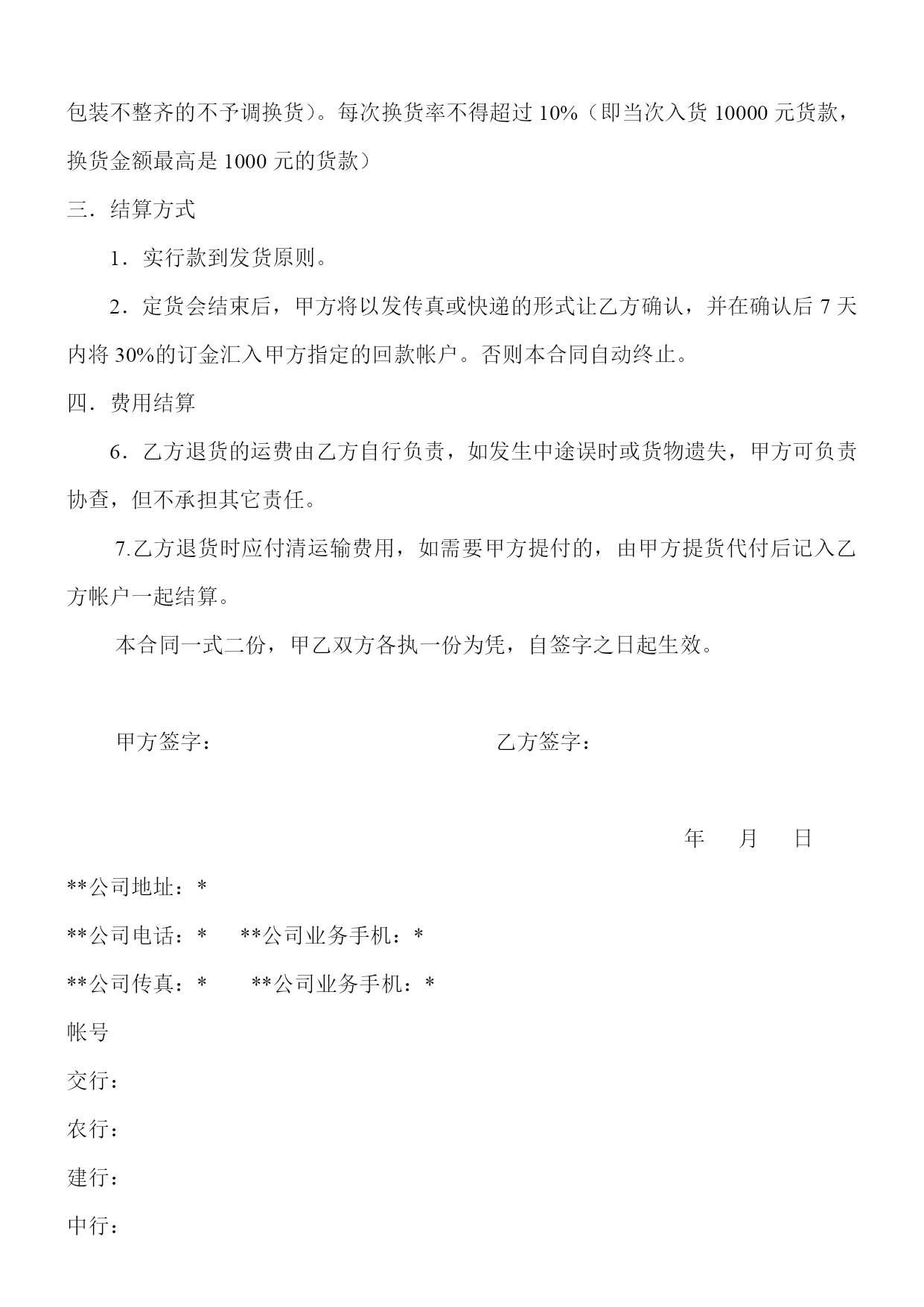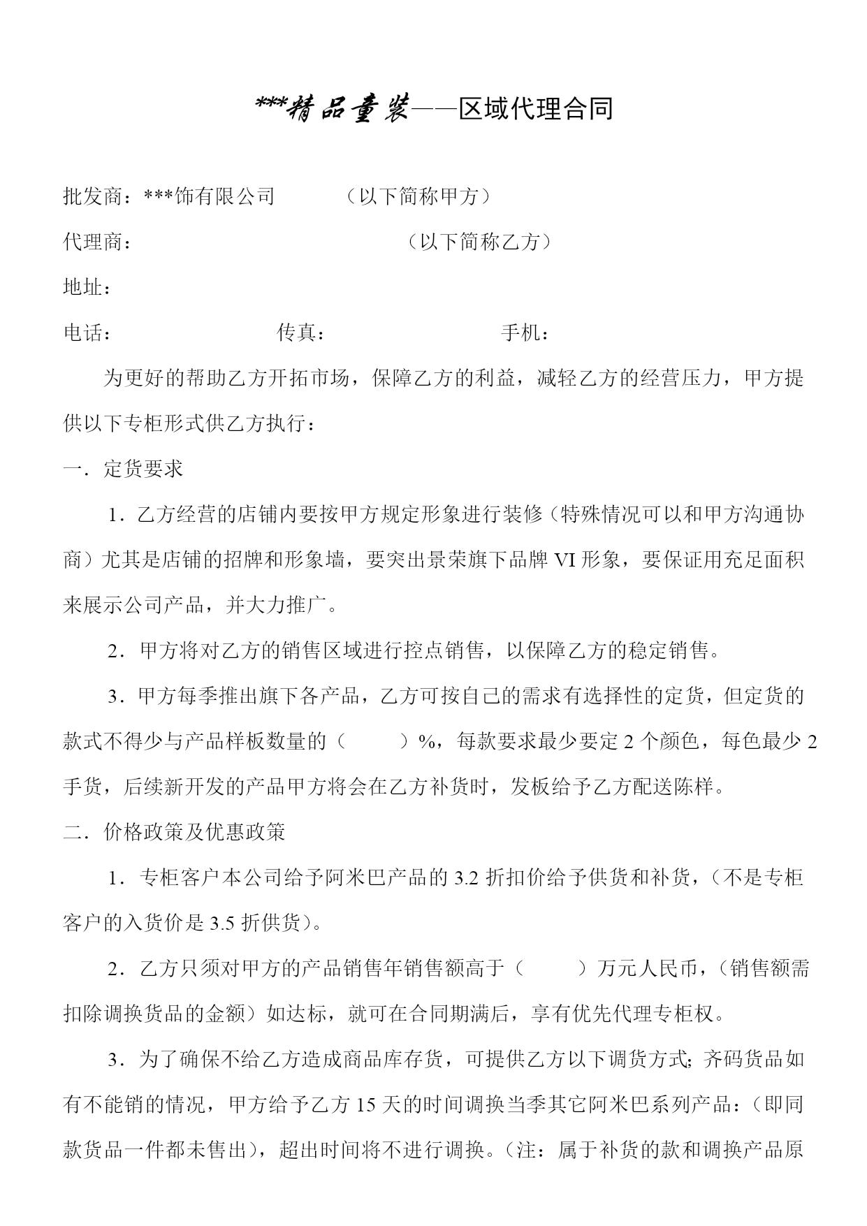 ***精品童装——区域代理合同批发商:***饰有限公司(以下简称甲方)代理商:(以下简称乙方)地址:电话:传真:手机:为更好的帮助乙方开拓市场,保障乙方的利益,减轻乙方的经营压力,甲方提供以下专柜形式供乙方执行:一.定货要求1.乙方经营的店铺内要按甲方规定形象进行装修(特殊情况可以和甲方沟通协商)尤其是店铺的招牌和形象墙,要突出景荣旗下品牌VI形象,要保证用充足面积来展示公司产品,并大力推广。2.甲方将对乙方的销售区域进行控点销售,以保障乙方的稳定销售。3.甲方每季推出旗下各产品,乙方可按自己的需求有选择性的定货,但定货的款式不得少与产品样板数量的()%,每款要求最少要定2个颜色,每色最少2手货,后续新开发的产品甲方将会在乙方补货时,发板给予乙方配送陈样。二.价格政策及优惠政策1.专柜客户本公司给予阿米巴产品的3.2折扣价给予供货和补货,(不是专柜客户的入货价是3.5折供货)。2.乙方只须对甲方的产品销售年销售额高于()万元人民币,(销售额需扣除调换货品的金额)如达标,就可在合同期满后,享有优先代理专柜权。3.为了确保不给乙方造成商品库存货,可提供乙方以下调货方式;齐码货品如有不能销的情况,甲方给予乙方15天的时间调换当季其它阿米巴系列产品:(即同款货品一件都未售出),超出时间将不进行调换。(注:属于补货的款和调换产品原包装不整齐的不予调换货)。每次换货率不得超过10%(即当次入货10000元货款,换货金额最高是1000元的货款)三.结算方式1.实行款到发货原则。2.定货会结束后,甲方将以发传真或快递的形式让乙方确认,并在确认后7天内将30%的订金汇入甲方指定的回款帐户。否则本合同自动终止。四.费用结算6.乙方退货的运费由乙方自行负责,如发生中途误时或货物遗失,甲方可负责协查,但不承担其它责任。7.乙方退货时应付清运输费用,如需要甲方提付的,由甲方提货代付后记入乙方帐户一起结算。本合同一式二份,甲乙双方各执一份为凭,自签字之日起生效。甲方签字:乙方签字:年月日**公司地址:***公司电话:***公司业务手机:***公司传真:***公司业务手机:*帐号交行:农行:建行:中行: