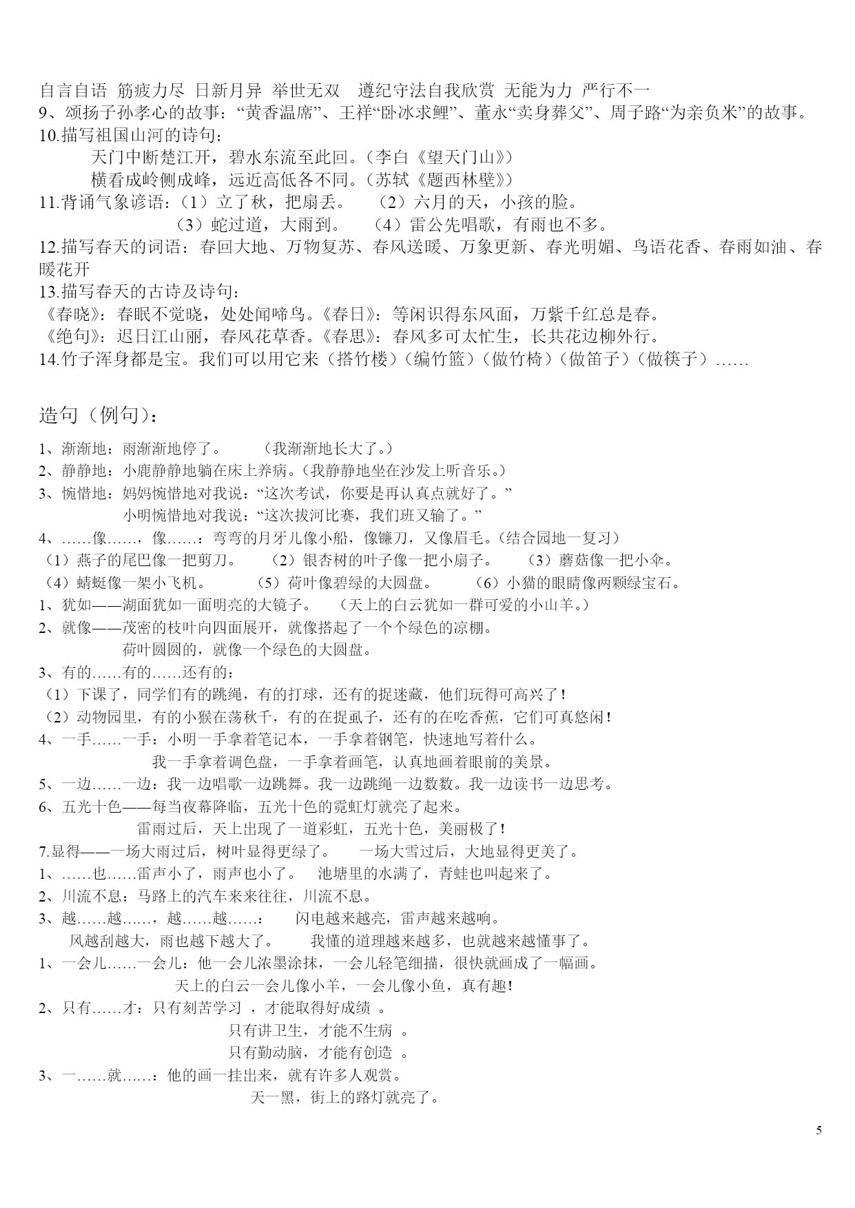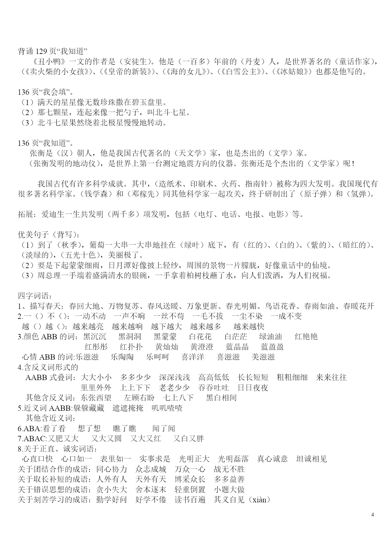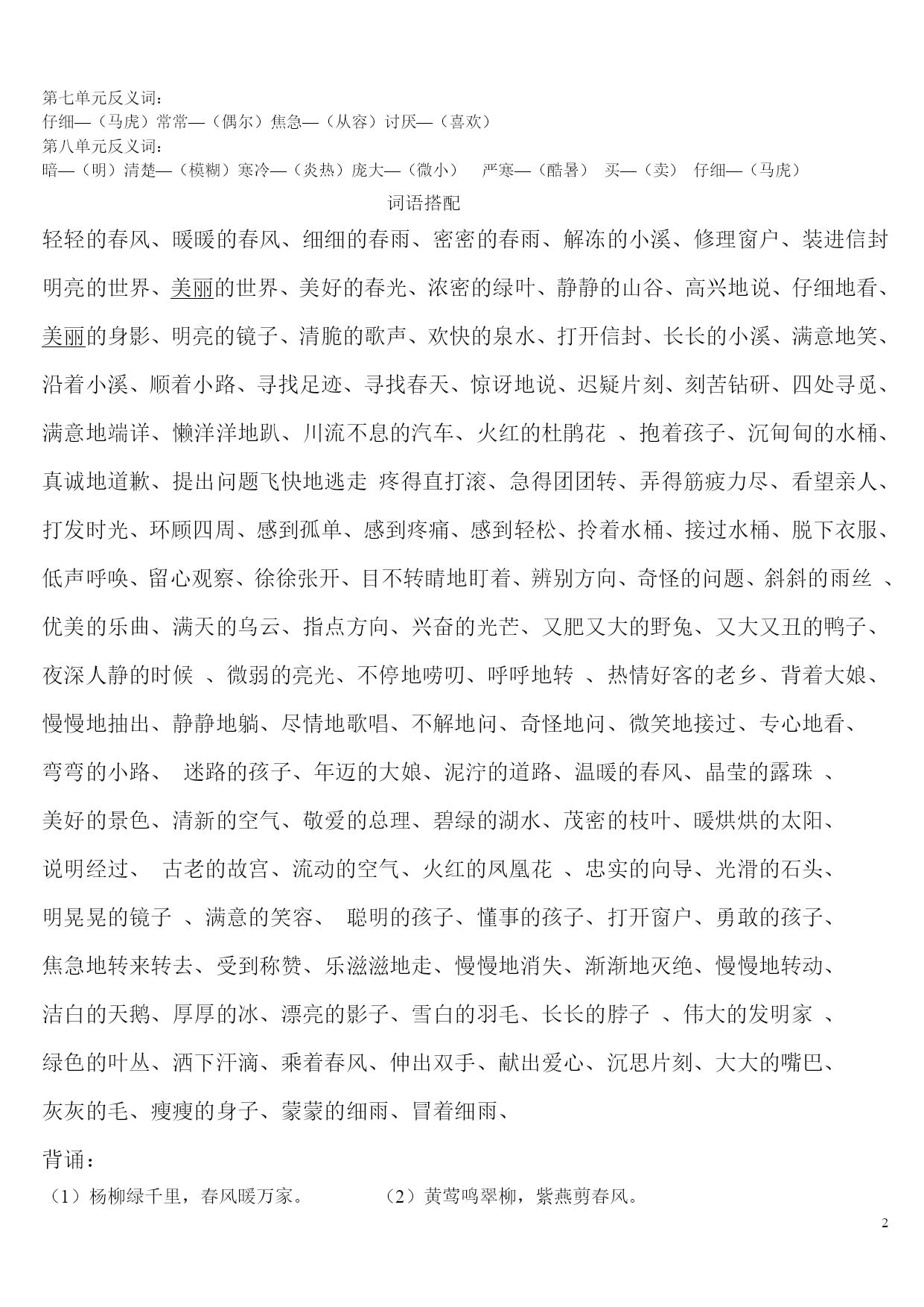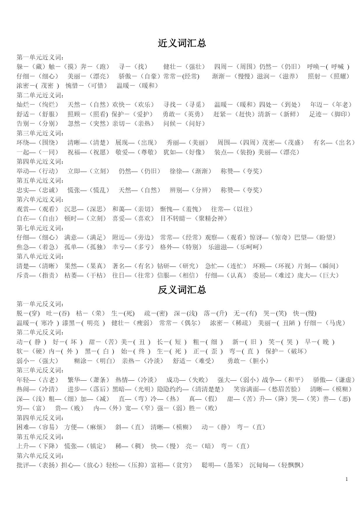 近义词汇总第一单元近义词:躲-(藏)触-(摸)奔-(跑)寻-(找)健壮-(强壮)四周-(周围)仍然-(仍旧)呼唤-(呼喊)仔细-(细心)美丽-(漂亮)骄傲-(自豪)常常-(经常)渐渐-(慢慢)滋润-(滋养)照射-(照耀)浓密-(茂密)惋惜-(可惜)温暖-(暖和)第二单元近义词:灿烂-(绚烂)天然-(自然)欢快-(欢乐)寻找-(寻觅)温暖-(暖和)四处-(到处)年迈-(年老)舒适-(舒服)照顾-(照看)保护-(爱护)勇敢-(英勇)赶紧-(赶快)清新-(新鲜)足迹-(脚印)告别-(分别)忽然-(突然)亲切-(亲热)问候-(问好)第三单元近义词:环绕—(围绕)清晰—(清楚)展现—(出现)秀丽—(美丽)周围—(四周)茂密—(茂盛)有名—(出名)一起—(一同)祝福—(祝愿)敬爱—(尊敬)犹如—(好像)装点—(装扮)美丽—(漂亮)第四单元近义词:举动—(行动)立即—(立刻)仍然—(仍旧)徐徐—(渐渐)称赞—(夸奖)第五单元近义词:忠实—(忠诚)慌张—(慌乱)天然—(自然)辨别—(分辨)称赞—(夸奖)第六单元近义词:观赏—(观看)沉思—(深思)和蔼—(亲切)惭愧—(羞愧)往常—(以往)自在—(自由)顿时—(立刻)喜爱—(喜欢)目不转睛-(聚精会神)第七单元近义词:仔细—(细心)满意—(满足)附近—(旁边)常常—(经常)观察—(观看)惊讶—(惊奇)巴望—(盼望)焦急—(着急)孤单—(孤独)幸亏—(多亏)格外—(特别)乐滋滋—(乐呵呵)第八单元近义词:清楚—(清晰)果然—(果真)著名—(有名)钻研—(研究)急忙—(连忙)环顾—(环视)片刻—(瞬间)斥责—(指责)枯萎—(干枯)往日—(往常)信服—(相信)仔细—(认真)委屈—(难过)庞大—(巨大)反义词汇总第一单元反义词:脱-(穿)吐-(吞)枯-(荣)生-(死)疏-(密)深-(浅)落-(升)无-(有)哭-(笑)快-(慢)温暖-(寒冷)漆黑-(明亮)健壮-(瘦弱)常常-(偶尔)浓密-(稀疏)美丽-(丑陋)仔细-(马虎)第二单元反义词:动-(静)好-(坏)甜-(苦)美-(丑)长-(短)粗-(细)新-(旧)笑-(哭)早-(晚)软-(硬)内-(外)黑-(白)始-(终)生-(死)正-(歪)弯-(直)保护-(破坏)弱小-(强大)糊涂-(明白)亲热-(冷淡)舒适-(难受)勇敢-(胆小)第三单元反义词:年轻—(古老)繁华—(萧条)热情—(冷淡)成功—(失败)强大—(弱小)战争—(和平)骄傲—(谦虚)热闹—(冷清)进步—(落后)黑暗—(光明)隐隐约约—(清清楚楚)笑容满面—(愁眉苦脸)清晰—(模糊)深—(浅)粗—(细)加—(减)直—(弯)冷—(热)真—(假)甜—(苦)升—(降)哭—(笑)善—(恶)穷—(富)贵—(贱)内—(外)宽—(窄)强-(弱)胜-(败)第四单元反义词:困难—(容易)方便—(麻烦)斜—(直)清晰—(模糊)动-(静)弯-(直)第五单元反义词:上升—(下降)慌张—(镇定)稀—(稠)快—(慢)亮-(暗)弯-(直)第六单元反义词:批评—(表扬)担心—(放心)轻松—(压抑)富裕—(贫穷)聪明—(愚笨)沉甸甸—(轻飘飘)第七单元反义词:仔细—(马虎)常常—(偶尔)焦急—(从容)讨厌—(喜欢)第八单元反义词:暗—(明)清楚—(模糊)寒冷—(炎热)庞大—(微小)严寒—(酷暑)买—(卖)仔细—(马虎)词语搭配轻轻的春风、暖暖的春风、细细的春雨、密密的春雨、解冻的小溪、修理窗户、装进信封明亮的世界、HYPERLINK"http://www.zuixue.com/e/tags/?tagid=222"\t"_blank"美丽的世界、美好的春光、浓密的绿叶、静静的山谷、高兴地说、仔细地看、HYPERLINK"http://www.zuixue.com/e/tags/?tagid=222"\t"_blank"美丽的身影、明亮的镜子、清脆的歌声、欢快的泉水、打开信封、长长的小溪、满意地笑、沿着小溪、顺着小路、寻找足迹、寻找春天、惊讶地说、迟疑片刻、刻苦钻研、四处寻觅、满意地端详、懒洋洋地趴、川流不息的汽车、火红的杜鹃花、抱着孩子、沉甸甸的水桶、真诚地道歉、提出问题飞快地逃走疼得直打滚、急得团团转、弄得筋疲力尽、看望亲人、打发时光、环顾四周、感到孤单、感到疼痛、感到轻松、拎着水桶、接过水桶、脱下衣服、低声呼唤、留心观察、徐徐张开、目不转睛地盯着、辨别方向、奇怪的问题、斜斜的雨丝、优美的乐曲、满天的乌云、指点方向、兴奋的光芒、又肥又大的野兔、又大又丑的鸭子、夜深人静的时候、微弱的亮光、不停地唠叨、呼呼地转、热情好客的老乡、背着大娘、慢慢地抽出、静静地躺、尽情地歌唱、不解地问、奇怪地问、微笑地接过、专心地看、弯弯的小路、迷路的孩子、年迈的大娘、泥泞的道路、温暖的春风、晶莹的露珠、美好的景色、清新的空气、