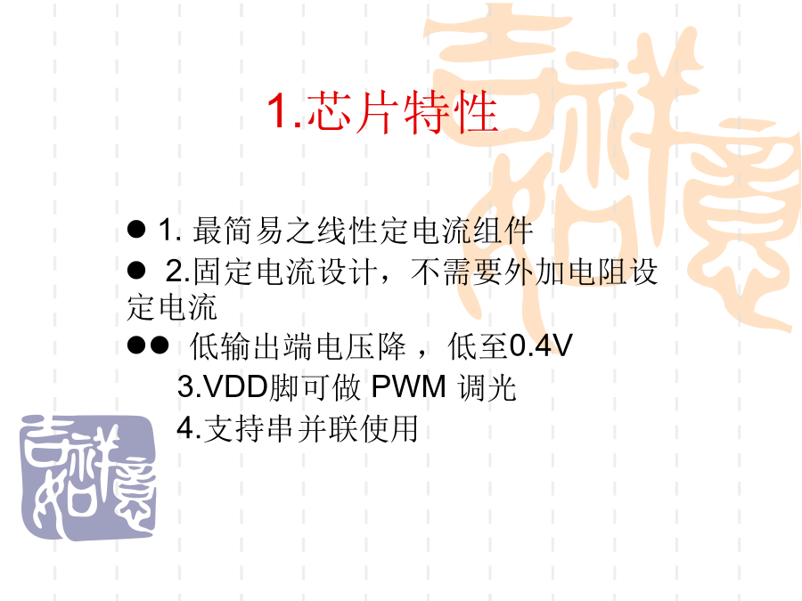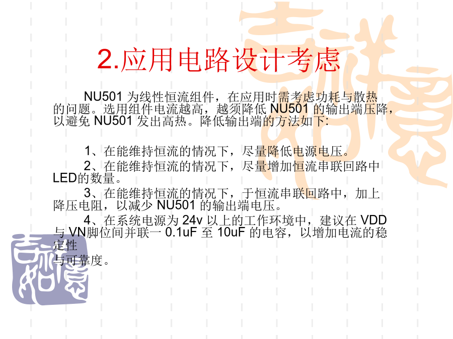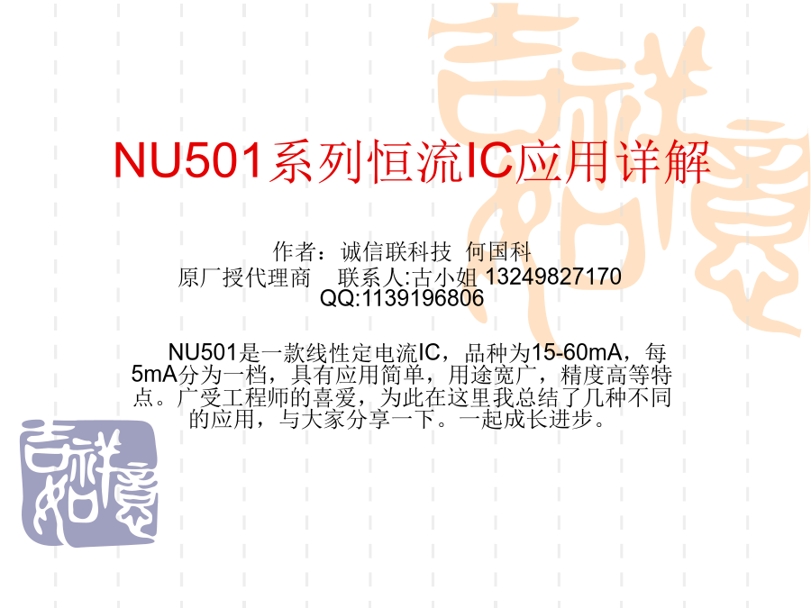 NU501系列恒流IC应用详解1.芯片特性IC引脚2.应用电路设计考虑3.设计应用案例描述:隔离应用描述应用案例测试数据RGB应用NU501应用于软灯条,硬灯条,单色上应都有很好的表现,是取代传统电阻的最佳选择,Thankyou