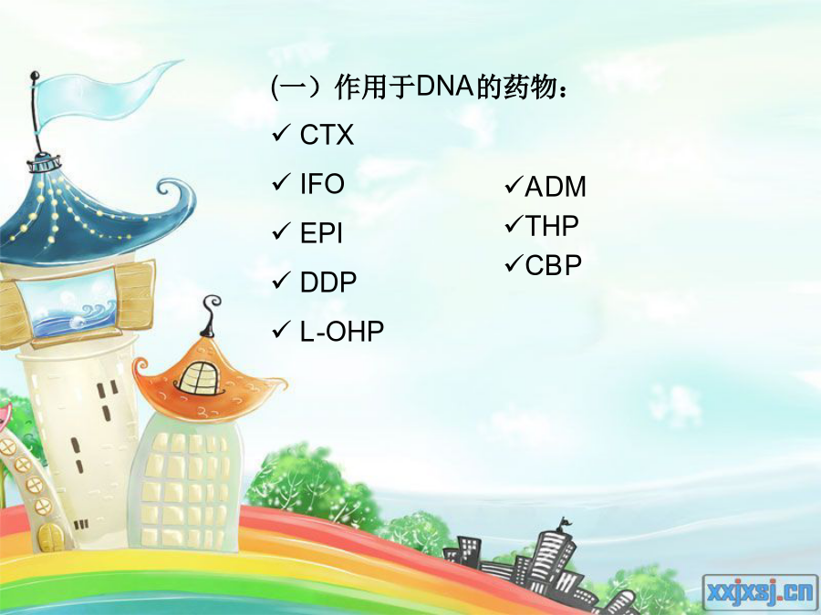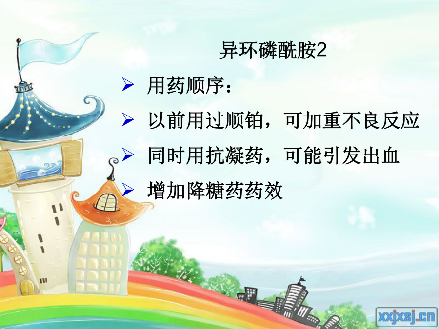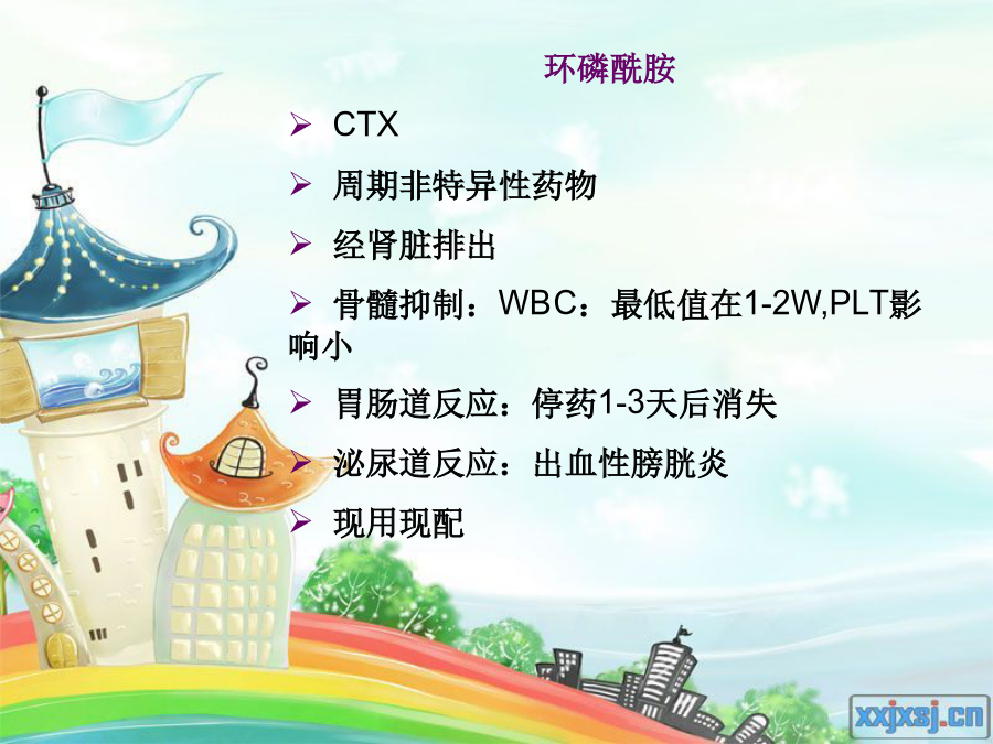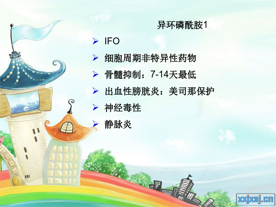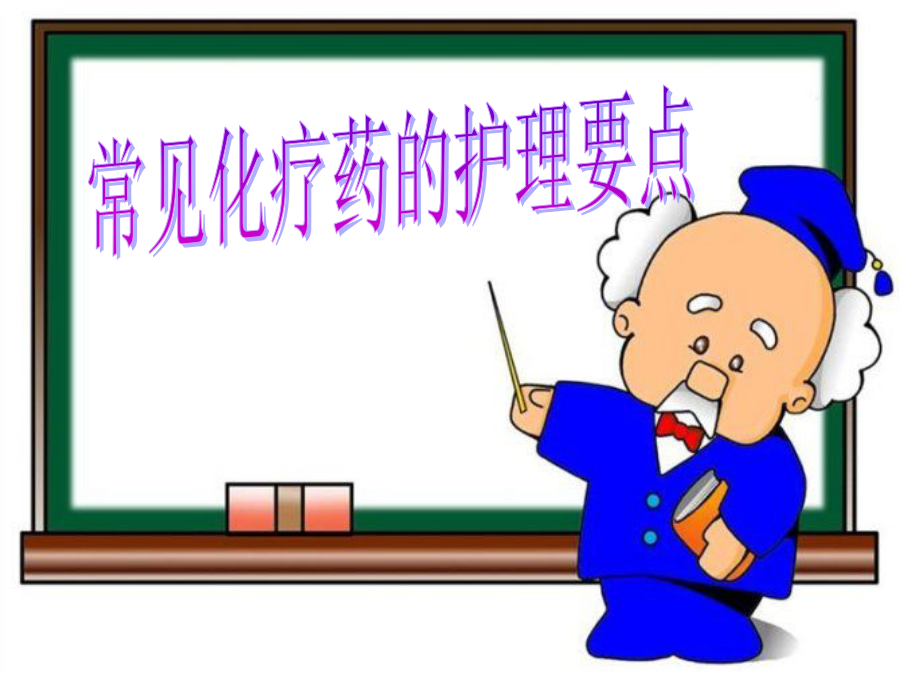 常见化疗药的护理要点环磷酰胺CTX周期非特异性药物经肾脏排出骨髓抑制:WBC:最低值在1-2W,PLT影响小胃肠道反应:停药1-3天后消失泌尿道反应:出血性膀胱炎现用现配异环磷酰胺1IFO细胞周期非特异性药物骨髓抑制:7-14天最低出血性膀胱炎:美司那保护神经毒性静脉炎异环磷酰胺2用药顺序:以前用过顺铂,可加重不良反应同时用抗凝药,可能引发出血增加降糖药药效多柔比星ADM,阿霉素周期非特异性心脏毒性:室上速,心肌炎、心力衰竭与基础心脏病无关,累积剂量红色尿与肝素、头孢菌素混合产生沉淀外渗组织坏死表柔比星EPI表阿霉素脱发、骨髓抑制、恶心呕吐等心脏毒性:一过性心脏不适,较ADM轻外渗组织坏死、蜂窝组织炎氯化钠溶解配伍禁忌:肝素、地塞米松、氨茶碱、头孢菌素吡柔比星THP、吡喃阿霉素骨髓抑制、消化道反应、心脏毒性外渗:局部炎症葡萄糖或注射用水溶解,不能用盐水溶解顺铂1DDP细胞周期非特异性药物,对免疫系统有刺激作用静脉、动脉或腔内给药肾毒性:严重而持久,肌酐、尿素氮升高。水化可以预防肾毒性,1500-3000ml消化道毒性:给药后1-6小时,恶心、呕吐骨髓抑制:3周最低,4-6周恢复顺铂2过敏反应:少见,水肿、喘鸣、心动过速耳毒性:多为可逆性神经毒性:累积剂量超过300㎎/㎡,周期神经末梢损伤:四肢感觉异常、癫痫、球后视神经炎、运动失调与紫杉醇合用:应先用紫杉醇再用顺铂卡铂CBP与顺铂不完全耐药,用顺铂无效的病人改用卡铂仍可能有效骨髓抑制:3周最低,比顺铂严重注射部位疼痛葡萄糖溶解卡铂2与氨基糖甙类抗生素合用,耳毒性增加与苯妥英纳合用,能降低苯妥英纳的药效少见不良反应:过敏、周围神经毒性、耳毒性、视力模糊、消化道反应奥沙利铂1L-OHP、草酸铂、乐沙定、艾恒不能用生理盐水溶解,应当用注射用水或5%葡萄样稀释药物避免接触铝制品静滴2小时轻度血管刺激与氟尿嘧啶合用,间隔1小时以上与伊立替康合用,胆碱能综合症可能性加大奥沙利铂2剂量限制性毒性-神经系统毒性:85%-95%,可蓄积,偶有急性咽喉感觉障碍,遇冷激发。注意保暖。罕见过敏:喉痉挛,支气管痉挛、过敏性休克、高血压单用不引起脱发主要不良反应急性短暂性外周神经病变:特点为手足和口周感觉异常和感觉迟钝,遇冷引起和/或加重,食用冷食或冷饮时出现咽喉感觉异常。通常在草酸铂滴注时出现,持续数分钟至数天,是完全可逆的,一般为轻到中度。慢性神经毒性:剂量累积性,类似顺铂,多周期后出现,停止治疗后可恢复。长春瑞滨长春瑞滨-输入方法长春瑞滨注意事项长春瑞滨注意事项喜树碱类--伊立替康伊立替康不良反应-胆碱能综合征伊立替康-迟发性腹泻紫杉醇紫杉醇紫杉醇配置方法输入紫杉醇注意事项多西他赛多西他赛输入方法多西他赛注意事项多西他赛注意事项鬼臼属细胞周期特异性药物—博来霉素、平阳霉素细胞周期特异性药物—作用于S期HD-MTX-CF-R疗法CF解救原理解救措施氟尿嘧啶吉西他滨吉西他滨输注方法吉西他滨注意事项总结附录渗透压血浆渗透压为280-320mOsm/L,285mOsm/L是等渗标准线渗透压影响血管壁细胞水分子的移动低渗溶液:<280mOsm/L如0.45%氯化钠溶液等渗溶液:280-320mOsm/L如0.9%氯化钠溶液5%GNS溶液高渗溶液:>320mOsm/L如10%葡萄糖药物性质渗透压与细胞体积临床常用药物的渗透压PH值与静脉炎的关系药物性质(列举常用药物的PH值)静脉炎分级和表现(1)静脉炎分级和表现(2)化疗药物外渗的表现静脉炎的防治预防措施临床研究主要用于HD,单药有效率高达50%-80%(CR率30%-50%),MOPP及COPP方案治疗晚期HD,CR率64%-100%,5年生存率60%-90%。NHL,单药有效率30%左右,proMACE/MOPP治疗中高度NHL,CR率高达80%,长期生存率50%左右。单药治疗SCLC有效率<30%。联合应用PCZ治疗多发性骨髓瘤有效率40%-60%,MST为2-3年。在中枢神经系统肿瘤中,PCZ对恶性胶质瘤效果较好。