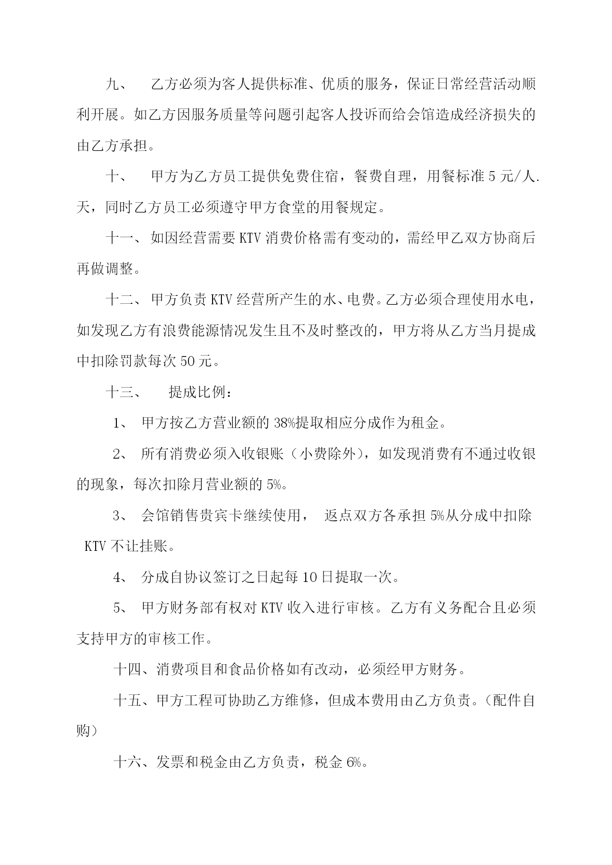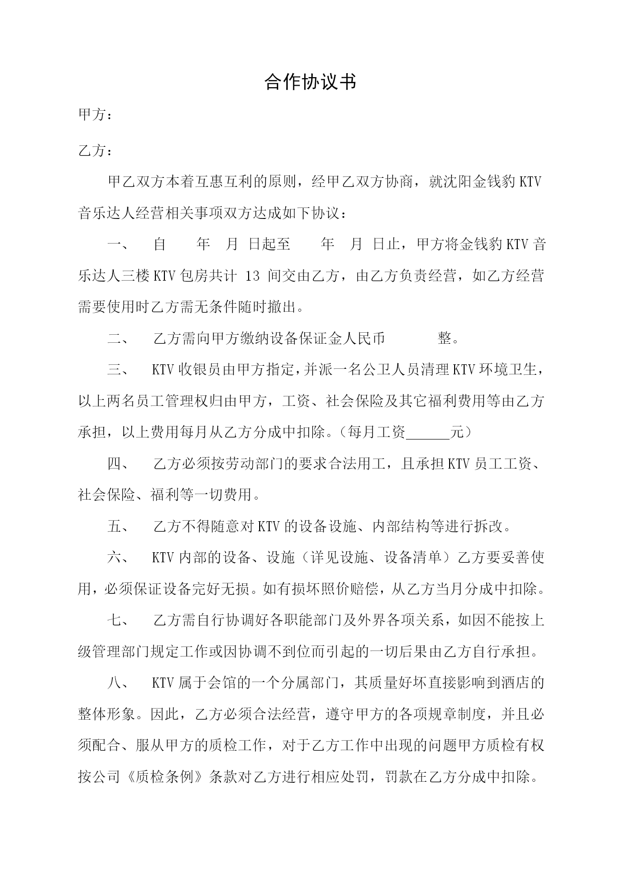 合作协议书甲方:乙方:甲乙双方本着互惠互利的原则,经甲乙双方协商,就沈阳金钱豹KTV音乐达人经营相关事项双方达成如下协议:自年月日起至年月日止,甲方将金钱豹KTV音乐达人三楼KTV包房共计13间交由乙方,由乙方负责经营,如乙方经营需要使用时乙方需无条件随时撤出。乙方需向甲方缴纳设备保证金人民币整。KTV收银员由甲方指定,并派一名公卫人员清理KTV环境卫生,以上两名员工管理权归由甲方,工资、社会保险及其它福利费用等由乙方承担,以上费用每月从乙方分成中扣除。(每月工资元)乙方必须按劳动部门的要求合法用工,且承担KTV员工工资、社会保险、福利等一切费用。乙方不得随意对KTV的设备设施、内部结构等进行拆改。KTV内部的设备、设施(详见设施、设备清单)乙方要妥善使用,必须保证设备完好无损。如有损坏照价赔偿,从乙方当月分成中扣除。乙方需自行协调好各职能部门及外界各项关系,如因不能按上级管理部门规定工作或因协调不到位而引起的一切后果由乙方自行承担。KTV属于会馆的一个分属部门,其质量好坏直接影响到酒店的整体形象。因此,乙方必须合法经营,遵守甲方的各项规章制度,并且必须配合、服从甲方的质检工作,对于乙方工作中出现的问题甲方质检有权按公司《质检条例》条款对乙方进行相应处罚,罚款在乙方分成中扣除。乙方必须为客人提供标准、优质的服务,保证日常经营活动顺利开展。如乙方因服务质量等问题引起客人投诉而给会馆造成经济损失的由乙方承担。甲方为乙方员工提供免费住宿,餐费自理,用餐标准5元/人.天,同时乙方员工必须遵守甲方食堂的用餐规定。如因经营需要KTV消费价格需有变动的,需经甲乙双方协商后再做调整。甲方负责KTV经营所产生的水、电费。乙方必须合理使用水电,如发现乙方有浪费能源情况发生且不及时整改的,甲方将从乙方当月提成中扣除罚款每次50元。提成比例:甲方按乙方营业额的38%提取相应分成作为租金。所有消费必须入收银账(小费除外),如发现消费有不通过收银的现象,每次扣除月营业额的5%。会馆销售贵宾卡继续使用,返点双方各承担5%从分成中扣除KTV不让挂账。分成自协议签订之日起每10日提取一次。甲方财务部有权对KTV收入进行审核。乙方有义务配合且必须支持甲方的审核工作。十四、消费项目和食品价格如有改动,必须经甲方财务。十五、甲方工程可协助乙方维修,但成本费用由乙方负责。(配件自购)十六、发票和税金由乙方负责,税金6%。十七、双方如需终止此协议,必须提前一个月以书面形式告知对方。如有违反需赔付对方相应损失(损失金额双方协商)。十八、未尽事宜由双方共同协商,签订补充协议。十九、本协议一式肆份,双方各执两份,未尽事宜双方协商解决。甲方(盖章):乙方(盖章):年月日年月日