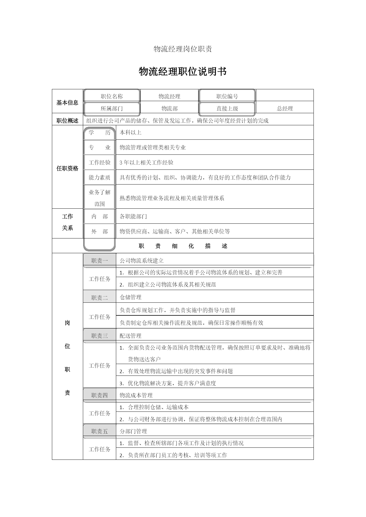 物流经理岗位职责物流经理职位说明书基本信息职位名称物流经理职位编号所属部门物流部直接上级总经理职位概述组织进行公司产品的储存、保管及发运工作,确保公司年度经营计划的完成任职资格学历本科以上专业物流管理或管理类相关专业工作经验3年以上相关工作经验能力素质具有优秀的计划、组织、协调能力,有良好的工作态度和团队合作能力业务了解范围熟悉物流管理业务流程及相关质量管理体系工作关系内部各职能部门外部物资供应商、运输商、客户、其他相关单位等职责细化描述岗位职责职责一公司物流系统建立工作任务1.根据公司的实际运营情况着手公司物流体系的规划、建立和完善2.组织建立公司物流体系及其相关规范职责二仓储管理工作任务负责仓库规划工作,并负责实施中的指导与监督负责制定仓库相关操作流程及规范,确保日常操作顺畅有效职责三配送管理工作任务1.全面负责公司业务范围内货物配送管理,确保按照订单要求及时、准确地将货物送达客户2.有效处理物流运输中出现的突发事件和问题3.优化物流解决方案,提升客户满意度职责四物流成本管理工作任务1.合理控制仓储、运输成本2.与公司财务部进行协调,保证将整体物流成本控制在合理范围内职责五分部门管理工作任务1.监督、检查所辖部门各项工作及计划的执行情况2.负责所在部门员工的考核、培训等项工作制定计划与流程管理:根据公司目标,收集公司内部与客户各方对物流效果的评价,负责物流管理工作计划与费用预算的制定、审批与实施工作;通过制定及实施物流SOP(标准操作规程),组织建立公司物流信息系统,优化物料库存控制、订单处理、运输及配送等物流管理和运作体系,提高物流转运效率,减少资金占用,改进服务,降低物流成本,使公司物流环节具有竞争力;2、物流网络体系建设:组织建立公司货物运输体系,规划公司的货物调配与调度,评估和选择物流承运商及运输价格,运输服务质量,签订合作合同,降低运输成本,提高货物流转效率,降低货物运输成本,降低货物流转过程的风险;3、物流承运商管理:收集公司内部与客户各方对物流效果的评价反馈,执行对第三方物流公司的考核工作,及时解除与不合格物流公司的合同,加强与优秀第三方物流的合作,逐步提高物流效率,及时解决客户的物流投诉,提高客户对物流配送的满意度;4、仓储管理:根据物料特性及物流发展状况,组织建立公司仓储、周转等仓库管理体系,制订和完善各项仓库管理流程和制度,保障货物安全和按相应需求及时供应,降低库存,降低货物保管成本,提高公司货物使用效率,降低货物流转过程的风险;5、销售与市场支持:就物流信息及时向销售计划部、客户服务部、财务部与物流合作商进行反馈,掌握发货与库存的动态变化,协助销售计划部做好要货计划,增强生产部门的预见性,以利于及时安排生产作业计划;支持销售及相关市场活动,配合销售策略的变化、对客户需求进行分析、优化资源配置;6、部门行政管理:根据公司发展战略及价值导向,结合物流业务特点,协助经理开展组织建设和人员培训,并进行日常监督,检查指导,绩效考核等工作,实现人力资本的不断增值。任职条件教育背景:物流管理、国际贸易、管理及经济类相关专业本科以上学历。经验:五年以上物流/采购相关职位工作经验,同等管理职位至少三年以上工作经验。知识/技能:具备丰富的物流管理专业知识,熟悉保税仓储、物流控制领域,熟悉海关进出口流程;熟练使用电脑办公软件;具有极强的敬业精神并具备良好的领导才能和良好的行业管理理念,具有良好的沟通与谈判能力;工作作风严谨稳健,具备强烈的创业精神和开拓意识;精力充沛,团队组织能力强,能承受较大工作压力。