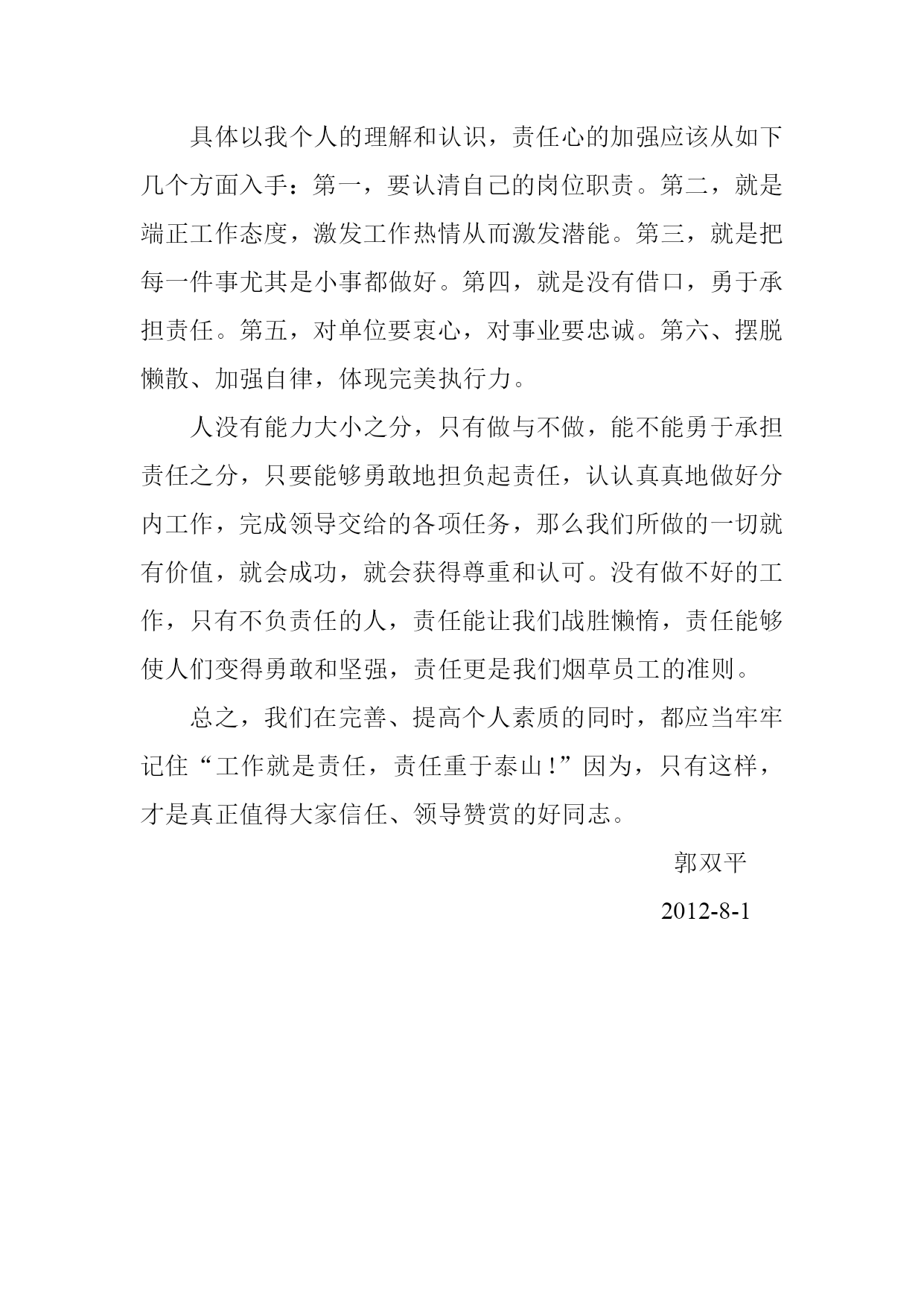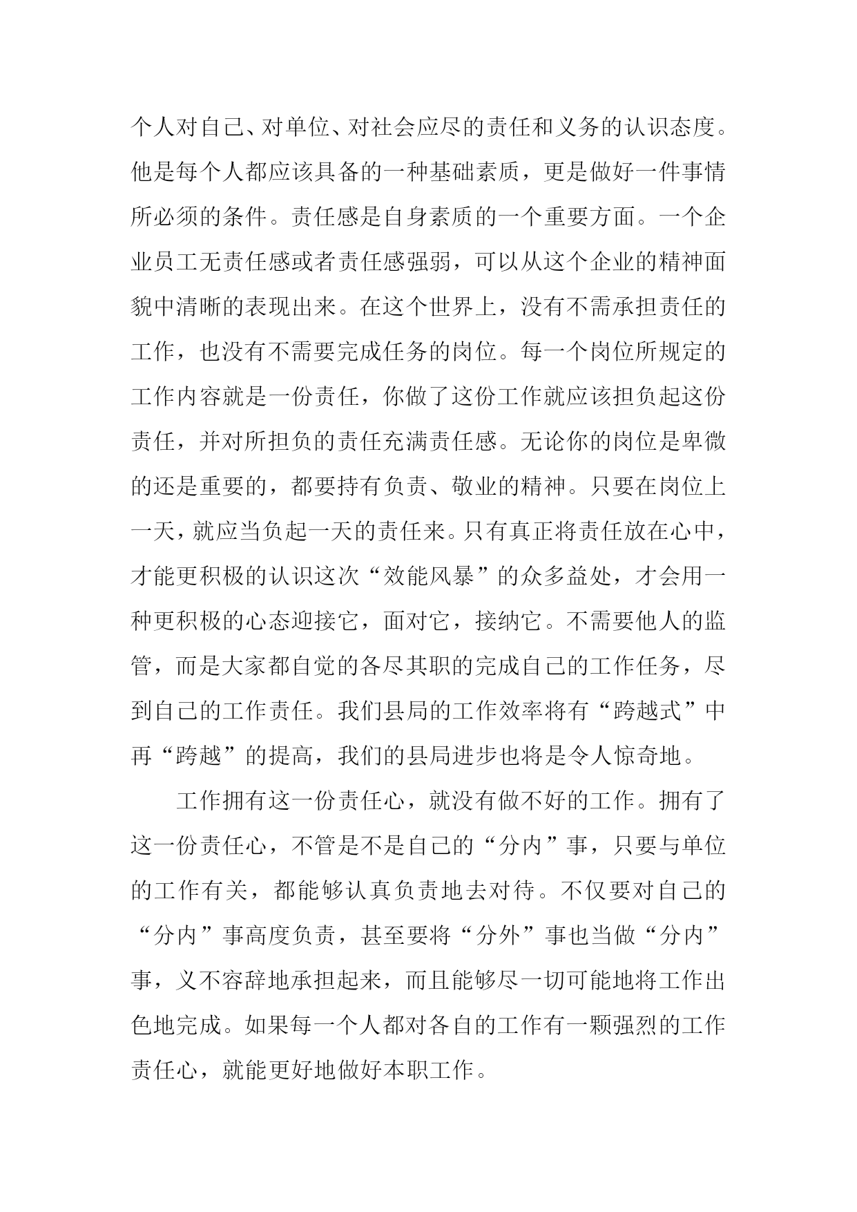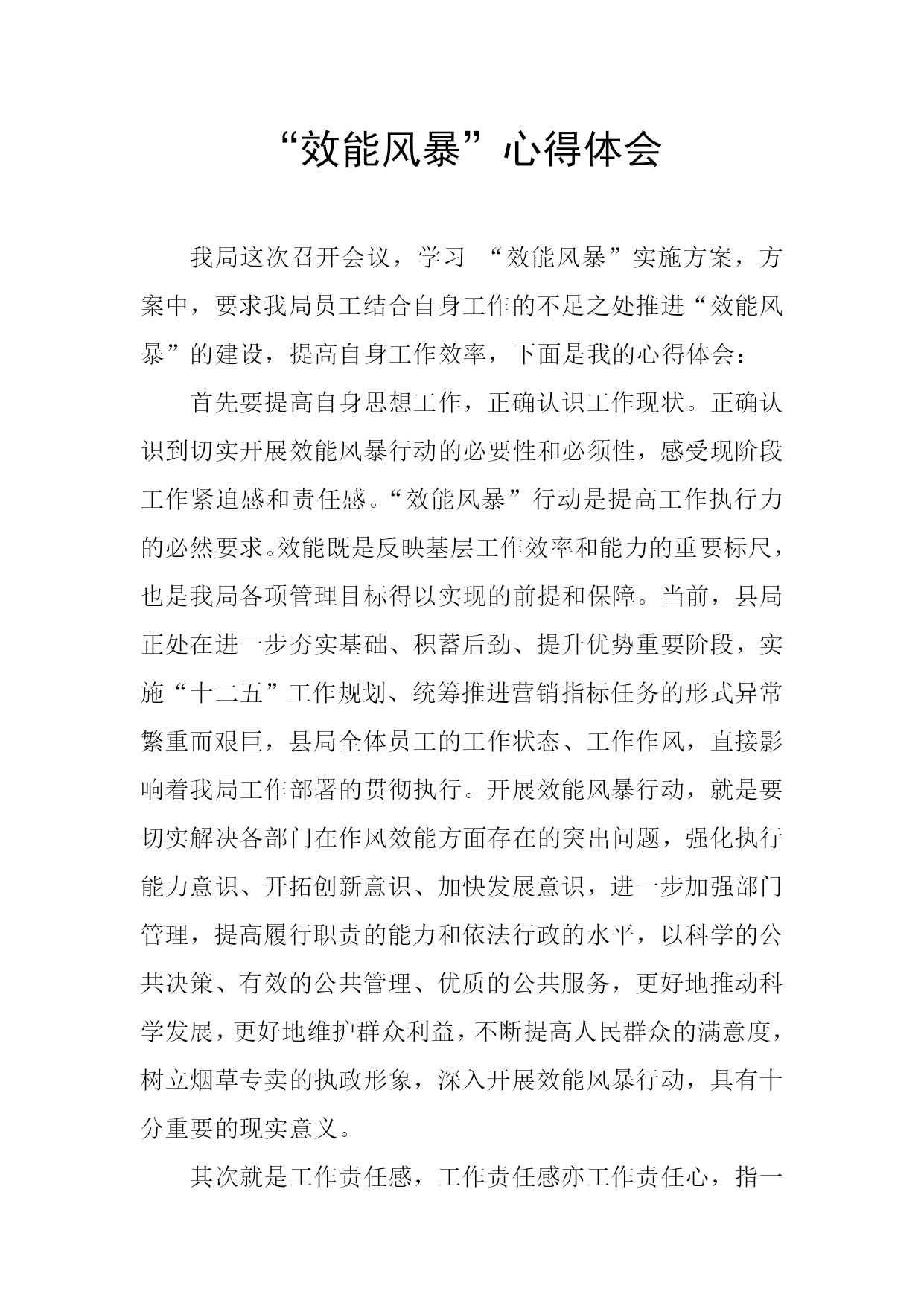 “效能风暴”心得体会我局这次召开会议,学习“效能风暴”实施方案,方案中,要求我局员工结合自身工作的不足之处推进“效能风暴”的建设,提高自身工作效率,下面是我的心得体会:首先要提高自身思想工作,正确认识工作现状。正确认识到切实开展效能风暴行动的必要性和必须性,感受现阶段工作紧迫感和责任感。“效能风暴”行动是提高工作执行力的必然要求。效能既是反映基层工作效率和能力的重要标尺,也是我局各项管理目标得以实现的前提和保障。当前,县局正处在进一步夯实基础、积蓄后劲、提升优势重要阶段,实施“十二五”工作规划、统筹推进营销指标任务的形式异常繁重而艰巨,县局全体员工的工作状态、工作作风,直接影响着我局工作部署的贯彻执行。开展效能风暴行动,就是要切实解决各部门在作风效能方面存在的突出问题,强化执行能力意识、开拓创新意识、加快发展意识,进一步加强部门管理,提高履行职责的能力和依法行政的水平,以科学的公共决策、有效的公共管理、优质的公共服务,更好地推动科学发展,更好地维护群众利益,不断提高人民群众的满意度,树立烟草专卖的执政形象,深入开展效能风暴行动,具有十分重要的现实意义。其次就是工作责任感,工作责任感亦工作责任心,指一个人对自己、对单位、对社会应尽的责任和义务的认识态度。他是每个人都应该具备的一种基础素质,更是做好一件事情所必须的条件。责任感是自身素质的一个重要方面。一个企业员工无责任感或者责任感强弱,可以从这个企业的精神面貌中清晰的表现出来。在这个世界上,没有不需承担责任的工作,也没有不需要完成任务的岗位。每一个岗位所规定的工作内容就是一份责任,你做了这份工作就应该担负起这份责任,并对所担负的责任充满责任感。无论你的岗位是卑微的还是重要的,都要持有负责、敬业的精神。只要在岗位上一天,就应当负起一天的责任来。只有真正将责任放在心中,才能更积极的认识这次“效能风暴”的众多益处,才会用一种更积极的心态迎接它,面对它,接纳它。不需要他人的监管,而是大家都自觉的各尽其职的完成自己的工作任务,尽到自己的工作责任。我们县局的工作效率将有“跨越式”中再“跨越”的提高,我们的县局进步也将是令人惊奇地。工作拥有这一份责任心,就没有做不好的工作。拥有了这一份责任心,不管是不是自己的“分内”事,只要与单位的工作有关,都能够认真负责地去对待。不仅要对自己的“分内”事高度负责,甚至要将“分外”事也当做“分内”事,义不容辞地承担起来,而且能够尽一切可能地将工作出色地完成。如果每一个人都对各自的工作有一颗强烈的工作责任心,就能更好地做好本职工作。具体以我个人的理解和认识,责任心的加强应该从如下几个方面入手:第一,要认清自己的岗位职责。第二,就是端正工作态度,激发工作热情从而激发潜能。第三,就是把每一件事尤其是小事都做好。第四,就是没有借口,勇于承担责任。第五,对单位要衷心,对事业要忠诚。第六、摆脱懒散、加强自律,体现完美执行力。人没有能力大小之分,只有做与不做,能不能勇于承担责任之分,只要能够勇敢地担负起责任,认认真真地做好分内工作,完成领导交给的各项任务,那么我们所做的一切就有价值,就会成功,就会获得尊重和认可。没有做不好的工作,只有不负责任的人,责任能让我们战胜懒惰,责任能够使人们变得勇敢和坚强,责任更是我们烟草员工的准则。总之,我们在完善、提高个人素质的同时,都应当牢牢记住“工作就是责任,责任重于泰山!”因为,只有这样,才是真正值得大家信任、领导赞赏的好同志。郭双平2012-8-1