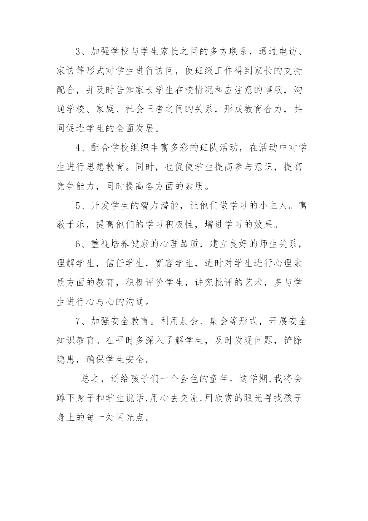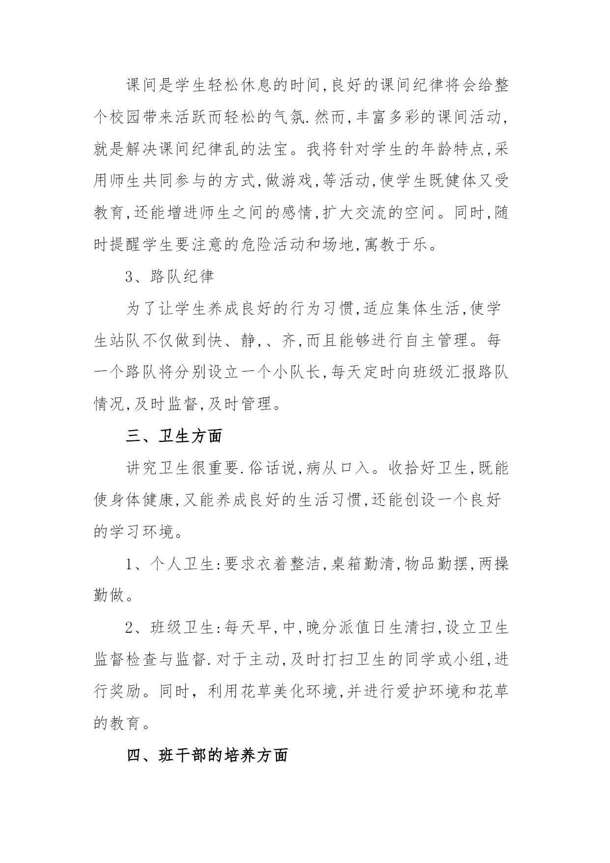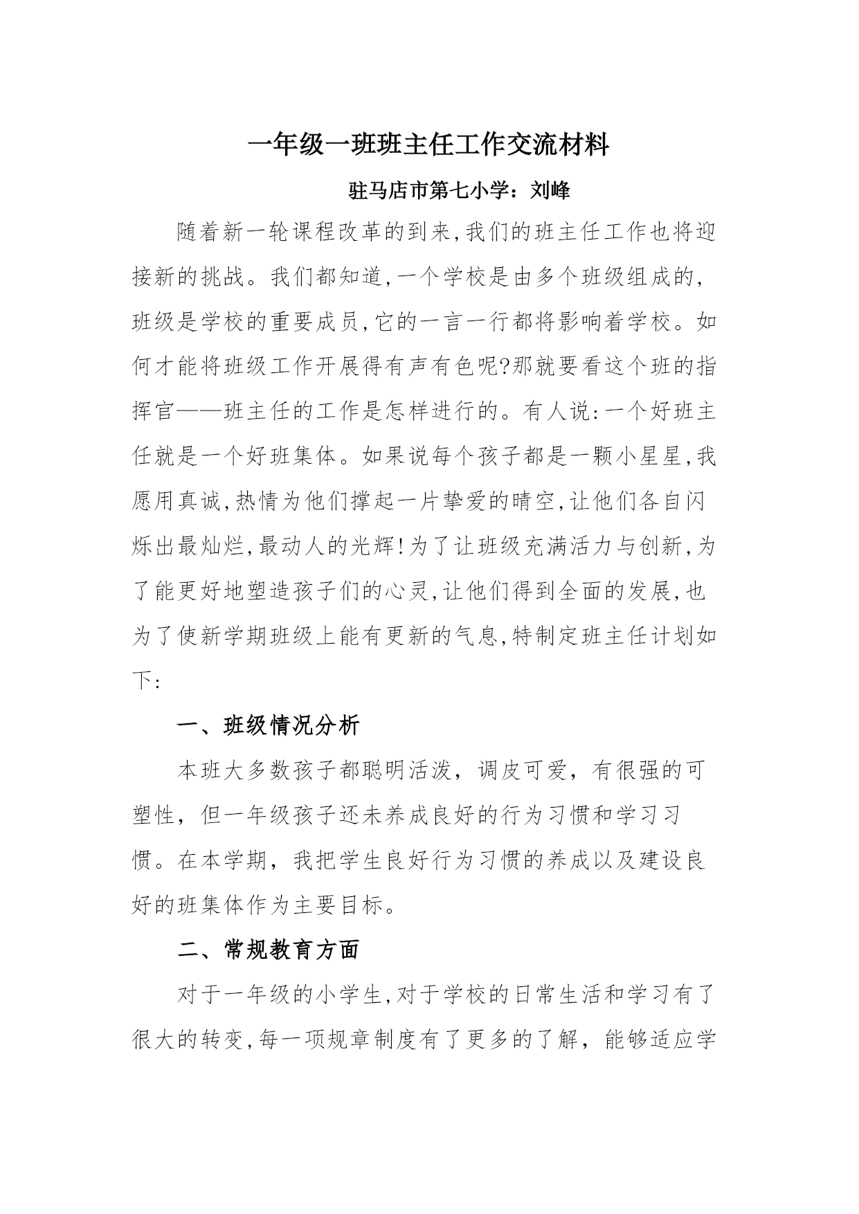 一年级一班班主任工作交流材料驻马店市第七小学:刘峰随着新一轮课程改革的到来,我们的班主任工作也将迎接新的挑战。我们都知道,一个学校是由多个班级组成的,班级是学校的重要成员,它的一言一行都将影响着学校。如何才能将班级工作开展得有声有色呢?那就要看这个班的指挥官——班主任的工作是怎样进行的。有人说:一个好班主任就是一个好班集体。如果说每个孩子都是一颗小星星,我愿用真诚,热情为他们撑起一片挚爱的晴空,让他们各自闪烁出最灿烂,最动人的光辉!为了让班级充满活力与创新,为了能更好地塑造孩子们的心灵,让他们得到全面的发展,也为了使新学期班级上能有更新的气息,特制定班主任计划如下:一、班级情况分析本班大多数孩子都聪明活泼,调皮可爱,有很强的可塑性,但一年级孩子还未养成良好的行为习惯和学习习惯。在本学期,我把学生良好行为习惯的养成以及建设良好的班集体作为主要目标。二、常规教育方面对于一年级的小学生,对于学校的日常生活和学习有了很大的转变,每一项规章制度有了更多的了解,能够适应学校的生活,在学校日常生活中能有序的进行。因此,我决定从以下几点入手:1、充分利用班队会及晨会的时间学习《一日常规》,《小学生守则》和《小学生日常行为规范》,并在日常学习的过程中让学生知道什么行为是对的,什么是不对的,使学生养成良好的学习和生活习惯。对表现不够好的学生,及时进行点拨,指导,加强教育。2、充分发挥各项活动中的教育阵地的作用,增强学生的荣誉感,使学生心中有他人,有集体。比如:可以利用讲名人的故事等活动,对学生进行思想教育。进一步规范学生的行为习惯。对于学生的书写读的姿势也要进行规范和管理。三、班级纪律方面一个班级,要想有良好的班风,必须要有良好的纪律才行。因此,我从以下几点入手:1、课堂纪律首先师生共同制定班规班纪,并制定相应的奖惩办法。这样学生既感到有趣,又有动力,而且可以在不知不觉中遵守纪律。由于是孩子们自己制定的,这样变被动的各种要求为主动的行为,有助于学生说到就要做。2、课间纪律课间是学生轻松休息的时间,良好的课间纪律将会给整个校园带来活跃而轻松的气氛.然而,丰富多彩的课间活动,就是解决课间纪律乱的法宝。我将针对学生的年龄特点,采用师生共同参与的方式,做游戏,等活动,使学生既健体又受教育,还能增进师生之间的感情,扩大交流的空间。同时,随时提醒学生要注意的危险活动和场地,寓教于乐。3、路队纪律为了让学生养成良好的行为习惯,适应集体生活,使学生站队不仅做到快、静,、齐,而且能够进行自主管理。每一个路队将分别设立一个小队长,每天定时向班级汇报路队情况,及时监督,及时管理。三、卫生方面讲究卫生很重要.俗话说,病从口入。收拾好卫生,既能使身体健康,又能养成良好的生活习惯,还能创设一个良好的学习环境。1、个人卫生:要求衣着整洁,桌箱勤清,物品勤摆,两操勤做。2、班级卫生:每天早,中,晚分派值日生清扫,设立卫生监督检查与监督.对于主动,及时打扫卫生的同学或小组,进行奖励。同时,利用花草美化环境,并进行爱护环境和花草的教育。四、班干部的培养方面班级管理光靠班主任一人来管理是不够的,而班干部却是班级管理的小助手。这学期我将采取班干部轮流制(包括班长和组长),使班级管理再上新台阶,让每个孩子的潜能都得到充分的挖掘,培养有个性的人,使孩子们学会学习,学会生活,学会合作和学会管理。五、其他方面班级管理中还应注重个体的发展,在各项活动中挖掘各种人才及学生的潜力,使班上的每个同学都能在某一方面得到进一步的发展。因此,在班级继续开展各种活动.如:文明小标兵评选,小书法家,小发明家,小诗人,数学小博士和爱书人等各种评比活动.在这些活动中,大力推出新人,新作,让每个孩子都敢于面对大家展示自我,充分锻炼自己,提高学生的自信心.另外,充分利用班级板报中的德育阵地,加强管理。四、具体工作措施:1、加强班干部的建设。班干部是老师的得力助手,要切实加强班干部的能力,落实每个小干部的责任,并定期召开班干部会议,对班级大事小事进行商讨研究,及时反馈及时处理。以此带动全体同学形成一个良好的班风。2、加强班级规范化建设,创设优美的学习环境,激励学生积极进取,促进班集体建设不断完善。同时也为良好的班风学风创造了条件。3、加强学校与学生家长之间的多方联系,通过电访、家访等形式对学生进行访问,使班级工作得到家长的支持配合,并及时告知家长学生在校情况和应注意的事项,沟通学校、家庭、社会三者之间的关系,形成教育合力,共同促进学生的全面发展。4、配合学校组织丰富多彩的班队活动,在活动中对学生进行思想教育。同时,也促使学生提高参与意识,提高竞争能力,同时提高各方面的素质。5、开发学生的智力潜能,让他们做学习的小主人。寓教于乐,提高他们的学习积极性,增进学习的效果。6、重视培养健康的心理品质,建立良好的师生关系,理解学生