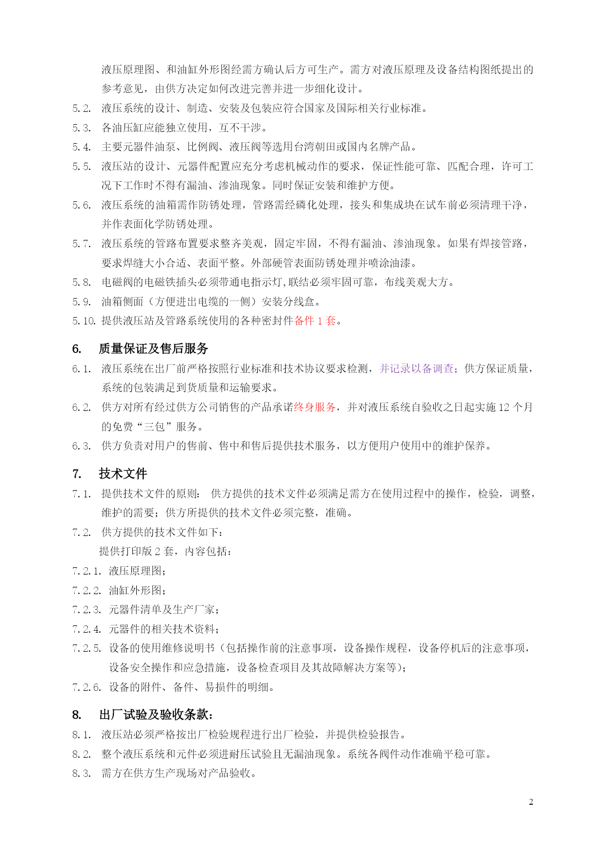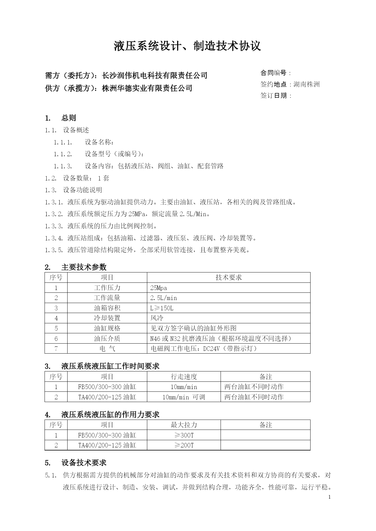 液压系统设计、制造技术协议合同编号:签约地点:湖南株洲签订日期:需方(委托方):长沙润伟机电科技有限责任公司供方(承揽方):株洲华德实业有限责任公司总则设备概述设备名称:设备型号(或编号):设备内容:包括液压站、阀组、油缸、配套管路设备数量:1套设备功能说明液压系统为驱动油缸提供动力。主要由油缸、液压站,各相关的阀及管路组成。液压系统额定压力为25MPa,额定流量2.5L/Min。液压系统的压力由比例阀控制。液压站组成:包括油箱、过滤器、液压泵、液压阀、冷却装置等。液压管道除结构限定外,全部采用软管连接,且布置整齐美观。主要技术参数序号项目技术要求1工作压力25Mpa2工作流量2.5L/min3油箱容积L≥150L4冷却装置风冷5油缸规格见双方签字确认的油缸外形图6油压介质N46或N32抗磨液压油(根据环境温度不同选择)7电气电磁阀工作电压:DC24V(带指示灯)液压系统液压缸工作时间要求序号项目行走速度备注1FB500/300-300油缸10mm/min两台油缸不同时动作2TA400/200-125油缸10mm/min可调两台油缸不同时动作液压系统液压缸的作用力要求序号项目最大拉力备注1FB500/300-300油缸≥300T2TA400/200-125油缸≥200T设备技术要求供方根据需方提供的机械部分对油缸的动作要求及有关技术资料和双方协商的有关要求,对液压系统进行设计、制造、安装、调试,并做到结构合理,功能齐全,性能可靠,运行平稳。液压原理图、和油缸外形图经需方确认后方可生产。需方对液压原理及设备结构图纸提出的参考意见,由供方决定如何改进完善并进一步细化设计。液压系统的设计、制造、安装及包装应符合国家及国际相关行业标准。各油压缸应能独立使用,互不干涉。主要元器件油泵、比例阀、液压阀等选用台湾朝田或国内名牌产品。液压站的设计、元器件配置应充分考虑机械动作的要求,保证性能可靠、匹配合理,许可工况下工作时不得有漏油、渗油现象。同时保证安装和维护方便。液压系统的油箱需作防锈处理,管路需经磷化处理,接头和集成块在试车前必须清理干净,并作表面化学防锈处理。液压系统的管路布置要求整齐美观,固定牢固,不得有漏油、渗油现象。如果有焊接管路,要求焊缝大小合适、表面平整。外部硬管表面防锈处理并喷涂油漆。电磁阀的电磁铁插头必须带通电指示灯,联结必须牢固可靠,布线美观大方。油箱侧面(方便进出电缆的一侧)安装分线盒。提供液压站及管路系统使用的各种密封件备件1套。质量保证及售后服务液压系统在出厂前严格按照行业标准和技术协议要求检测,并记录以备调查;供方保证质量,系统的包装满足到货质量和运输要求。供方对所有经过供方公司销售的产品承诺终身服务,并对液压系统自验收之日起实施12个月的免费“三包”服务。供方负责对用户的售前、售中和售后提供技术服务,以方便用户使用中的维护保养。技术文件提供技术文件的原则:供方提供的技术文件必须满足需方在使用过程中的操作,检验,调整,维护的需要;供方所提供的技术文件必须完整,准确。供方提供的技术文件如下:提供打印版2套,内容包括:液压原理图;油缸外形图;元器件清单及生产厂家;元器件的相关技术资料;设备的使用维修说明书(包括操作前的注意事项,设备操作规程,设备停机后的注意事项,设备安全操作和应急措施,设备检查项目及其故障解决方案等);设备的附件、备件、易损件的明细。出厂试验及验收条款:液压站必须严格按出厂检验规程进行出厂检验,并提供检验报告。整个液压系统和元件必须进耐压试验且无漏油现象。系统各阀件动作准确平稳可靠。需方在供方生产现场对产品验收。液压站检验合格后,供方提供产品合格证。供方负责在需方指定地点(长、株、潭地区)进行现场安装调试。其它本协议由技术协议正文、液压原理图、油缸外形图组成,一式四份,需方二份,供方二份,双方代表签字、单位盖章。本技术协议与商务合同同时生效,并与商务合同具有同等法律效力。管路的配置需、供方双方现场协商确定,安装时供方提供现场管道布置简图。其它未尽事宜,双方友好协商解决。需方代表:供方代表: