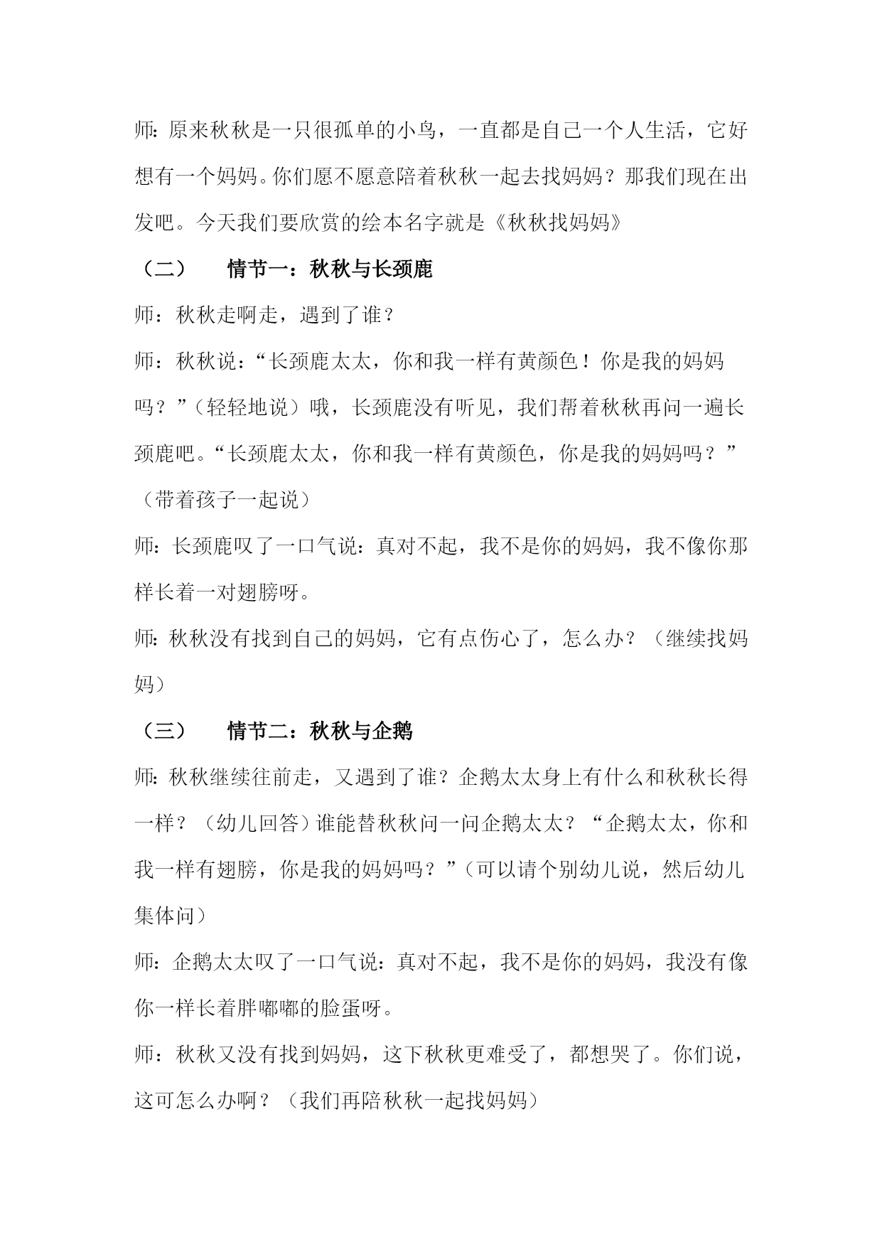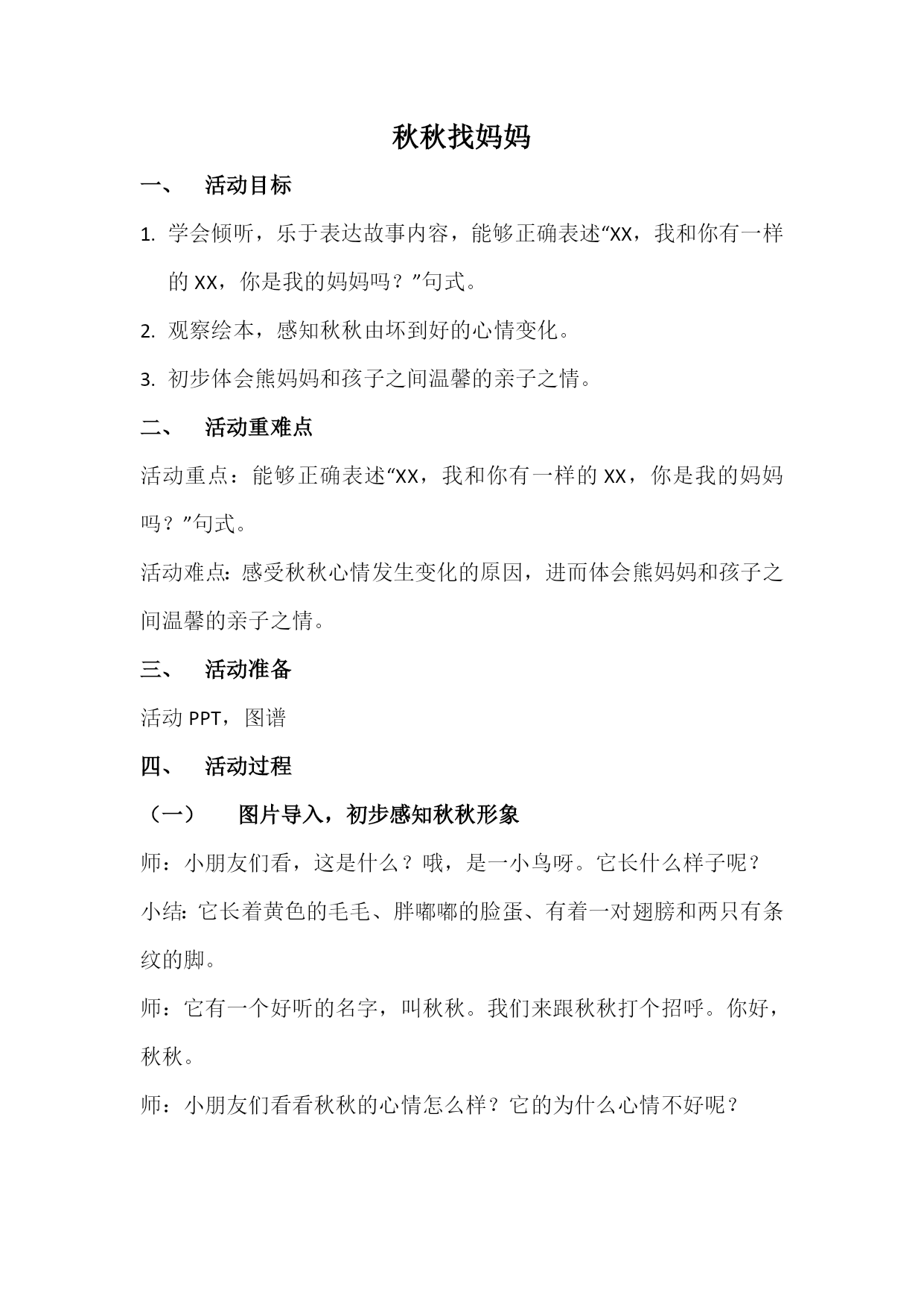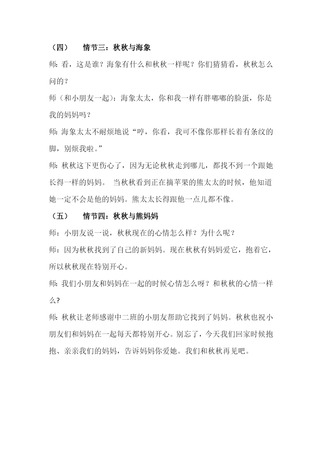 秋秋找妈妈活动目标学会倾听,乐于表达故事内容,能够正确表述“XX,我和你有一样的XX,你是我的妈妈吗?”句式。观察绘本,感知秋秋由坏到好的心情变化。初步体会熊妈妈和孩子之间温馨的亲子之情。活动重难点活动重点:能够正确表述“XX,我和你有一样的XX,你是我的妈妈吗?”句式。活动难点:感受秋秋心情发生变化的原因,进而体会熊妈妈和孩子之间温馨的亲子之情。活动准备活动PPT,图谱活动过程图片导入,初步感知秋秋形象师:小朋友们看,这是什么?哦,是一小鸟呀。它长什么样子呢?小结:它长着黄色的毛毛、胖嘟嘟的脸蛋、有着一对翅膀和两只有条纹的脚。师:它有一个好听的名字,叫秋秋。我们来跟秋秋打个招呼。你好,秋秋。师:小朋友们看看秋秋的心情怎么样?它的为什么心情不好呢?师:原来秋秋是一只很孤单的小鸟,一直都是自己一个人生活,它好想有一个妈妈。你们愿不愿意陪着秋秋一起去找妈妈?那我们现在出发吧。今天我们要欣赏的绘本名字就是《秋秋找妈妈》情节一:秋秋与长颈鹿师:秋秋走啊走,遇到了谁?师:秋秋说:“长颈鹿太太,你和我一样有黄颜色!你是我的妈妈吗?”(轻轻地说)哦,长颈鹿没有听见,我们帮着秋秋再问一遍长颈鹿吧。“长颈鹿太太,你和我一样有黄颜色,你是我的妈妈吗?”(带着孩子一起说)师:长颈鹿叹了一口气说:真对不起,我不是你的妈妈,我不像你那样长着一对翅膀呀。师:秋秋没有找到自己的妈妈,它有点伤心了,怎么办?(继续找妈妈)情节二:秋秋与企鹅师:秋秋继续往前走,又遇到了谁?企鹅太太身上有什么和秋秋长得一样?(幼儿回答)谁能替秋秋问一问企鹅太太?“企鹅太太,你和我一样有翅膀,你是我的妈妈吗?”(可以请个别幼儿说,然后幼儿集体问)师:企鹅太太叹了一口气说:真对不起,我不是你的妈妈,我没有像你一样长着胖嘟嘟的脸蛋呀。师:秋秋又没有找到妈妈,这下秋秋更难受了,都想哭了。你们说,这可怎么办啊?(我们再陪秋秋一起找妈妈)情节三:秋秋与海象师:看,这是谁?海象有什么和秋秋一样呢?你们猜猜看,秋秋怎么问的?师(和小朋友一起):海象太太,你和我一样有胖嘟嘟的脸蛋,你是我的妈妈吗?师:海象太太不耐烦地说“哼,你看,我可不像你那样长着有条纹的脚,别烦我啦。”师:秋秋这下更伤心了,因为无论秋秋走到哪儿,都找不到一个跟她长得一样的妈妈。当秋秋看到正在摘苹果的熊太太的时候,他知道她一定不会是他的妈妈。熊太太长得跟他一点儿都不像。情节四:秋秋与熊妈妈师:小朋友说一说,秋秋现在的心情怎么样?为什么呢?师:因为秋秋找到了自己的新妈妈。现在秋秋有妈妈爱它,抱着它,所以秋秋现在特别开心。师:我们小朋友和妈妈在一起的时候心情怎么呀?和秋秋的心情一样么?师:秋秋让老师感谢中二班的小朋友帮助它找到了妈妈。秋秋也祝小朋友们和妈妈在一起每天都特别开心。别忘了,今天我们回家时候抱抱、亲亲我们的妈妈,告诉妈妈你爱她。我们和秋秋再见吧。