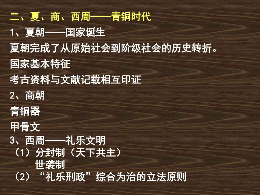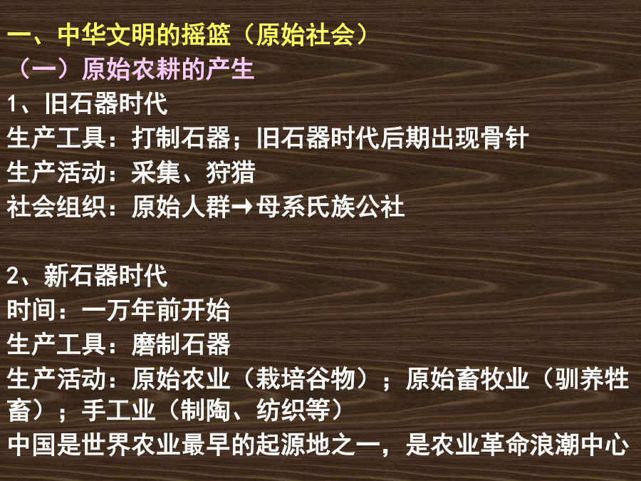 高三中国古代史知识纵向梳理一、中华文明的摇篮(原始社会)(一)原始农耕的产生1、旧石器时代生产工具:打制石器;旧石器时代后期出现骨针生产活动:采集、狩猎社会组织:原始人群→母系氏族公社2、新石器时代时间:一万年前开始生产工具:磨制石器生产活动:原始农业(栽培谷物);原始畜牧业(驯养牲畜);手工业(制陶、纺织等)中国是世界农业最早的起源地之一,是农业革命浪潮中心社会组织:母系氏族公社→父系氏族公社生活情况:定居——北方:凿穴而居→洞穴型居住类型南方:构木为巢→干栏型居住类型造成差异原因:南北气候等自然条件的差异姓氏——氏族社会阶段产生姓:母系氏族公社时根据母亲所在的族姓而取氏:父系氏族公社时期以所在地方的地名命名家族——在一夫一妻家庭基础上,出现由父系祖先繁衍而成的聚居血缘团体,加剧了氏族社会的解体(二)中华文明的起源1、部落联盟(军事民主制)的形成私有制产生→贫富分化→阶级产生部族间冲突激化→部落联盟形成→国家起源2、神话传说二、夏、商、西周——青铜时代1、夏朝——国家诞生夏朝完成了从原始社会到阶级社会的历史转折。国家基本特征考古资料与文献记载相互印证2、商朝青铜器甲骨文3、西周——礼乐文明(1)分封制(天下共主)世袭制(2)“礼乐刑政”综合为治的立法原则三、春秋战国——社会变革时期(社会转型)时间:公元前770-公元前221年经济:铁器时代政治:礼崩乐坏,列国纷争,分封制崩溃中华法系开始形成(战国《法经》)文化:思想——百家争鸣(儒、道、法等)儒家:孔子、孟子兵家:孙子兵法教育——孔子私人办学文学——屈原四、秦汉时期——大一统帝国的创建与巩固1、秦朝——中国历史上第一个中央集权的多民族国家政治:结束列国纷争,统一中国采用法家严刑峻法主张治理国家建立中央集权的政治制度(皇帝制、三公九卿、郡县制、军功爵制)——奠定中国古代政治体制的基本模式暴政引发农民起义,二世而亡民族:匈奴兴起,与匈奴战争文化:艺术——秦俑2、汉朝政治:中央集权制度的巩固地方:西汉-刺史巡查地方,监察区分13州;东汉以后州成为最高一级行政机构选官:实行察举制,根据品行和才学选用和提拔官员思想:汉武帝从“无为”转向“有为”,采纳董仲舒“罢黜百家,独尊儒术”的建议,儒学开始成为官方哲学统治者提倡“以孝治天下”经济:西汉初采用“黄老之术”,实行“无为而治”,休养生息民族:两汉与匈奴时战时和,经济交流密切公元初,匈奴分裂,南匈奴内迁,北匈奴西迁文化:西汉末年佛教传入五、三国两晋南北朝——国家的大分裂和民族大融合时期政治:选官——九品中正制民族:北方游牧民族内迁(鲜卑族等)文化:佛教盛行六、隋唐时期——繁荣昌盛政治:中央集权制度的完善(政治新格局)中央:三省六部制地方:道(监察区域,御史和节度使)、州、县三级制选官:科举制度法律:《唐律》、《唐律疏议》——中华法系成熟文化:艺术——敦煌莫高窟宗教——唐朝时,伊斯兰教传入七、五代辽宋夏金元——多元文化的碰撞与交融政治:中央集权制度加强元代中央设中书省,为明清两代沿用民族:蒙古帝国文化:宗教:回教逐渐形成科技:三大发明(印刷术、指南针、火药)的发展与传播思想:朱熹理学史学:《资治通鉴》八、明清时期——拓展与停滞(一)政治:(1)君主专制空前强化中央:明朝:废除中书省,改设内阁,由皇帝直接控制清朝:雍正设立军机处,成为处理朝政的枢纽机构重大军政事务完全由皇帝通过军机处处理地方:沿用行省制度选官:采用科举制度,明采用八股取士,清大兴文字狱(2)统一的多民族国家进一步巩固南方:康熙平定吴三桂为首的三藩之乱东南:康熙派施琅出兵台湾,郑成功孙子郑克塽归降北方(蒙古):平定准噶尔贵族叛乱康熙:率军亲征,收复内外蒙古(乌兰布通、昭莫多战役)乾隆:乘准部内乱,远征伊犁,平定了准噶尔分裂势力西南(西藏):确立册封达赖、班禅的制度,设驻藏大臣民族团结政策:精通、尊重和提倡汉文化(儒家文化),缓和满汉民族矛盾康熙、雍正和乾隆精通诗文书画康熙、乾隆六下江南,笼络汉族士大夫(拜祭明孝陵等)重视尊重少数民族的文化心理与风俗习惯修建避暑山庄,接见少数民族首领在清政府感召下,不堪沙俄压迫的蒙古土尔扈特部回到祖国(乾隆)扶持黄教,确立“金瓶掣签”制度,维护达赖和班禅在西藏政教中的地位,加强对西藏地区的管理(乾隆)(二)经济:人丁兴旺,经济繁荣番薯、玉米、马铃薯等高产作物的引进实行“圣世滋丁,永不加赋”的制度18世纪末以来,中国人口数达到3亿以上,位居世界前列市镇数量大幅增加,大城市数量居世界之冠经济实力和财政储备达到历史颠峰(19世纪初)18世纪中国是东亚、东南亚贸易的中心地区对西方贸易长期处于出超地位,生丝、茶叶和瓷器畅销世界19世纪20年代,中国国内生产总值(GDP)仍占世界总量1/4以上,居于世界第一位(三)对外关系:从开放走向闭关自守明清时期的对外关