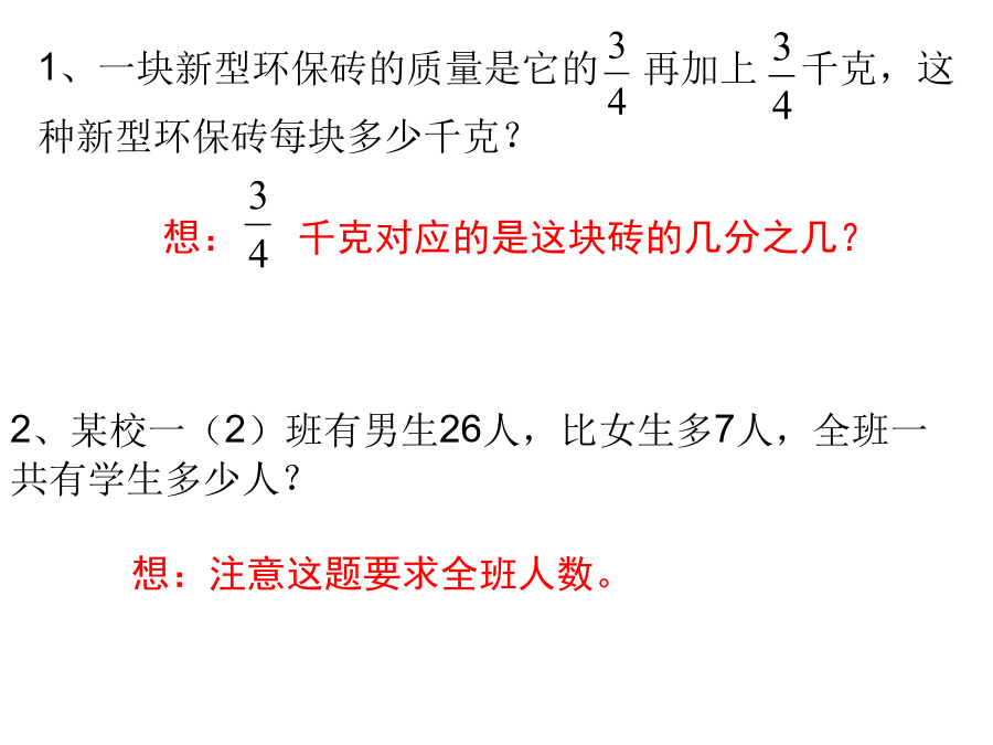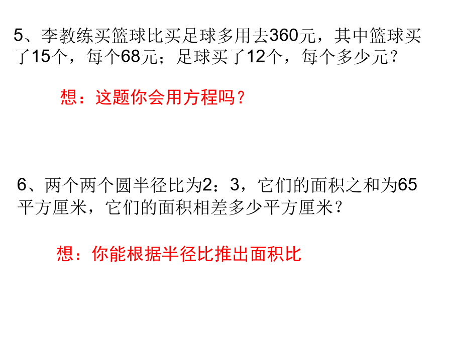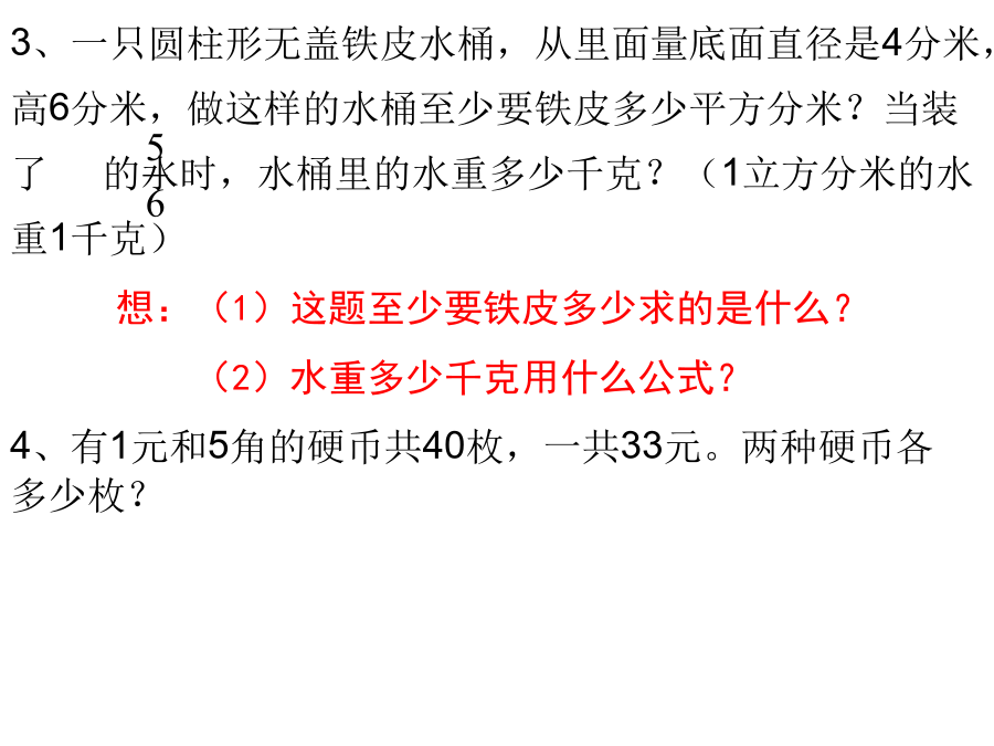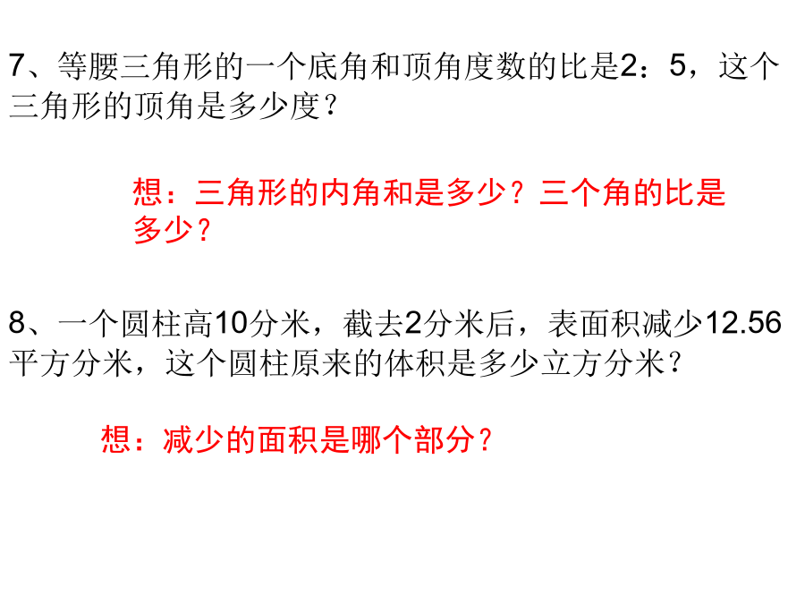 六年级综合练习21、一块新型环保砖的质量是它的再加上千克,这种新型环保砖每块多少千克?3、一只圆柱形无盖铁皮水桶,从里面量底面直径是4分米,高6分米,做这样的水桶至少要铁皮多少平方分米?当装了的水时,水桶里的水重多少千克?(1立方分米的水重1千克)5、李教练买篮球比买足球多用去360元,其中篮球买了15个,每个68元;足球买了12个,每个多少元?7、等腰三角形的一个底角和顶角度数的比是2:5,这个三角形的顶角是多少度?9、某钢铁厂三月份用电480千瓦时,比二月份节约了25%。节约了多少千瓦时?9.75-3.42-5.5812.5×0.25×3.211、小刚看一本的故事书,第一天看了全书的,第二天看了余下的40%,第三天应从第几页看起?13、修一条公路,计划每天修180米,16天可以完成,实际每天修240米,可提前几天完成?15、学校用地砖铺会议室地面。用每块面积是9平方分米的地砖,需要320块才能铺满;如果改用边长是4分米的正方形地砖,需要多少块才能铺满?17、如右图,把长方形分成一个三角形和一个梯形,已知梯形的面积比三角形的面积多6平方厘米,图中线段AB的长是多少厘米?19、小红、小兰和小琴三人买文具情况如下表:20、有A、B两个容器,如图先把A容器装满水,然后倒入B容器中,B容器中水的深度是多少分米?22、东山幼儿园新买150本图书,其中的40%分给大班,剩下的图书按4∶5分给小班和中班,小班和中班各分到多少本?24、蓝猫上午8:30从家出发,到离家12千米的外婆家去玩。在10:30时,他走了全程的。如果他还按照这样的速度走,你认为他在14:00之前能走到外婆家吗?26、据科学资料显示,儿童负重最好不要超过体重的,如果长期背负过重物体,将不利于身体发育。小川的体重是30千克,书包重5千克,请你算一算:小川的书包超重了吗?28、有一杯水,盐和水的比是1∶10,再放入2克盐,新盐水重35克,求原来盐水中盐和水各多少克?30、用弹簧秤称物品时,所称物品的质量与弹簧的长度的变化如图所示:31、下图1中圆和长方形面积相等,圆的半径等于长方形的宽。阴影部分面积是60cm2,圆的面积是()cm2。33、育才小学测量小组要测量一棵树的高度,量得树的影长是8.4米,附近有一根2米的标杆,它的影长是1.2米。这棵树高多少米?35、三角形的面积是10平方厘米,圆的面积是多少平方厘米?37、某校参加数学竞赛的男生与女生的人数比是6:5,后来又增加了5名女生,这时女生人数是男生人数的。原来参加数学竞赛的女生有多少人?39、某车间加工服装,上半月完成了全月计划的49%,下半月完成了488件,结果超过原计划的10%。计划加工服装多少件?41、把一个长方形的操场画在比例尺是1:5000的图纸上,长是3.6厘米,宽是1.2厘米。操场的实际面积是多少平方米?43、“红领巾”文学社到扬州瘦西湖采风,汽车从学校出发,小时行了全程的,这时距离瘦西湖还有4千米,学校到瘦西湖的路程是多少千米?45、一个圆锥形沙堆,底面周长12.56米,高4.8米,把这堆沙铺在10米宽的公路上,铺2厘米厚,能铺几米长的公路?47、用一根长24厘米的铁丝围成一个直角三角形,三条边的比是3:4:5,这个三角形的面积是多少?