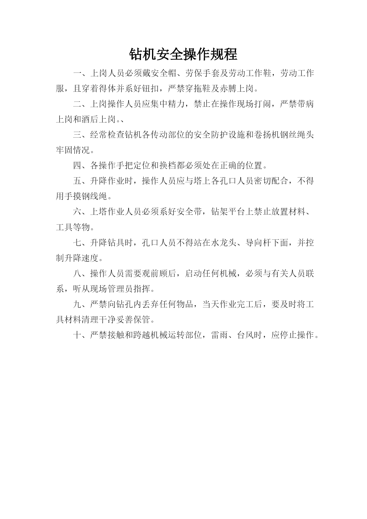 广西XX核电厂混凝土用骨料、海工用料料源勘测工程钻机安全操作规程编制:审核:批准:编写单位:XXXx编写日期:2012年7月15日钻机安全操作规程一、上岗人员必须戴安全帽、劳保手套及劳动工作鞋,劳动工作服,且穿着得体并系好钮扣,严禁穿拖鞋及赤膊上岗。二、上岗操作人员应集中精力,禁止在操作现场打闹,严禁带病上岗和酒后上岗。、三、经常检查钻机各传动部位的安全防护设施和卷扬机钢丝绳头牢固情况。四、各操作手把定位和换档都必须处在正确的位置。五、升降作业时,操作人员应与塔上各孔口人员密切配合,不得用手摸钢线绳。六、上塔作业人员必须系好安全带,钻架平台上禁止放置材料、工具等物。七、升降钻具时,孔口人员不得站在水龙头、导向杆下面,并控制升降速度。八、操作人员需要观前顾后,启动任何机械,必须与有关人员联系,听从现场管理员指挥。九、严禁向钻孔内丢弃任何物品,当天作业完工后,要及时将工具材料清理干净妥善保管。十、严禁接触和跨越机械运转部位,雷雨、台风时,应停止操作。
