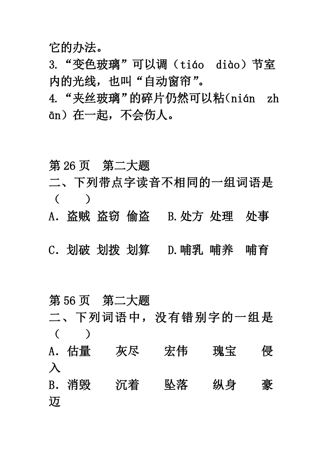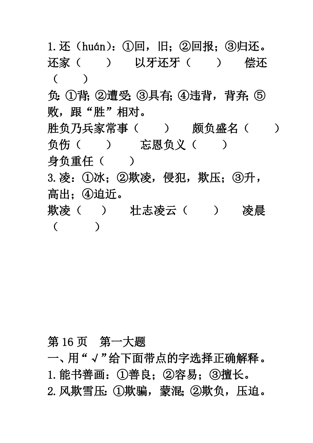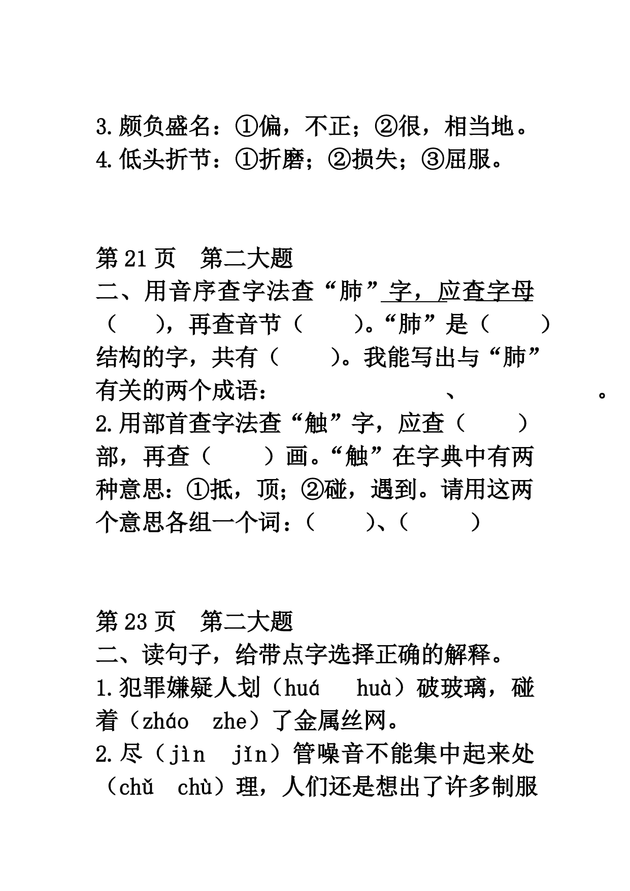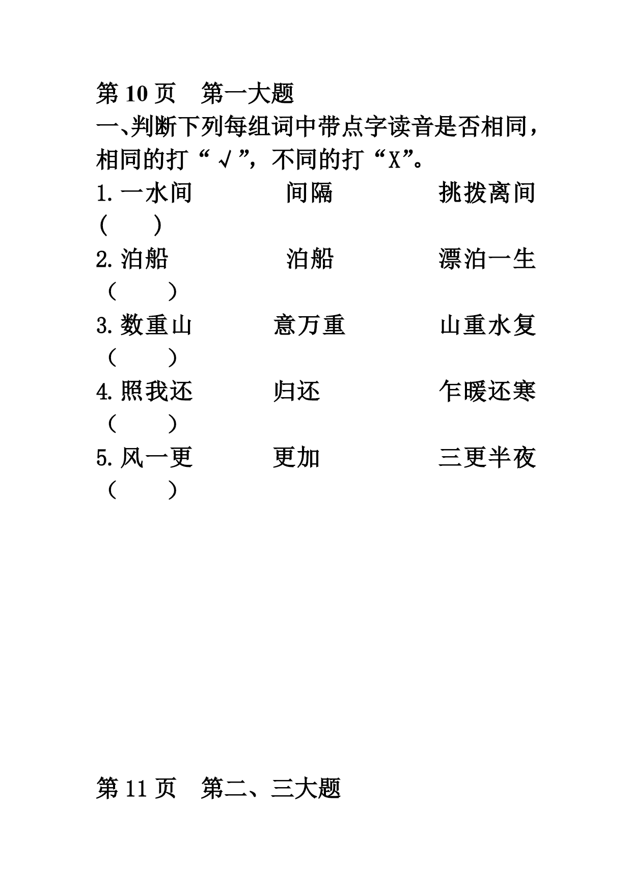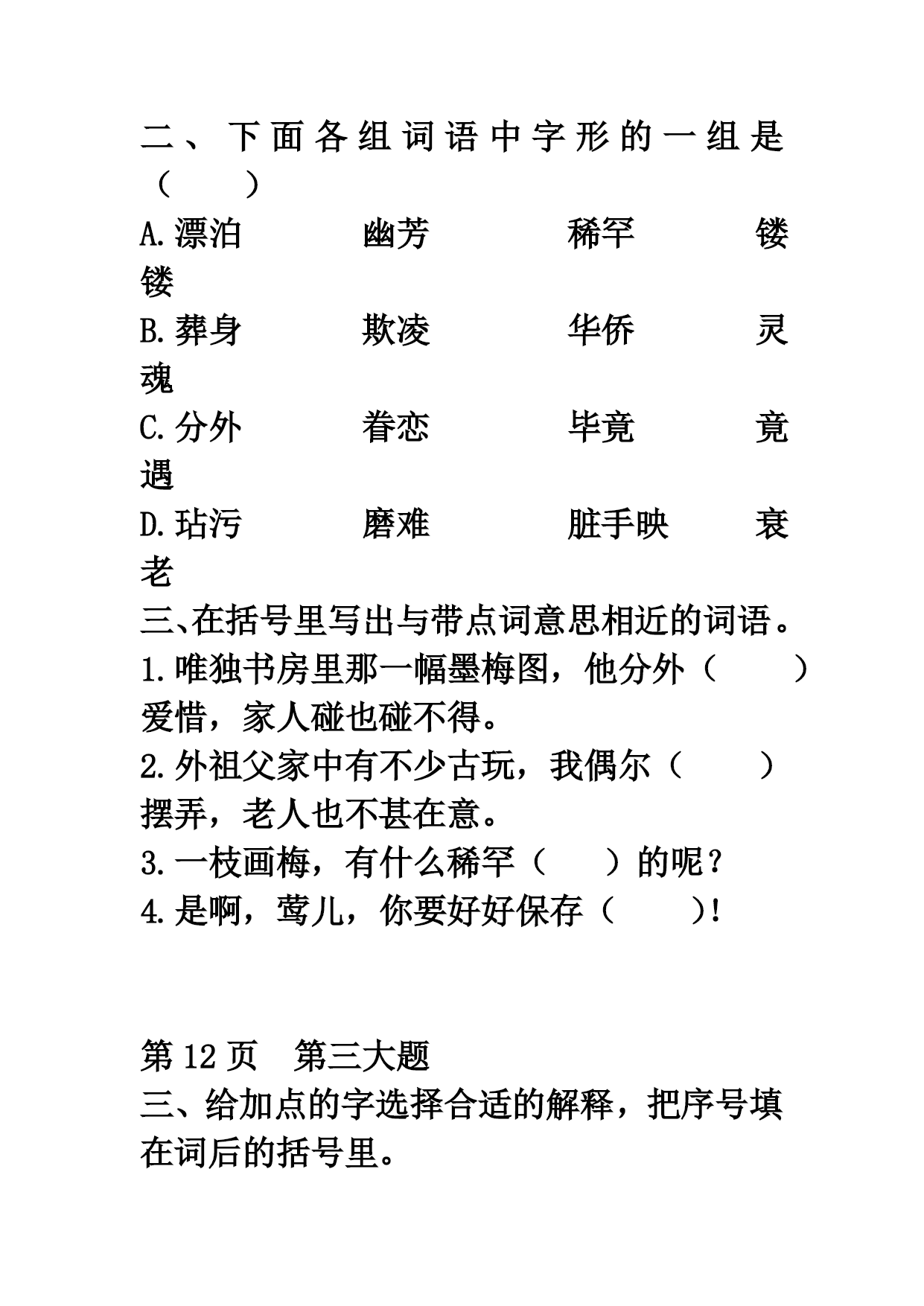 第一大题一、判断下列每组词中带点字读音是否相同,相同的打“√”,不同的打“X”。1.一水间间隔挑拨离间()2.泊船泊船漂泊一生()3.数重山意万重山重水复()4.照我还归还乍暖还寒()5.风一更更加三更半夜()第二、三大题二、下面各组词语中字形的一组是()A.漂泊幽芳稀罕镂镂B.葬身欺凌华侨灵魂C.分外眷恋毕竟竟遇D.玷污磨难脏手映衰老三、在括号里写出与带点词意思相近的词语。1.唯独书房里那一幅墨梅图,他分外()爱惜,家人碰也碰不得。2.外祖父家中有不少古玩,我偶尔()摆弄,老人也不甚在意。3.一枝画梅,有什么稀罕()的呢?4.是啊,莺儿,你要好好保存()!第三大题三、给加点的字选择合适的解释,把序号填在词后的括号里。1.还(huán):①回,旧;②回报;③归还。还家()以牙还牙()偿还()负:①背;②遭受;③具有;④违背,背弃;⑤败,跟“胜”相对。胜负乃兵家常事()颇负盛名()负伤()忘恩负义()身负重任()3.凌:①冰;②欺凌,侵犯,欺压;③升,高出;④迫近。欺凌()壮志凌云()凌晨()第一大题一、用“√”给下面带点的字选择正确解释。1.能书善画:①善良;②容易;③擅长。2.风欺雪压:①欺骗,蒙混;②欺负,压迫。3.颇负盛名:①偏,不正;②很,相当地。4.低头折节:①折磨;②损失;③屈服。第二大题二、用音序查字法查“肺”字,应查字母(),再查音节()。“肺”是()结构的字,共有()。我能写出与“肺”有关的两个成语:、。2.用部首查字法查“触”字,应查()部,再查()画。“触”在字典中有两种意思:①抵,顶;②碰,遇到。请用这两个意思各组一个词:()、()第二大题二、读句子,给带点字选择正确的解释。1.犯罪嫌疑人划(huáhuà)破玻璃,碰着(zháozhe)了金属丝网。2.尽(jìnjǐn)管噪音不能集中起来处(chǔchù)理,人们还是想出了许多制服它的办法。3.“变色玻璃”可以调(tiáodiào)节室内的光线,也叫“自动窗帘”。4.“夹丝玻璃”的碎片仍然可以粘(niánzhān)在一起,不会伤人。第二大题二、下列带点字读音不相同的一组词语是()A.盗贼盗窃偷盗B.处方处理处事C.划破划拨划算D.哺乳哺养哺育第二大题二、下列词语中,没有错别字的一组是()A.估量灰尽宏伟瑰宝侵入B.消毁沉着坠落纵身豪迈C.跳望仇恨崎岖进犯殿堂D.瑶台挑剔玲珑蓬莱瞄准第一大题一、用“√”给下列加点的字选择正确的读音。闽(mínmǐn)南诸(zhūzhé)位停泊(bópō)血泊(bópō)起劲(jìnjìng)刚劲(jìnjìng)空(kōngkòng)位空(kōngkòng)间更(gēnggèng)多更(gēnggèng)衣