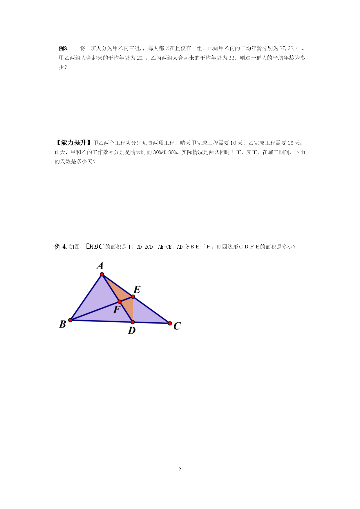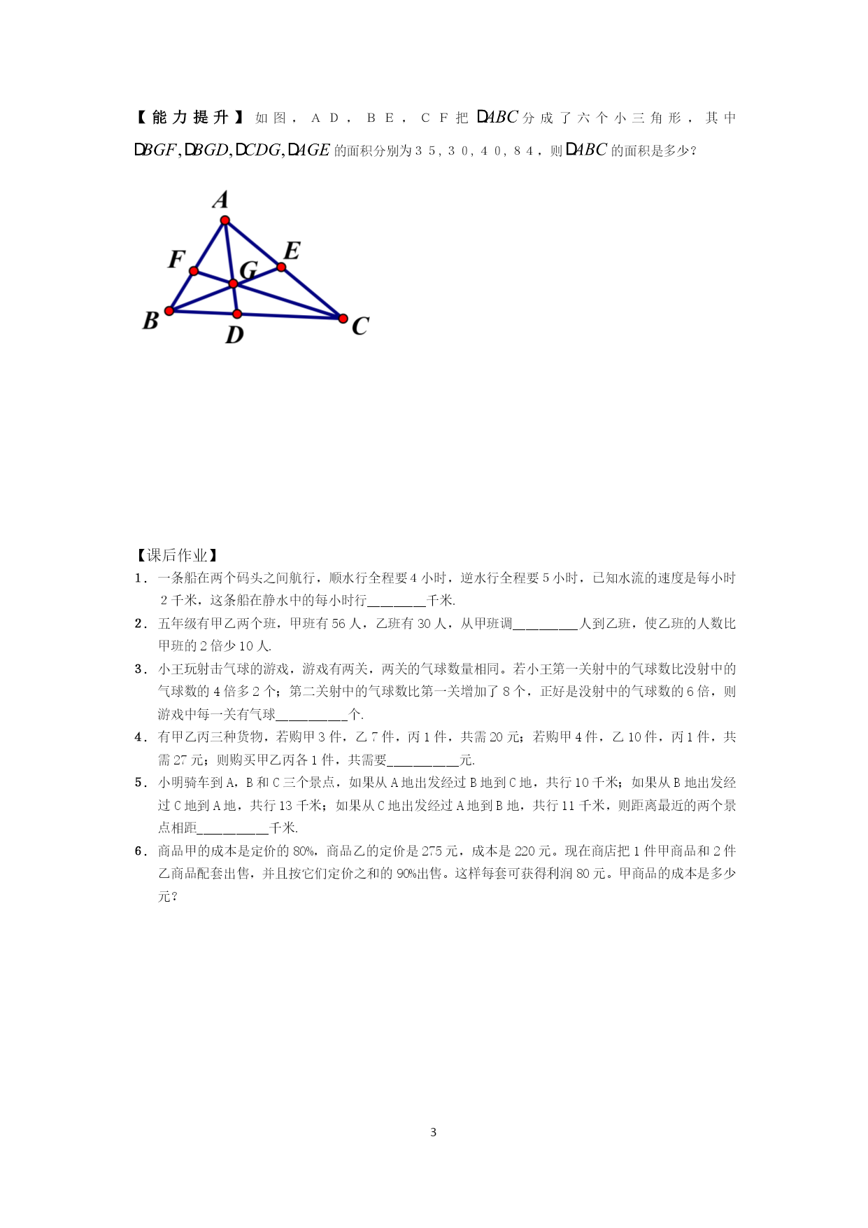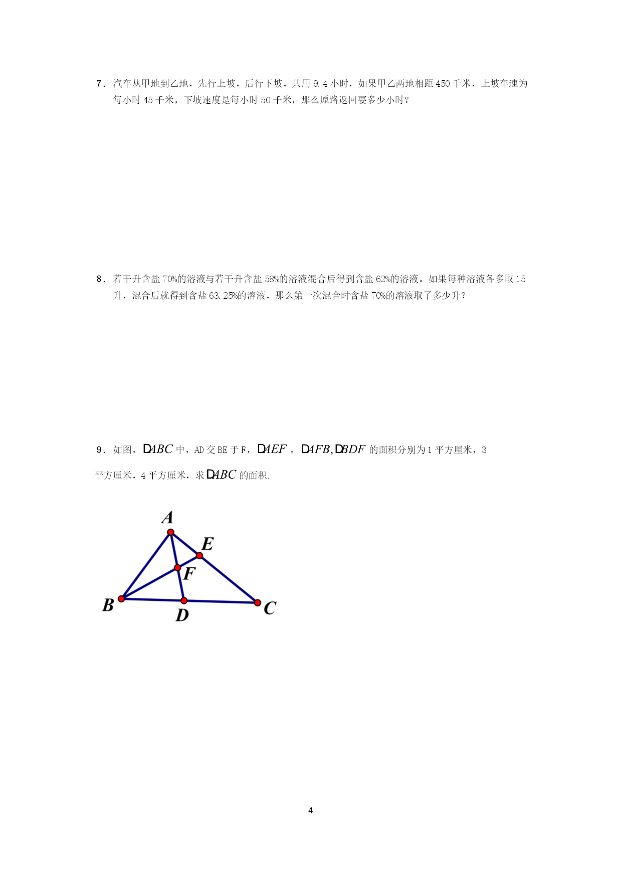PAGE\*MERGEFORMAT4应用题专题五列方程或方程组解应用题知识要点:列方程或方程组解应用题的一般步骤:审题,设未知数,找出等量关系列方程或方程组用一根绳子测量井台到井水面的深度,把绳子对折后垂下到井水面,绳子超过井台9米;把绳子三折后垂到水面,绳子超过井台2米,求绳子的长度和井的深度.【能力提升】小王买回一箱梨子,如果每天吃4个,则多出48个;如果每天吃6个,又少8个梨子.小王家买回多少个梨子?计划吃多少天?一辆汽车在上坡路上行驶的速度是每小时40千米,在下坡路上行驶的速度是每小时50千米,在平路上行驶的速度是每小时45千米.某日这辆汽车从甲地开往乙地,先是用了的时间走上坡路,然后用了的时间走下坡路,最后用了的时间走平路.已知汽车从乙地按原路返回甲地时,比从甲地开往乙地所用的时间多15分钟,求甲乙两地的距离。【能力提升】甲乙两车先后以相同的速度从A站出发,10点整甲车距A站的距离是乙车距A站距离的3倍,10时10分甲车距A站的距离是乙车距A站距离的2倍,甲车是何时从A站出发的?将一班人分为甲乙丙三组,,每人都必在且仅在一组。已知甲乙丙的平均年龄分别为37,23,41。甲乙两组人合起来的平均年龄为29,;乙丙两组人合起来的平均年龄为33,则这一群人的平均年龄为多少?【能力提升】甲乙两个工程队分别负责两项工程,晴天甲完成工程需要10天,乙完成工程需要16天;雨天,甲和乙的工作效率分别是晴天时的30%和80%。实际情况是两队同时开工、完工。在施工期间,下雨的天数是多少天?例4.如图,的面积是1,BD=2CD,AE=CE,AD交BE于F,则四边形CDFE的面积是多少?【能力提升】如图,AD,BE,CF把分成了六个小三角形,其中的面积分别为35,30,40,84,则的面积是多少?【课后作业】一条船在两个码头之间航行,顺水行全程要4小时,逆水行全程要5小时,已知水流的速度是每小时2千米,这条船在静水中的每小时行_________千米.五年级有甲乙两个班,甲班有56人,乙班有30人,从甲班调__________人到乙班,使乙班的人数比甲班的2倍少10人.小王玩射击气球的游戏,游戏有两关,两关的气球数量相同。若小王第一关射中的气球数比没射中的气球数的4倍多2个;第二关射中的气球数比第一关增加了8个,正好是没射中的气球数的6倍,则游戏中每一关有气球___________个.有甲乙丙三种货物,若购甲3件,乙7件,丙1件,共需20元;若购甲4件,乙10件,丙1件,共需27元;则购买甲乙丙各1件,共需要___________元.小明骑车到A,B和C三个景点,如果从A地出发经过B地到C地,共行10千米;如果从B地出发经过C地到A地,共行13千米;如果从C地出发经过A地到B地,共行11千米,则距离最近的两个景点相距___________千米.商品甲的成本是定价的80%,商品乙的定价是275元,成本是220元。现在商店把1件甲商品和2件乙商品配套出售,并且按它们定价之和的90%出售。这样每套可获得利润80元。甲商品的成本是多少元?汽车从甲地到乙地,先行上坡,后行下坡,共用9.4小时,如果甲乙两地相距450千米,上坡车速为每小时45千米,下坡速度是每小时50千米,那么原路返回要多少小时?若干升含盐70%的溶液与若干升含盐58%的溶液混合后得到含盐62%的溶液。如果每种溶液各多取15升,混合后就得到含盐63.25%的溶液,那么第一次混合时含盐70%的溶液取了多少升?如图,中,AD交BE于F,,的面积分别为1平方厘米,3平方厘米,4平方厘米,求的面积.