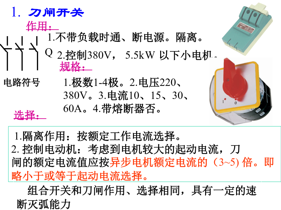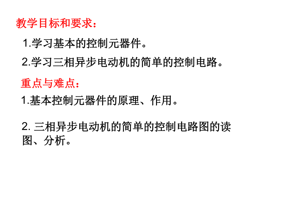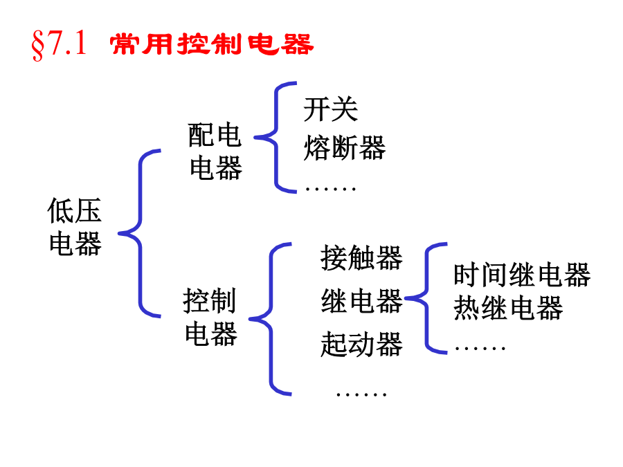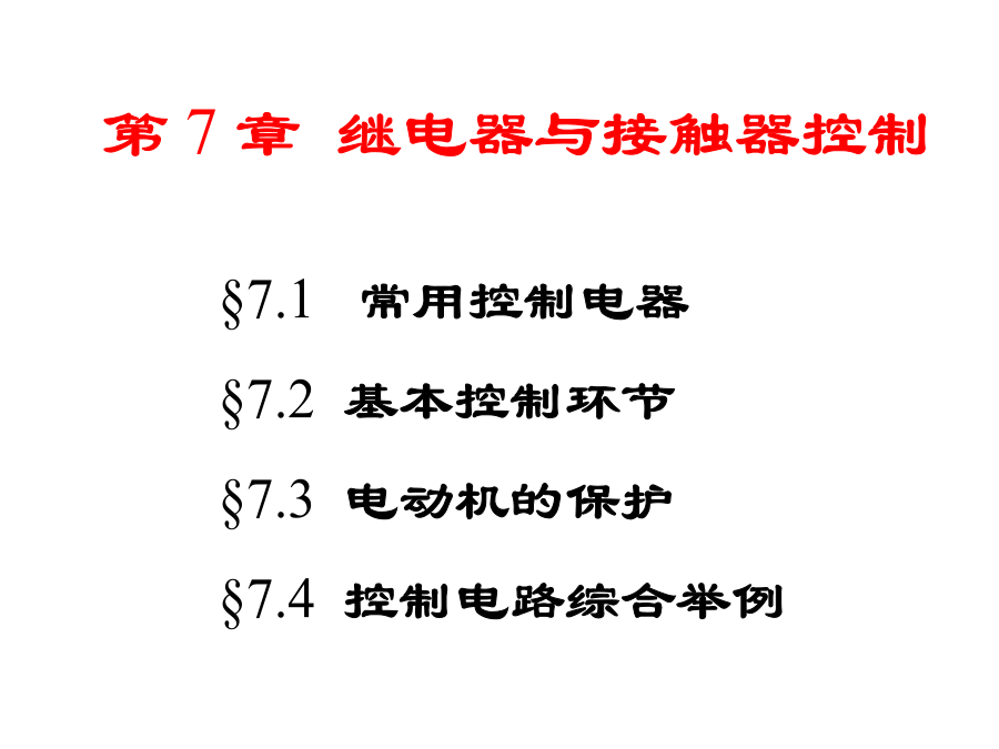 第7章电气自动控制第7章继电器与接触器控制教学目标和要求:低压电器1.刀闸开关常用的有:作用:用于短路保护。作用:可实现短路、过载、失压保护。有强大的灭弧功能,可以分断短路时的巨大电流。且可以重复动作,基本替代了熔断器和刀闸的保护隔离作用。4.按钮复合按钮5.行程开关接触器有关符号:简单的接触器控制7.中间继电器发热元件热继电器的符号电机起动、停车(点动、连续运行、多地点控制、顺序控制等)7.2.1异步机的直接起动二、电动机连续运行KM例如:甲、乙两地同时控制一台电机。Q以下控制电路能否实现既能点动、又能连续运行电动机保护的类型:7.3.2短路保护KM7.4.1电机的正反转控制电机的正反转控制—加互锁KMF7.4.2顺序控制电路:两电机保证M1先起动、M2先停车的顺序,反之则不动作。#1电机不可以!两电机各自要有独立的电源;这样接,主触头(KM1)的负荷过重。7.4.3行程控制行程控制电路(1)行程控制(2)--自动往复运动时间继电器定时类型:a)通电延时继电器通电延时的空气式时间继电器结构示意图时间继电器触头类型KM第7章结束