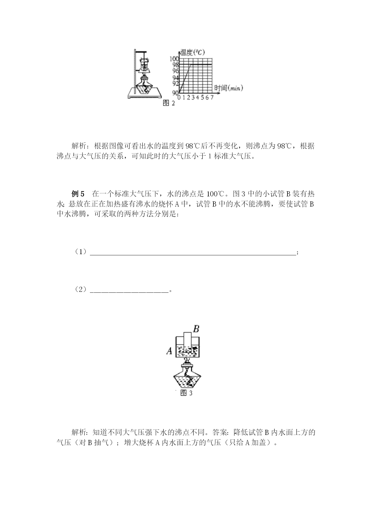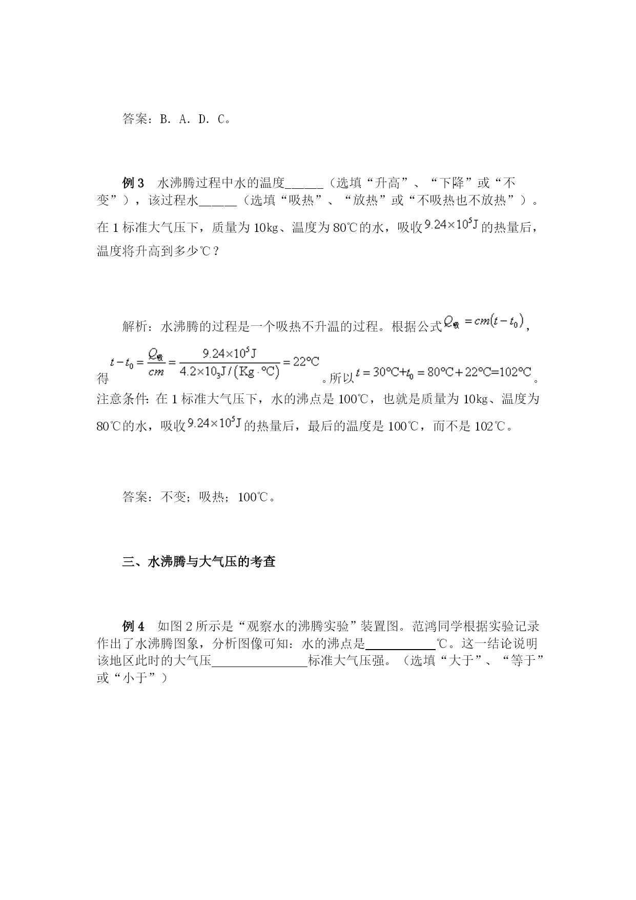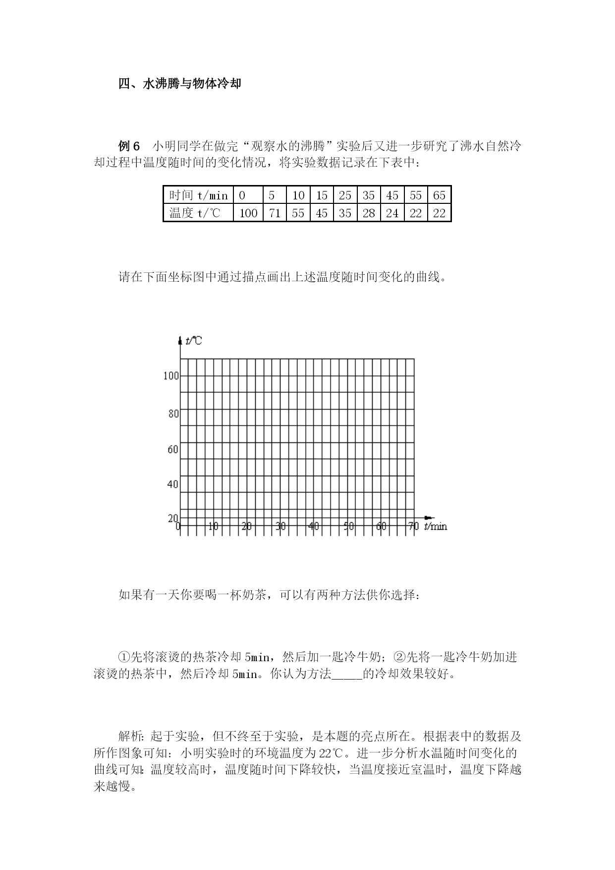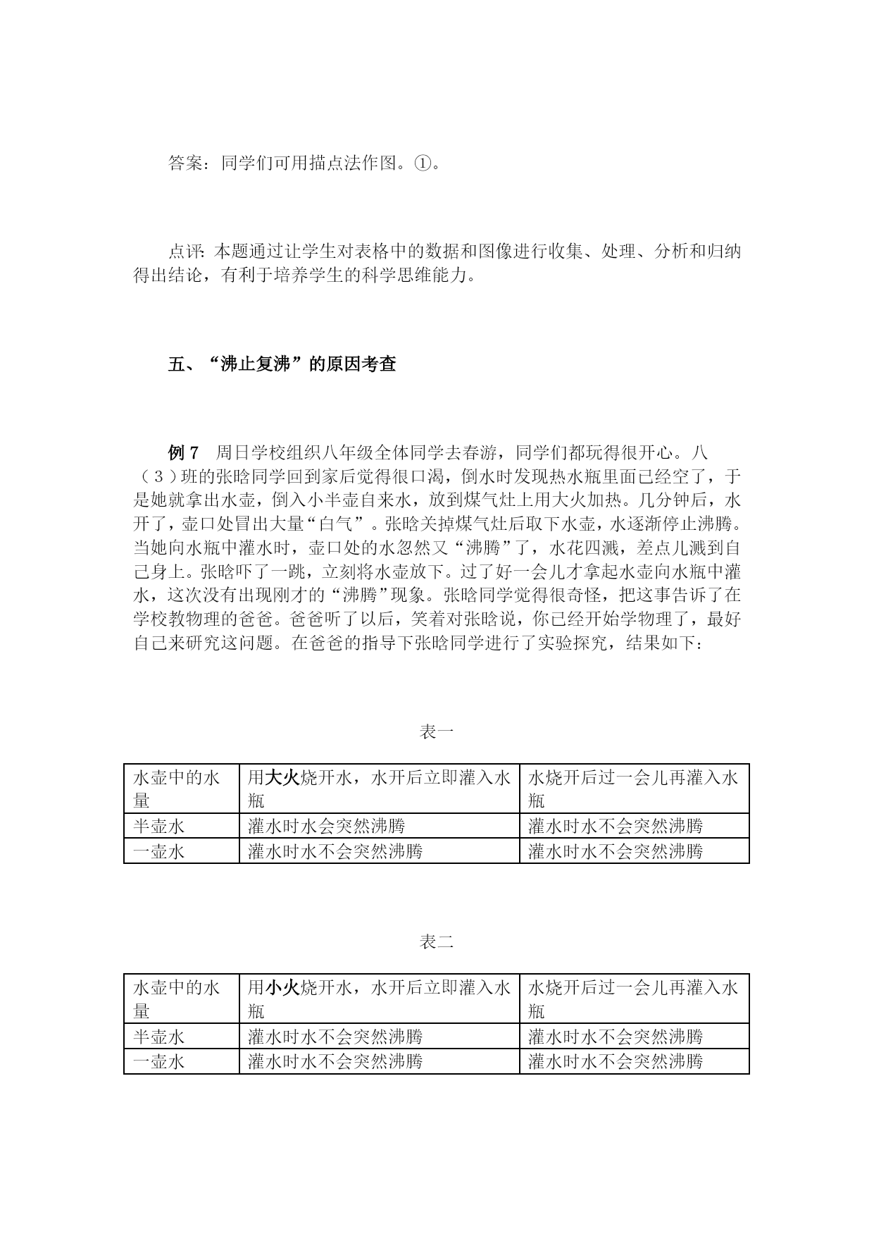 复习,决不是旧知识的简单再现和机械重复,而是知识的“升华”过程,它是温故基础上的“知新”。系统化的复习知识,把相关知识进行归类,有利于我们对某一知识点较为全面的把握,提高我们的中考成绩。一、水沸腾实验的注意点例1在“观察水的沸腾”的实验中,实验时烧杯中要加适量的温水,且在烧杯上加纸盖,这样做的目的是什么?答:加温水是为了使起始温度较高,可以尽快沸腾,也节约能源。加盖也一样,尽量减少热量散失,另外可避免水沸腾后溅出烧杯,误伤人。二、水沸腾特点的考查例2如图1所示是水在沸腾前后连续加热过程中出现的四个现象,请按它出现的顺序排列起来__________。解析:此题考查的是观察记忆能力。主要的是抓气泡特点及剧烈程度。烧杯里的水沸腾前,水温不断升高,当水温升高到一定程度,会产生少量气泡不断上升,由于上部水温较下部低,因此上升过程中气泡的体积不断减小,到达水面前消失。沸腾时,水中发生剧烈的汽化现象,形成大量的气泡,上升、变大,到水面破裂开来,把里面的水蒸气释放到空气中。根据观察到的沸腾现象找出规律,此题便迎刃而解。答案:B.A.D.C。例3水沸腾过程中水的温度______(选填“升高”、“下降”或“不变”),该过程水______(选填“吸热”、“放热”或“不吸热也不放热”)。在1标准大气压下,质量为10㎏、温度为80℃的水,吸收的热量后,温度将升高到多少℃?解析:水沸腾的过程是一个吸热不升温的过程。根据公式,得。所以。注意条件:在1标准大气压下,水的沸点是100℃,也就是质量为10㎏、温度为80℃的水,吸收的热量后,最后的温度是100℃,而不是102℃。答案:不变;吸热;100℃。三、水沸腾与大气压的考查例4如图2所示是“观察水的沸腾实验”装置图。范鸿同学根据实验记录作出了水沸腾图象,分析图像可知:水的沸点是℃。这一结论说明该地区此时的大气压标准大气压强。(选填“大于”、“等于”或“小于”)解析:根据图像可看出水的温度到98℃后不再变化,则沸点为98℃,根据沸点与大气压的关系,可知此时的大气压小于1标准大气压。例5在一个标准大气压下,水的沸点是100℃。图3中的小试管B装有热水;悬放在正在加热盛有沸水的烧怀A中,试管B中的水不能沸腾,要使试管B中水沸腾,可采取的两种方法分别是:(1);(2)_____________________。解析:知道不同大气压强下水的沸点不同。答案:降低试管B内水面上方的气压(对B抽气);增大烧杯A内水面上方的气压(只给A加盖)。四、水沸腾与物体冷却例6小明同学在做完“观察水的沸腾”实验后又进一步研究了沸水自然冷却过程中温度随时间的变化情况,将实验数据记录在下表中:时间t/min0510152535455565温度t/℃1007155453528242222请在下面坐标图中通过描点画出上述温度随时间变化的曲线。如果有一天你要喝一杯奶茶,可以有两种方法供你选择:①先将滚烫的热茶冷却5min,然后加一匙冷牛奶;②先将一匙冷牛奶加进滚烫的热茶中,然后冷却5min。你认为方法_____的冷却效果较好。解析:起于实验,但不终至于实验,是本题的亮点所在。根据表中的数据及所作图象可知:小明实验时的环境温度为22℃。进一步分析水温随时间变化的曲线可知:温度较高时,温度随时间下降较快,当温度接近室温时,温度下降越来越慢。答案:同学们可用描点法作图。①。点评:本题通过让学生对表格中的数据和图像进行收集、处理、分析和归纳得出结论,有利于培养学生的科学思维能力。五、“沸止复沸”的原因考查例7周日学校组织八年级全体同学去春游,同学们都玩得很开心。八(3)班的张晗同学回到家后觉得很口渴,倒水时发现热水瓶里面已经空了,于是她就拿出水壶,倒入小半壶自来水,放到煤气灶上用大火加热。几分钟后,水开了,壶口处冒出大量“白气”。张晗关掉煤气灶后取下水壶,水逐渐停止沸腾。当她向水瓶中灌水时,壶口处的水忽然又“沸腾”了,水花四溅,差点儿溅到自己身上。张晗吓了一跳,立刻将水壶放下。过了好一会儿才拿起水壶向水瓶中灌水,这次没有出现刚才的“沸腾”现象。张晗同学觉得很奇怪,把这事告诉了在学校教物理的爸爸。爸爸听了以后,笑着对张晗说,你已经开始学物理了,最好自己来研究这问题。在爸爸的指导下张晗同学进行了实验探究,结果如下:表一水壶中的水量用大火烧开水,水开后立即灌入水瓶水烧开后过一会儿再灌入水瓶半壶水灌水时水会突然沸腾灌水时水不会突然沸腾一壶水灌水时水不会突然沸腾灌水时水不会突然沸腾表二水壶中的水量用小火烧开水,水开后立即灌入水瓶水烧开后过一会儿再灌入水瓶半壶水灌水时水不会突然沸腾灌水时水不会突然沸腾一壶水灌水时水不会突然沸腾灌水时水不会突然沸腾发现原来已经不沸腾的水发生突然沸腾的现象只有在同时满足以下条件时才会出现:⑴水量比较少(半壶水);⑵用大火烧开水,水开后