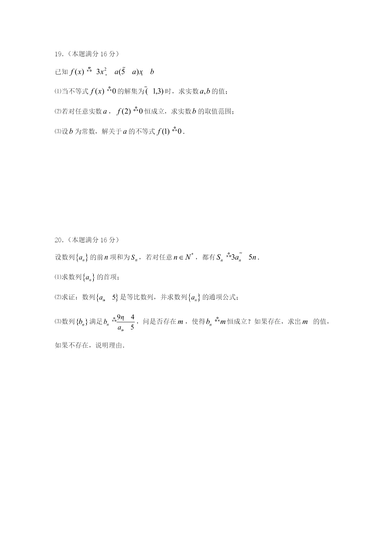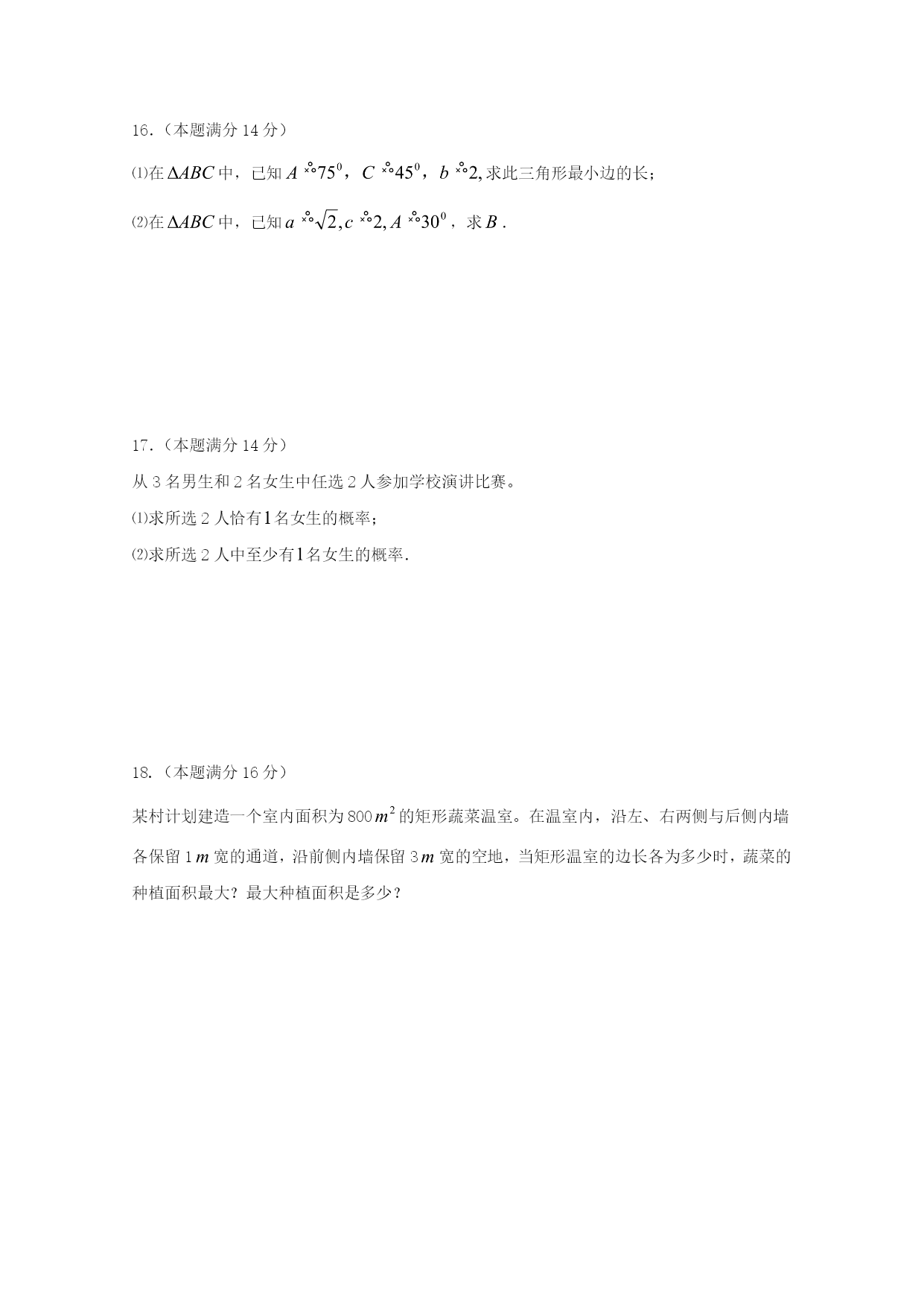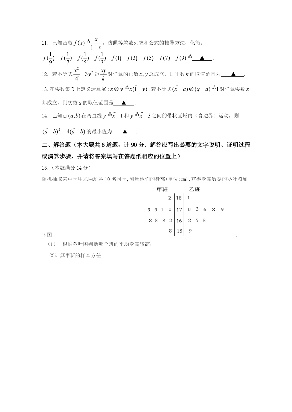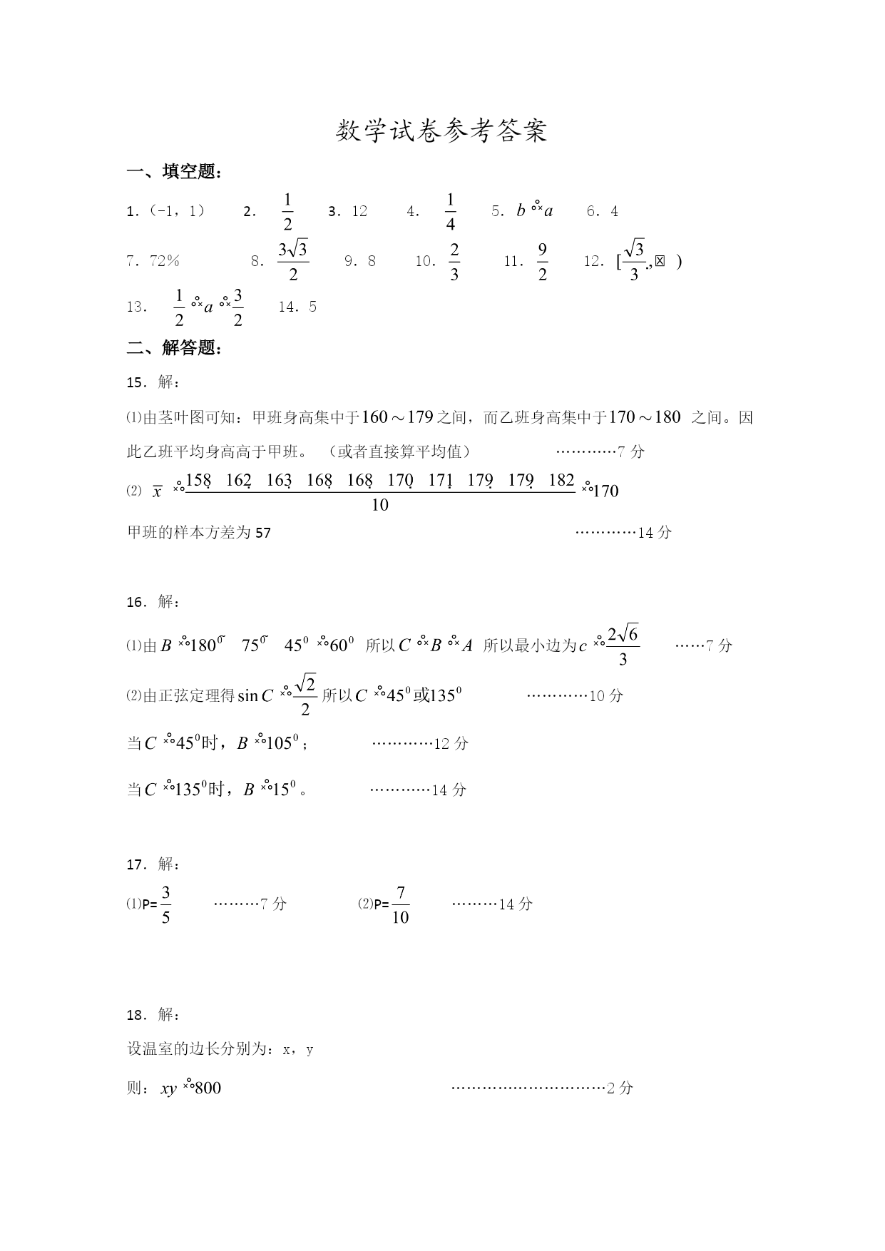 高一下数学试题一、填空题(本大题共14小题,每小题5分,共70分)1.不等式的解集为▲.2.函数最小值是▲.3.已知数列的前n项和,则▲.4.在中,,则最大角的余弦值是▲.5.已知则与的大小关系为▲.6.执行下面的程序框图,输出的▲.0.0240.0120.0080.0040.002频率/组距o20406080100分数/分(第7题图)7.下图是一次考试结果的频率分布直方图,若规定60分以上(含60)为考试合格,则这次考试的合格率为▲.(第6题图)8.在中,若,则的面积是▲.9.已知实数满足约束条件则的最大值为▲.10.点为周长等于3的圆周上的一个定点,若在该圆周上随机取一点,则劣弧的长度小于1的概率为▲.11.已知函数,仿照等差数列求和公式的推导方法,化简:▲.12.若不等式≥对任意的正数总成立,则正数的取值范围为▲.13.在实数集R上定义运算,若不等式对任意实数都成立,则实数的取值范围是▲.14.已知点在两直线和之间的带状区域内(含边界)运动,则的最小值为▲.二、解答题(本大题共6道题,计90分.解答应写出必要的文字说明、证明过程或演算步骤,并请将答案填写在答题纸相应的位置上)15.(本题满分14分)随机抽取某中学甲乙两班各10名同学,测量他们的身高(单位:cm),获得身高数据的茎叶图如下图.根据茎叶图判断哪个班的平均身高较高;⑵计算甲班的样本方差.16.(本题满分14分)⑴在中,已知求此三角形最小边的长;⑵在中,已知,求.17.(本题满分14分)从3名男生和2名女生中任选2人参加学校演讲比赛。⑴求所选2人恰有名女生的概率;⑵求所选2人中至少有名女生的概率.18.(本题满分16分)某村计划建造一个室内面积为800的矩形蔬菜温室。在温室内,沿左、右两侧与后侧内墙各保留1宽的通道,沿前侧内墙保留3宽的空地,当矩形温室的边长各为多少时,蔬菜的种植面积最大?最大种植面积是多少?19.(本题满分16分)已知⑴当不等式的解集为时,求实数的值;⑵若对任意实数,恒成立,求实数的取值范围;⑶设为常数,解关于的不等式.20.(本题满分16分)设数列的前项和为,若对任意,都有.⑴求数列的首项;⑵求证:数列是等比数列,并求数列的通项公式;⑶数列满足,问是否存在,使得恒成立?如果存在,求出的值,如果不存在,说明理由.数学试卷参考答案一、填空题:1.(-1,1)2.3.124.5.6.47.72%8.9.810.11.12.13.14.5二、解答题:15.解:⑴由茎叶图可知:甲班身高集中于之间,而乙班身高集中于之间。因此乙班平均身高高于甲班。(或者直接算平均值)…………7分⑵甲班的样本方差为57…………14分16.解:⑴由所以所以最小边为……7分⑵由正弦定理得所以…………10分当;…………12分当。…………14分17.解:⑴P=………7分⑵P=………14分18.解:设温室的边长分别为:x,y则:…………………………2分…………………………4分+8…………………………8分∵∴≥2当且仅当时,即等号成立∴的最大值为648……………………………14分此时,最大的种植面积为648m2…………………………16分19.解:⑴即∴∴∴或(若用根与系数关系也算对)……………………4分⑵,即即…………6分∴恒成立…………………………10分⑶即,∴△=10当即时,…………………………………12分20当即时,解集为}………………………14分30当即时,解集为{或}……16分20.解:⑴∵∴……………………………3分⑵∵∴(≥2)∴………………………………5分∴∴(为常数)(≥2)∴数列是以为公比的等比数列…………………………………7分∴…………………………………10分⑶∵∴∴………………………………12分………………………………14分∴当≥3时,<1;当=2时,>1∴当2时,有最大值∴…………………………………15分∴…………………………………16分