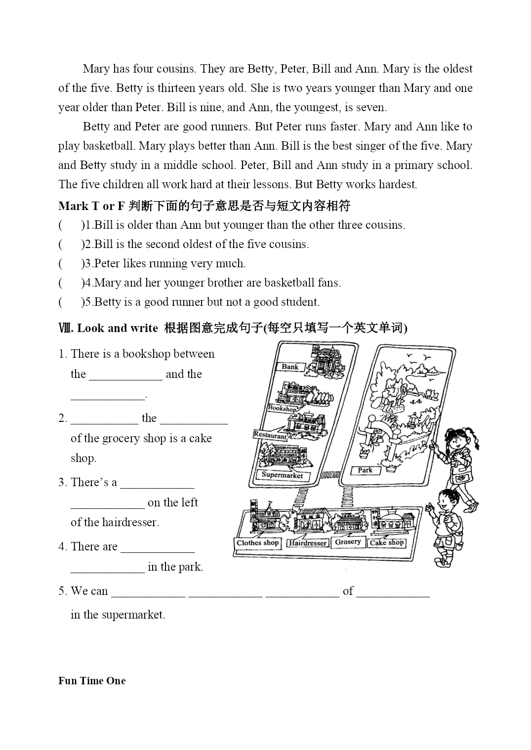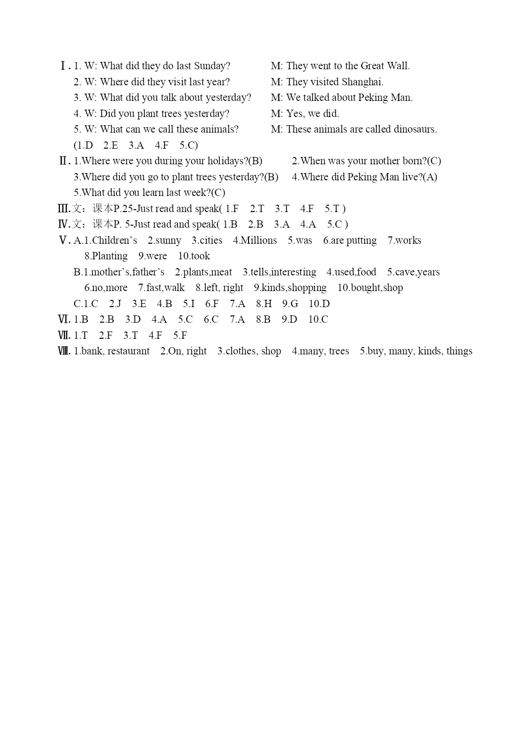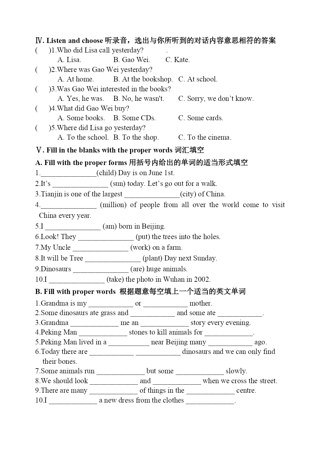 南开区2011-2012学年度第二学期学习水平测试六年级英语FunTimeOneⅠ.Look,listenandchoose听录音,选出与你所听到的对话意思相符的图片ABCDEF1._____2._____3._____4._____5._____Ⅱ.Listenandchoose选出你所听到的问题的正确答语()1.A.Itwaswonderful.B.Iwasathome.C.Kunmingisbeautiful.()2.A.IwasbornonJanuary1st,1992.B.HewasbornonOctober2nd,1960.C.ShewasbornonMarch8th,1962.()3.A.Iwenttoplanttreesyesterdaymorning.B.Iwenttoplanttreesinthepark.C.Iwenttoplanttreeswithmyclassmates.()4.A.Helivedinbigcaves.B.Hemadefiretocook.C.Heusedstonestokillanimalsforfood.()5.A.Shetoldusaboutsomeinterestinganimals.B.Wetalkedaboutsomeinterestinganimals.C.Welearnedaboutsomeinterestinganimals.Ⅲ.ListenandmarkTorF判断下面的句子意思是否与你所听到的内容相符()1.LisamovedtoLily’sneighbourhoodlastmonth.()2.LisaishappytoseeLilyinfrontofSunBuilding.()3.Lilywantstogotothepostoffice,butshedoesn’tknowtheway.()4.Lisadoesn’ttellLilyhowtogettothepostoffice.()5.Thepostofficeisinthegreenbuilding.Ⅳ.Listenandchoose听录音,选出与你所听到的对话内容意思相符的答案()1.WhodidLisacallyesterday?.A.Lisa.B.GaoWei.C.Kate.()2.WherewasGaoWeiyesterday?A.Athome.B.Atthebookshop.C.Atschool.()3.WasGaoWeiinterestedinthebooks?A.Yes,hewas.B.No,hewasn't.C.Sorry,wedon’tknow.()4.WhatdidGaoWeibuy?A.Somebooks.B.SomeCDs.C.Somecards.()5.WheredidLisagoyesterday?A.Totheschool.B.Totheshop.C.Tothecinema.Ⅴ.Fillintheblankswiththeproperwords词汇填空A.Fillwiththeproperforms用括号内给出的单词的适当形式填空1._______________(child)DayisonJune1st.2.It’s_______________(sun)today.Let’sgooutforawalk.3.Tianjinisoneofthelargest_______________(city)ofChina.4._______________(million)ofpeoplefromallovertheworldcometovisitChinaeveryyear.5.I_______________(am)borninBeijing.6.Look!They_______________(put)thetreesintotheholes.7.MyUncle_______________(work)onafarm.8.ItwillbeTree_______________(plant)DaynextSunday.9.Dinosaurs_______________(are)hugeanimals.10.I_______________(take)thephotoinWuhanin2002.B.Fillwithproperwords根据题意每空填上一个适当的英文单词1.Grandmaismy____________or____________mother.2.Somedinosaursategrassand____________andsomeate____________.3.Grandma_____________mean_____________storyeveryeven
