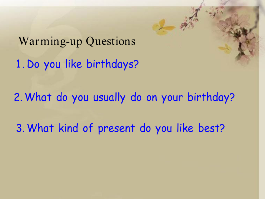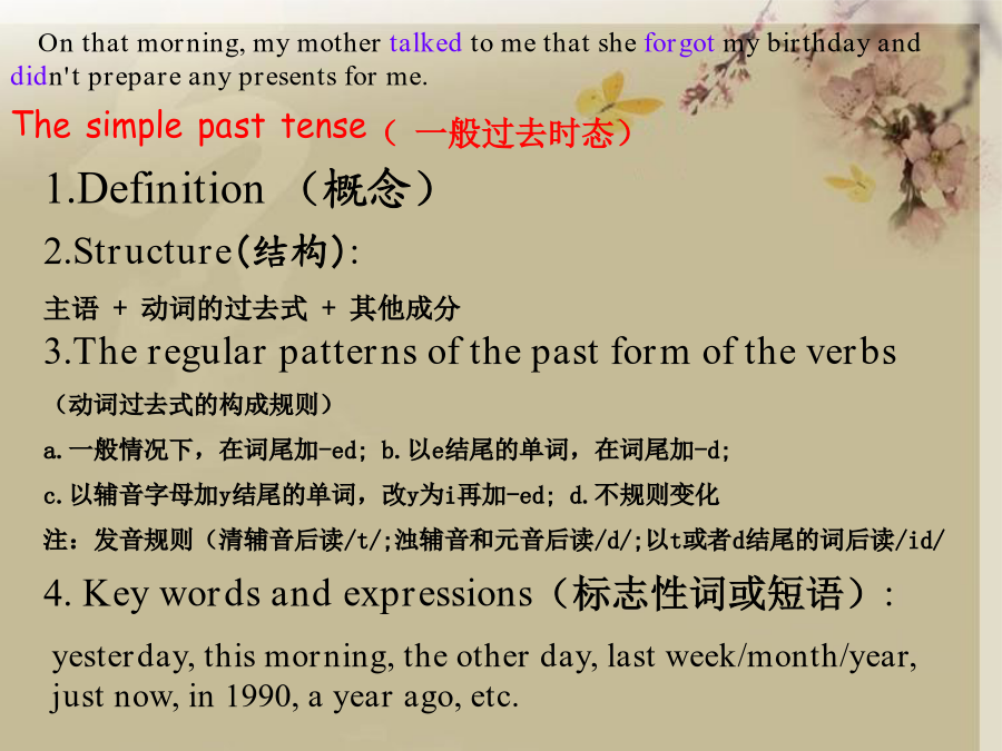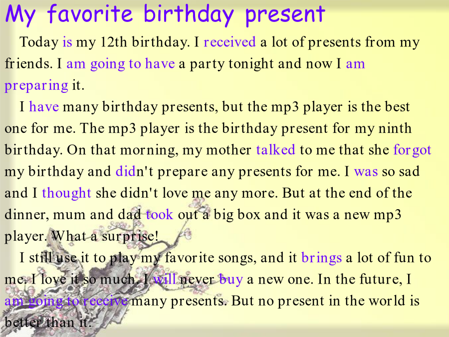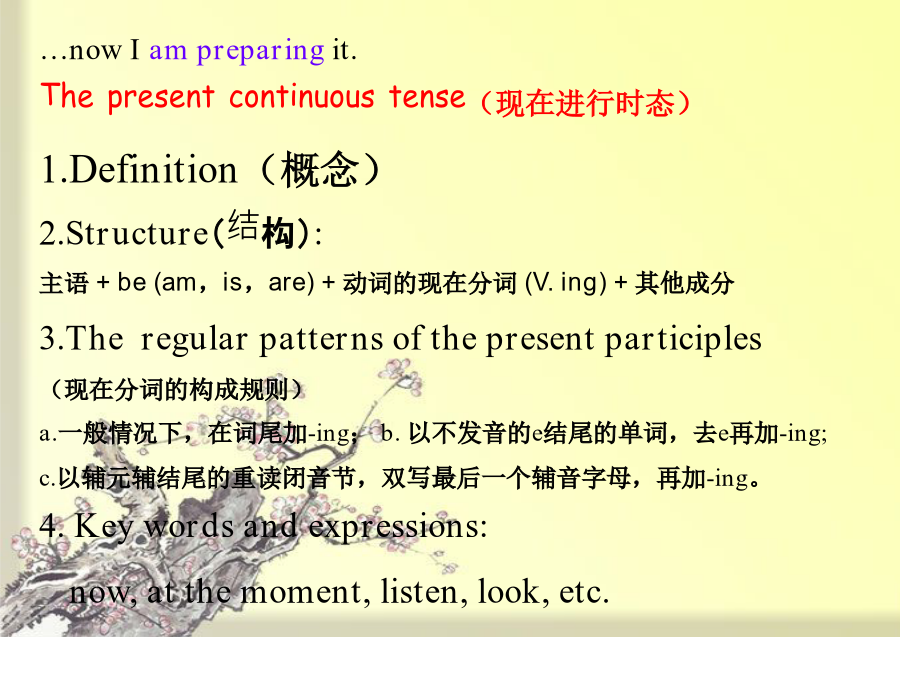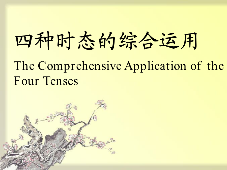 四种时态的综合运用TheComprehensiveApplicationoftheFourTensesWarming-upQuestionsMyfavoritebirthdaypresentOnthatmorning,mymothertalkedtomethatsheforgotmybirthdayanddidn'tprepareanypresentsforme.Thesimplepasttense(一般过去时态)…nowIampreparingit.Thepresentcontinuoustense(现在进行时态)Iamgoingtohaveapartytonight…Iwillneverbuyanewone.ThesimplefuturetenseIstilluseittoplaymyfavoritesongs,anditbringsalotoffuntome.Thesimplepresenttense(一般现在时态)ReviewingoftheFourTensesDefinitionsStructuresTheregularpatternsoftheverbsusedinthefourtensesKeywordsandexpressionsThecomprehensiveapplicationofthefourtensesExampleOneExampleTwoExampleThreeExampleFourAnalysisoftheexercisesonthebookSummarizationHomeworkThanksforyourattention!