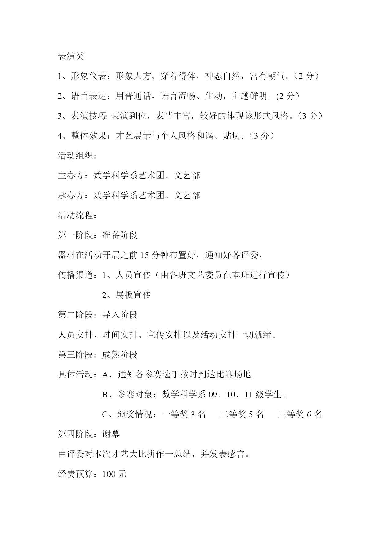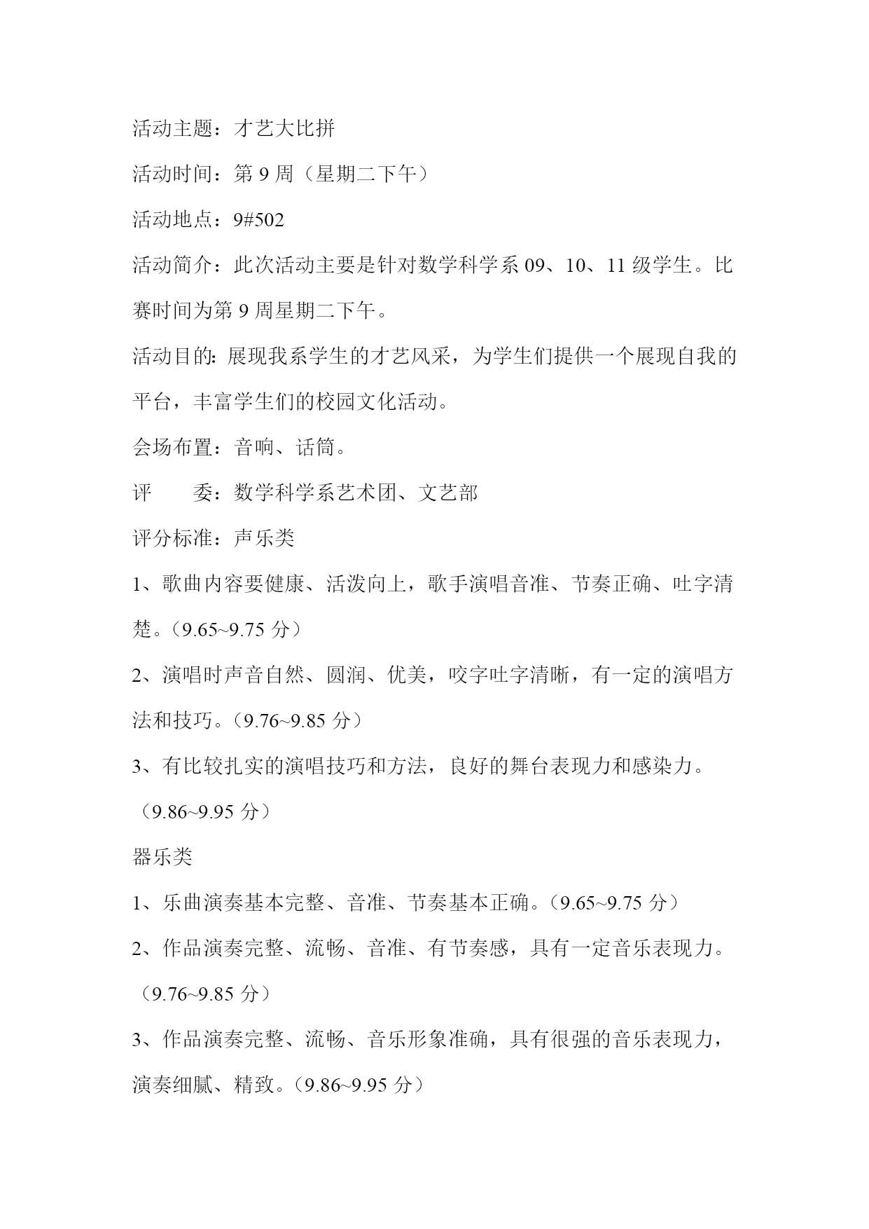才艺大比拼策划书活动主题:才艺大比拼活动时间:第9周(星期二下午)活动地点:9#502活动简介:此次活动主要是针对数学科学系09、10、11级学生。比赛时间为第9周星期二下午。活动目的:展现我系学生的才艺风采,为学生们提供一个展现自我的平台,丰富学生们的校园文化活动。会场布置:音响、话筒。评委:数学科学系艺术团、文艺部评分标准:声乐类歌曲内容要健康、活泼向上,歌手演唱音准、节奏正确、吐字清楚。(9.65~9.75分)演唱时声音自然、圆润、优美,咬字吐字清晰,有一定的演唱方法和技巧。(9.76~9.85分)有比较扎实的演唱技巧和方法,良好的舞台表现力和感染力。(9.86~9.95分)器乐类乐曲演奏基本完整、音准、节奏基本正确。(9.65~9.75分)作品演奏完整、流畅、音准、有节奏感,具有一定音乐表现力。(9.76~9.85分)作品演奏完整、流畅、音乐形象准确,具有很强的音乐表现力,演奏细腻、精致。(9.86~9.95分)表演类形象仪表:形象大方、穿着得体,神态自然,富有朝气。(2分)语言表达:用普通话,语言流畅、生动,主题鲜明。(2分)表演技巧:表演到位,表情丰富,较好的体现该形式风格。(3分)整体效果:才艺展示与个人风格和谐、贴切。(3分)活动组织:主办方:数学科学系艺术团、文艺部承办方:数学科学系艺术团、文艺部活动流程:第一阶段:准备阶段器材在活动开展之前15分钟布置好,通知好各评委。传播渠道:1、人员宣传(由各班文艺委员在本班进行宣传)2、展板宣传第二阶段:导入阶段人员安排、时间安排、宣传安排以及活动安排一切就绪。第三阶段:成熟阶段具体活动:A、通知各参赛选手按时到达比赛场地。B、参赛对象:数学科学系09、10、11级学生。C、颁奖情况:一等奖3名二等奖5名三等奖6名第四阶段:谢幕由评委对本次才艺大比拼作一总结,并发表感言。经费预算:100元