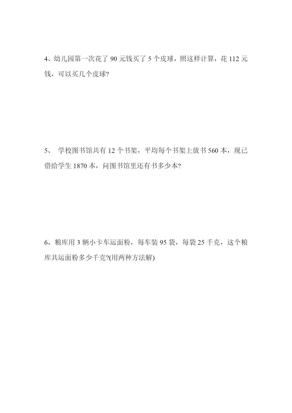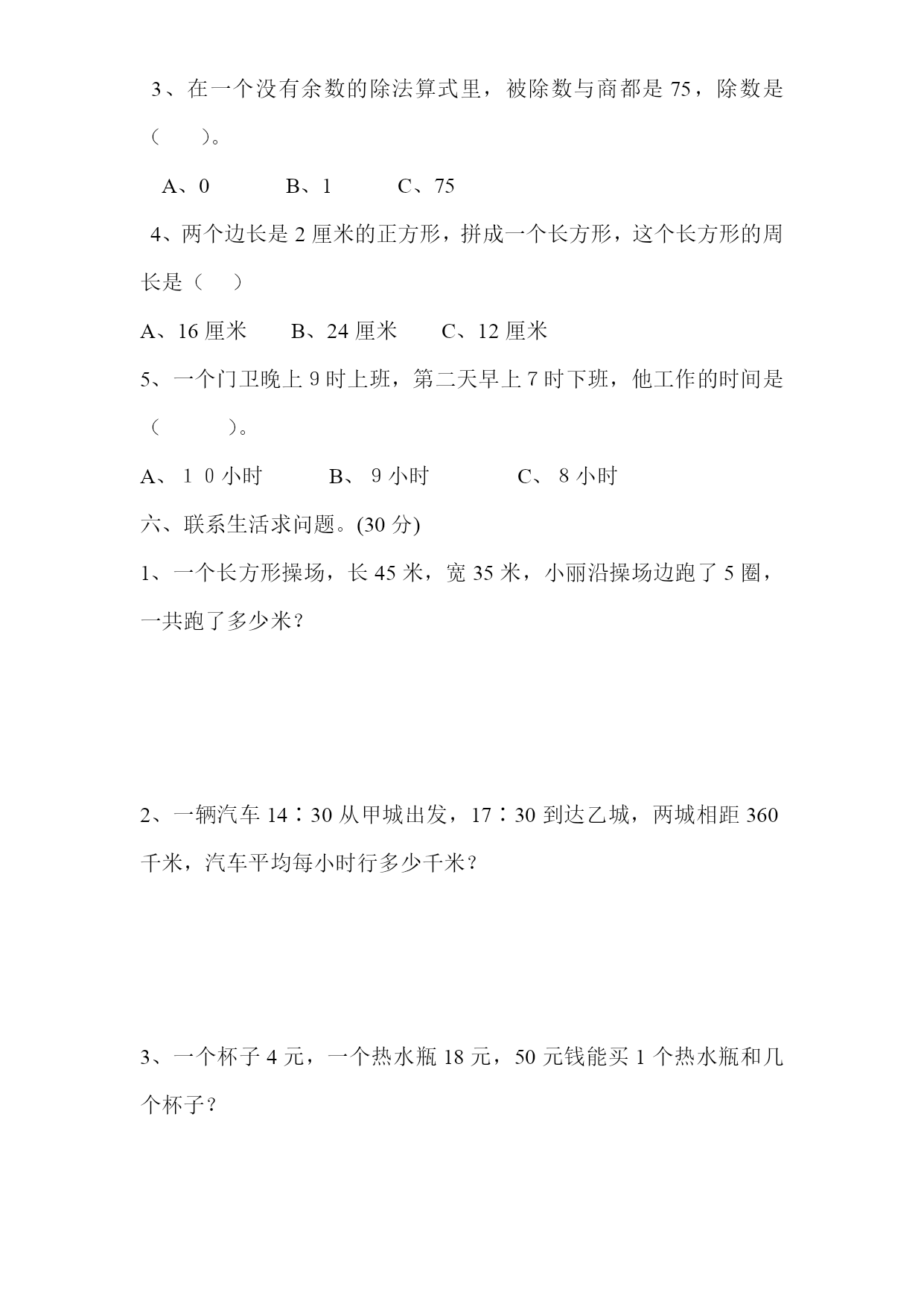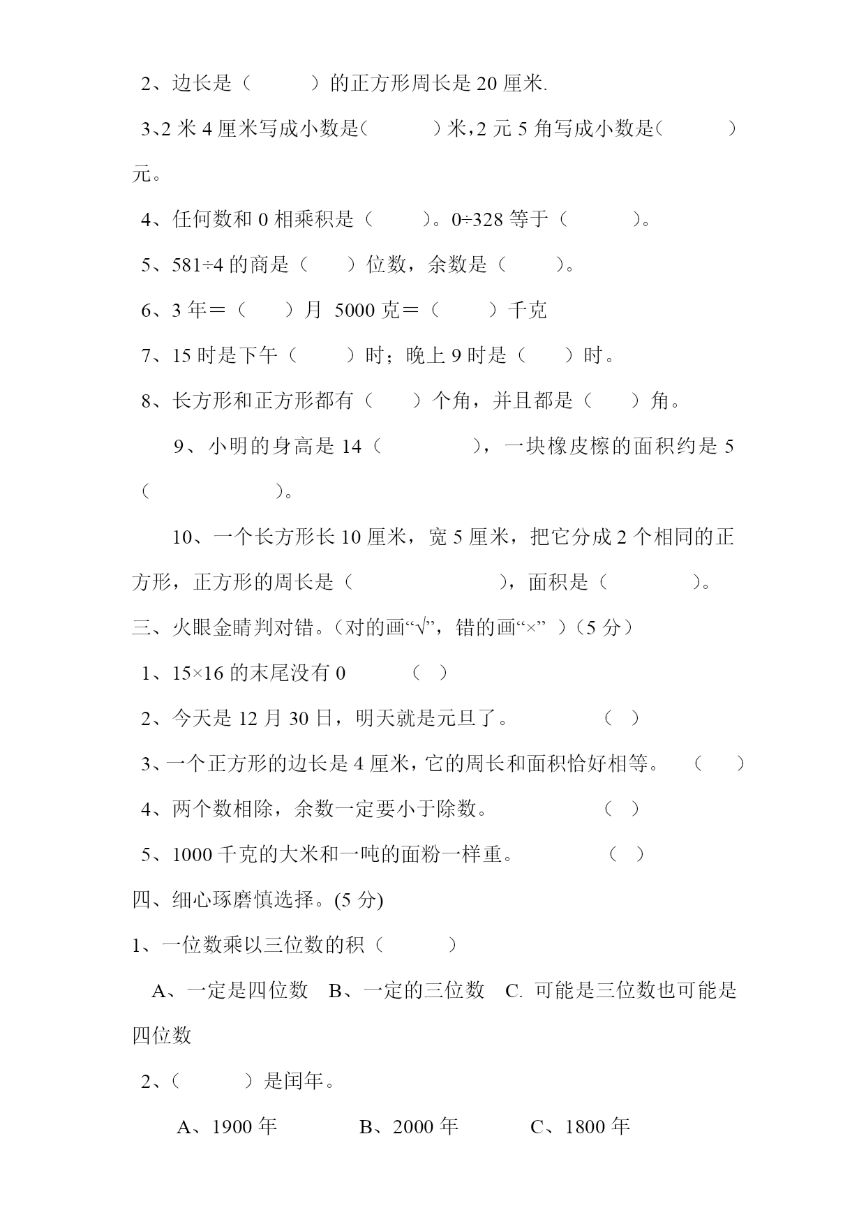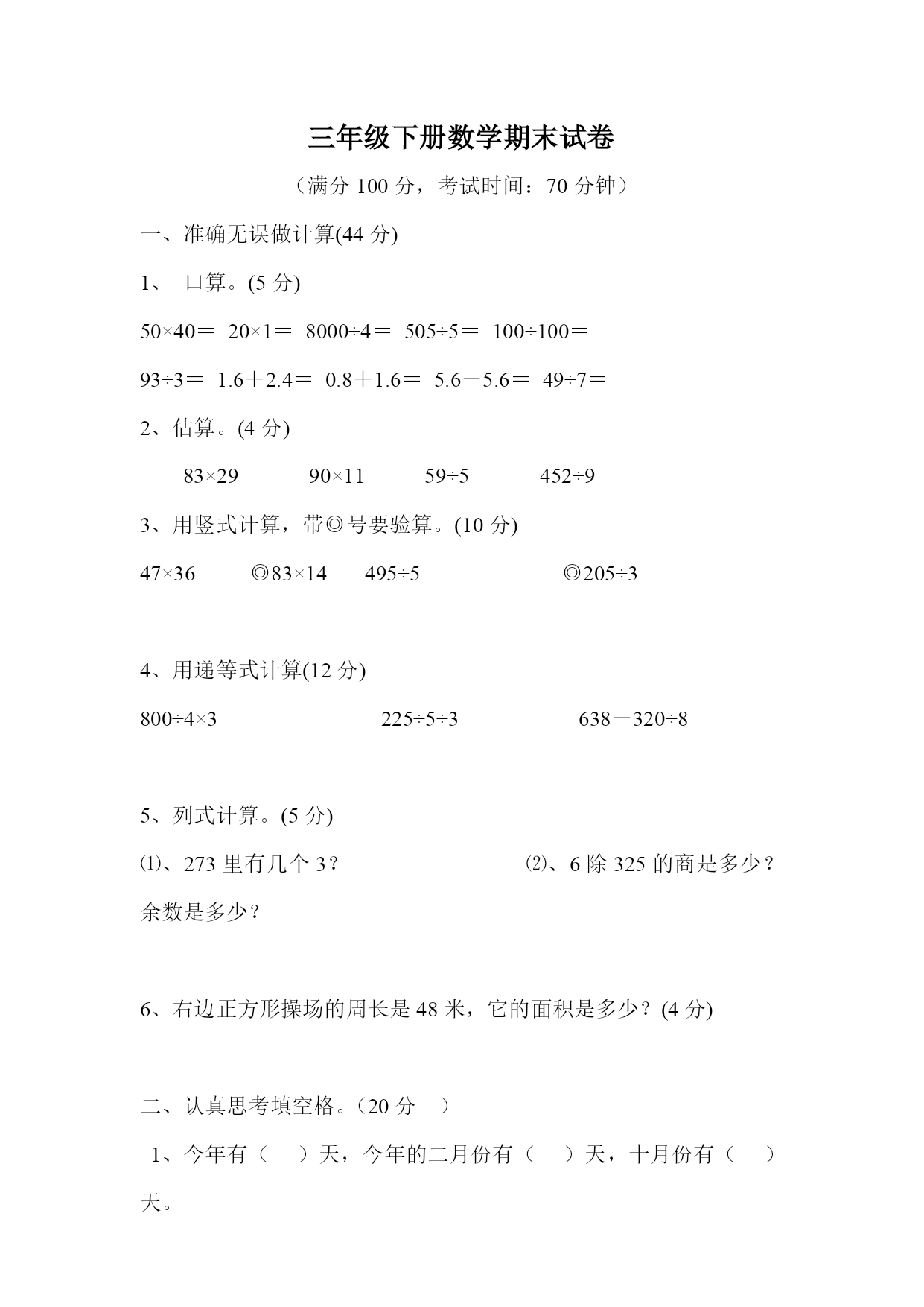 三年级下册数学期末试卷(满分100分,考试时间:70分钟)准确无误做计算(44分)1、口算。(5分)50×40=20×1=8000÷4=505÷5=100÷100=93÷3=1.6+2.4=0.8+1.6=5.6-5.6=49÷7=2、估算。(4分)83×2990×1159÷5452÷93、用竖式计算,带◎号要验算。(10分)47×36◎83×14495÷5◎205÷34、用递等式计算(12分)800÷4×3225÷5÷3638-320÷85、列式计算。(5分)⑴、273里有几个3?⑵、6除325的商是多少?余数是多少?6、右边正方形操场的周长是48米,它的面积是多少?(4分)二、认真思考填空格。(20分)1、今年有()天,今年的二月份有()天,十月份有()天。2、边长是()的正方形周长是20厘米.3、2米4厘米写成小数是()米,2元5角写成小数是()元。4、任何数和0相乘积是()。0÷328等于()。5、581÷4的商是()位数,余数是()。6、3年=()月5000克=()千克7、15时是下午()时;晚上9时是()时。8、长方形和正方形都有()个角,并且都是()角。9、小明的身高是14(),一块橡皮檫的面积约是5()。10、一个长方形长10厘米,宽5厘米,把它分成2个相同的正方形,正方形的周长是(),面积是()。三、火眼金睛判对错。(对的画“√”,错的画“×”)(5分)1、15×16的末尾没有0()2、今天是12月30日,明天就是元旦了。()3、一个正方形的边长是4厘米,它的周长和面积恰好相等。()4、两个数相除,余数一定要小于除数。()5、1000千克的大米和一吨的面粉一样重。()四、细心琢磨慎选择。(5分)1、一位数乘以三位数的积()Α、一定是四位数Β、一定的三位数С.可能是三位数也可能是四位数2、()是闰年。A、1900年B、2000年C、1800年3、在一个没有余数的除法算式里,被除数与商都是75,除数是()。А、0В、1С、754、两个边长是2厘米的正方形,拼成一个长方形,这个长方形的周长是()А、16厘米В、24厘米С、12厘米5、一个门卫晚上9时上班,第二天早上7时下班,他工作的时间是()。A、10小时B、9小时C、8小时六、联系生活求问题。(30分)1、一个长方形操场,长45米,宽35米,小丽沿操场边跑了5圈,一共跑了多少米?2、一辆汽车14∶30从甲城出发,17∶30到达乙城,两城相距360千米,汽车平均每小时行多少千米?3、一个杯子4元,一个热水瓶18元,50元钱能买1个热水瓶和几个杯子?4、幼儿园第一次花了90元钱买了5个皮球,照这样计算,花112元钱,可以买几个皮球?5、学校图书馆共有12个书架,平均每个书架上放书560本,现已借给学生1870本,问图书馆里还有书多少本?6、粮库用3辆小卡车运面粉,每车装95袋,每袋25千克,这个粮库共运面粉多少千克?(用两种方法解)