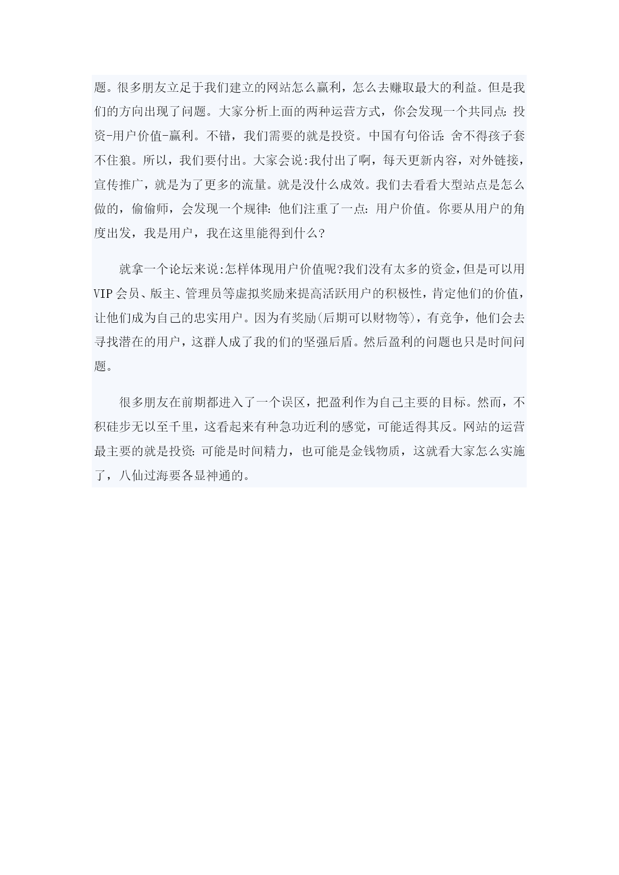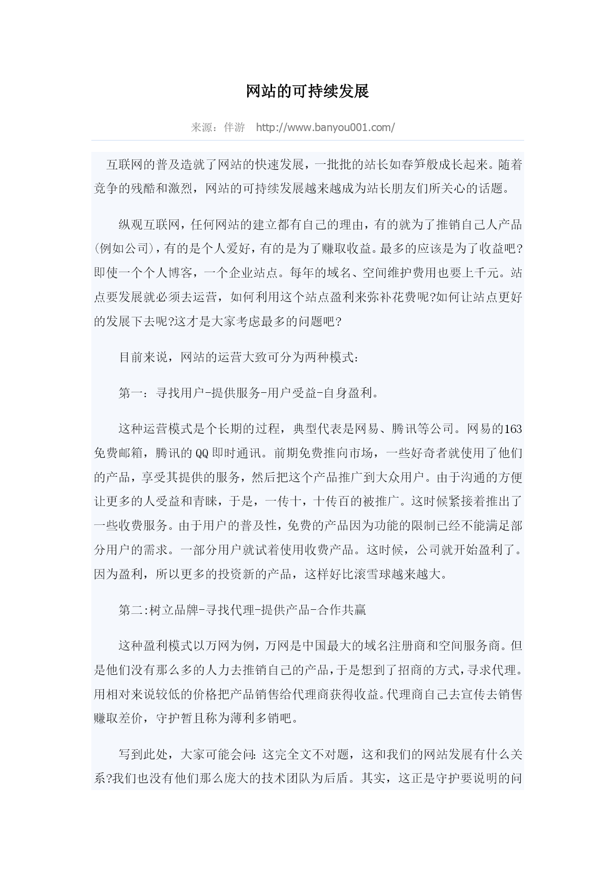 网站的可持续发展来源:HYPERLINK"http://www.banyou001.com/"伴游HYPERLINK"http://www.banyou001.com/"http://www.banyou001.com/互联网的普及造就了网站的快速发展,一批批的站长如春笋般成长起来。随着竞争的残酷和激烈,网站的可持续发展越来越成为站长朋友们所关心的话题。纵观互联网,任何网站的建立都有自己的理由,有的就为了推销自己人产品(例如公司),有的是个人爱好,有的是为了赚取收益。最多的应该是为了收益吧?即使一个个人博客,一个企业站点。每年的域名、空间维护费用也要上千元。站点要发展就必须去运营,如何利用这个站点盈利来弥补花费呢?如何让站点更好的发展下去呢?这才是大家考虑最多的问题吧?目前来说,网站的运营大致可分为两种模式:第一:寻找用户-提供服务-用户受益-自身盈利。这种运营模式是个长期的过程,典型代表是网易、腾讯等公司。网易的163免费邮箱,腾讯的QQ即时通讯。前期免费推向市场,一些好奇者就使用了他们的产品,享受其提供的服务,然后把这个产品推广到大众用户。由于沟通的方便让更多的人受益和青睐,于是,一传十,十传百的被推广。这时候紧接着推出了一些收费服务。由于用户的普及性,免费的产品因为功能的限制已经不能满足部分用户的需求。一部分用户就试着使用收费产品。这时候,公司就开始盈利了。因为盈利,所以更多的投资新的产品,这样好比滚雪球越来越大。第二:树立品牌-寻找代理-提供产品-合作共赢这种盈利模式以万网为例,万网是中国最大的域名注册商和空间服务商。但是他们没有那么多的人力去推销自己的产品,于是想到了招商的方式,寻求代理。用相对来说较低的价格把产品销售给代理商获得收益。代理商自己去宣传去销售赚取差价,守护暂且称为薄利多销吧。写到此处,大家可能会问:这完全文不对题,这和我们的网站发展有什么关系?我们也没有他们那么庞大的技术团队为后盾。其实,这正是守护要说明的问题。很多朋友立足于我们建立的网站怎么赢利,怎么去赚取最大的利益。但是我们的方向出现了问题。大家分析上面的两种运营方式,你会发现一个共同点:投资-用户价值-赢利。不错,我们需要的就是投资。中国有句俗话:舍不得孩子套不住狼。所以,我们要付出。大家会说:我付出了啊,每天更新内容,对外链接,宣传推广,就是为了更多的流量。就是没什么成效。我们去看看大型站点是怎么做的,偷偷师,会发现一个规律:他们注重了一点:用户价值。你要从用户的角度出发,我是用户,我在这里能得到什么?就拿一个论坛来说:怎样体现用户价值呢?我们没有太多的资金,但是可以用VIP会员、版主、管理员等虚拟奖励来提高活跃用户的积极性,肯定他们的价值,让他们成为自己的忠实用户。因为有奖励(后期可以财物等),有竞争,他们会去寻找潜在的用户,这群人成了我的们的坚强后盾。然后盈利的问题也只是时间问题。很多朋友在前期都进入了一个误区,把盈利作为自己主要的目标。然而,不积硅步无以至千里,这看起来有种急功近利的感觉,可能适得其反。网站的运营最主要的就是投资:可能是时间精力,也可能是金钱物质,这就看大家怎么实施了,八仙过海要各显神通的。