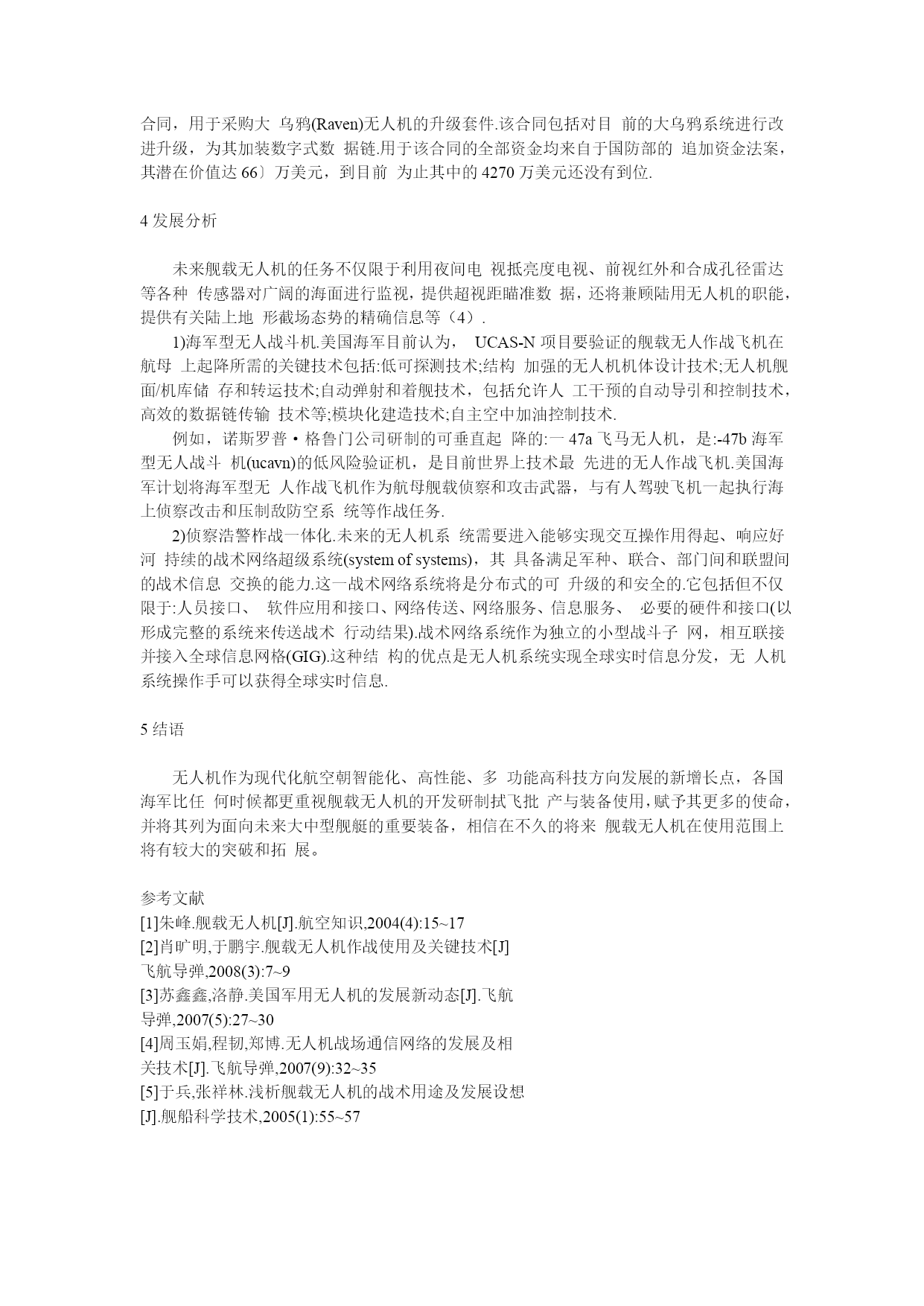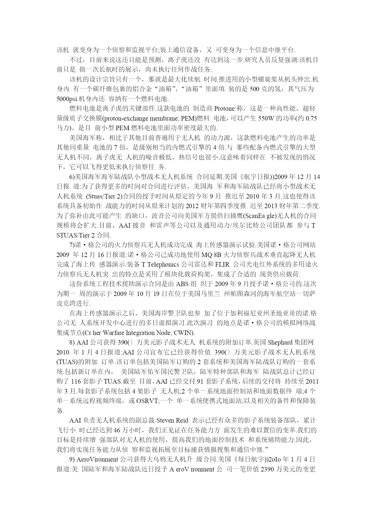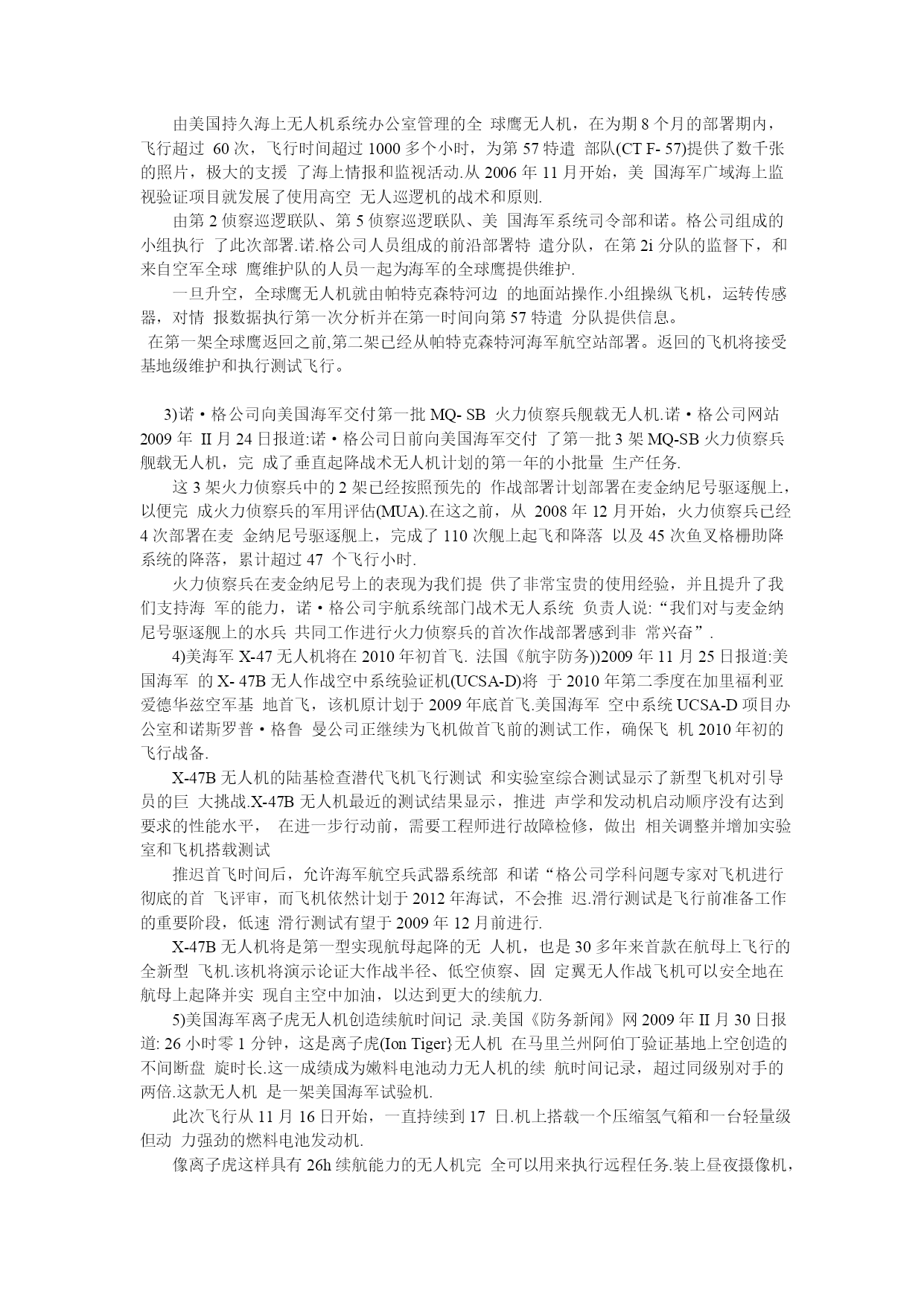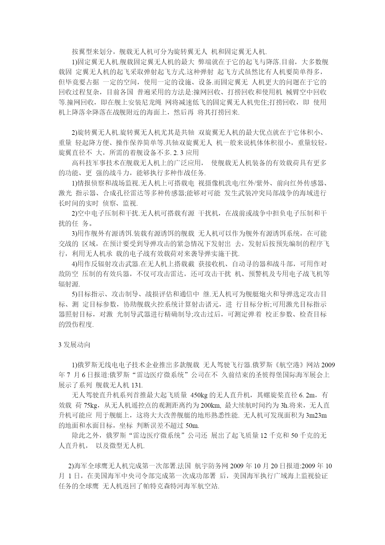 舰载无人机的发展点击图片查看原图舰载无人机的发展发布日期:2010-06-17有效期至:长期有效浏览次数:2076发布日期:2010-06-17有效期至:长期有效浏览次数:2076摘要国外舰载无人机在现代战争中发挥着越来越重要的作用。文章介绍了舰载无人机的发展历程以及装备的研制、改进情况,指出了在现代战争中发展舰载无人机的优势和重要性,重点探讨了几种舰载无人机的性能及其特点,最后论述了舰载无人机的发展动向与分析。1、引言舰载无人机主要装备航空母舰、战列舰、驱逐舰、护卫舰和两栖舰等军舰,利用机载照相、光电、红外、电子侦察等先进传感器,实施空中监视、侦察通信中继、炮火校正、目标指示、充当诱饵、电子对抗、毁伤评估,以及配备机载导弹等武器,完成封锁、反舰或对陆攻击等作战任务.由于舰载无人机具有成本低、体积小、作战使用灵活、费效比高、可避免人员伤亡等优势,因而备受世界各国海军的青睐.本文就国外舰载无人机、发展动向、发展分析等,作进一步的研究和探讨.2、舰载无人机舰载无人机是海基航空力量的合理补充,可以执行战场侦察、目标监视、电子对抗、通信中继等任务。2.1优点1)无人机系统操作、使用方便.无人机系统配置较为完整,自成系统,不需要其他保障条件,操作使用十分方便.2)部署灵活机动,具有良好的伴随性.舰载无人机系统可以随战斗舰船出航执行任务,结合舰船的远航能力,海上作战范围广.3)可构成多任务系统,协同作战能力强.无人机系统可配置不同的任务设备完成战场侦察、监视、目标定位、侦察校射、电子对抗等多项任务,同时由于升空作战,其超微频段的工作性能有无可比拟的优势,可以方便地融入c4IsR系统,成为网络中心站的一个节点.4)具有优良的效费比.无人机系统结构简单、重量轻、成本与使用费用低、无人员生命危险,可以以优良的效费比完成任务.2.2分类按翼型来划分,舰载无人机可分为旋转翼无人机和固定翼无人机.1)固定翼无人机.舰载固定翼无人机的最大弊端就在于它的起飞与降落.目前,大多数舰载固定翼无人机的起飞采取弹射起飞方式.这种弹射起飞方式虽然比有人机要简单得多,但毕竟要占据一定的空间,使用一定的设施、设备.而固定翼无人机更大的问题在于它的回收过程复杂,目前各国普遍采用的方法是:撞网回收、打捞回收和使用机械臂空中回收等.撞网回收,即在舰上安装尼龙绳网将减速低飞的固定翼无人机兜住;打捞回收,即使用机上降落伞降落在战舰附近的海面上,然后再将其打捞回来.2)旋转翼无人机.旋转翼无人机尤其是共轴双旋翼无人机的最大优点就在于它体积小、重量轻起降方便、操作保养简单等.共轴双旋翼无人机一般来说机体体积很小,重量较轻,旋翼直径不大,所需的着舰设备不多.2.3应用高科技军事技术在舰载无人机上的广泛应用,使舰载无人机装备的有效载荷具有更多的功能、更强的战斗力,能够执行多种作战任务.1)情报侦察和战场监视.无人机上可搭载电视摄像机洗电/红外/紫外、前向红外传感器、激光指示器、合成孔径雷达等多种传感器;能够对可能发生武装冲突局部战争的海域进行长时间的实时侦察、监视.2)空中电子压制和干扰.无人机可搭载有源干扰机,在战前或战争中担负电子压制和干扰的任务。3)用作舰外有源诱饵.装载有源诱饵的舰载无人机可以作为舰外有源诱饵系统,在可能交战的区域,在预计要受到导弹攻击的紧急情况下发射出去,发射后按预先编制的程序飞行,利用无人机承载的电子战有效载荷对来袭导弹实施干扰.4)用作反辐射攻击武器.在无人机上搭载截获接收机、自动寻的器和战斗部,可用作对敌防空压制的有效兵器,不仅可攻击雷达,还可攻击干扰机、预警机及专用电子战飞机等辐射源.5)目标指示、攻击制导、战损评估和通信中继.无人机可为舰艇炮火和导弹选定攻击目标、测定目标参数,协助舰载火控系统计算射击诸元,进行目标分析;可用激光目标指示器照射目标,对激光制导武器进行精确制导;攻击过后,可测定弹着校正参数、检查目标的毁伤程度.3发展动向1)俄罗斯无线电电子技术企业推出多款舰载无人驾驶飞行器.俄罗斯《航空港》网站2009年7月6日报道:俄罗斯“雷边医疗微系统”公司在不久前结束的圣彼得堡国际海军展会上展示了系列舰载无人机131.无人驾驶直升机系列首推最大起飞质量450kg的无人直升机,其螺旋桨直径6.2m,有效载荷75kg,从无人机遥控点的观测距离约为200km,最大续航时间约为3h.将来,无人直升机可能应用于舰艇上,这将大大改善舰艇的地形熟悉性能.无人机可发现面积为3m23m的地面和水面目标,坐标判断误差不超过50m.除此之外,俄罗斯“雷边医疗微系统”公司还展出了起飞质量12千克和50千克的无人直升机,以及微型无人机.2)海军全球鹰无人机完成第一次部署.法国航宇防务网2009年10月20日报道:2009年10月1日,在美国海军中央司令部完成第一次成功部署