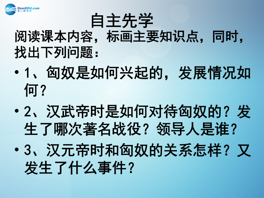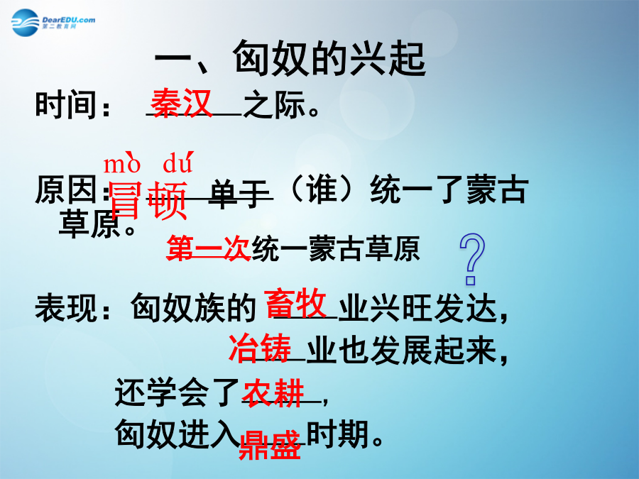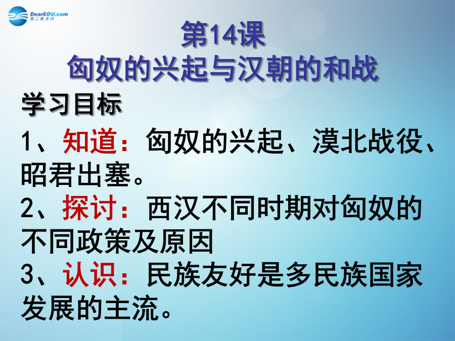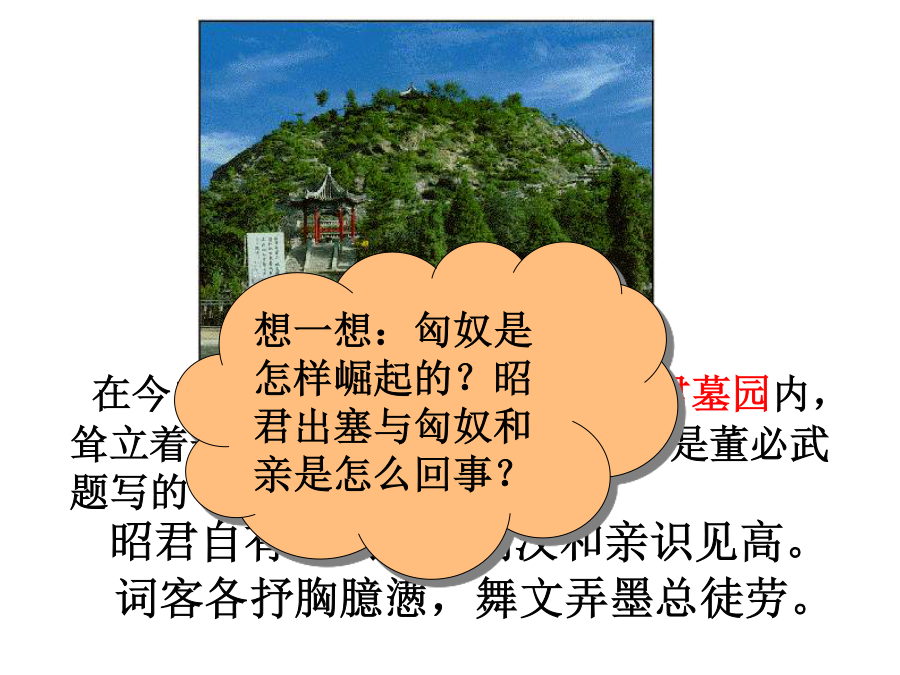 秦朝修建长城的目的是什么? 在今内蒙古呼和浩特市南郊的昭君墓园内,耸立着一座高大的汉白玉碑,上面是董必武题写的《谒昭君墓》诗:昭君自有千秋在,胡汉和亲识见高。词客各抒胸臆懑,舞文弄墨总徒劳。第14课匈奴的兴起与汉朝的和战自主先学一、匈奴的兴起(1)开发了祖国的北疆。 (2)为以后全国性的统一创造了条件。 (3)创造了匈奴文化. (4)汉、匈人民密切的联系,共同缔造着祖国的历史。二、匈奴与西汉的和战2、汉武帝时,匈奴与汉的关系如何?汉武帝称赞霍去病: “初生之犊不畏虎,你年纪轻轻的,打起仗来就这样勇敢,你一往无前,勇冠三军,就封你为冠军侯吧!”探究讨论讲一讲: 昭君出塞的故事(时间、人物、影响)材料一:汉与匈奴合为一家,世世毋得相诈相攻。——《汉书》材料二:昭君自有千秋在,胡汉和亲识见高。——董必武《谒昭君墓》材料三:“边城晏闭,牛马布野,三世无犬吠之警,黎庶亡(无)干戈之役。”西汉同匈奴的关系能 力 拓 展课堂总结:巧乐记现 实 链 接动脑筋: 汉武帝的大一统表现在哪些方面?练一练3.下列事件中使匈奴不能再与西汉抗衡的是() A、汉高祖率军抵御匈奴B、蒙恬出击匈奴 C、卫青、霍去病出击匈奴D、窦固、窦宪出击北匈奴 4.材料题:材料一:昭君自有千秋在,胡汉和亲识见高。 ——董必武《揭昭君墓》 材料二:边城晏闭,牛马布野,三世亡(无)犬吠之警,黎庶无干戈之役。——《汉书》 请回答(1)材料一中的“胡”指谁?当时他们的首领是谁? (2)材料二反映的是什么事件以后的情况? (3)结合材料中诗句,分析昭君和亲的历史作用?