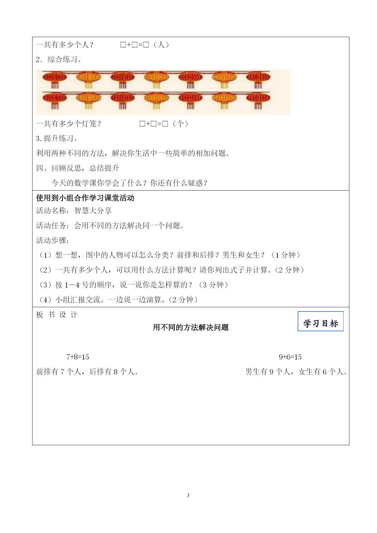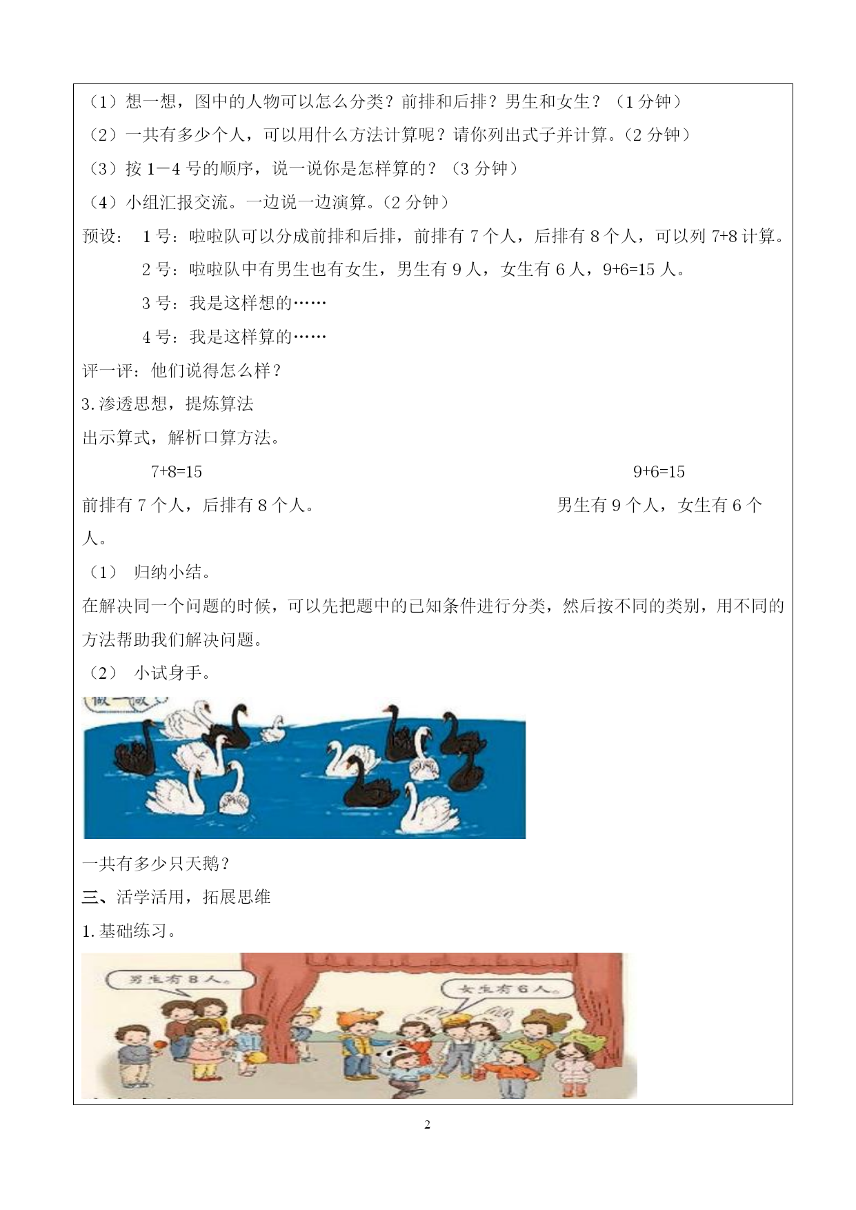 柳州市驾鹤路小学“活美课堂”教学设计表教材内容人教版小学数学第五册第八单元教学主题用不同的方法解决同一个问题课时第(1)课时执教者石相兄教学目标学习目标(1—2个目标)1.知识与技能:从不同的角度观察问题,利用两种方法解决一共有多少的问题。2.过程与方法:通过探究与交流,会从不同的角度解决同一个问题。3.情感态度与价值观:学生积极主动地参与数学活动,获得成功体验,增强自信心。我会用不同的方法解决同一个问题。教学过程一、激趣引入,目标导学1.复习导入。师出示复习题:9+8=8+6=7+5=6+7=5+8=4+9=3+8=2+9=。你能说一说你是怎样计算的吗?2、引入:这些都是我们已经学过利用凑十法计算的20以内的进位加法,那这节课我们就利用这些知识尝试解决生活中的问题。板书课题:用不同的方法解决同一个问题。3.出示学习目标:我会用不同的方法解决同一个问题。。二、自主探究,合作交流1.问题推动,感知算理出示主题图,认真观察,你从图中得到了哪些信息?说一说你的发现。引入:运动会上啦啦队前排有7个人,后排有8个人,一共有多少人?请你列式计算,并说一说你算法。2.数形结合,理解算理活动名称:智慧大分享活动任务:会用不同的方法解决同一个问题。活动步骤:(1)想一想,图中的人物可以怎么分类?前排和后排?男生和女生?(1分钟)(2)一共有多少个人,可以用什么方法计算呢?请你列出式子并计算。(2分钟)(3)按1-4号的顺序,说一说你是怎样算的?(3分钟)(4)小组汇报交流。一边说一边演算。(2分钟)预设:1号:啦啦队可以分成前排和后排,前排有7个人,后排有8个人,可以列7+8计算。2号:啦啦队中有男生也有女生,男生有9人,女生有6人,9+6=15人。3号:我是这样想的……4号:我是这样算的……评一评:他们说得怎么样?3.渗透思想,提炼算法出示算式,解析口算方法。7+8=159+6=15前排有7个人,后排有8个人。男生有9个人,女生有6个人。归纳小结。在解决同一个问题的时候,可以先把题中的已知条件进行分类,然后按不同的类别,用不同的方法帮助我们解决问题。小试身手。一共有多少只天鹅?三、活学活用,拓展思维1.基础练习。一共有多少个人?□+□=□(人)2.综合练习。一共有多少个灯笼?□+□=□(个)3.提升练习。利用两种不同的方法,解决你生活中一些简单的相加问题。四、回顾反思,总结提升今天的数学课你学会了什么?你还有什么疑惑?使用到小组合作学习课堂活动活动名称:智慧大分享活动任务:会用不同的方法解决同一个问题。活动步骤:(1)想一想,图中的人物可以怎么分类?前排和后排?男生和女生?(1分钟)(2)一共有多少个人,可以用什么方法计算呢?请你列出式子并计算。(2分钟)(3)按1-4号的顺序,说一说你是怎样算的?(3分钟)(4)小组汇报交流。一边说一边演算。(2分钟)学习目标板书设计用不同的方法解决问题7+8=159+6=15前排有7个人,后排有8个人。男生有9个人,女生有6个人。