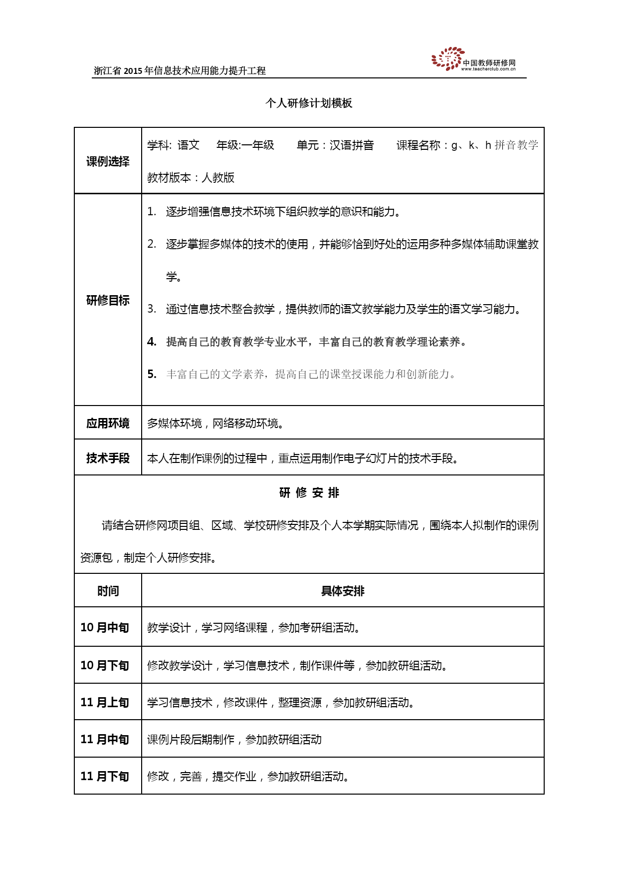 浙江省2015年信息技术应用能力提升工程个人研修计划模板课例选择学科:语文年级:一年级单元:汉语拼音课程名称:g、k、h拼音教学教材版本:人教版研修目标逐步增强信息技术环境下组织教学的意识和能力。逐步掌握多媒体的技术的使用,并能够恰到好处的运用多种多媒体辅助课堂教学。通过信息技术整合教学,提供教师的语文教学能力及学生的语文学习能力。提高自己的教育教学专业水平,丰富自己的教育教学理论素养。丰富自己的文学素养,提高自己的课堂授课能力和创新能力。应用环境多媒体环境,网络移动环境。技术手段本人在制作课例的过程中,重点运用制作电子幻灯片的技术手段。研修安排请结合研修网项目组、区域、学校研修安排及个人本学期实际情况,围绕本人拟制作的课例资源包,制定个人研修安排。时间具体安排10月中旬教学设计,学习网络课程,参加考研组活动。10月下旬修改教学设计,学习信息技术,制作课件等,参加教研组活动。11月上旬学习信息技术,修改课件,整理资源,参加教研组活动。11月中旬课例片段后期制作,参加教研组活动11月下旬修改,完善,提交作业,参加教研组活动。12月上旬完成个人的培训总结12月中旬完成培训的考核参加县内总结会12月下旬完成发展性测评备注:本模板仅供参考,参训教师可根据实际情况,自行修改创新。