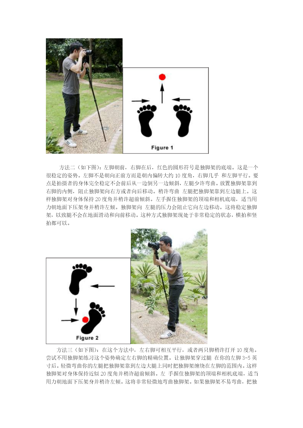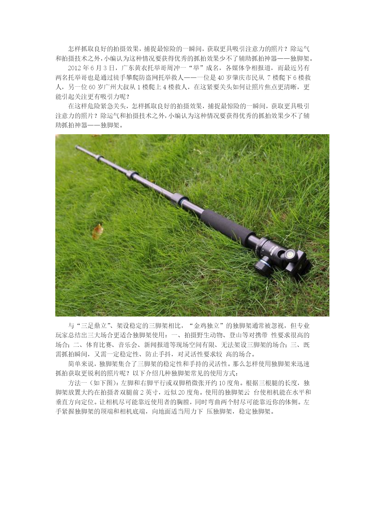 怎样抓取良好的拍摄效果,捕捉最惊险的一瞬间,获取更具吸引注意力的照片?除运气和拍摄技术之外,小编认为这种情况要获得优秀的抓拍效果少不了辅助抓拍神器——独脚架。2012年6月3日,广东黄衣托举哥周冲一“举”成名,各媒体争相报道,而最近另有两名托举哥也是通过徒手攀爬防盗网托举救人——一位是40岁肇庆市民从7楼爬下6楼救人,另一位60岁广州大叔从1楼爬上4楼救人,在这紧要关头如何让照片焦点更清晰,更能引起关注更有吸引力呢?在这样危险紧急关头,怎样抓取良好的拍摄效果,捕捉最惊险的一瞬间,获取更具吸引注意力的照片?除运气和拍摄技术之外,小编认为这种情况要获得优秀的抓拍效果少不了辅助抓拍神器——独脚架。与“三足鼎立”、架设稳定的三脚架相比,“金鸡独立”的独脚架通常被忽视,但专业玩家总结出三大场合更适合独脚架使用:一、拍摄野生动物、登山等对携带性要求很高的场合;二、体育比赛、音乐会、新闻报道等现场空间有限、无法架设三脚架的场合;三、既需抓拍瞬间,又需一定稳定性、防止手抖,对灵活性要求较高的场合。简单来说,独脚架集合了三脚架的稳定性和手持的灵活性。那么怎样使用独脚架来迅速抓拍获取更锐利的照片呢?以下介绍几种独脚架常见的使用方式:方法一(如下图):左脚和右脚平行或双脚稍微张开约10度角。根据三根腿的长度,独脚架放置大约在拍摄者双腿前2英寸,近似20度角。使用的独脚架云台使相机能在水平和垂直方向定位。让相机尽可能靠近使用者的胸膛,同时弯曲两个肘尽可能靠近你的体侧。左手紧握独脚架的顶端和相机底端,向地面适当用力下压独脚架,稳定独脚架。方法二(如下图):左脚朝前,右脚在后,红色的圆形符号是独脚架的底端。这是一个很稳定的姿势。左脚不是朝向正前方而是朝内偏转大约10度角,右脚几乎和左脚平行。要点是拍摄者的身体完全稳定不会前后从一边倒另一边倾斜,左腿少许弯曲。放置独脚架靠到右脚的内侧,阻止独脚架向右方或者向后移动。稍许弯曲左腿把独脚架靠到左边腿上。这样独脚架对身体保持20度角并稍许超前倾斜。左手握住独脚架的顶端和相机底端,适当用力朝地面下压架身并稍许左倾。独脚架向左腿的压力会阻止它向左边移动。这将稳定独脚架,以致腿不会在地面滑动和向前移动。这种方式独脚架现处于非常稳定的状态,横拍和竖拍都可以。方法三(如下图):在这个方法中,左右脚可相互平行,或者两只脚稍许打开10度角。尝试不用独脚架练习这个姿势确定左右脚的精确位置。让独脚架穿过腿在你的左脚3-5英寸后。轻微弯曲你的左腿把独脚架靠到左边大腿上同时把独脚架缠绕在左脚的范围内。这样独脚架对身体保持近似20度角并稍许超前倾斜。左手握住独脚架的顶端和相机底端,适当用力朝地面下压架身并稍许左倾。这将非常轻微地弯曲独脚架。如果独脚架不易弯曲,把独脚架的底部放置更靠近左脚。独脚架向左腿的压力会阻止它向左边移动,这将稳定独脚架,以致腿不会在地面滑动和向前移动。独脚架现在处于非常稳定的状态。横拍和竖拍都可以。另一个姿势是用右手代替左手把持独脚架顶部,这样可以在需要的时候腾出左手做其他事情。反复练习这种方法,直到你感觉非常自然和舒适。方法四(如下图):配合独脚架专用的独脚架腰包。独脚架腰包穿在皮带或户外活动带子上。户外活动时,把独脚架收起到最短长度(大约10-14英寸),独脚架和照相机处于随时拍摄的状态。当遇到转瞬即逝的瞬间,把独脚架放进架袋立刻可稳定拍摄。握着相机的左手靠近身体,这会稳定独脚架。拍摄时展开双脚以到最稳定的状态。方法四尽管独脚使用方便,优点突出,但对一般玩家来说,独脚架应用面依然不广,仅为抓拍托举哥而单买一支独脚架性价比显然不高。所以多用途三角架倍受摄友青睐,如最近小编发现一款富图宝的四合一子母脚架。外表看似是一个常规的三脚架,其实可以根据拍摄需求,快速变换成专业大脚架、独脚架、专业微距脚架、登山杖,使用方便。在我们身边,新鲜事时刻发生,要想第一时间抓拍焦点,除了拍摄技术足够外,一款适合自己使用的脚架更能辅助拍摄出更出色的作品。本文来自:www.jialala.com