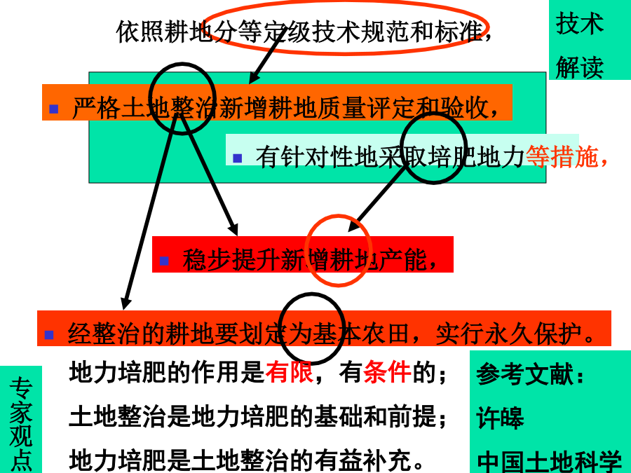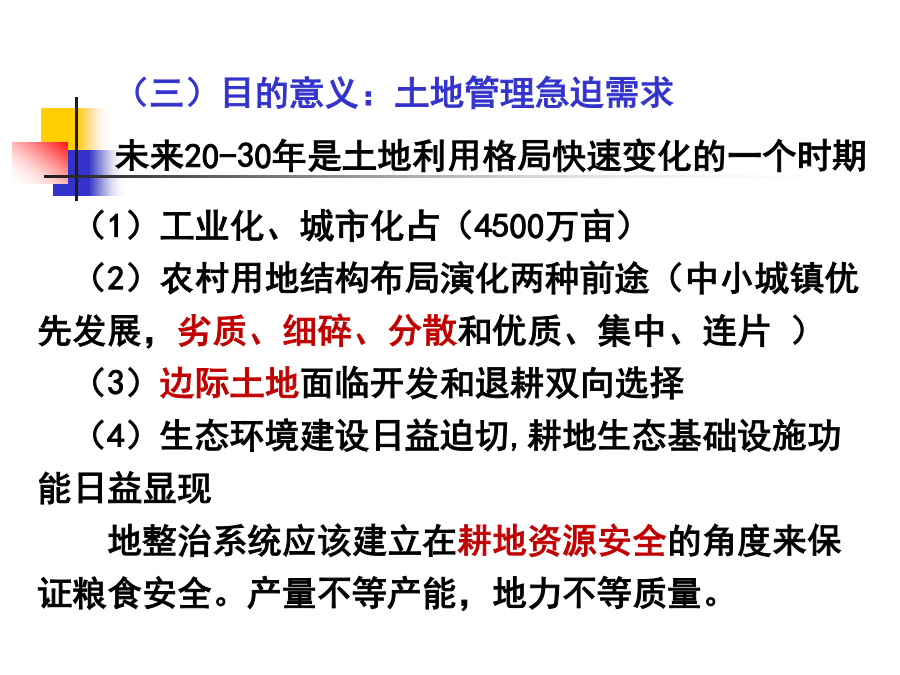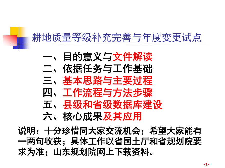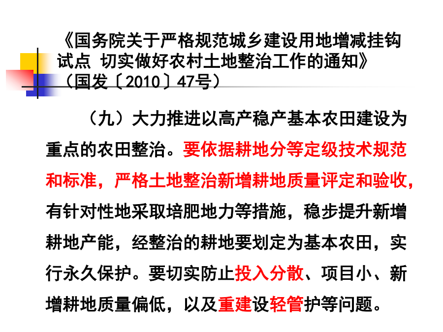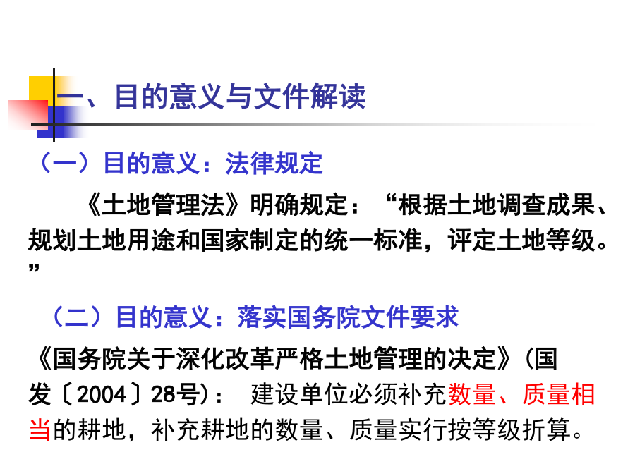 一、目的意义与文件解读(九)大力推进以高产稳产基本农田建设为重点的农田整治。要依据耕地分等定级技术规范和标准,严格土地整治新增耕地质量评定和验收,有针对性地采取培肥地力等措施,稳步提升新增耕地产能,经整治的耕地要划定为基本农田,实行永久保护。要切实防止投入分散、项目小、新增耕地质量偏低,以及重建设轻管护等问题。(三)目的意义:土地管理急迫需求 未来20-30年是土地利用格局快速变化的一个时期 荷兰北部(四)质量相关文件解读利用司文件出台背景部利用司计划在2011-2012年,以各省已有的农用地分等成果和最新土地调查成果为基础,完成耕地质量等级成果补充完善工作;在2013-2015年,全部部署各省(区、市)开展耕地质量等级的年度变更工作,年度变更工作拟主要依靠各省土地勘测规划院的土地调查队伍和各省土地整治机构的土地整治队伍开展,请你处在确定成果完善技术承担时要充分考虑部利用司“十二五”期间的工作安排,实现完善工作和年度变更工作在技术队伍上的有效衔接。耕地司文件出台背景2011年5号厅发函时写给部长签报: 通过试点,一是,动态掌握基本农田建设、占用补划、耕地占补平衡、土地整治等涉及到的耕地质量等级变化情况,为丰富和完善耕地保护监管内容提供支撑。 二是,结合最新土地调查成果,摸实基本农田质量等级,为制定基本农田规划提供依据,引导以新增费为主的各类资金投入到永久基本农田的建设上来。 三是,研究制定耕地质量建设的管理办法和技术标准,提出农用地分等定级成果运用和动态调整路径。 同时,可作为我部回应社会,答复相关部门及专家质疑耕地保护工作的依据之一。(怎么回答?)2012年要扩大监测试点范围:科技司公益专项名称:《耕地等级变化野外监测技术集成与应用示范》。来源:科技部立项,财政部拨款,部科技司组织实施,15个省参加研究工作。二、成果完善依据任务与工作基础工作依据之二:部专题研究 “十二五”耕地质量等级成果完善与应用工作方案,贠部长圈批) 工作依据之三: 2012年部重点工作布局 重点工作2:完善耕地保护新机制中第5项主要任务:“全面推进耕地质量等级变更和评价。” (责任单位:利用司、整理中心)国土资厅函【2011】1115号 工作任务之一:成果补充完善 目标任务: 以农用地分等工作成果为基础,通过开展相关补充调查,更新有关资料数据,形成全国31个省(区、市)与最新土地调查成果一致的耕地质量等级成果。今后每6年或10年全面更新一次。工作任务之二:年度变更试点 目标任务: 2011年安排福建、广东2个试点(探索方法) 2012-2013年逐步扩大试点。 两项任务之间关系: 承前启后,在成果完善的基础上开展年度变更工作,培养年度变更能力。 要区别完善、变更、更新关系。 年度变更二、成果完善依据任务与工作基础总体偏低 集中性 复合性 互补性全国农用地分等成果在国博作为标志参观点展出,得到中央领导的充分肯定;中央媒体对这个展位做了大量深度报道。二、成果完善依据任务与工作基础2012年5月23日晚21:00—22:00,国土资源部土地整治中心副主任郧文聚做客中央人民广播电台中国之声《政务之通》栏目二、成果完善依据任务与工作基础全国等别面积累积曲线全国农用地等别序列景观全国农用地等别序列景观《中国耕地等别分异特性及其对耕地保护的影响》,农业工程学报,2011年第11期中: 1.全国标准亩总量: 全国1等地为标准,总量为6.9亿亩; 广东平均等别5.4等为准,总量10.3亿亩 2.全国平均基本农田保护率为86.4%: 上海、广东、江苏、湖北等4个省份能够保证划定的基本农田全部都是优等地和高等地; 江西、河南等17个省份不得不划入中等地; 山西、黑龙江等10个省份不得不划入低等地 二、成果完善依据任务与工作基础三、农用地分等基本思路与主要过程三、农用地分等基本思路与主要过程三、农用地分等基本思路与主要过程(一)基本思路三、农用地分等基本思路与主要过程标准耕作制度等别层次:揭示了土地开发利用的潜力 光温生产潜力 自然质量等 利用等 综合等因素法计算CLij三、农用地分等基本思路与主要过程四、补充完善工作流程与方法步骤第一步:分县整理分等成果,确认分等参数体系第二步,分县补充完善基础资料第三步,分县完善分等因素图第二步,分县补充完善基础资料第三步,分县完善分等因素图第二步,分县补充完善基础资料第三步,分县完善分等因素图河南省南阳市卧龙区资料因素分值图是重要的中间成果,提供电子图即可,图面整饰等工作酌情开展。 对于基础数据,三步走战略。上一轮,填上就行;这一轮完善,要说明是依据什么填的;下一轮,就要评价填的准确度(地形坡度)。万柏林区地势第四步,确定最新县级分等单元图第五步,分县建立分等基础数据库第六步,分县计算耕地质量等别并转换成国家等第七步,分县编制补充完善成